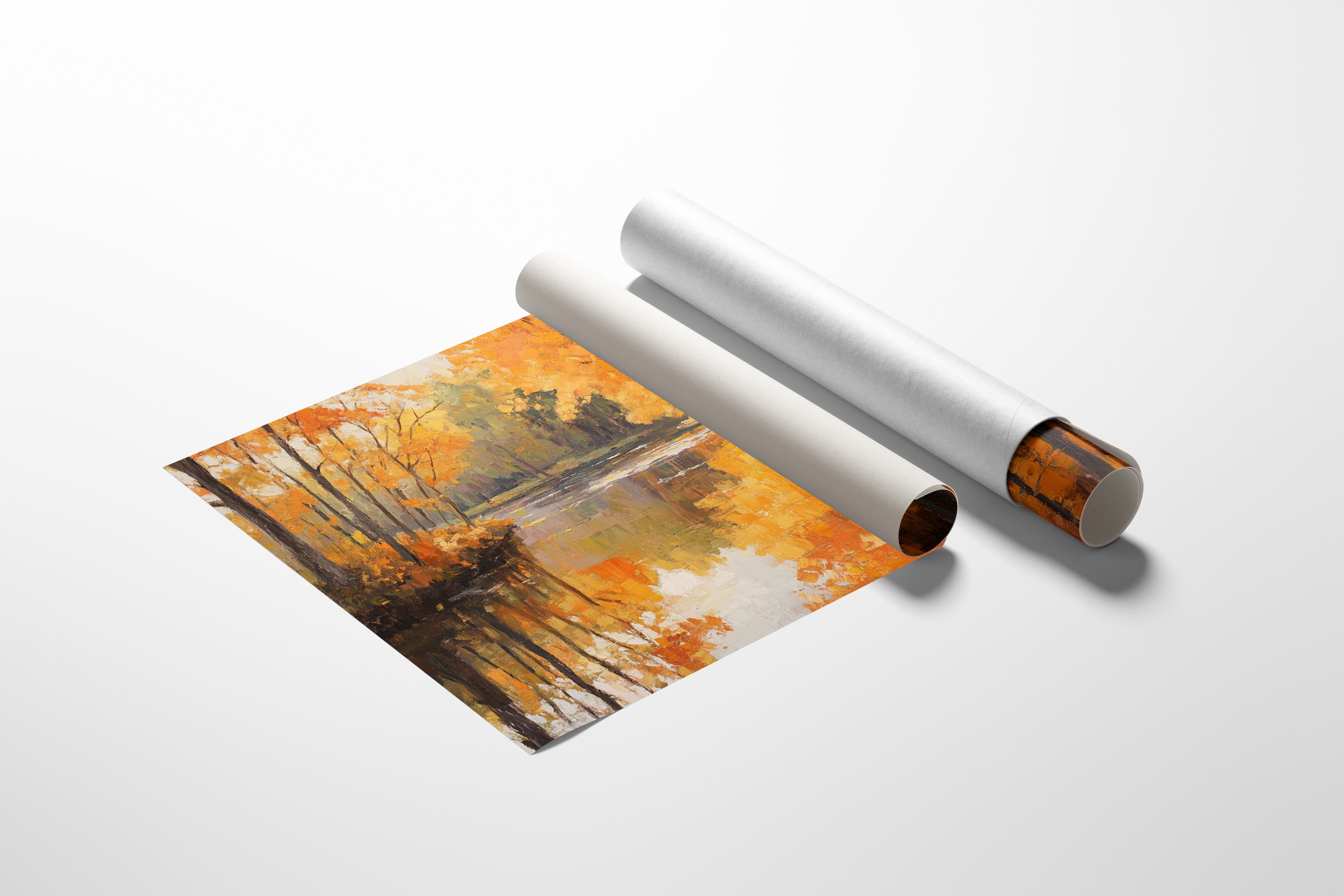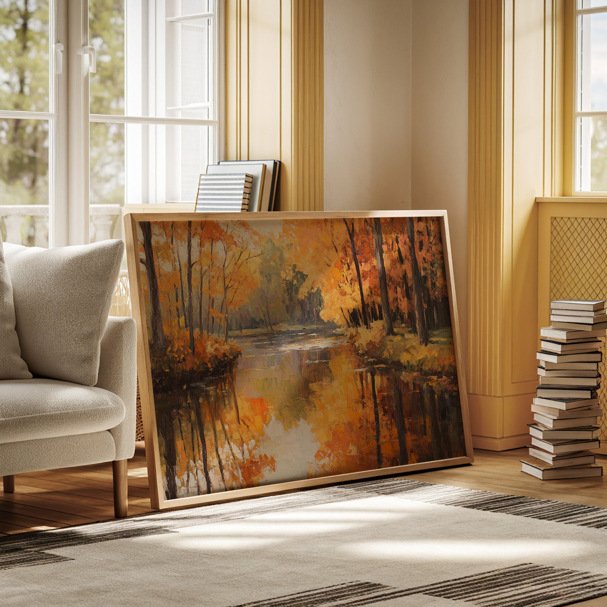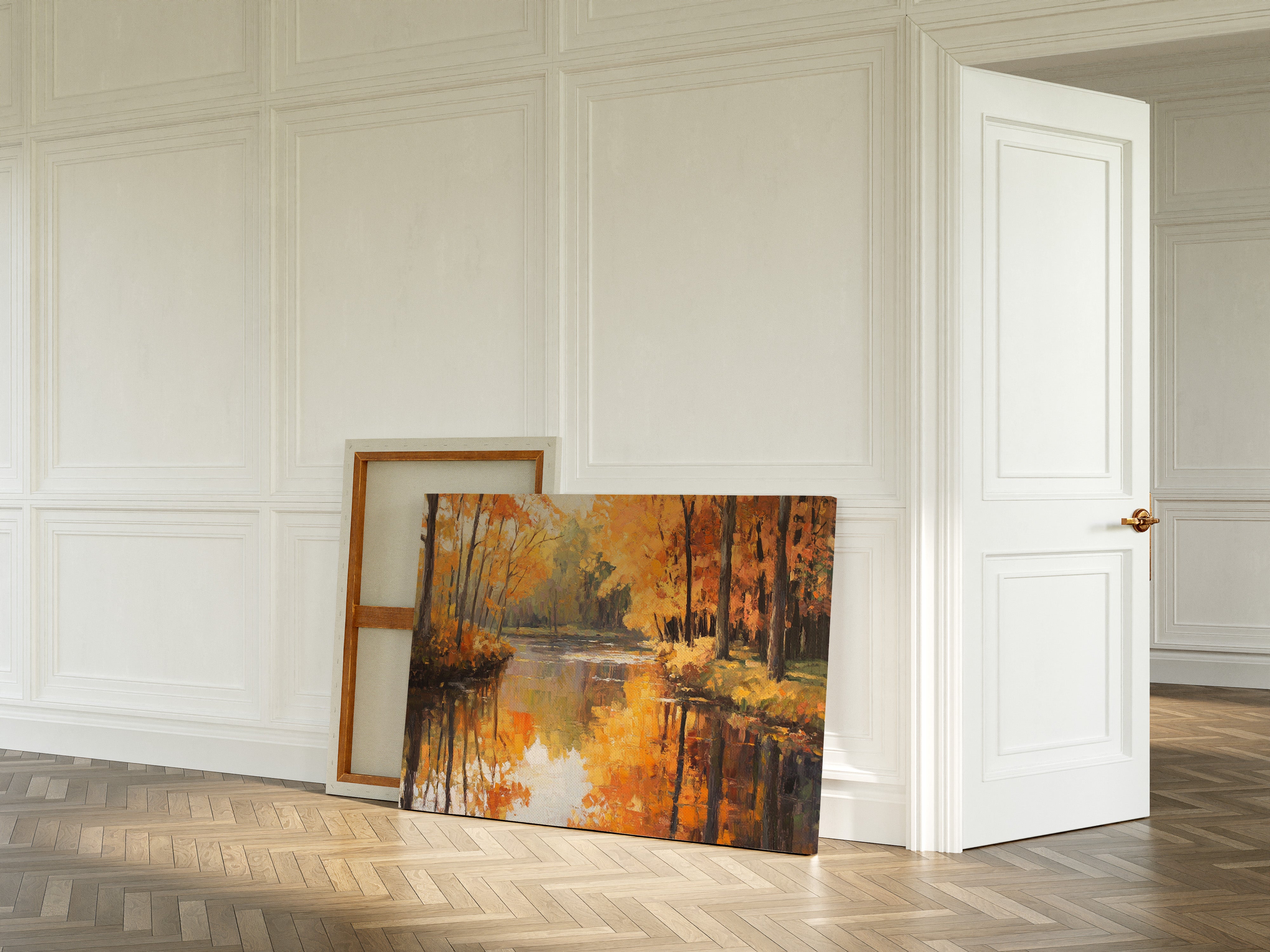 Golden light dances across still waters, painting the forest in warm amber hues. The scene captures that magical moment when fall reaches its peak, with majestic trees wearing their finest orange and yellow crowns. Rich impasto brushstrokes create a textured landscape where reality meets reflection, each leaf's glory doubled in the mirror-like surface of the tranquil river. The composition draws viewers down a gentle curve of water, inviting them to explore deeper into this serene woodland sanctuary.