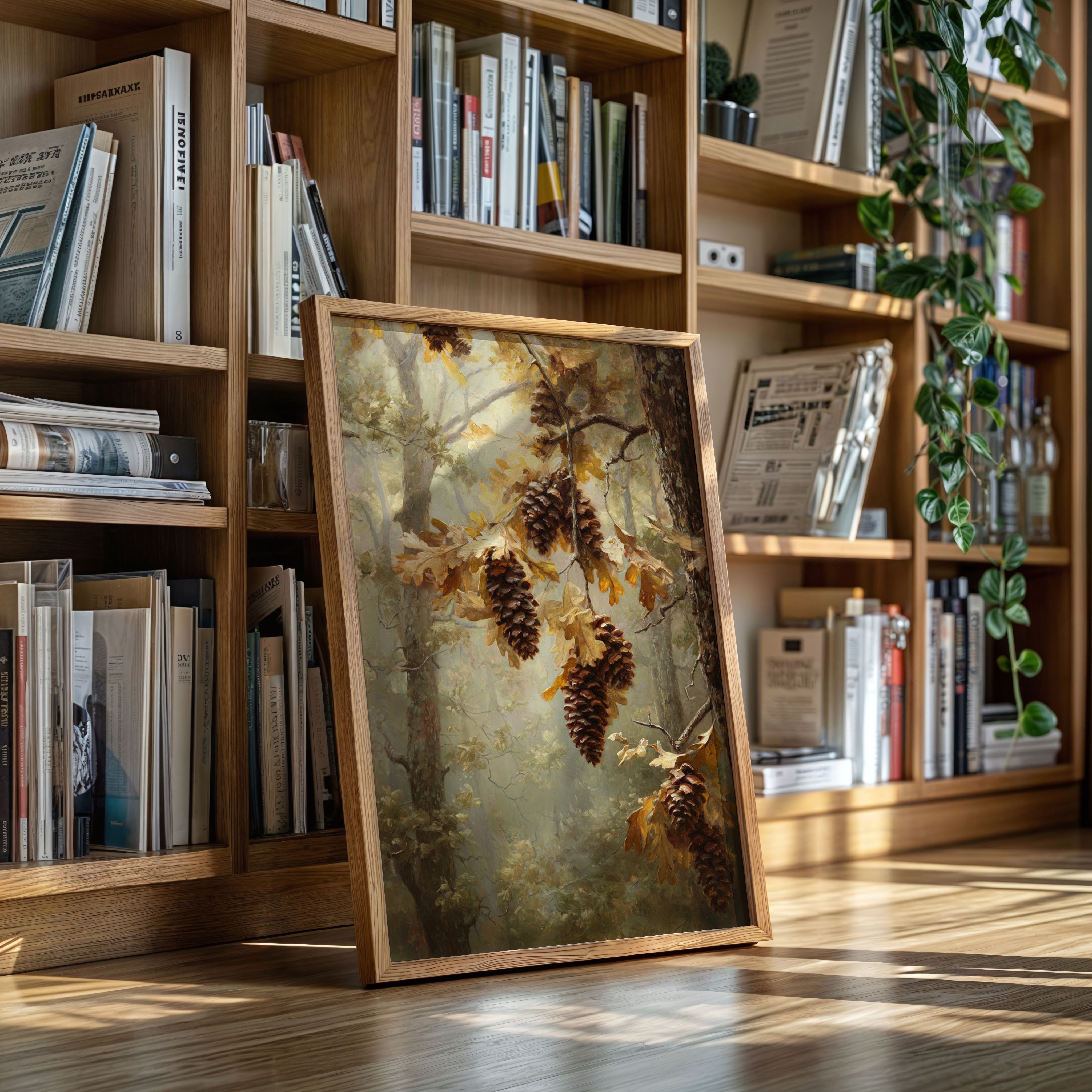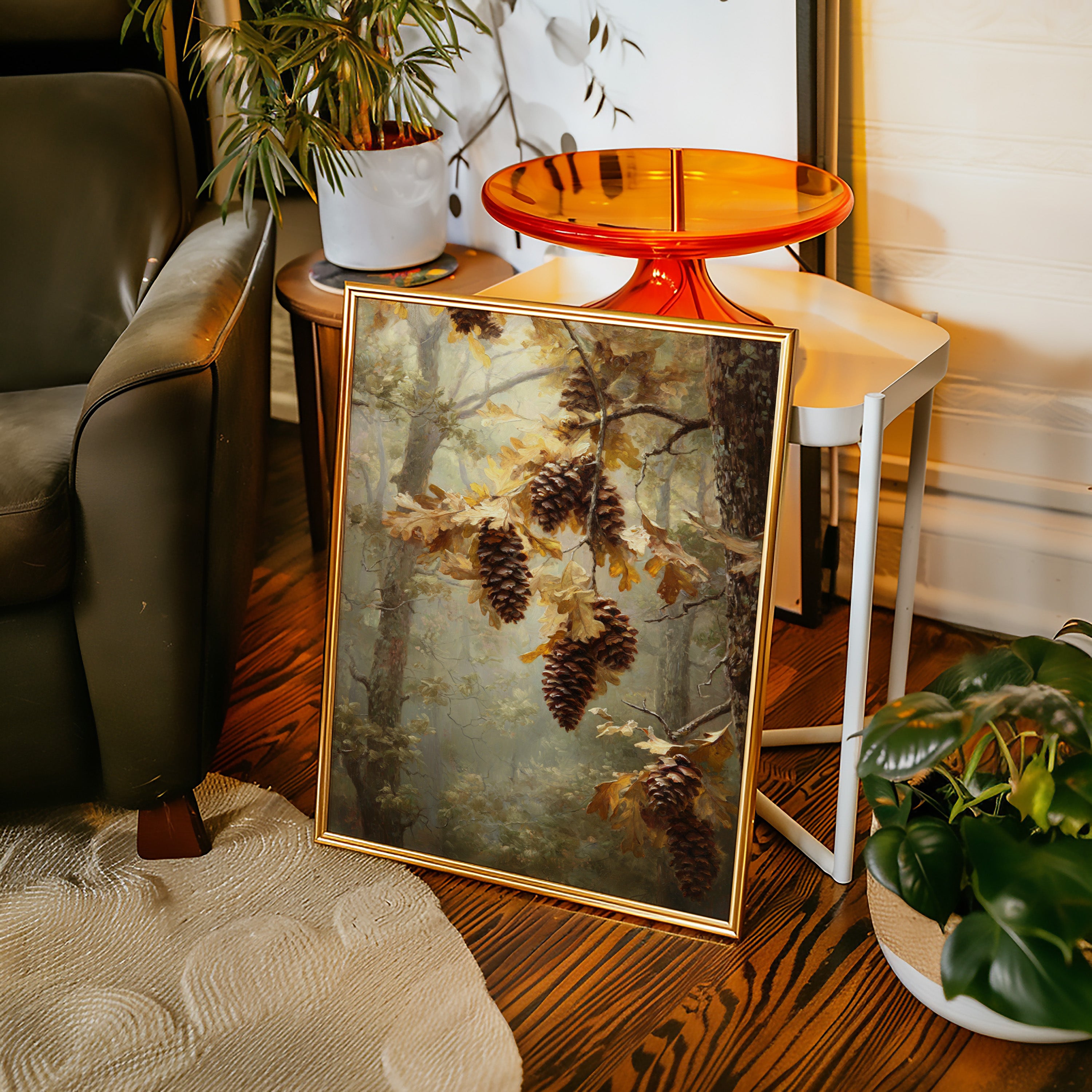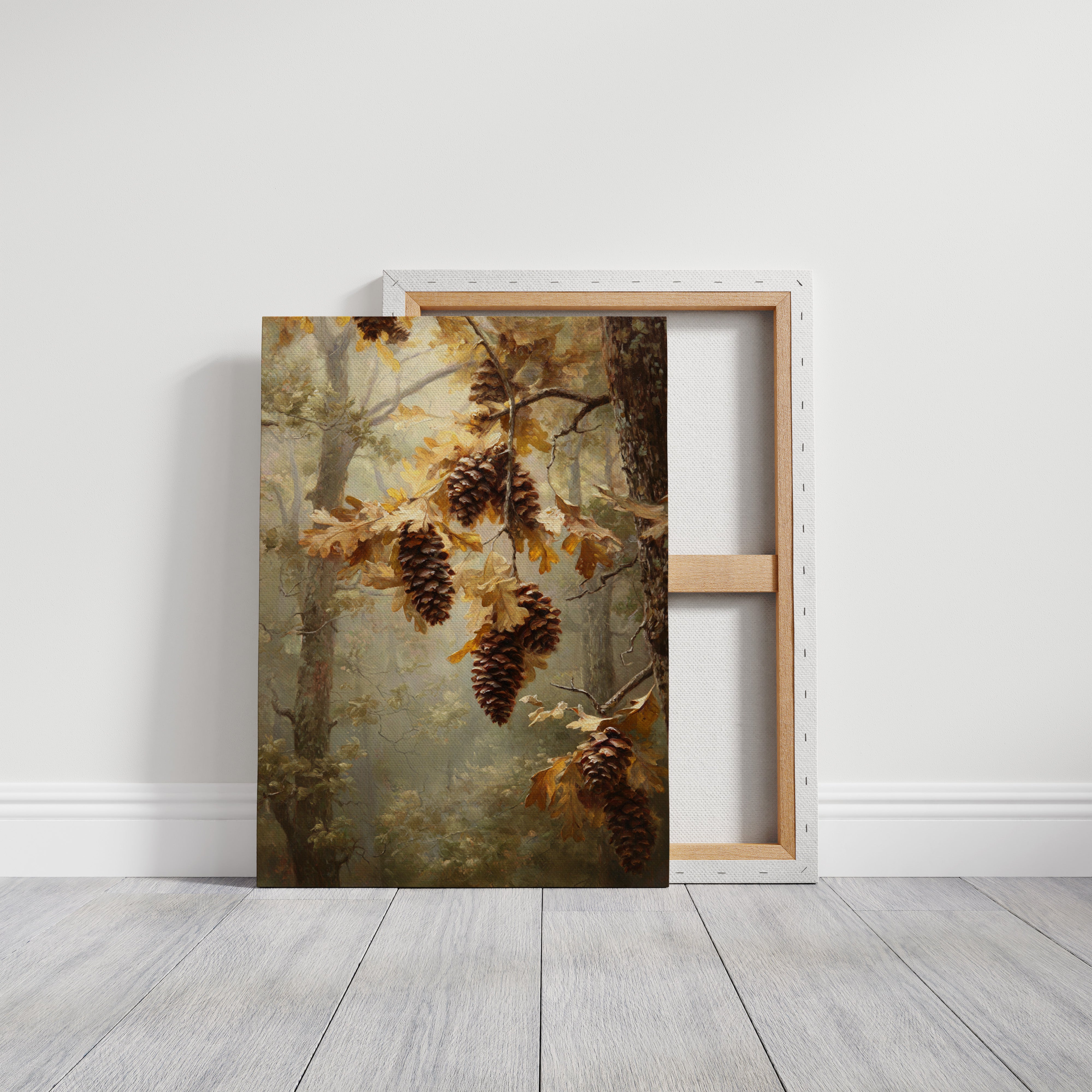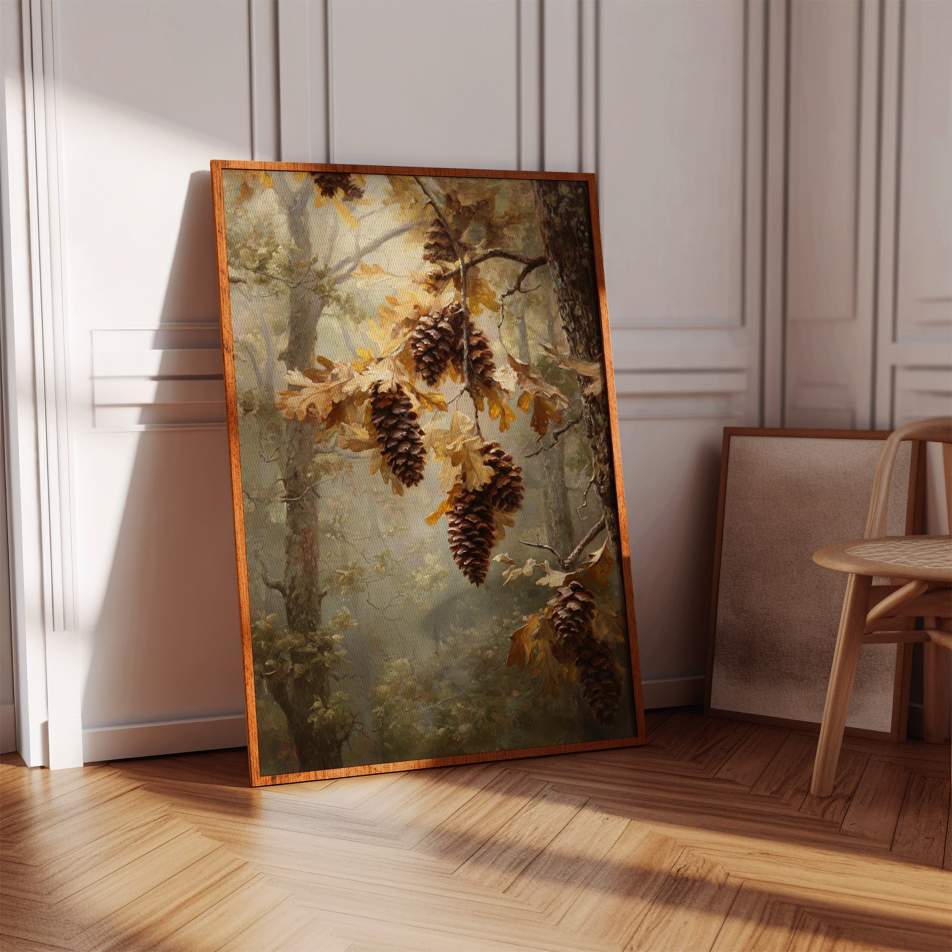 Golden light filters through a misty forest, illuminating dangling pinecones like nature's own ornaments. The rich browns and ambers of the cones contrast dramatically with delicate oak leaves, creating a symphony of autumn textures. Each pinecone seems to tell its own story, suspended in a dance with falling leaves against the soft, atmospheric backdrop of the forest. The painterly style captures both the tangible details and ethereal quality of this woodland scene, where every brush stroke adds to the piece's organic warmth. This striking composition would bring natural elegance to a reading nook, study, or any space where you seek to create a contemplative atmosphere.