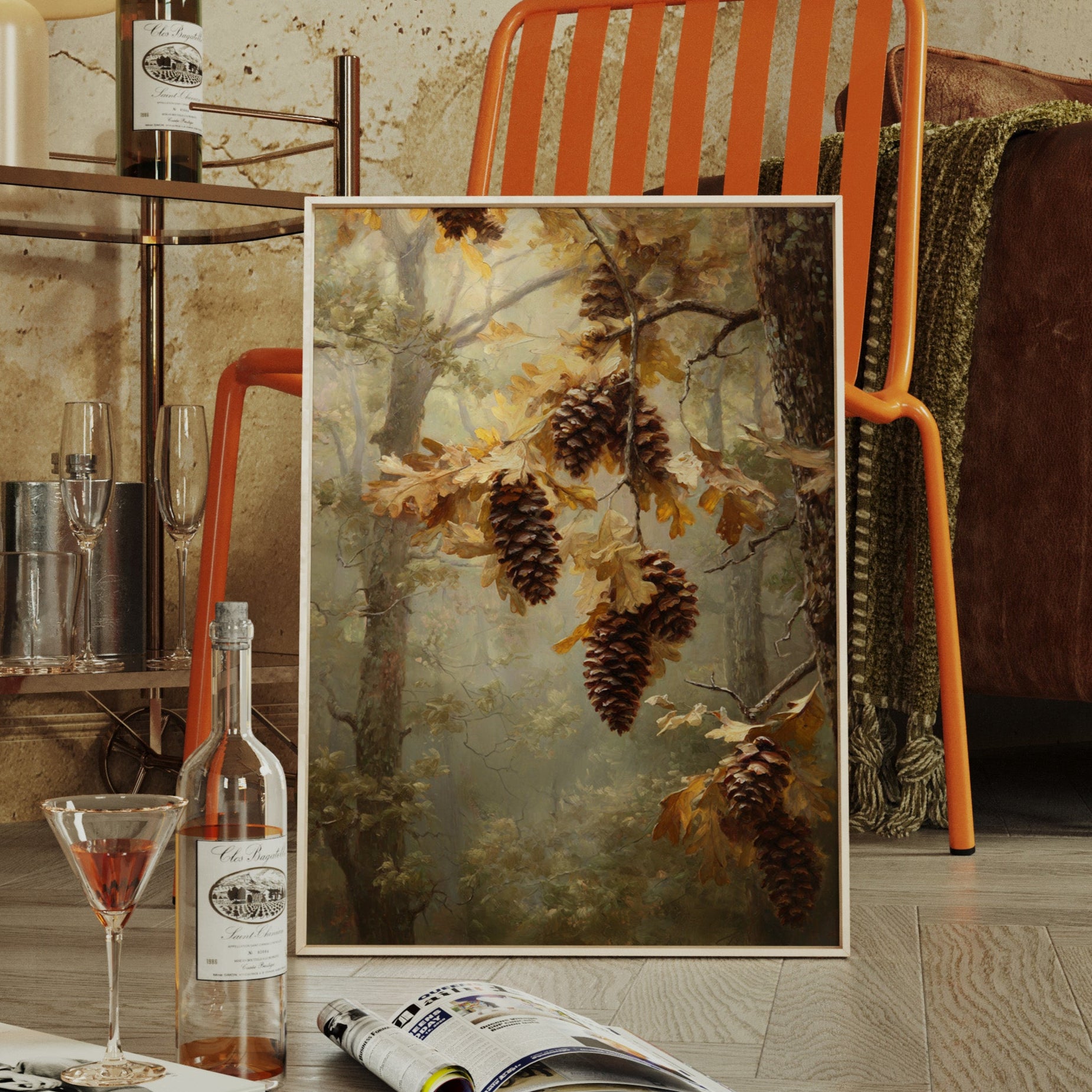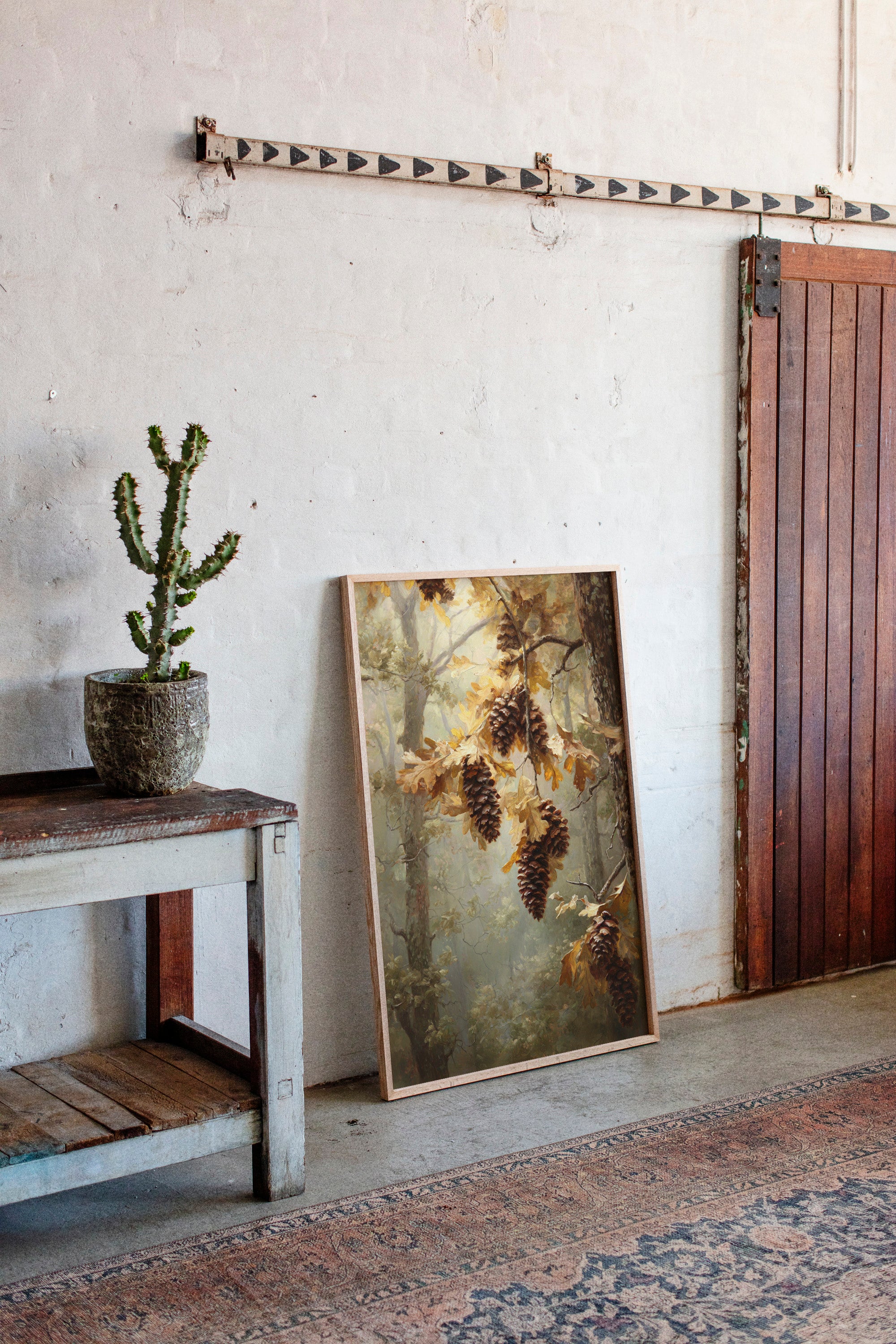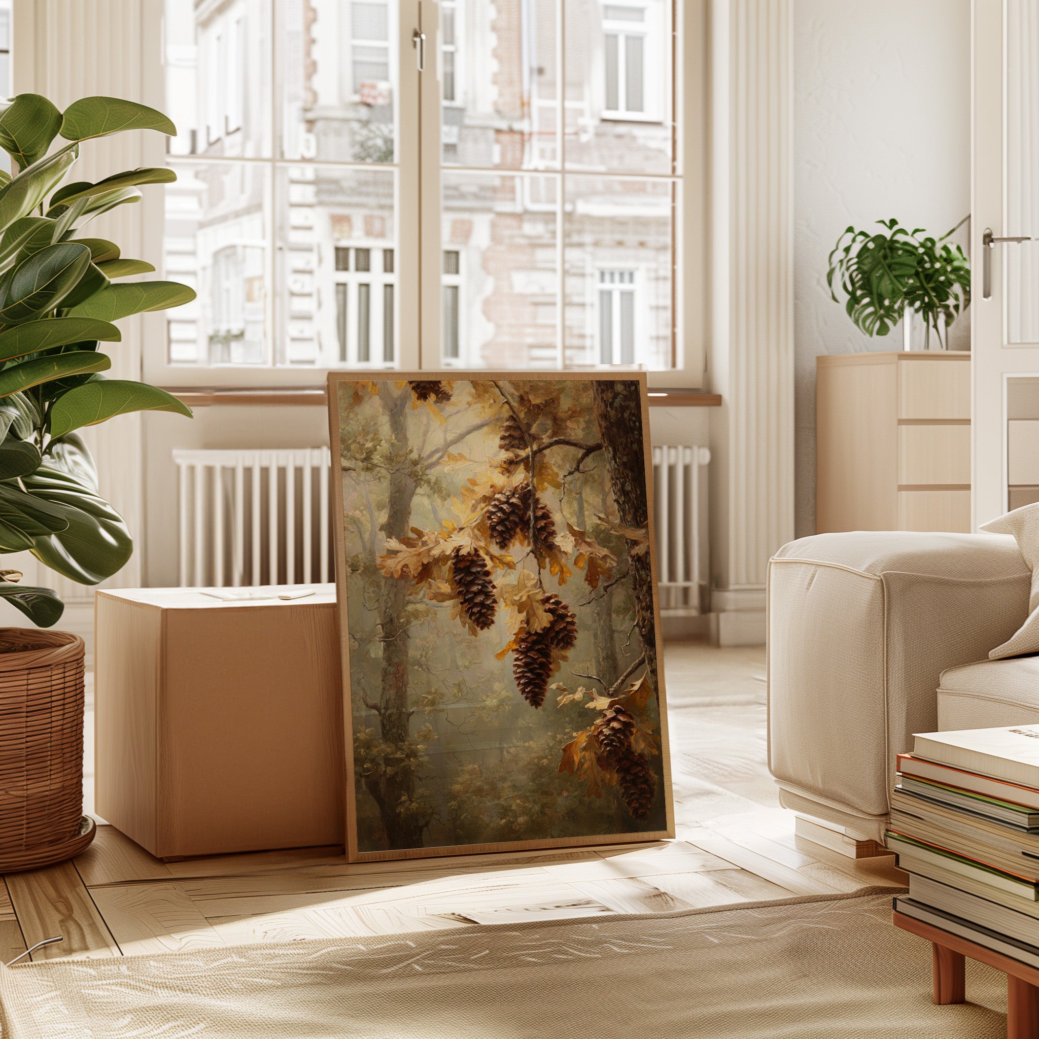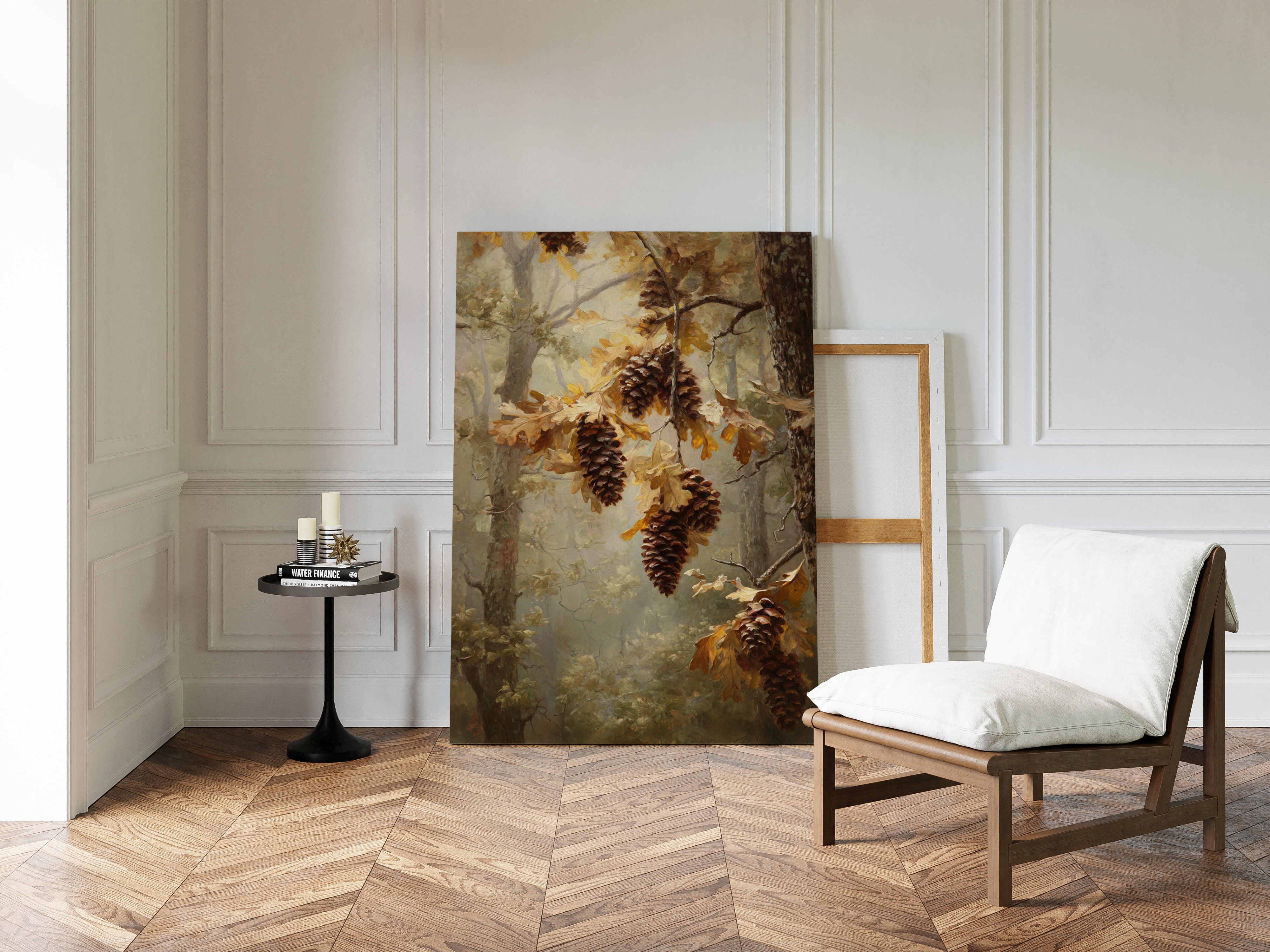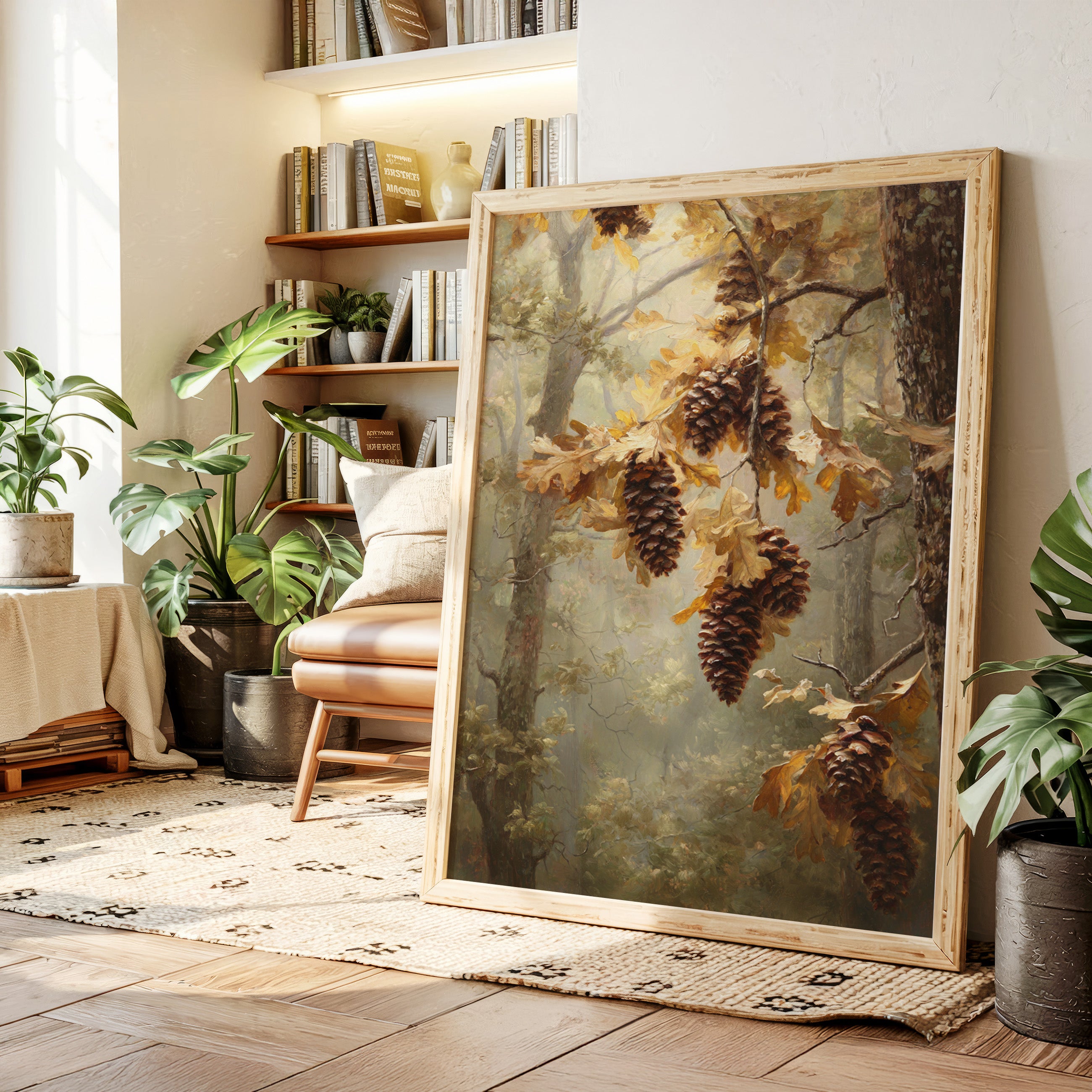 Golden light filters through a misty forest, illuminating dangling pinecones like nature's own ornaments. The rich browns and ambers of the cones contrast dramatically with delicate oak leaves, creating a symphony of autumn textures. Each pinecone seems to tell its own story, suspended in a dance with falling leaves against the soft, atmospheric backdrop of the forest. The painterly style captures both the tangible details and ethereal quality of this woodland scene, where every brush stroke adds to the piece's organic warmth. This striking composition would bring natural elegance to a reading nook, study, or any space where you seek to create a contemplative atmosphere.