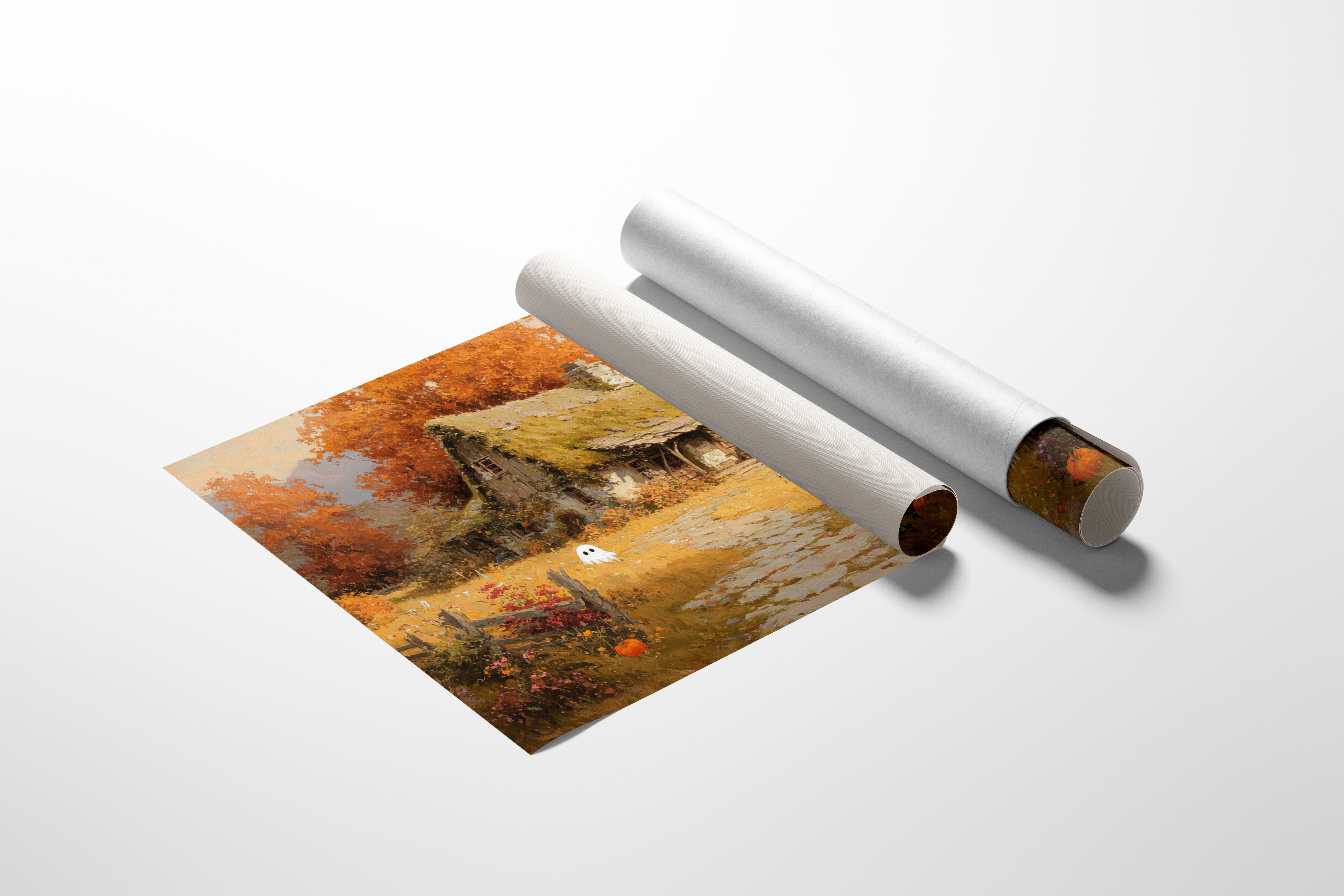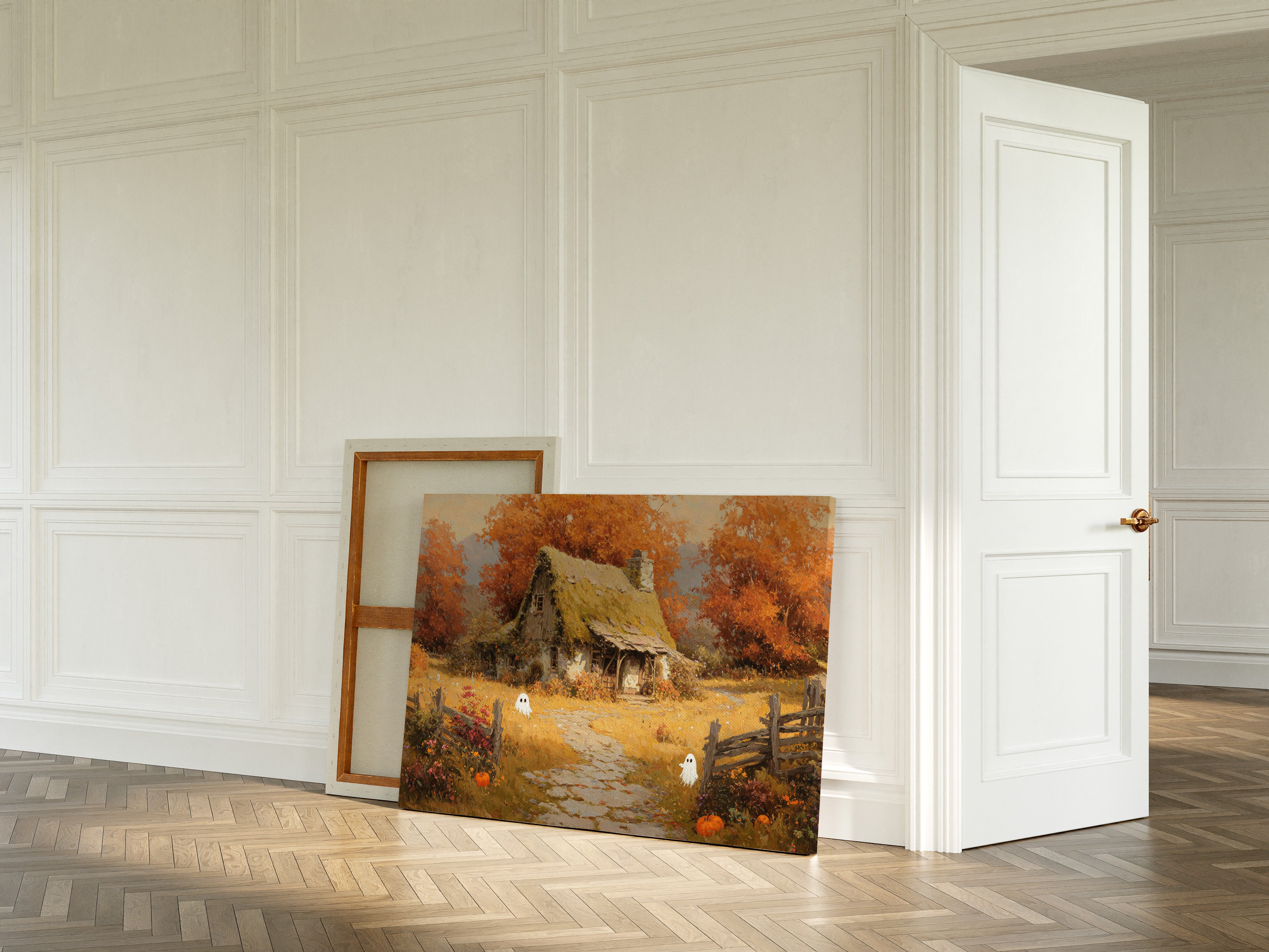 Beneath the vibrant canopy of autumn leaves, a quaint cottage nestles in a sea of golden grasses, infused with a sense of playful mystery. This piece embodies the artisanal charm of rural life, inviting you to explore its warmth. With hues of orange and soft earth tones, the landscape tells a story of harvest and hidden delights, where even the ghosts of fall seem to frolic among the pumpkins and wildflowers. Perfect for a cozy nook or a welcoming entryway, this piece transforms any space into a warm embrace of nostalgia.