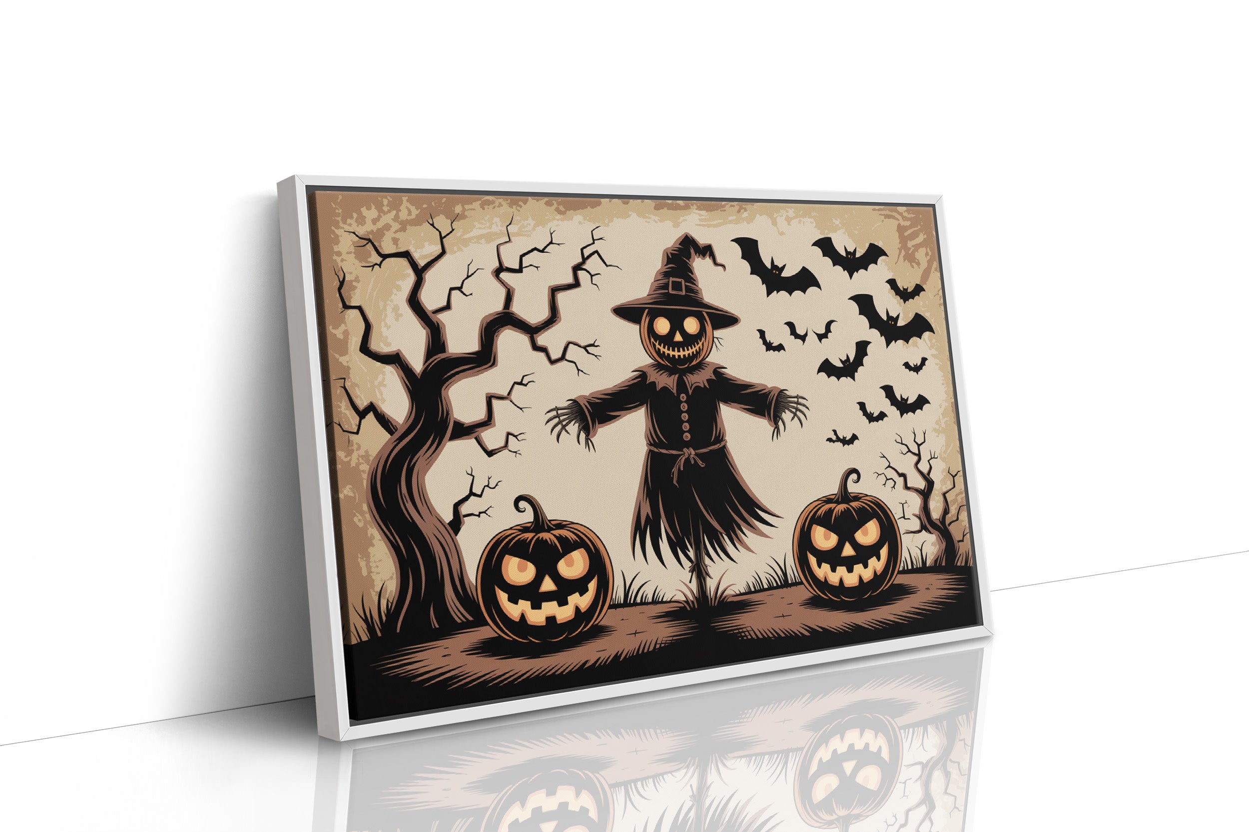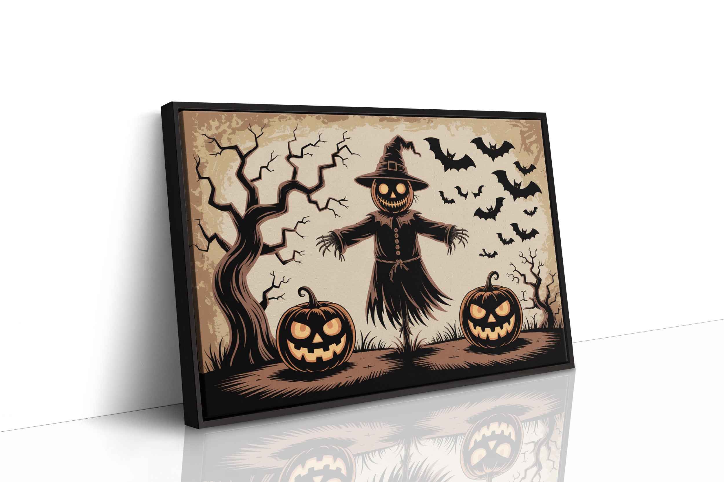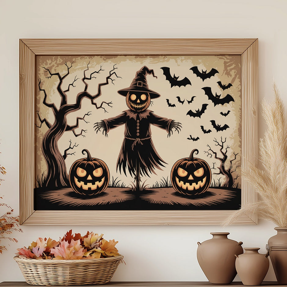A lone scarecrow with a jack-o'-lantern head stands watch over a haunted landscape, its glowing eyes cutting through the twilight gloom. Twisted trees stretch their barren limbs across a sepia-toned sky while carved pumpkins flank the eerie guardian, their expressions mirroring its menacing grin. Bats swoop through the vintage-styled scene, completing this nostalgic homage to Halloween folklore with its warm amber glow against stark silhouettes.