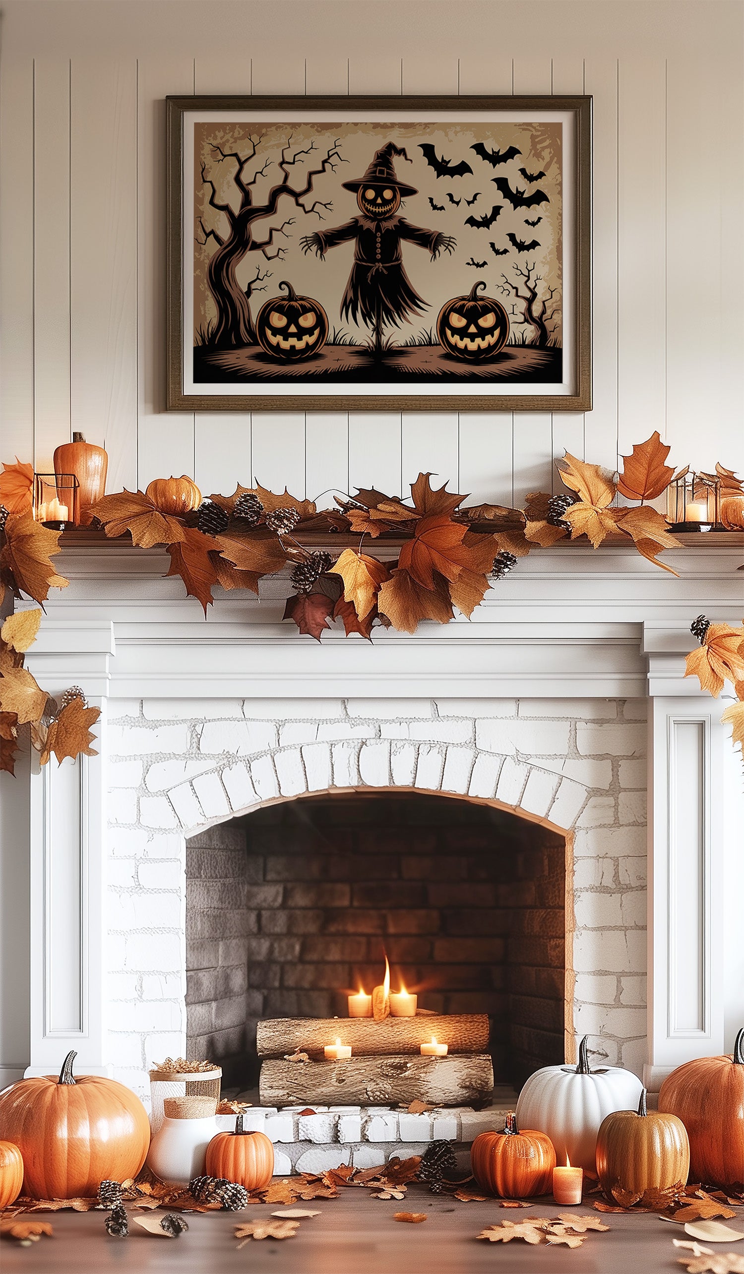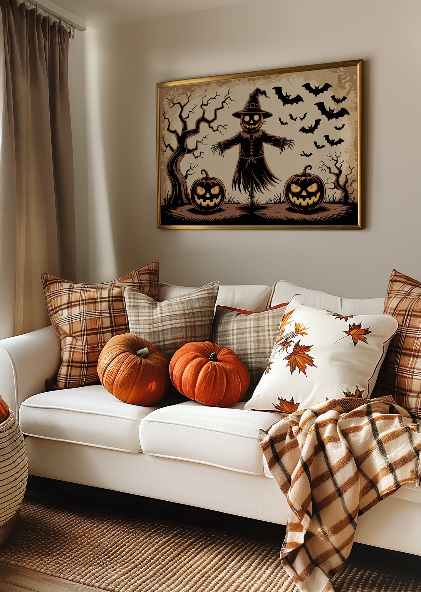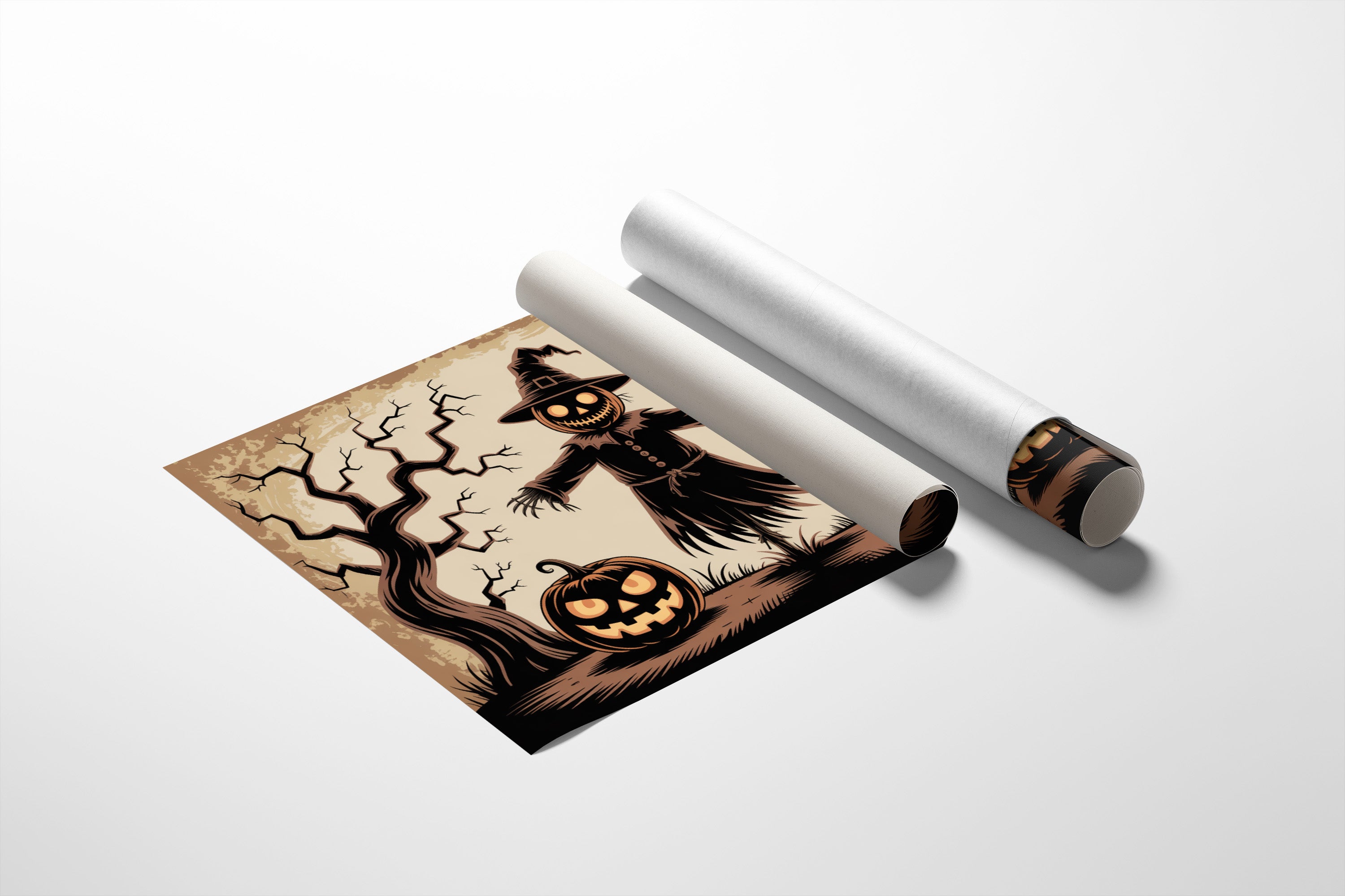 A lone scarecrow with a jack-o'-lantern head stands watch over a haunted landscape, its glowing eyes cutting through the twilight gloom. Twisted trees stretch their barren limbs across a sepia-toned sky while carved pumpkins flank the eerie guardian, their expressions mirroring its menacing grin. Bats swoop through the vintage-styled scene, completing this nostalgic homage to Halloween folklore with its warm amber glow against stark silhouettes.