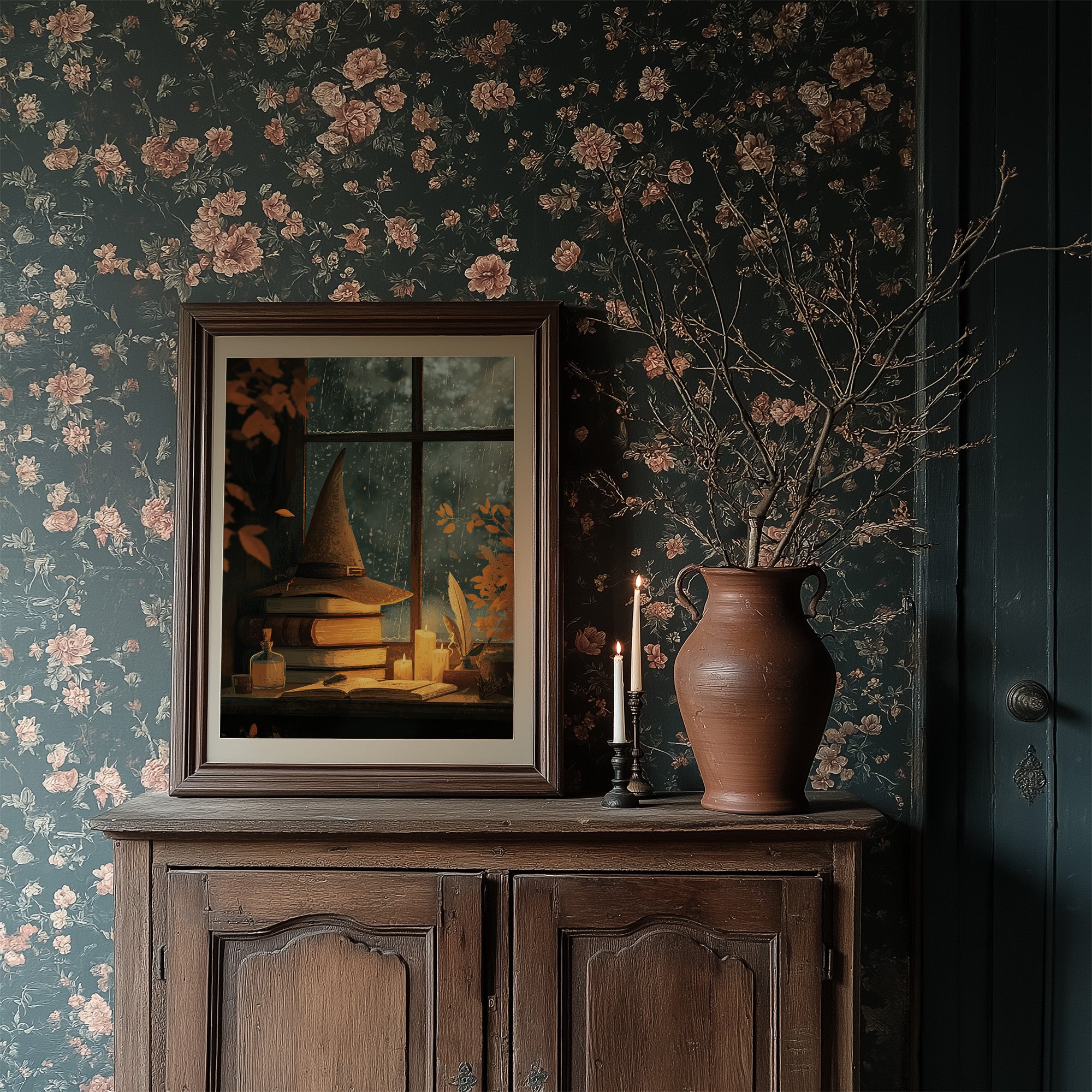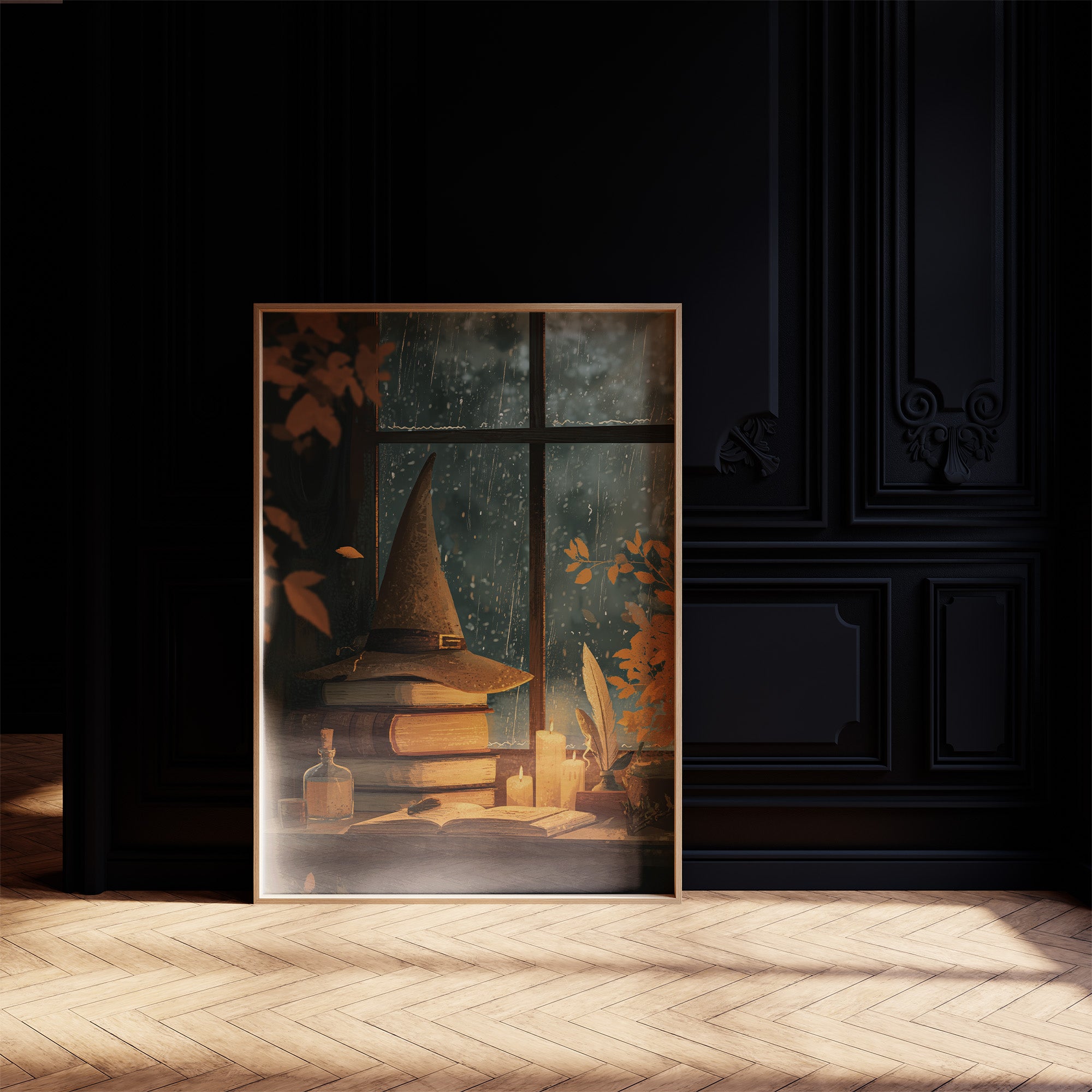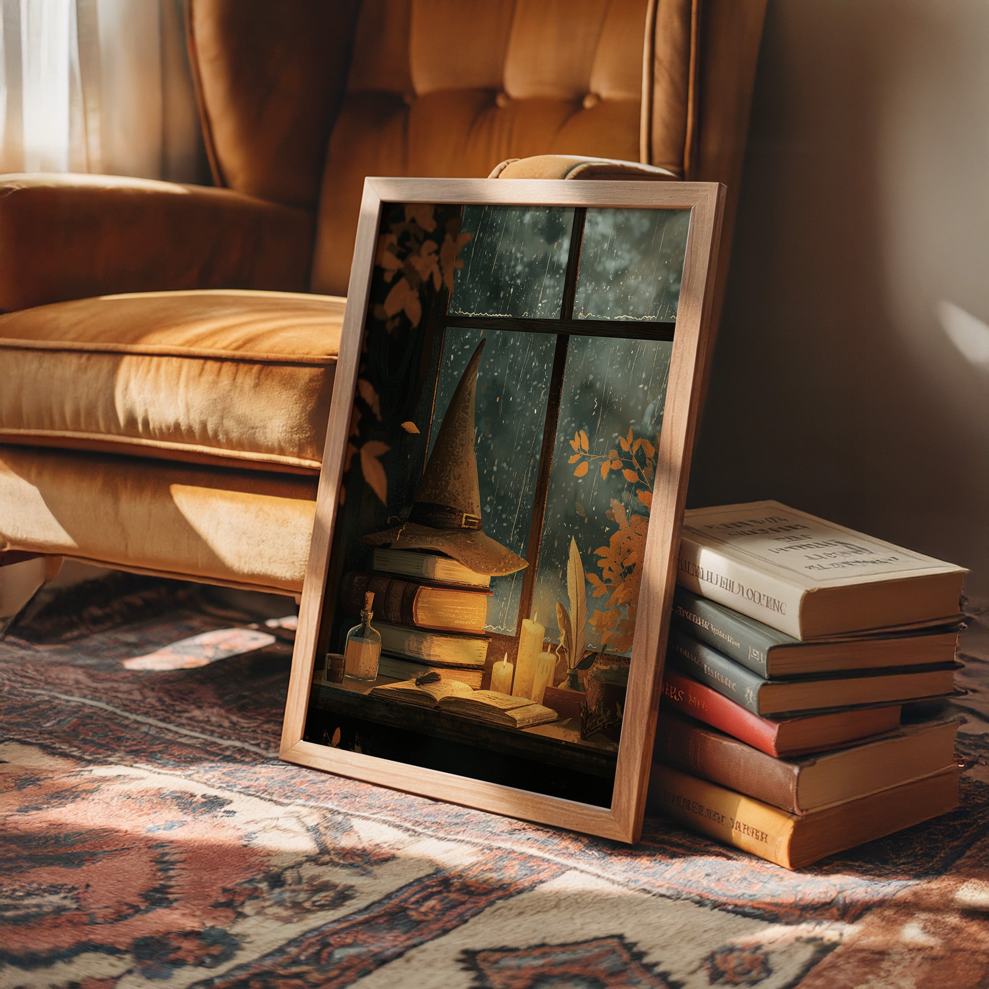 Rain taps gently against the windowpane, creating a cocoon of comfort around the witch's study corner. Stacked leather-bound books support a weathered pointed hat, while melting candles cast golden light across open pages and autumn leaves frame the scene in burnt orange. The gentle glow transforms this magical still life into a sanctuary where ancient knowledge meets the rhythmic percussion of raindrops on glass.