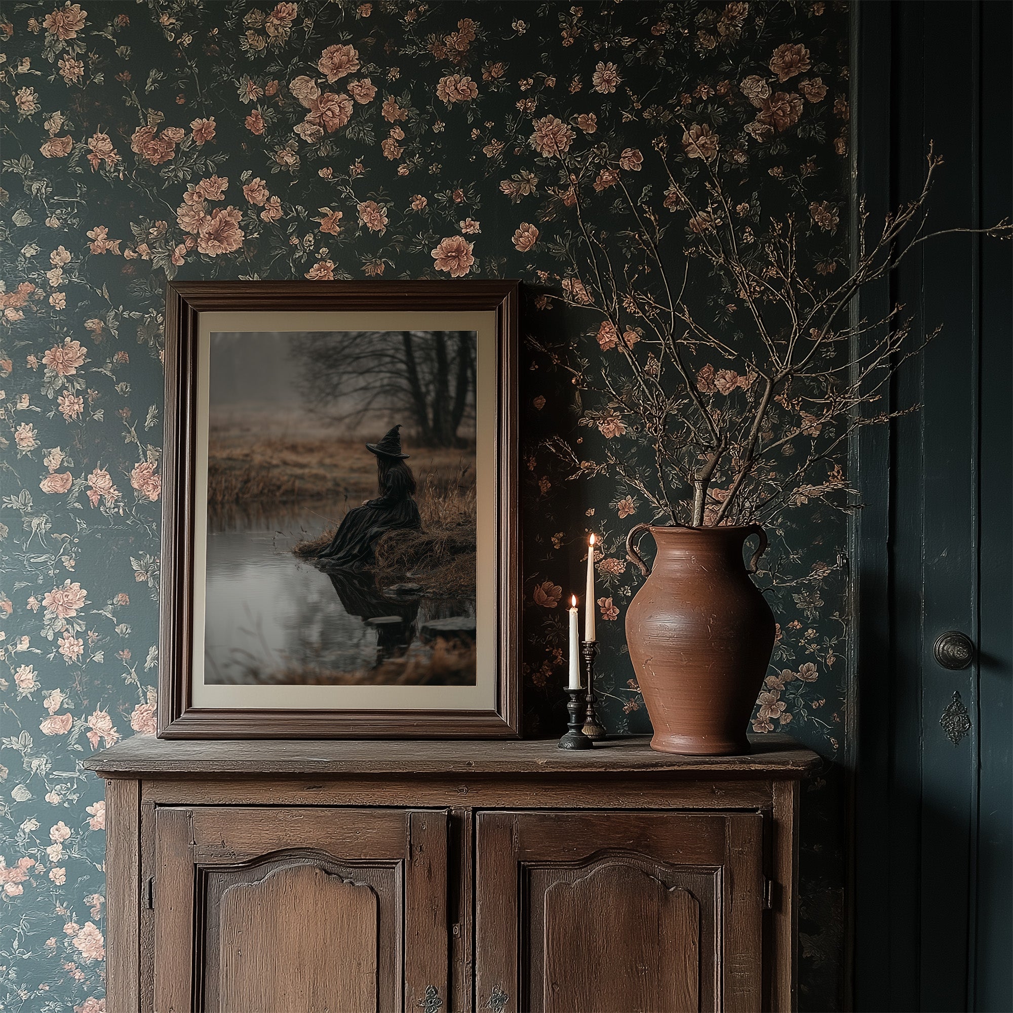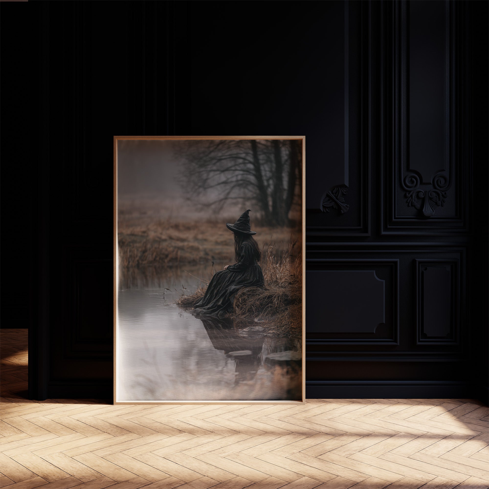 Mist hangs heavy over the water's edge, where solitude finds its perfect companion. A lone figure in flowing dark robes and pointed hat sits contemplatively by the marsh, their reflection merging with the glassy surface beneath. The amber reeds and bare trees create a haunting backdrop against the muted palette of browns and grays, inviting viewers into a world where reality and fantasy intertwine.