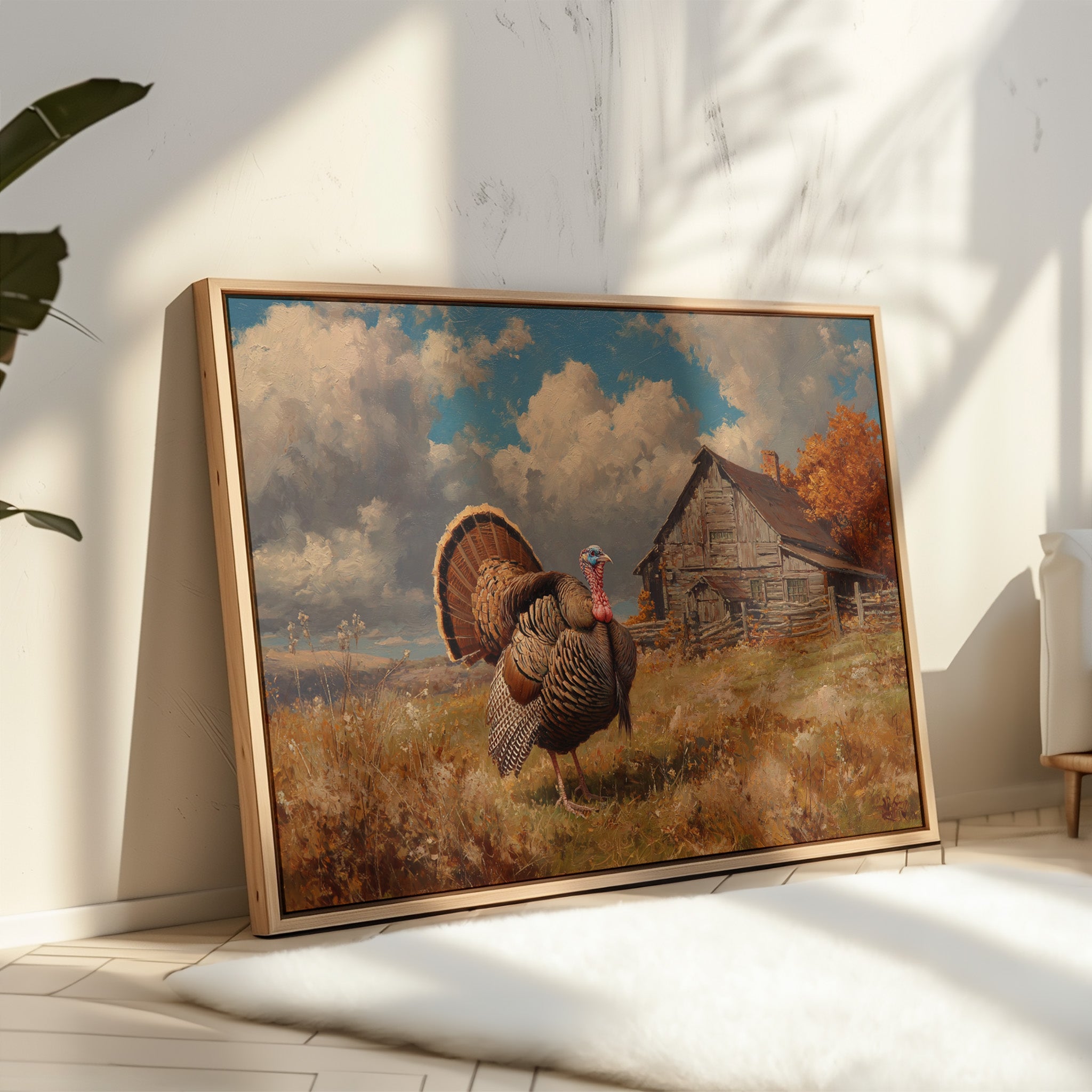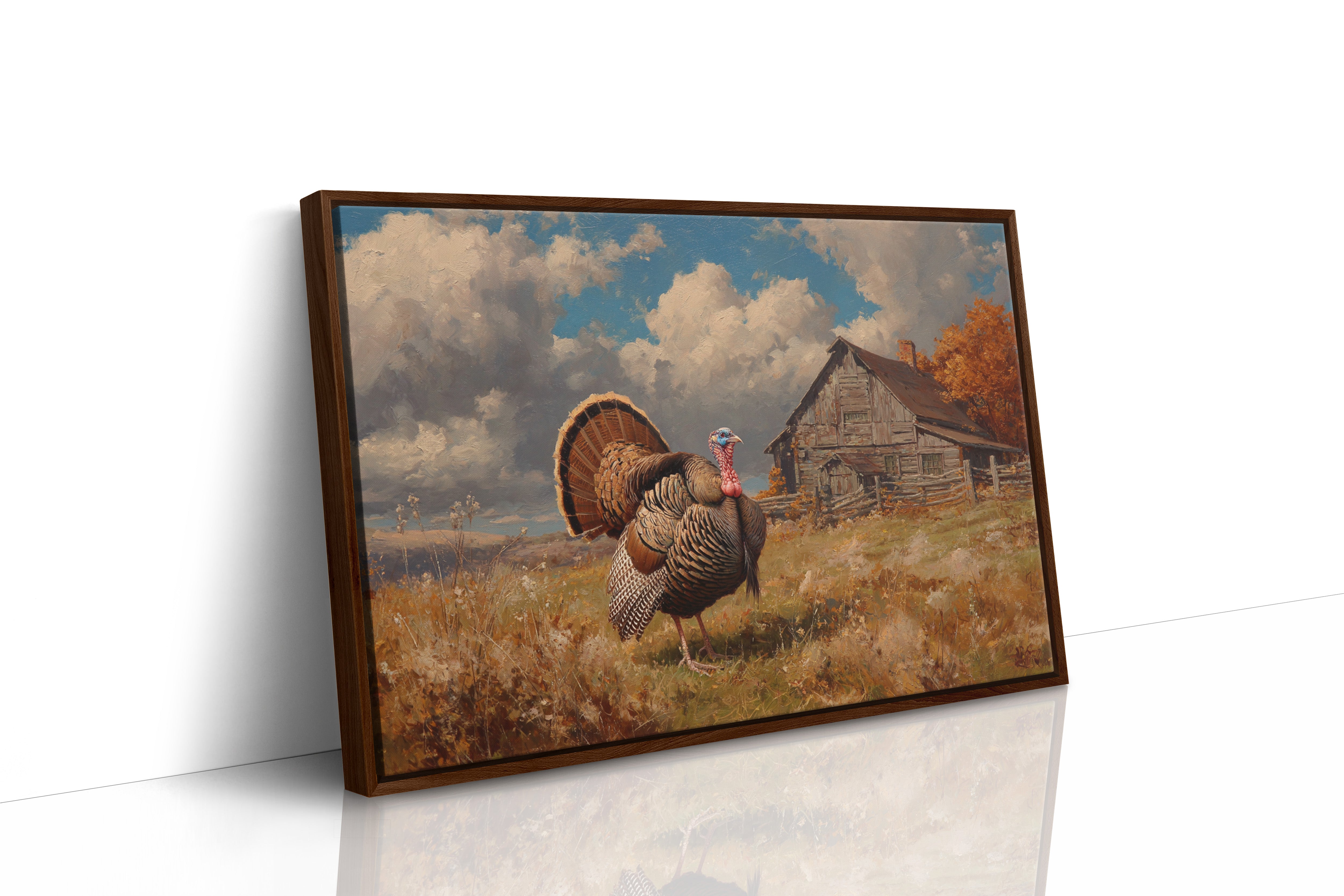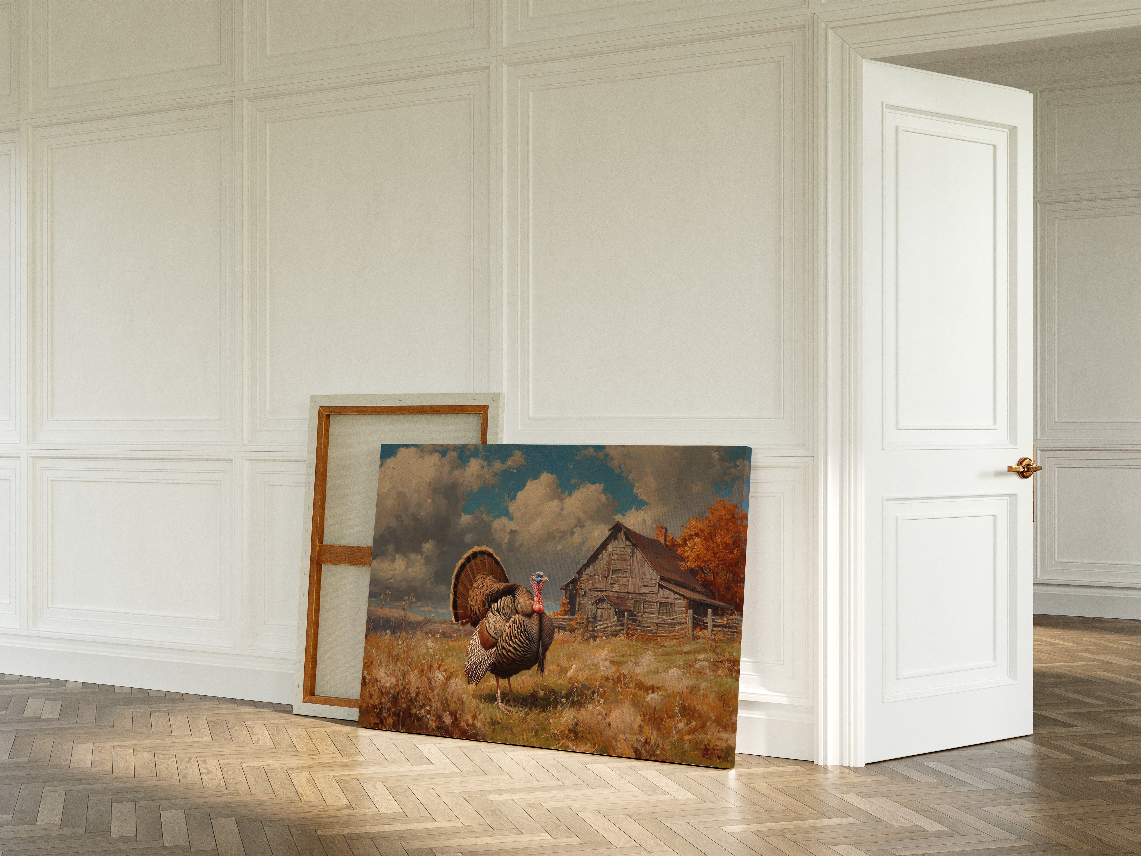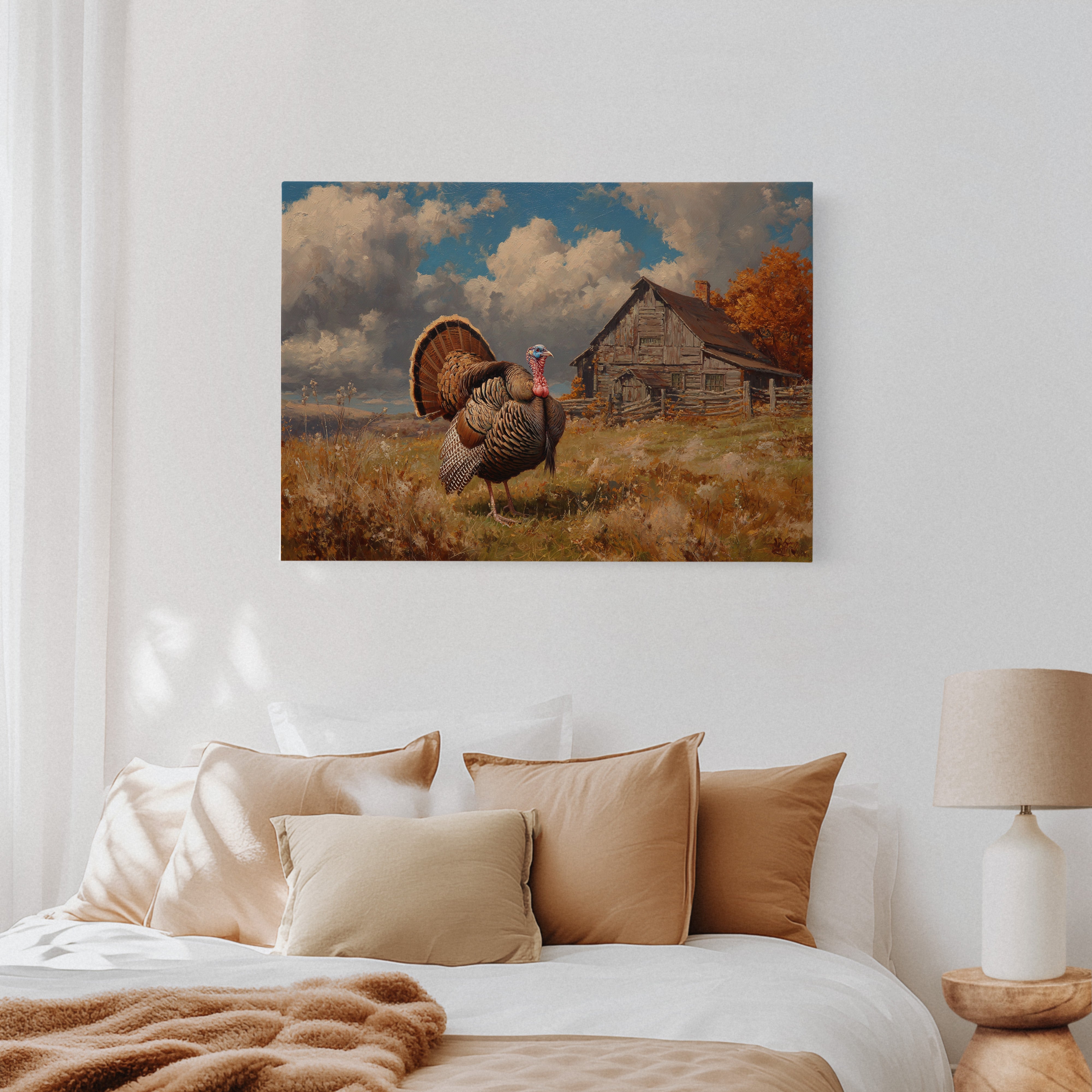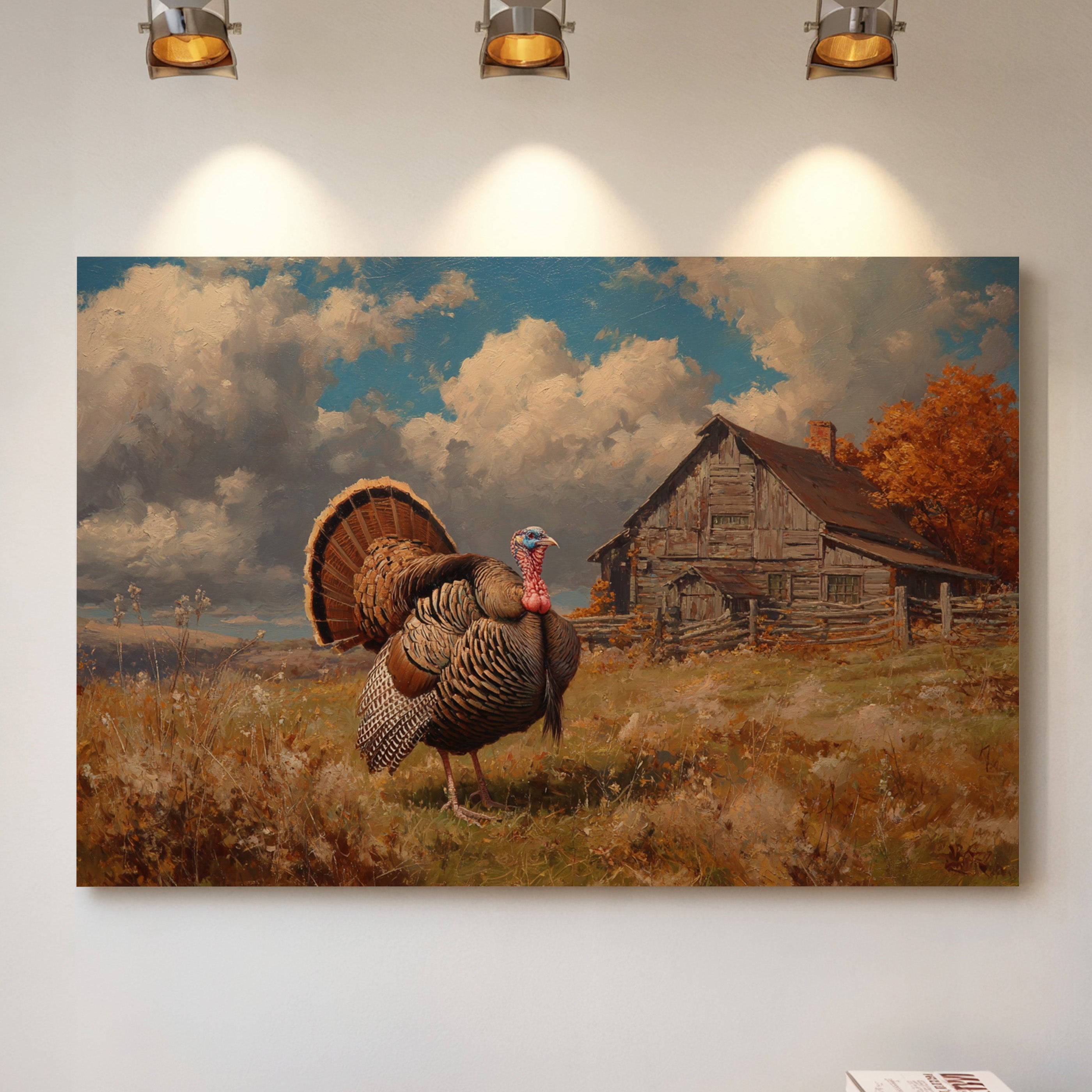 A proud wild turkey commands the foreground, its magnificent feathers on full display against a backdrop of golden autumn grass. The scene captures the quintessential American farmland spirit, where a weathered barn stands sentinel amid copper-leafed trees and billowing clouds. Rich textures emerge through detailed brushstrokes, from the turkey's intricate plumage to the rough-hewn wooden planks of the old barn. This pastoral moment speaks to the timeless connection between wildlife and rural landscapes.