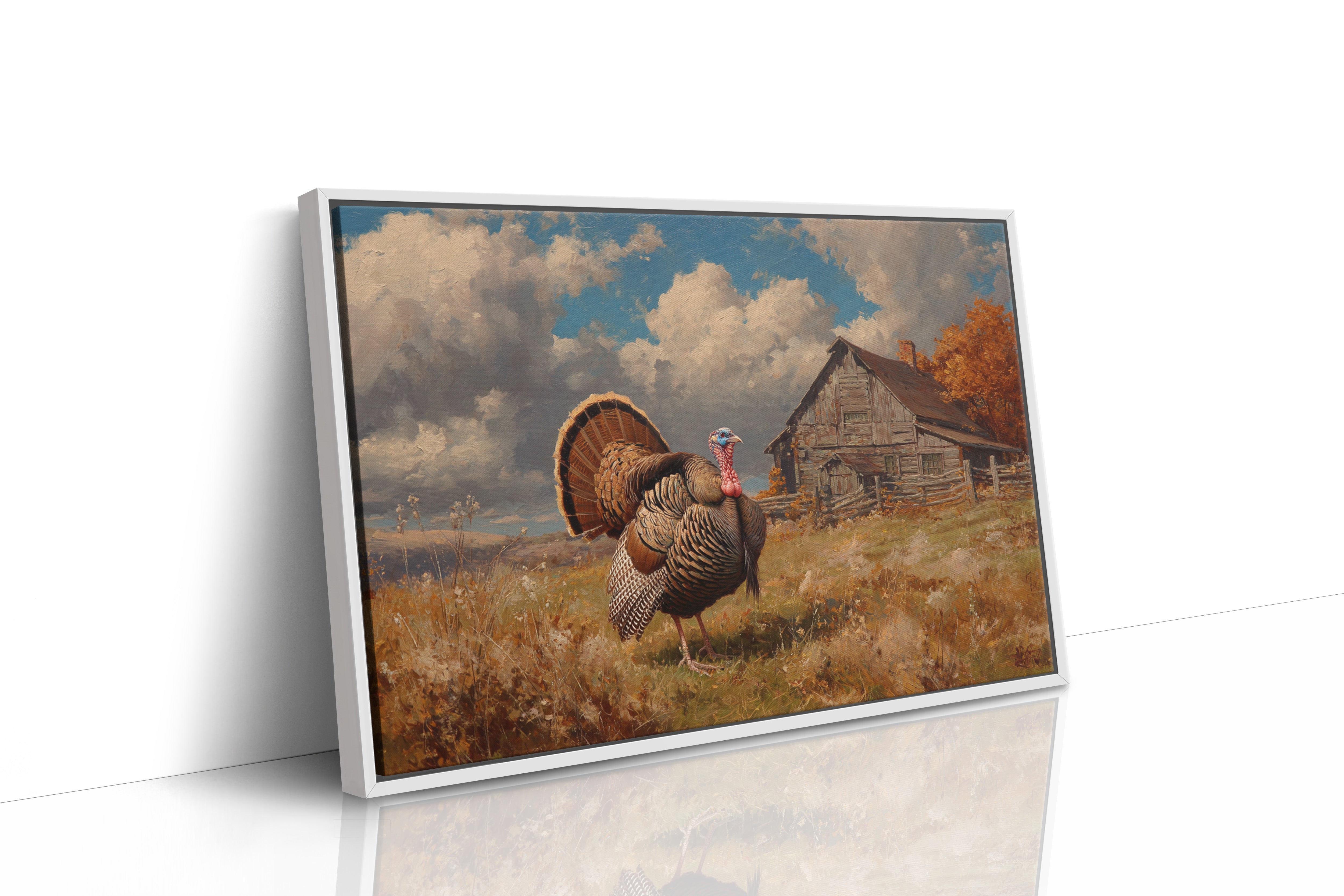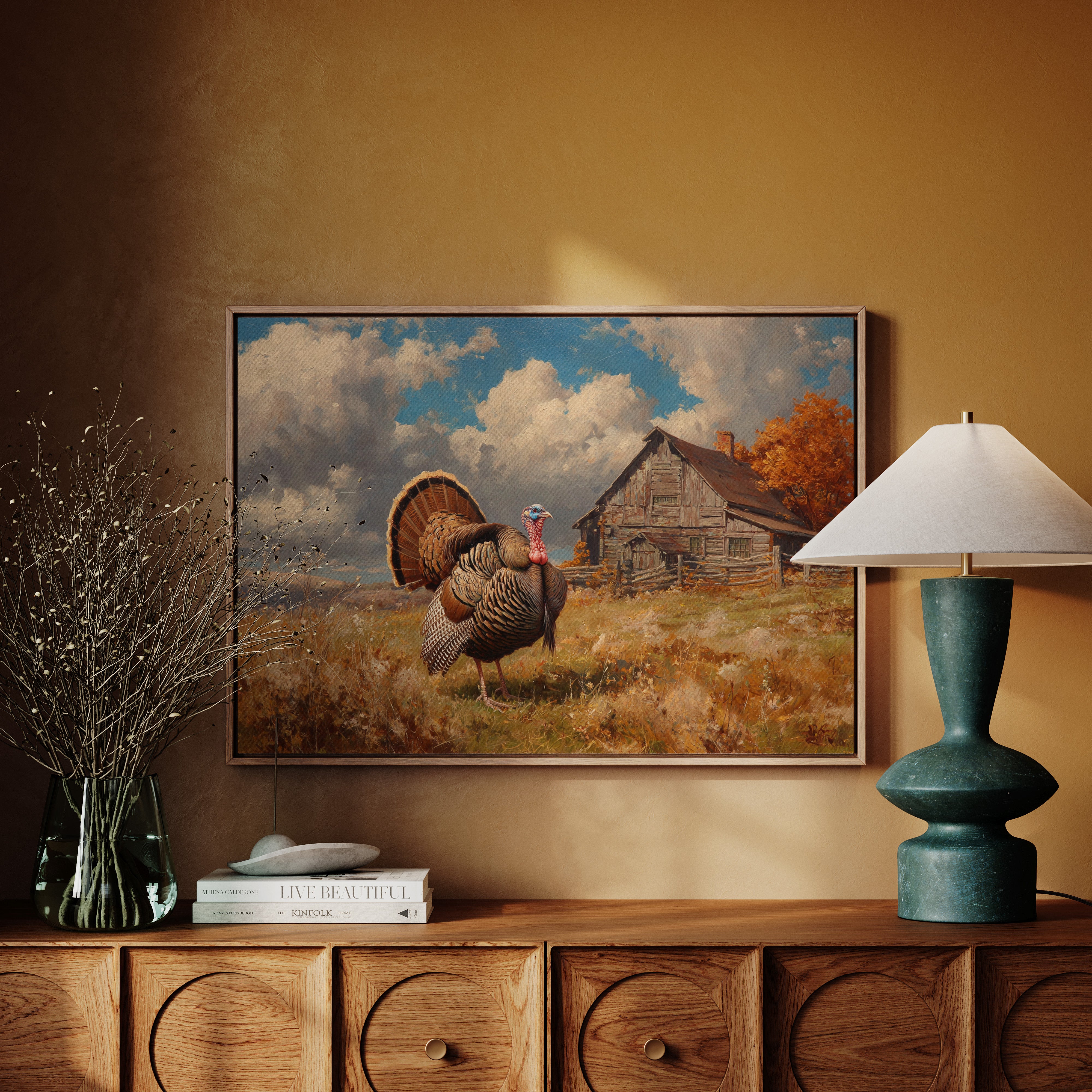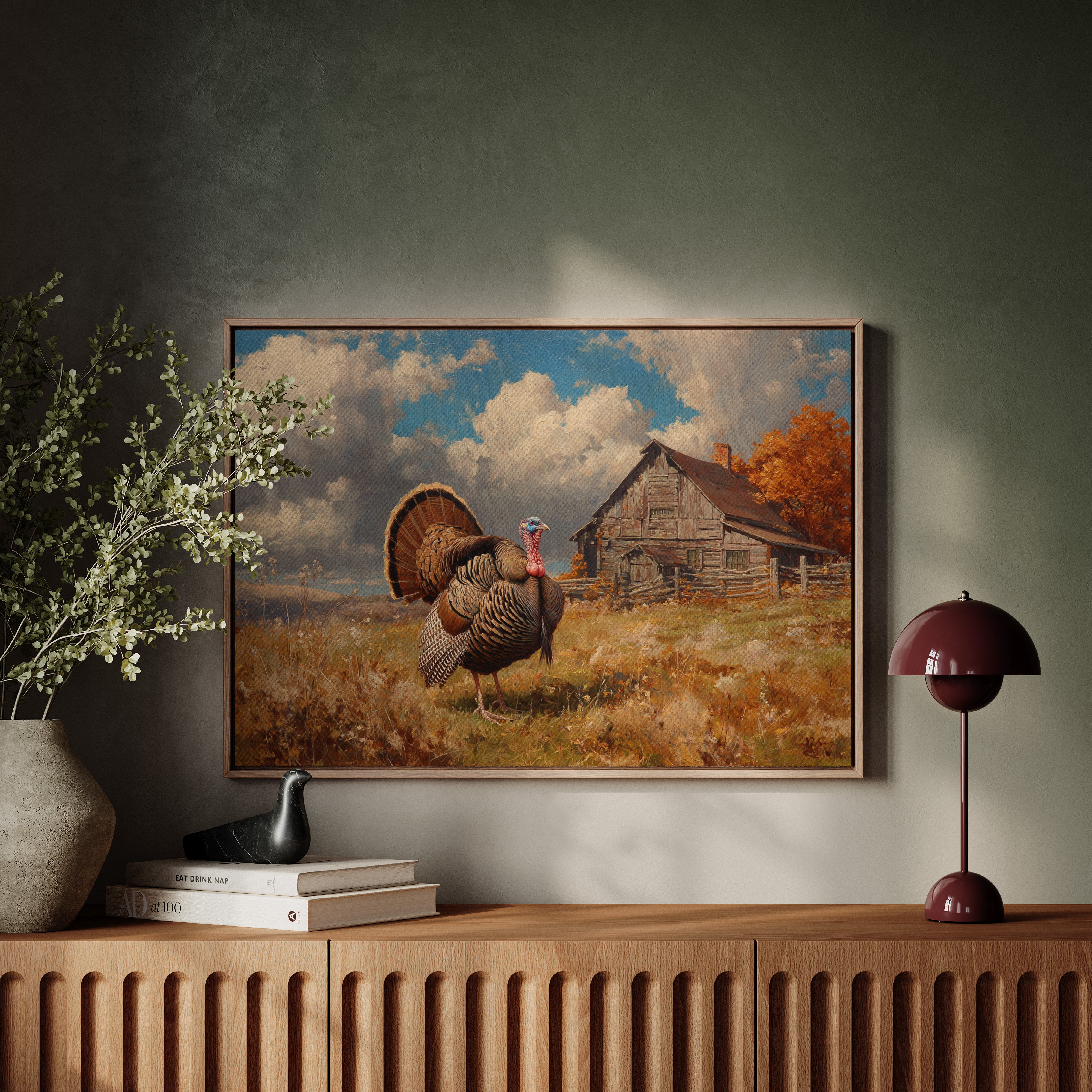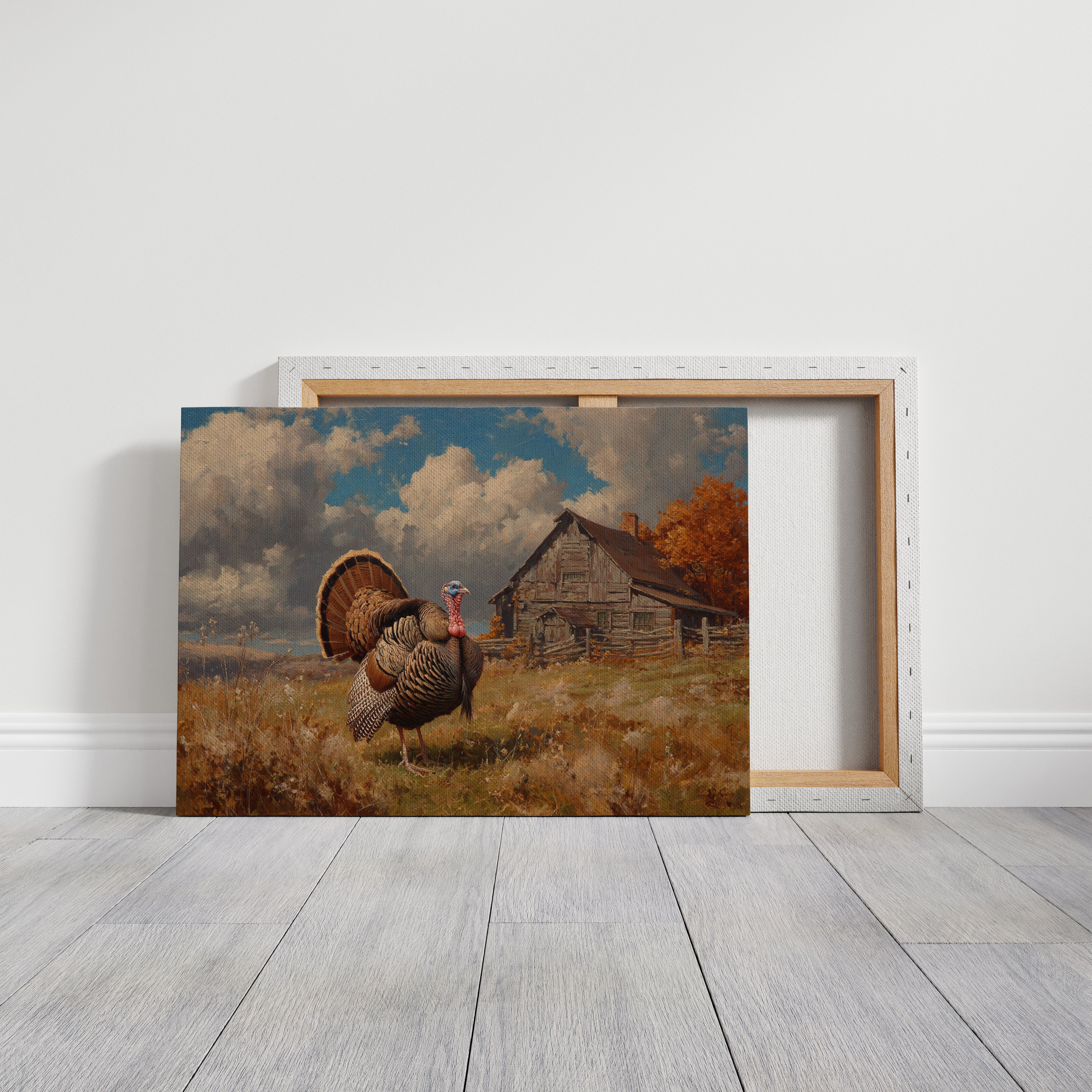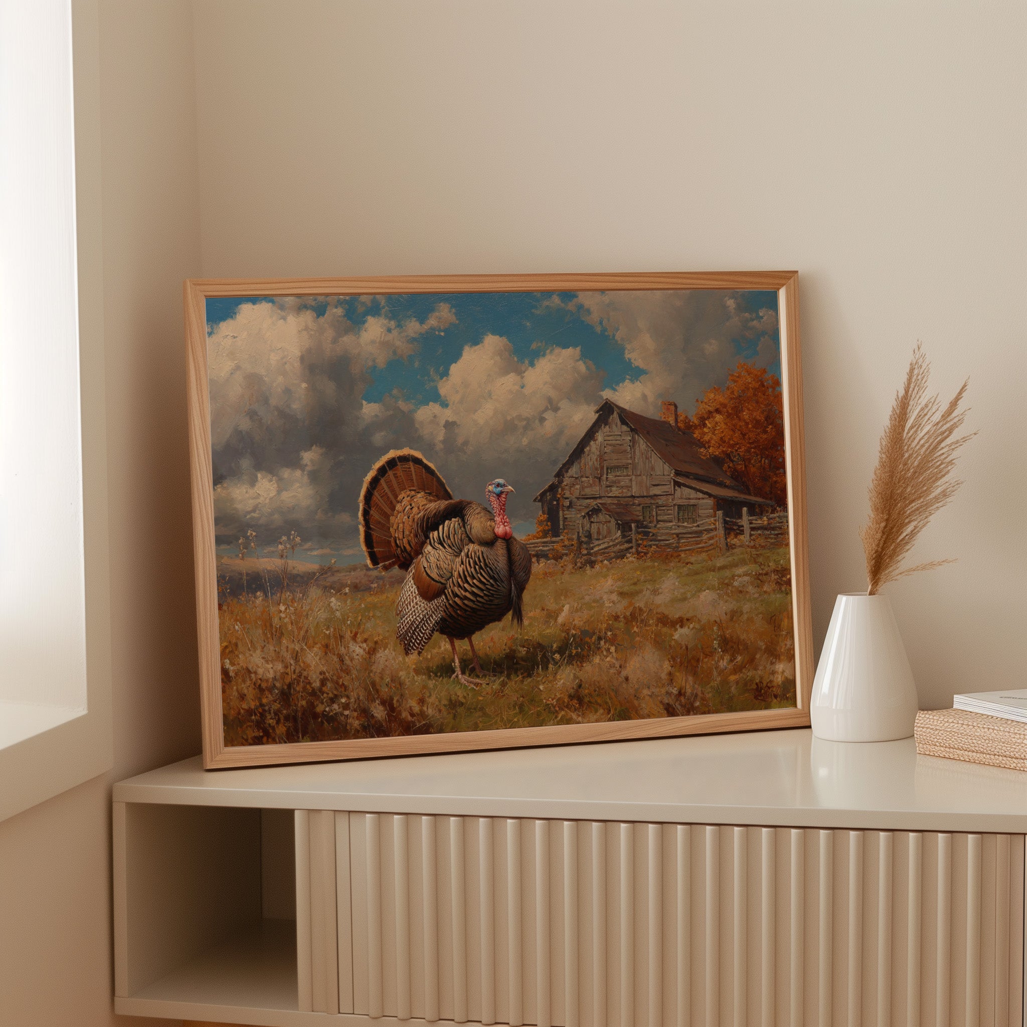 A proud wild turkey commands the foreground, its magnificent feathers on full display against a backdrop of golden autumn grass. The scene captures the quintessential American farmland spirit, where a weathered barn stands sentinel amid copper-leafed trees and billowing clouds. Rich textures emerge through detailed brushstrokes, from the turkey's intricate plumage to the rough-hewn wooden planks of the old barn. This pastoral moment speaks to the timeless connection between wildlife and rural landscapes.
