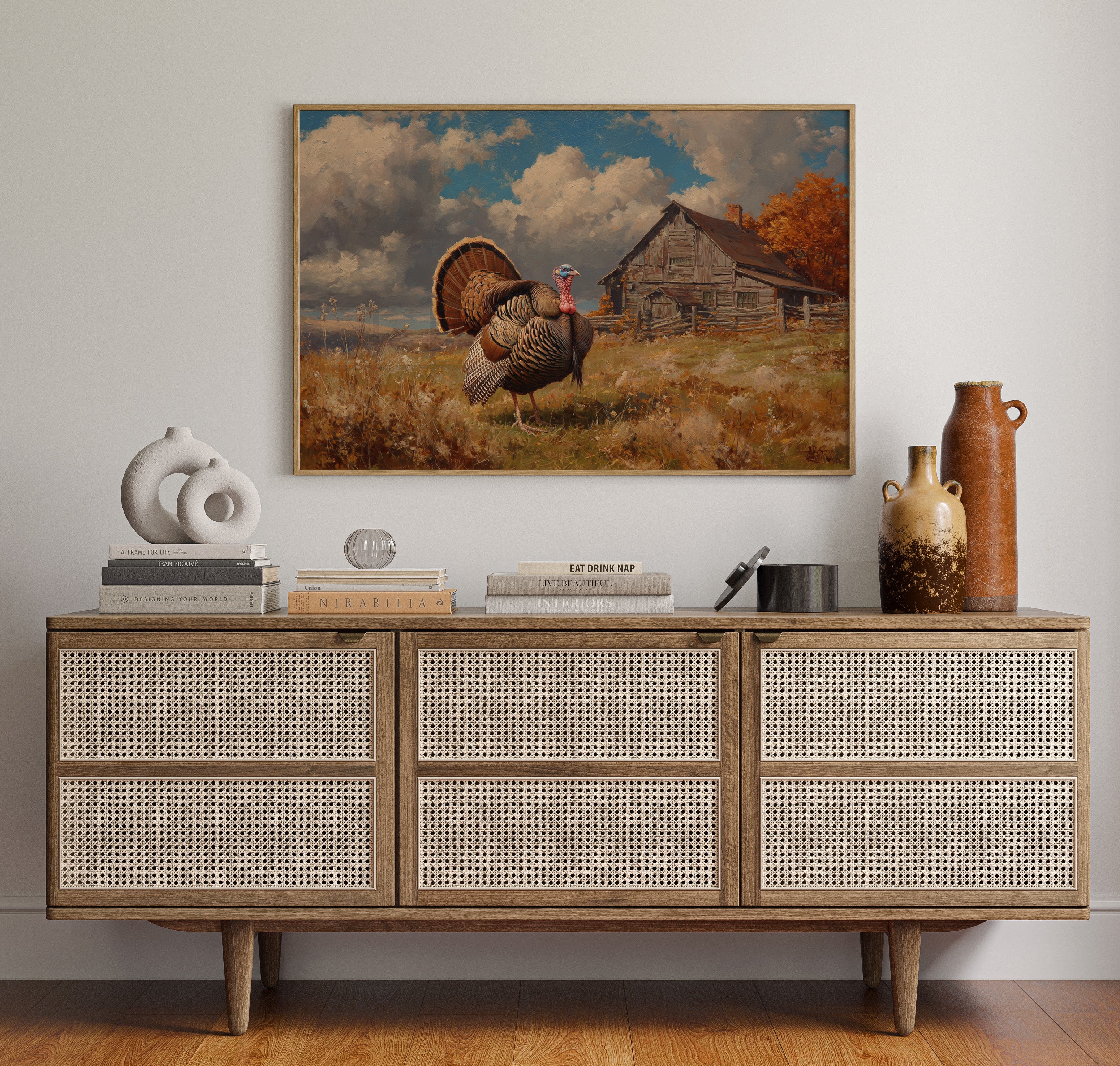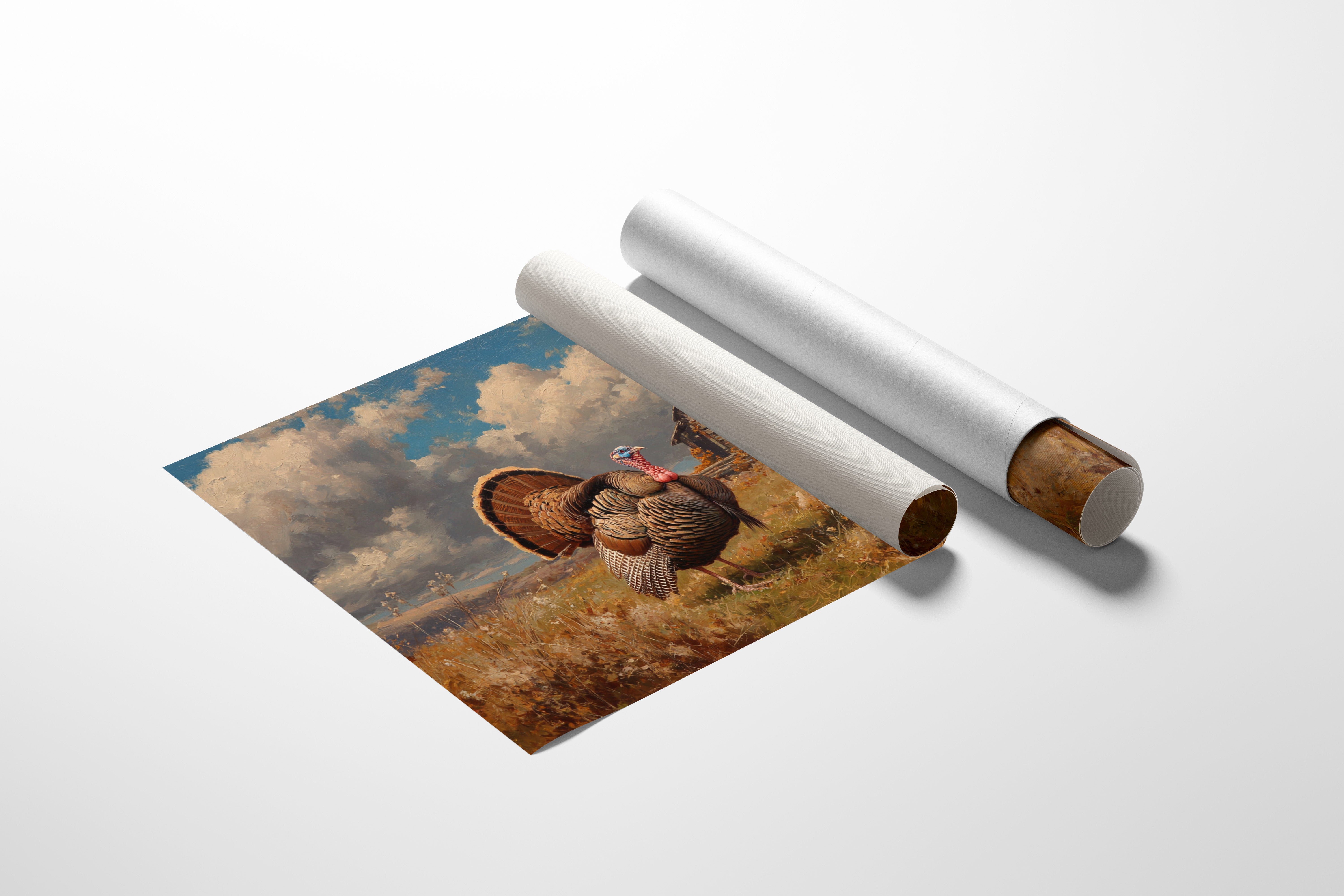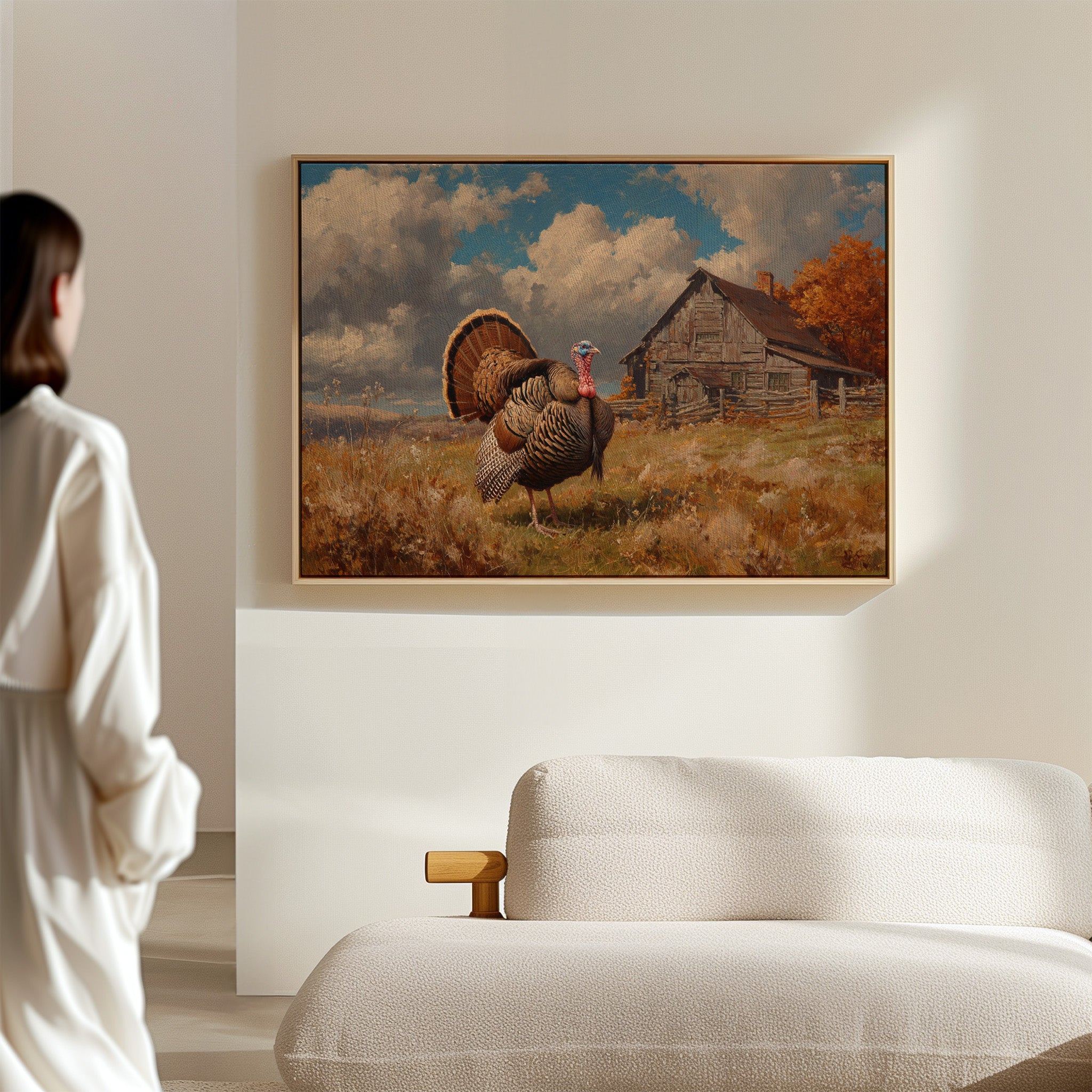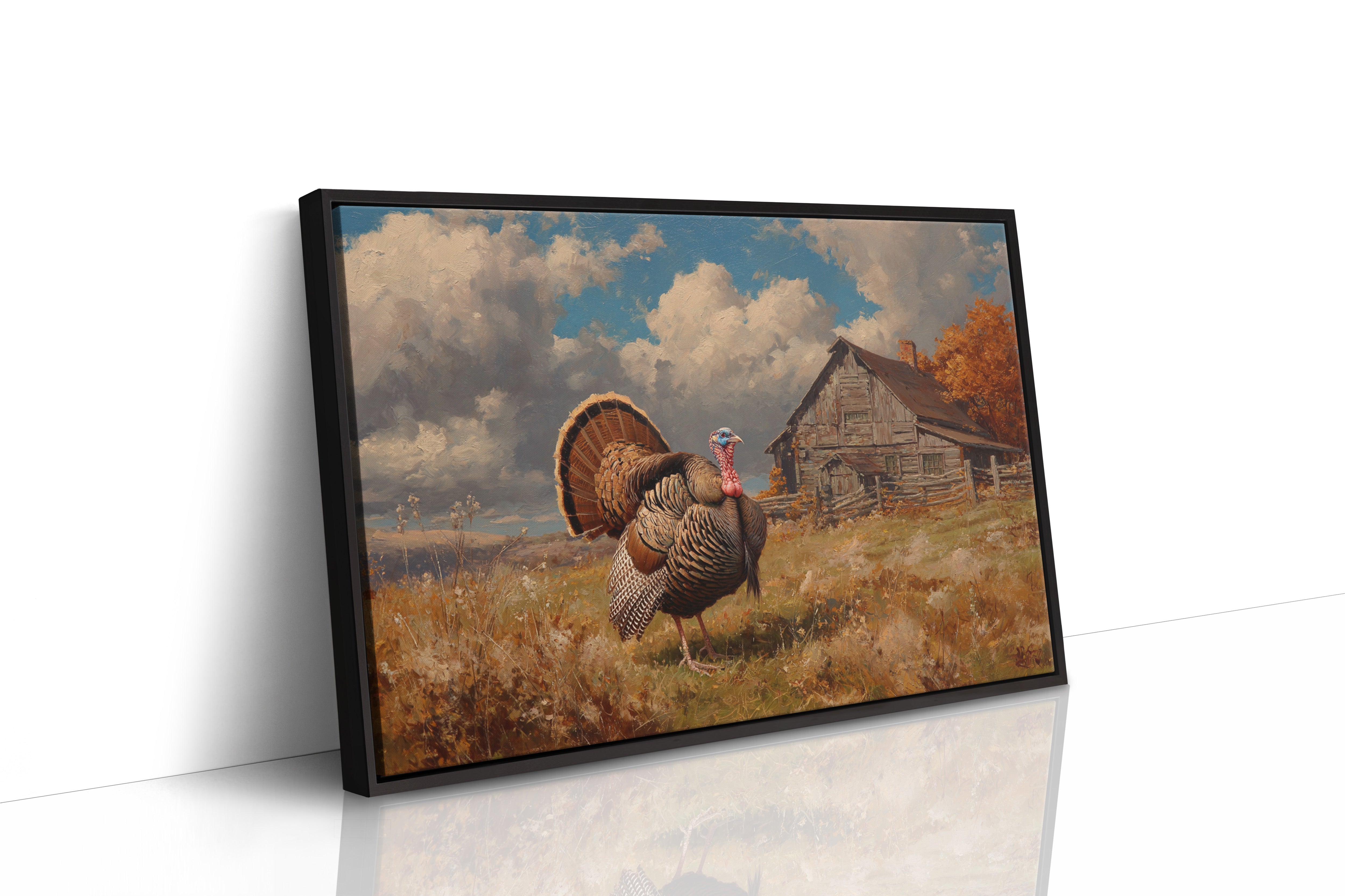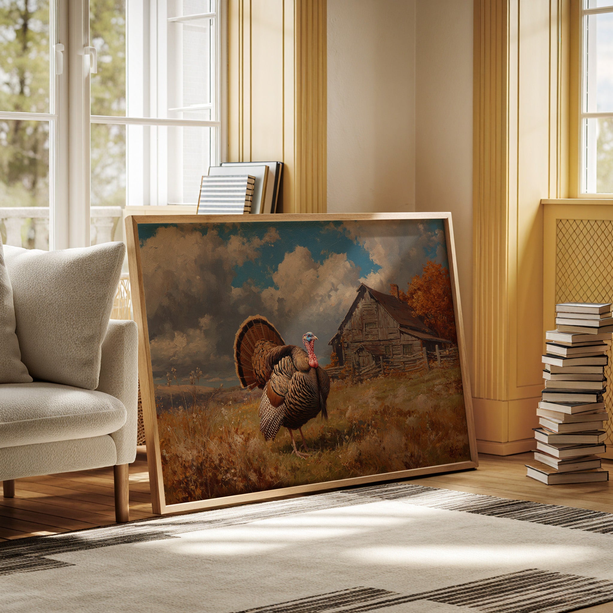 A proud wild turkey commands the foreground, its magnificent feathers on full display against a backdrop of golden autumn grass. The scene captures the quintessential American farmland spirit, where a weathered barn stands sentinel amid copper-leafed trees and billowing clouds. Rich textures emerge through detailed brushstrokes, from the turkey's intricate plumage to the rough-hewn wooden planks of the old barn. This pastoral moment speaks to the timeless connection between wildlife and rural landscapes.