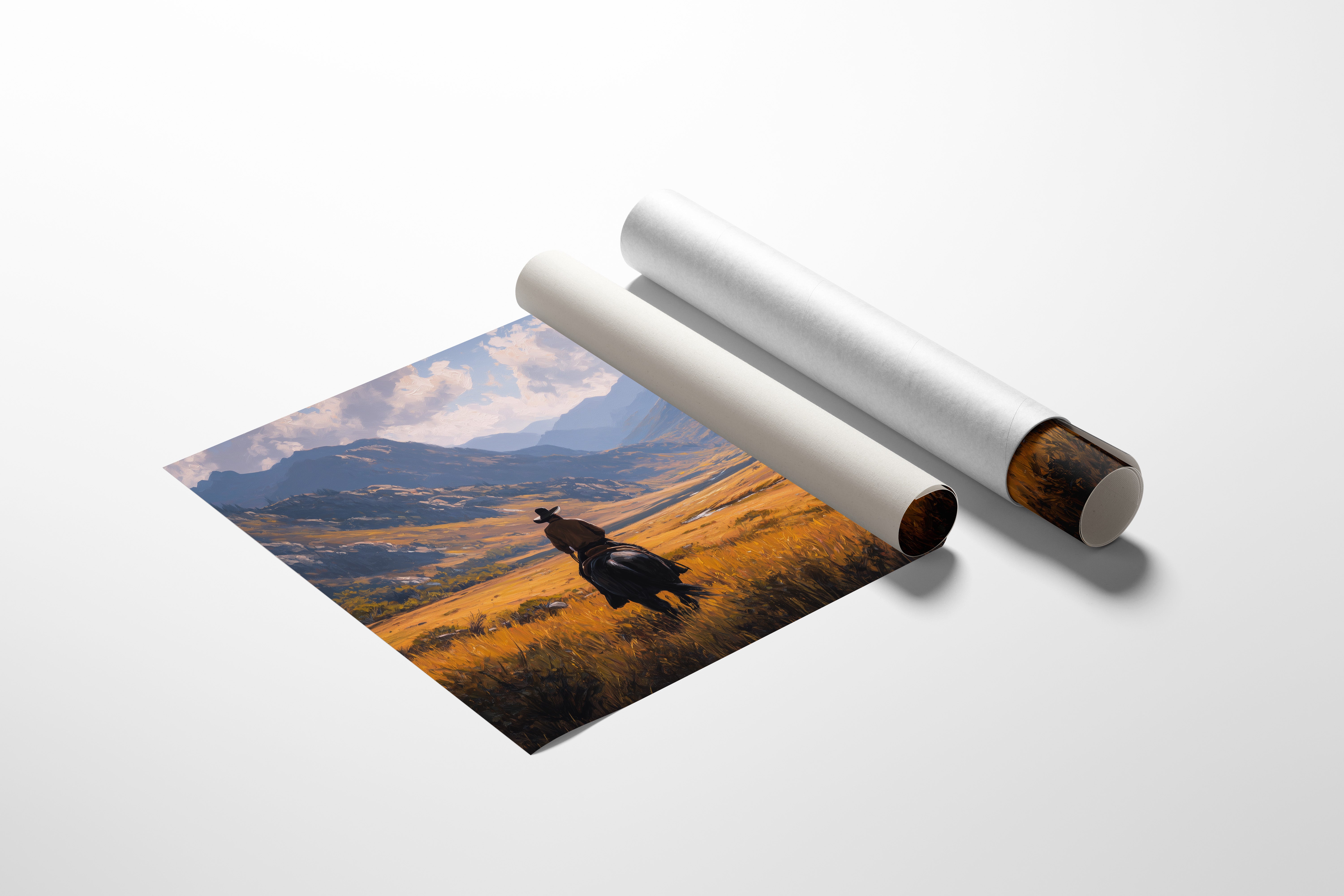 A solitary rider pauses at the threshold of majesty, where golden grasslands meet towering peaks. The winding river below catches glints of afternoon light, leading the eye through a valley painted in autumn's warmest hues. Mountain sentinels stand watch over this peaceful sanctuary, their rugged slopes softened by distant haze and gathering clouds. This contemplative scene captures the profound connection between human spirit and untamed wilderness. Perfect for a statement piece in a grand living room or as an inspiring focal point in a home office where big dreams take shape.