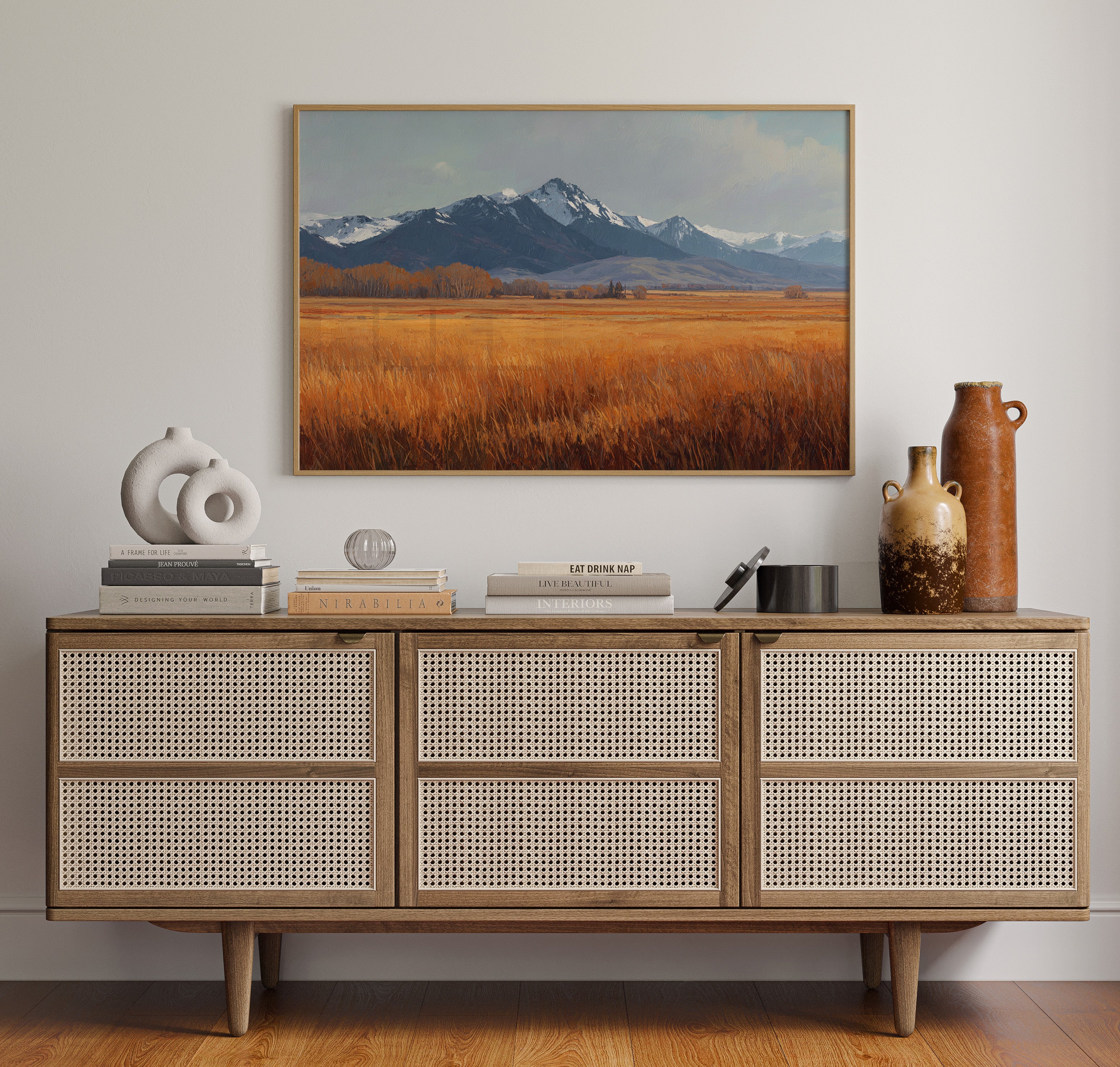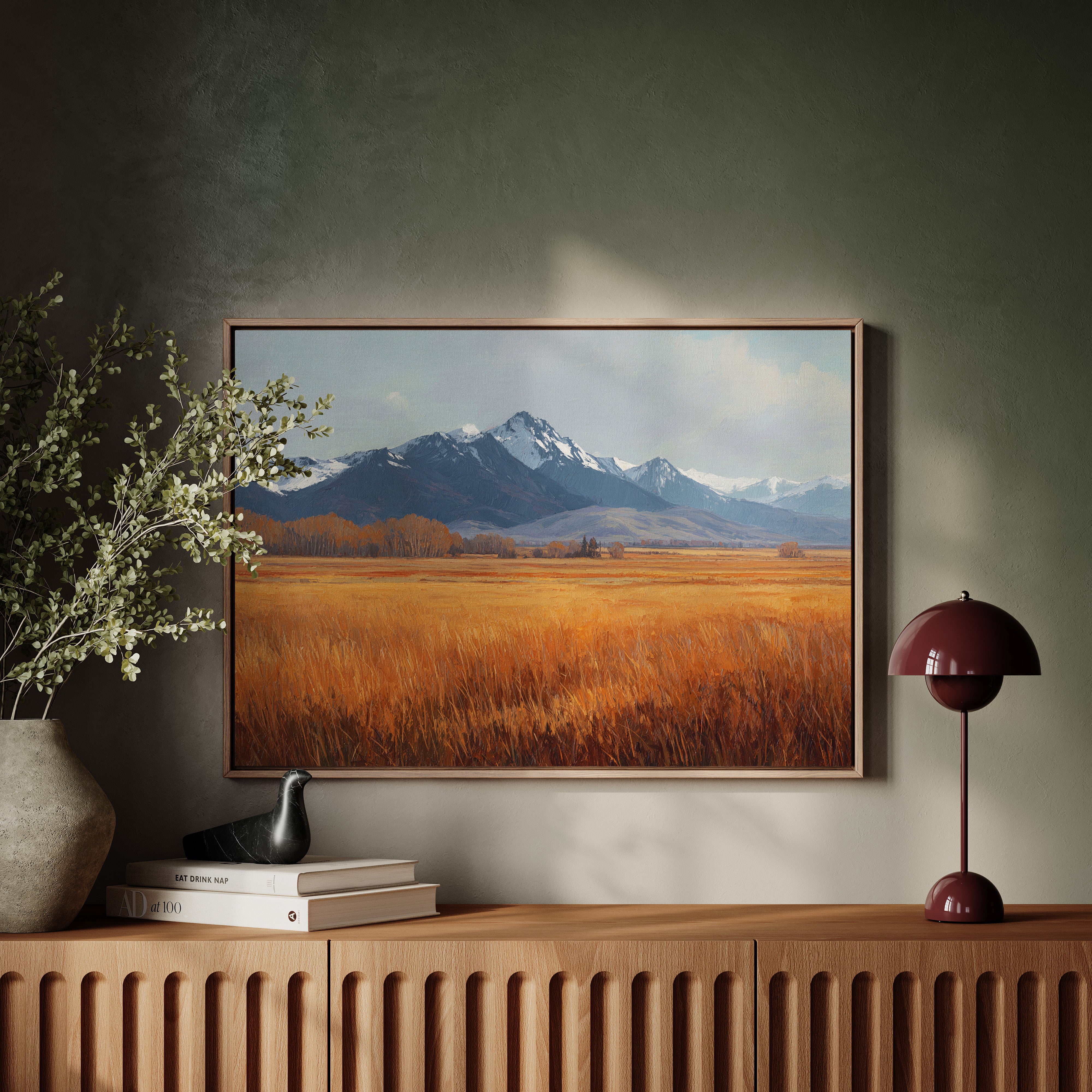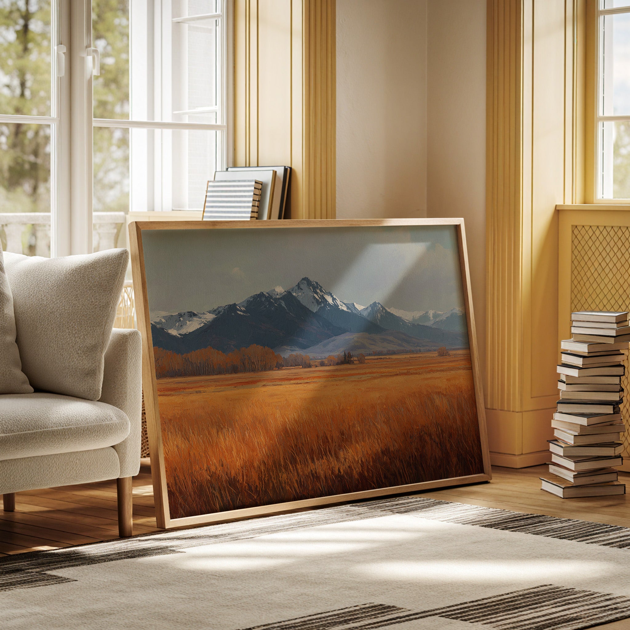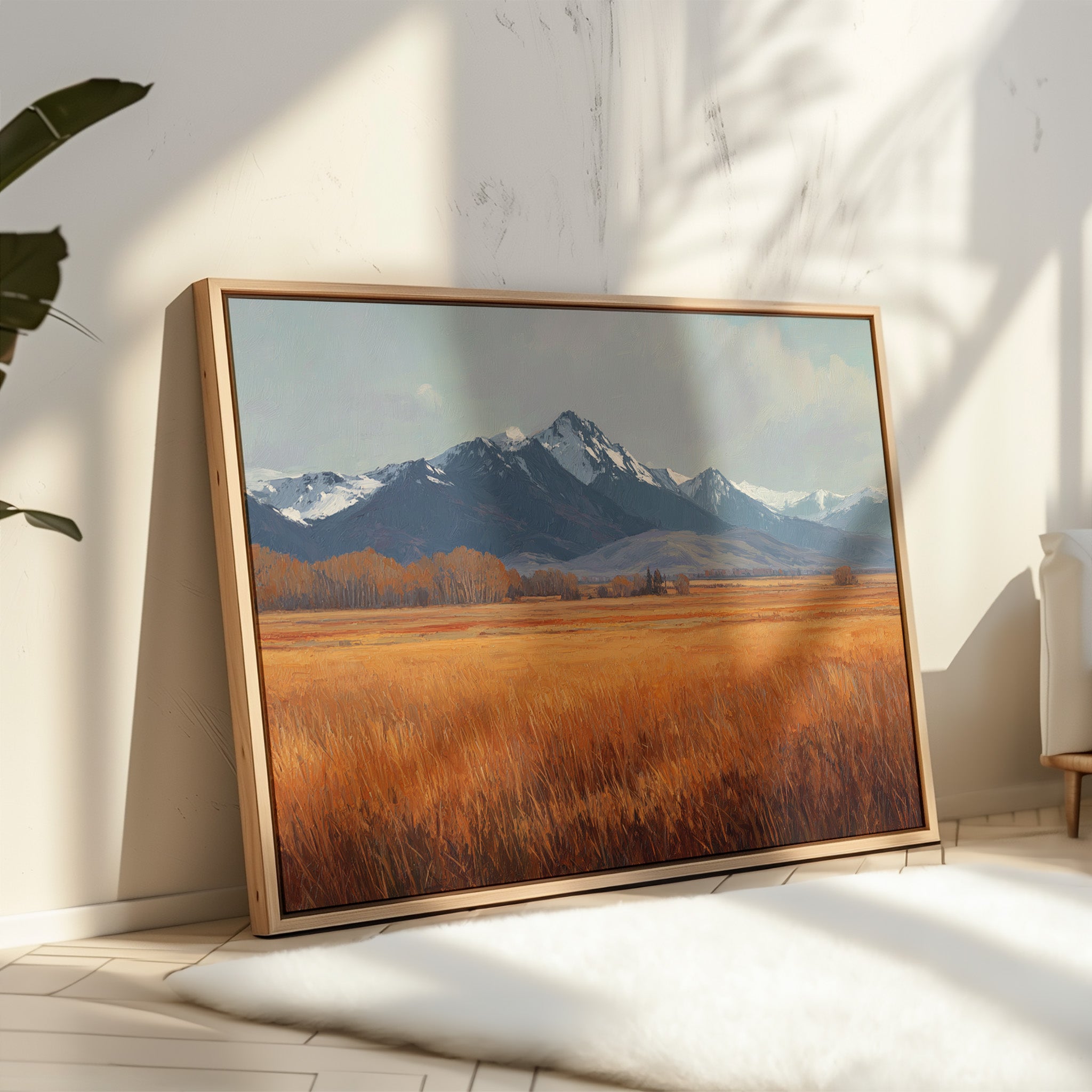 Golden prairie grass sways beneath the watchful gaze of snow-capped mountains, creating a symphony of warmth and winter's chill. The landscape unfolds in rich amber waves that stretch toward distant peaks, their rugged silhouettes cutting sharp lines against a pearl-gray sky. In the middle ground, clusters of rust-colored trees stand as sentinels between the untamed grasslands and the mighty mountains, while delicate brushstrokes capture the interplay of light across the windswept plain.