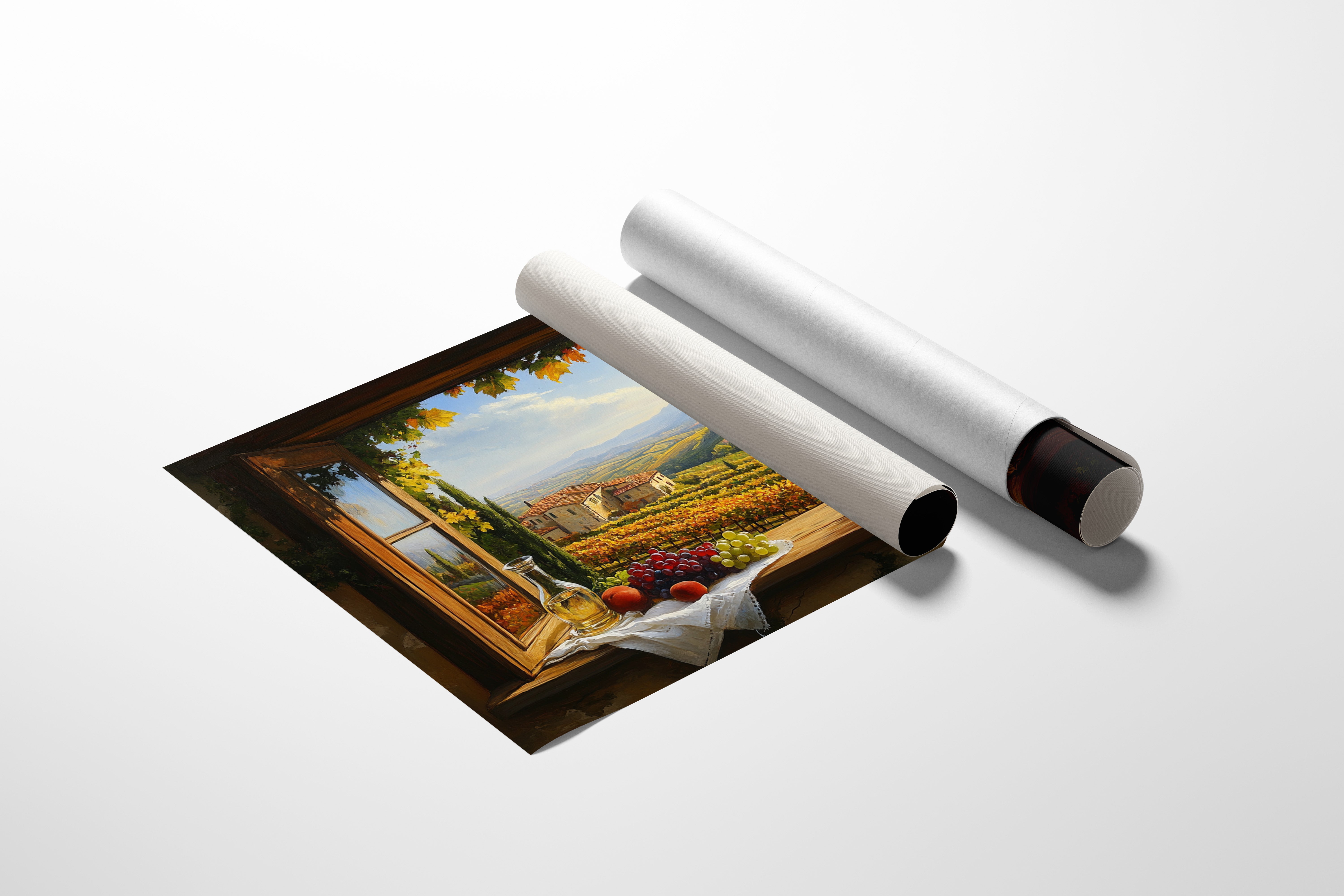 Golden sunlight spills across a rustic windowsill, where fresh peaches and multicolored grapes rest beside a crystal decanter, telling stories of harvest abundance. Beyond the weathered wooden frame, rolling vineyards paint the hillsides in autumn's palette, while cypress trees stand sentinel along winding paths leading to distant stone villas. The scene captures the essence of Italian countryside living, where each day begins with nature's offerings and endless views of the pastoral landscape. Perfect for dining rooms or kitchen spaces where it will inspire gatherings and celebrate the timeless appeal of Mediterranean living.