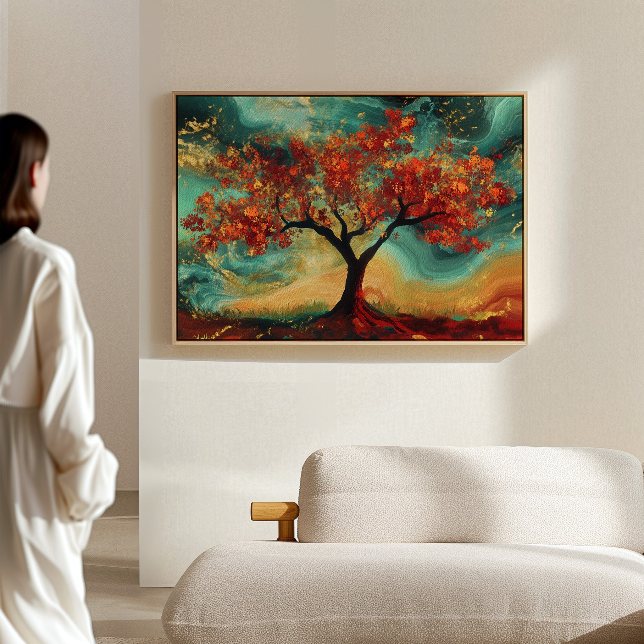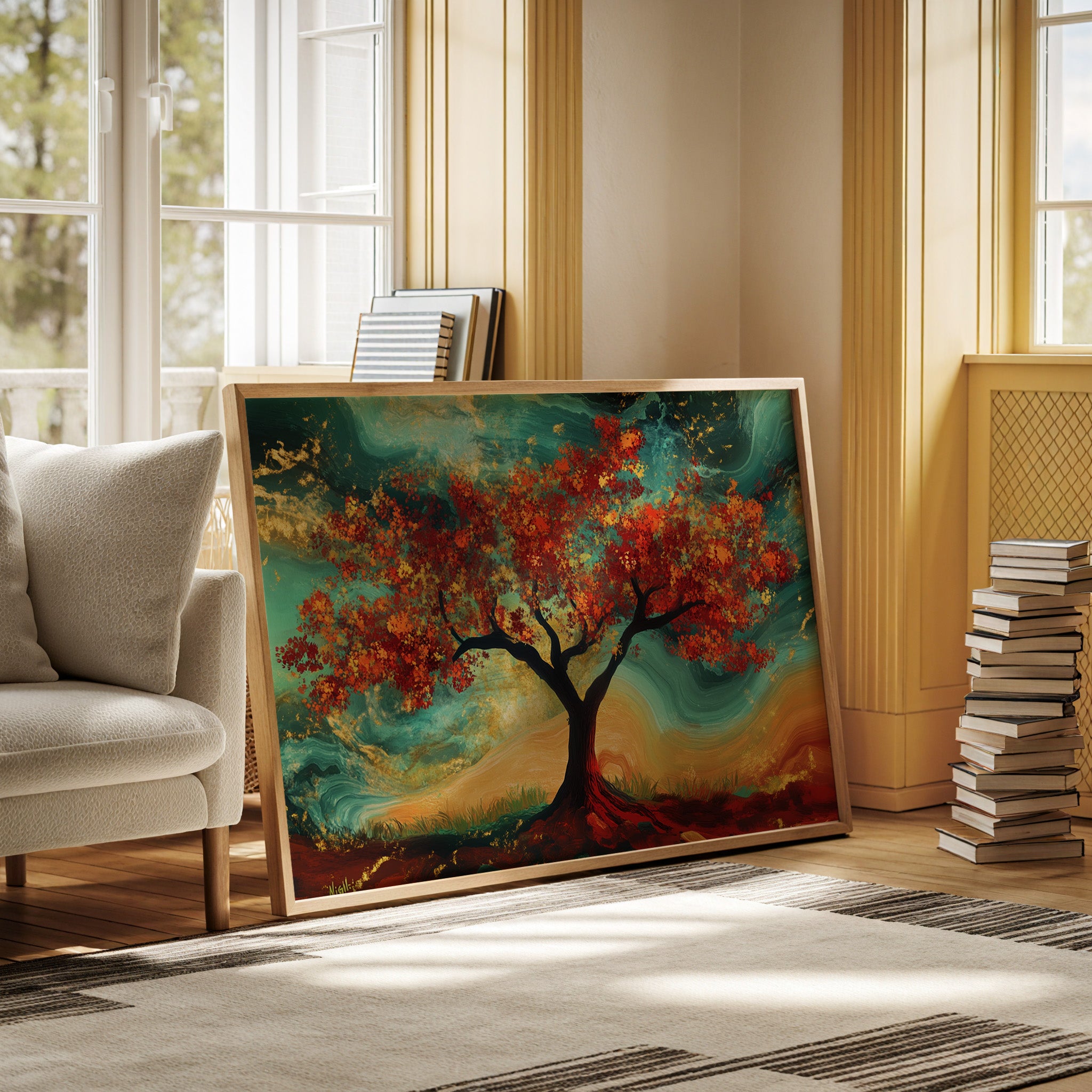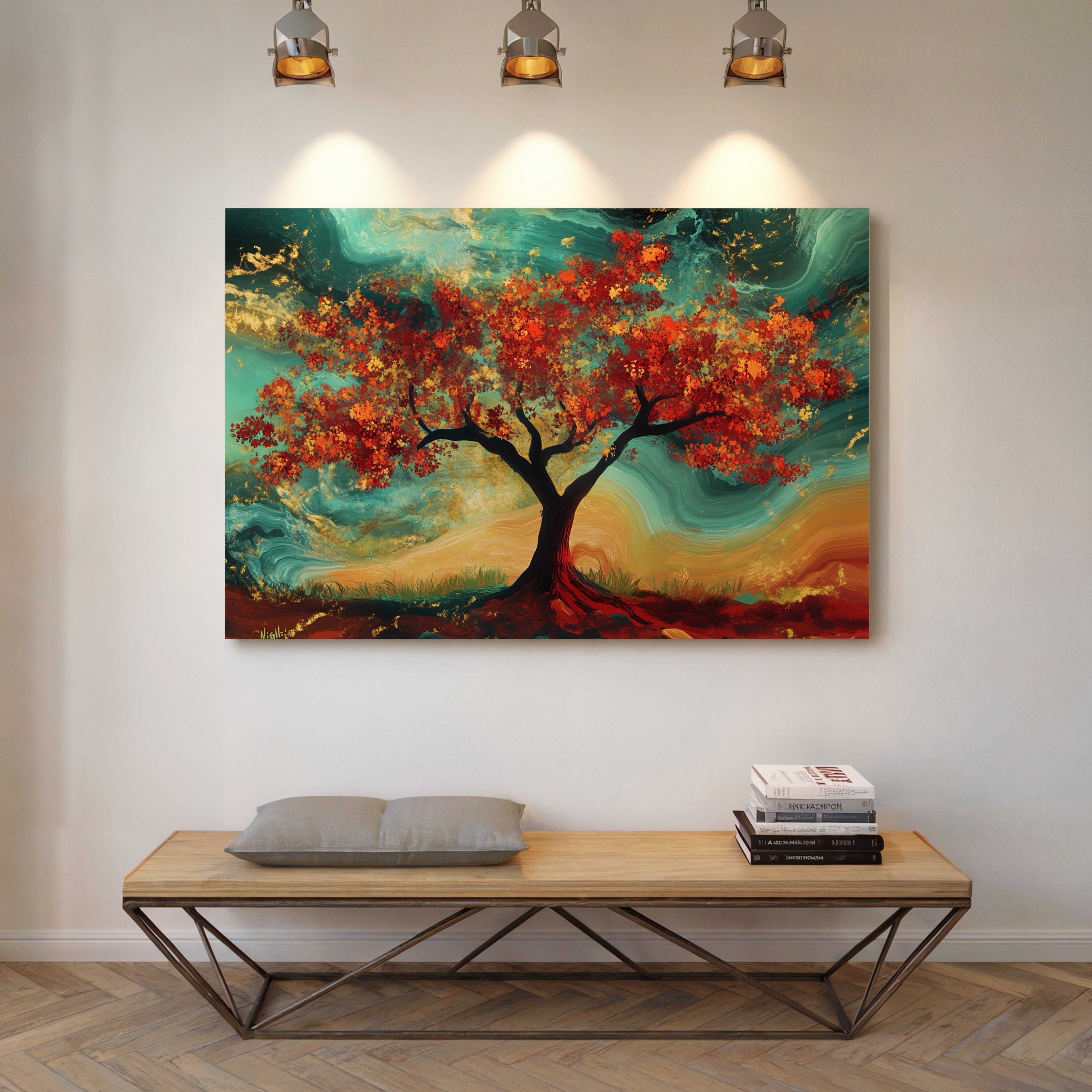 A solitary tree stands majestic against a swirling turquoise sky, its branches adorned with a brilliant display of crimson and orange leaves. The ethereal scene captures the moment where earth meets heaven, as golden specks dance through the air like nature's own constellation. Deep reds and rich oranges cascade through the canopy, creating a symphony of autumn colors against the dramatic teal backdrop of wind-swept clouds. The twisted trunk anchors the composition, its dark silhouette grounding the otherworldly display above.