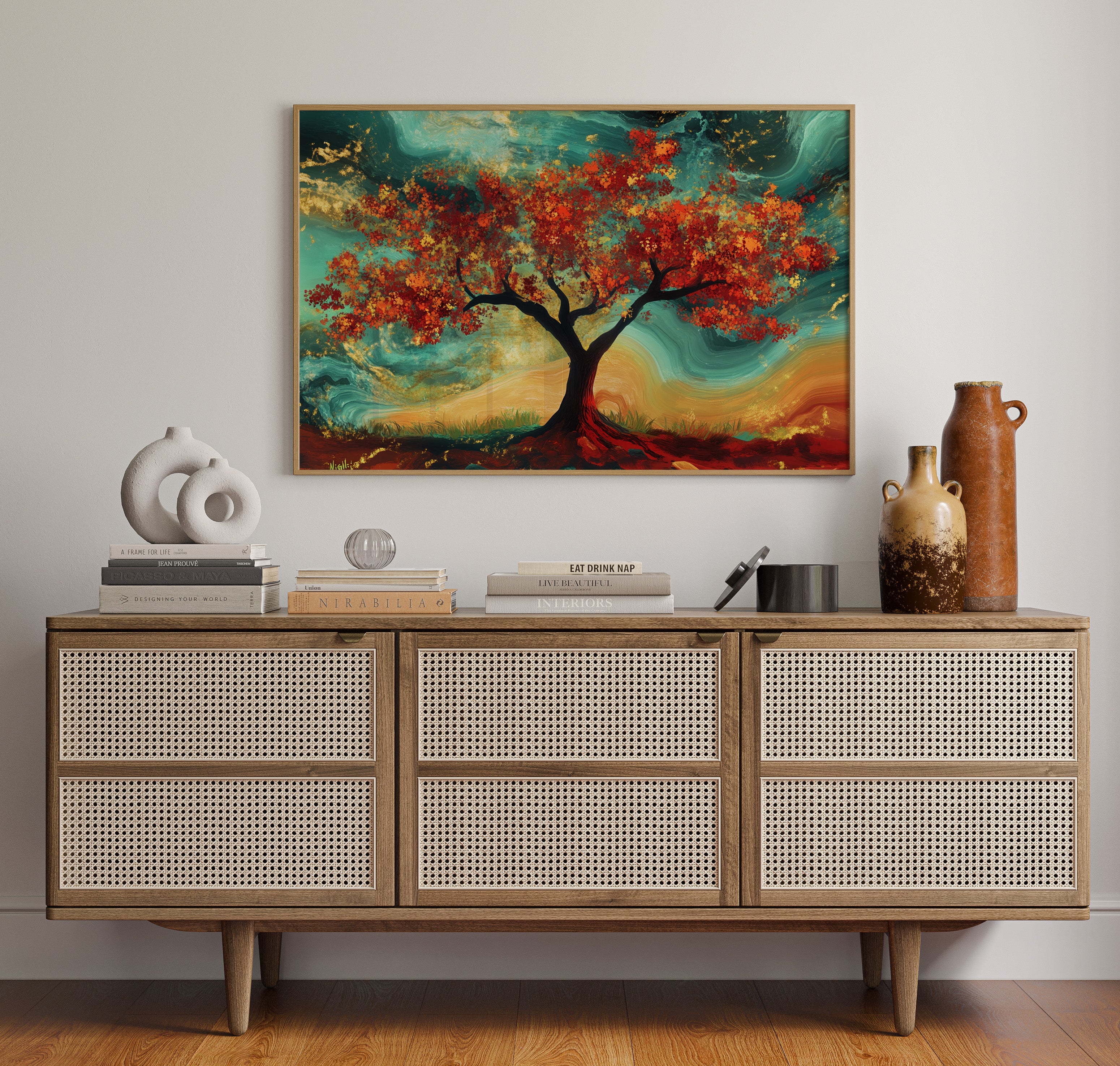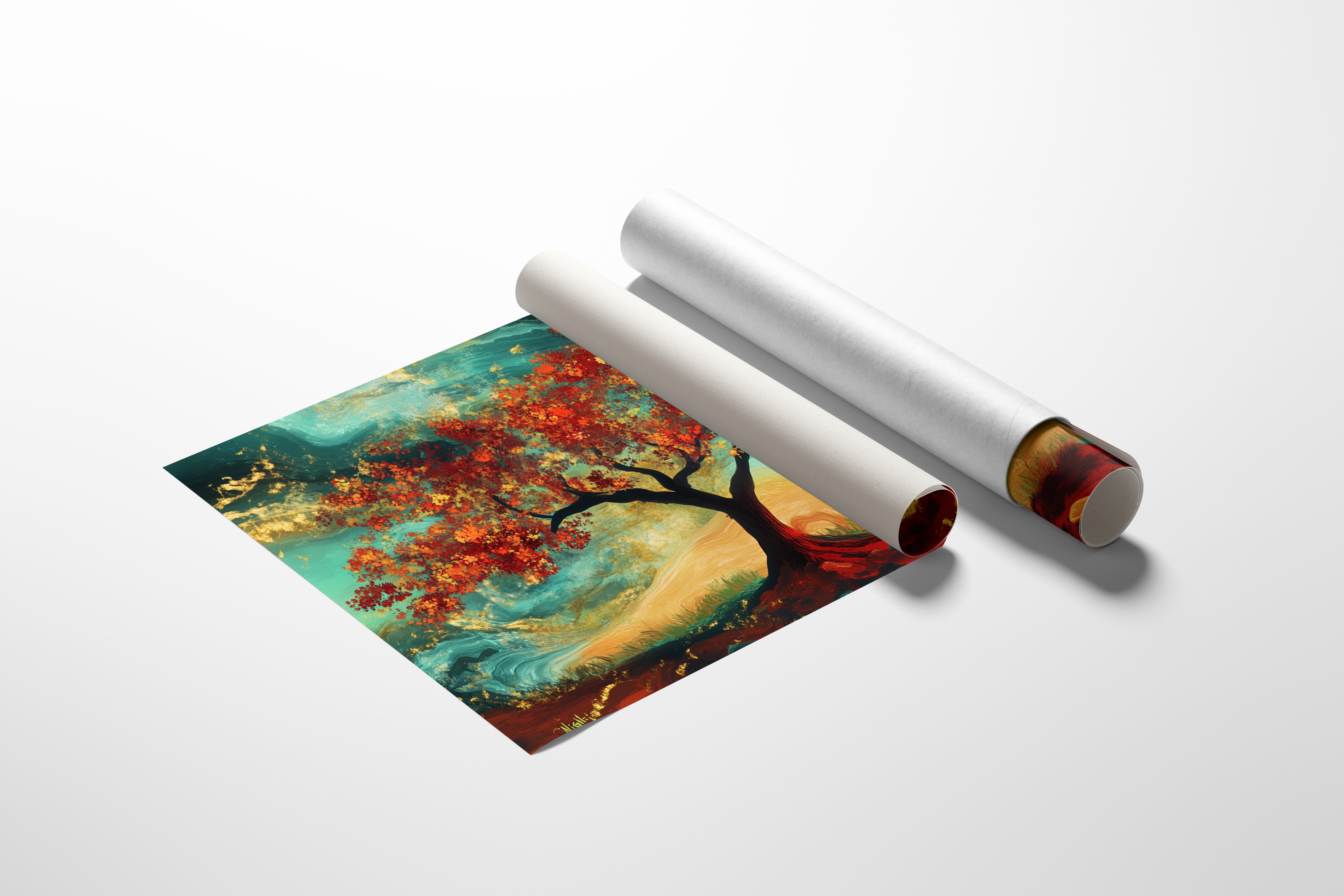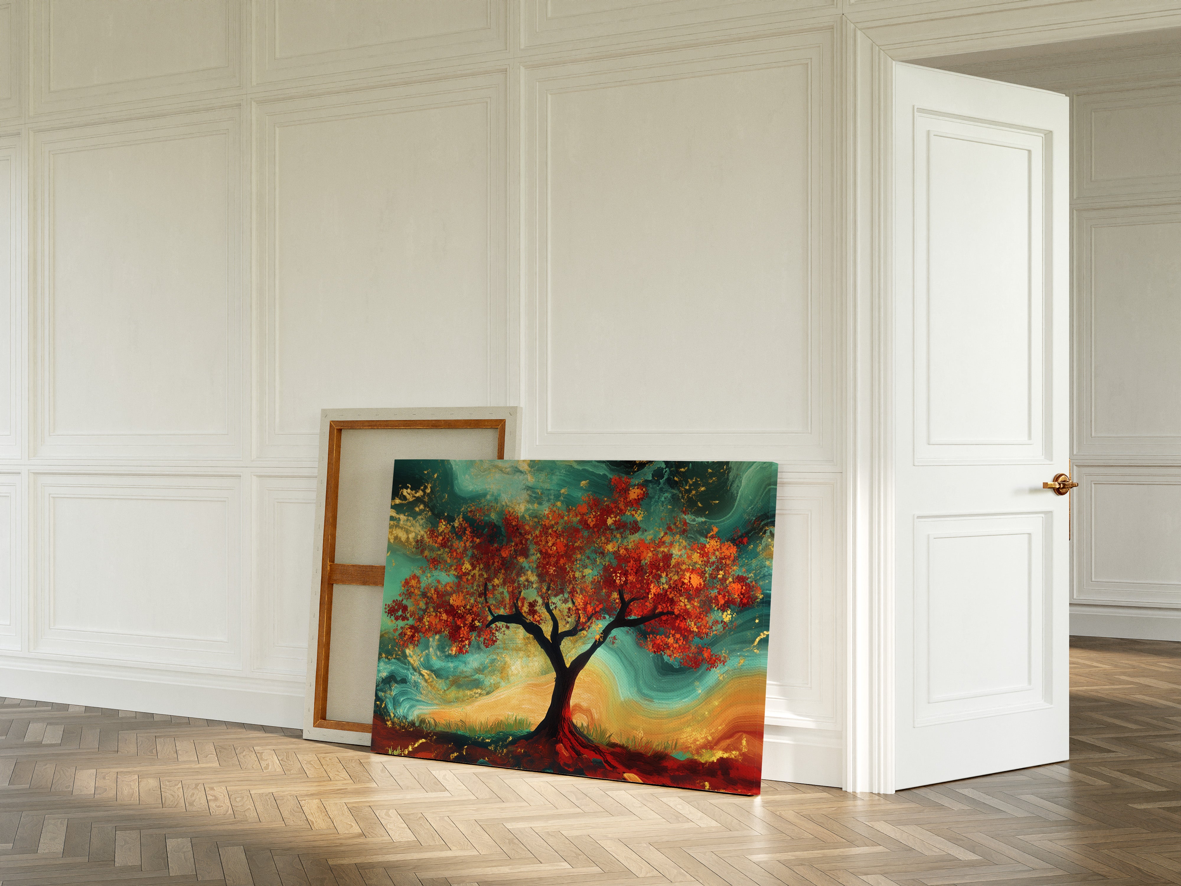 A solitary tree stands majestic against a swirling turquoise sky, its branches adorned with a brilliant display of crimson and orange leaves. The ethereal scene captures the moment where earth meets heaven, as golden specks dance through the air like nature's own constellation. Deep reds and rich oranges cascade through the canopy, creating a symphony of autumn colors against the dramatic teal backdrop of wind-swept clouds. The twisted trunk anchors the composition, its dark silhouette grounding the otherworldly display above.