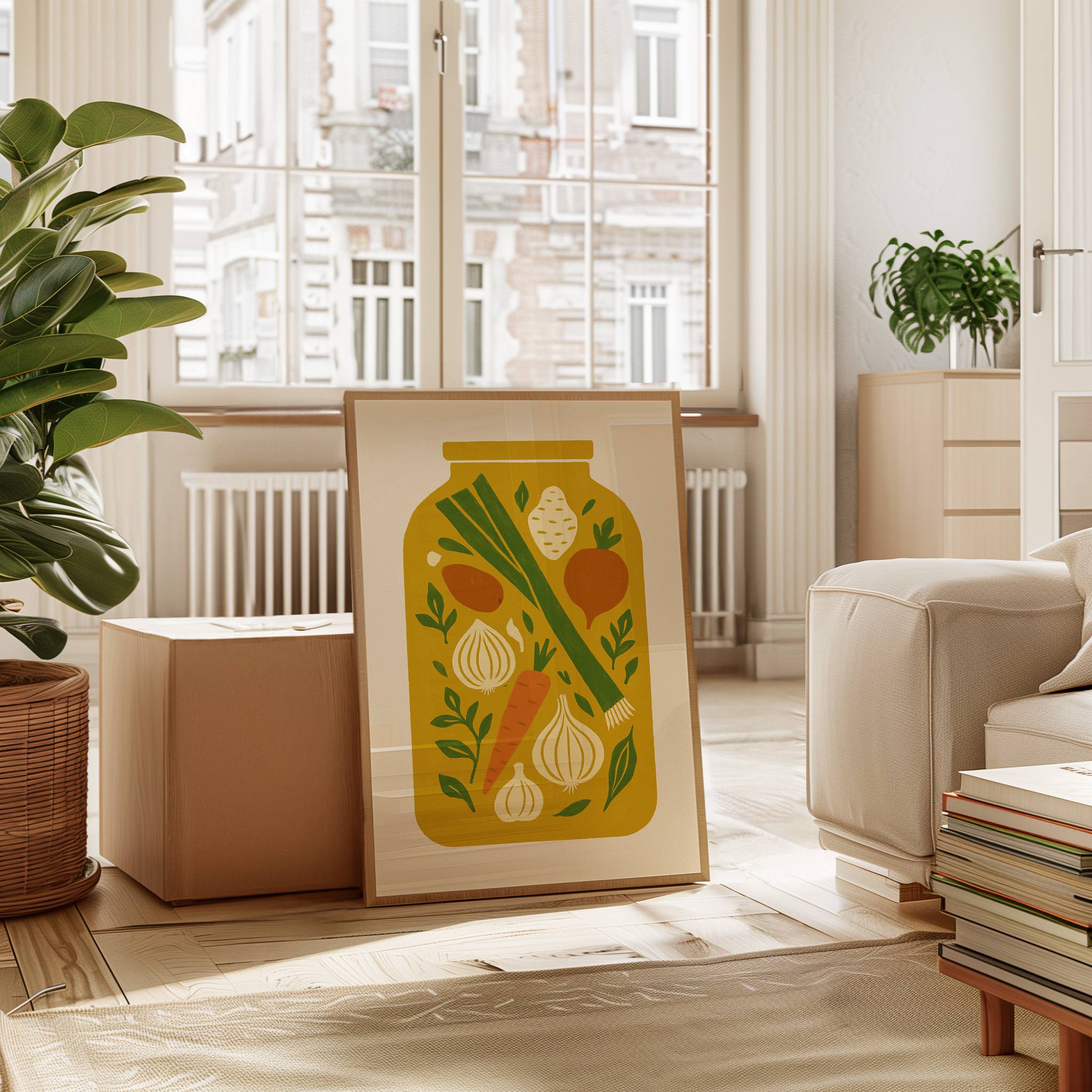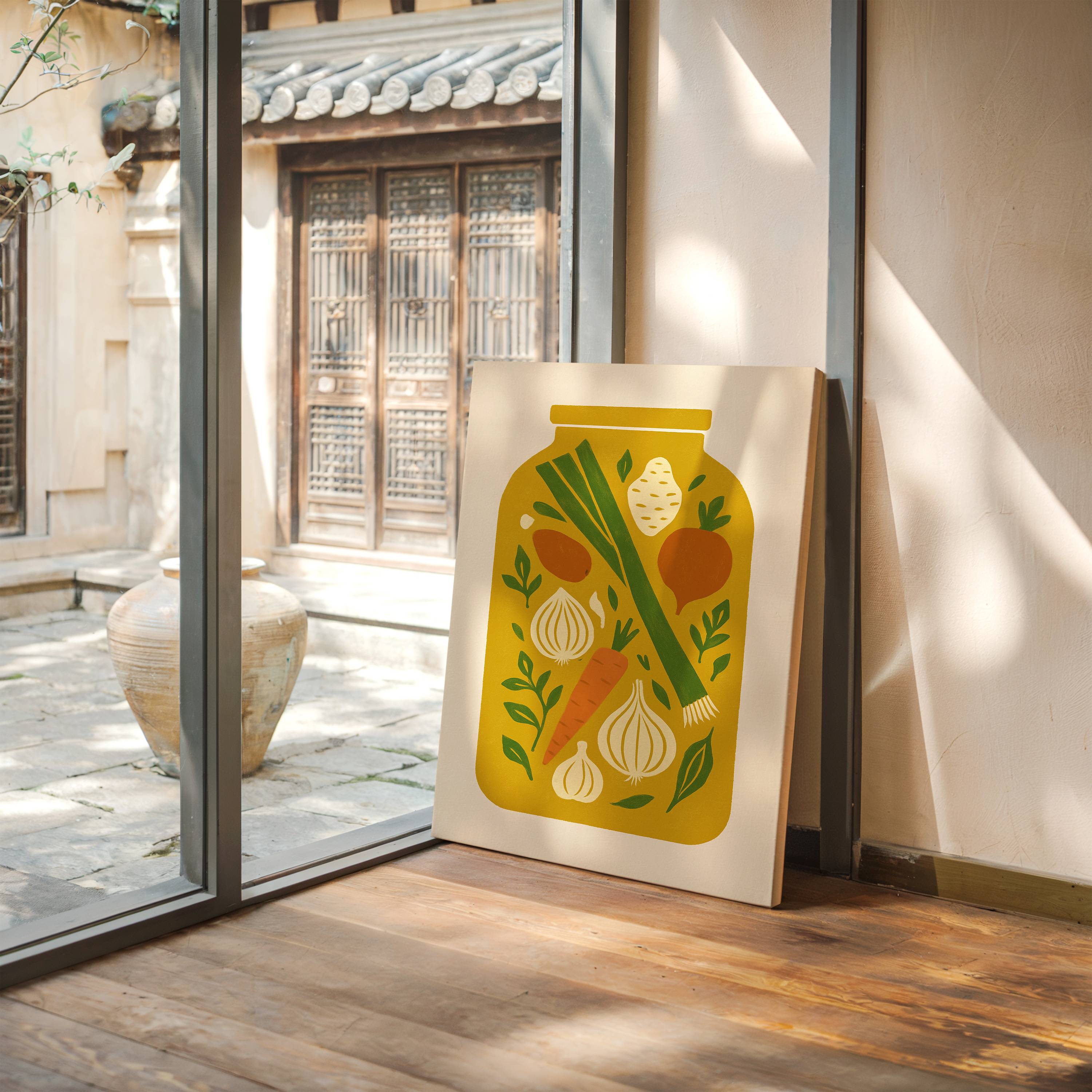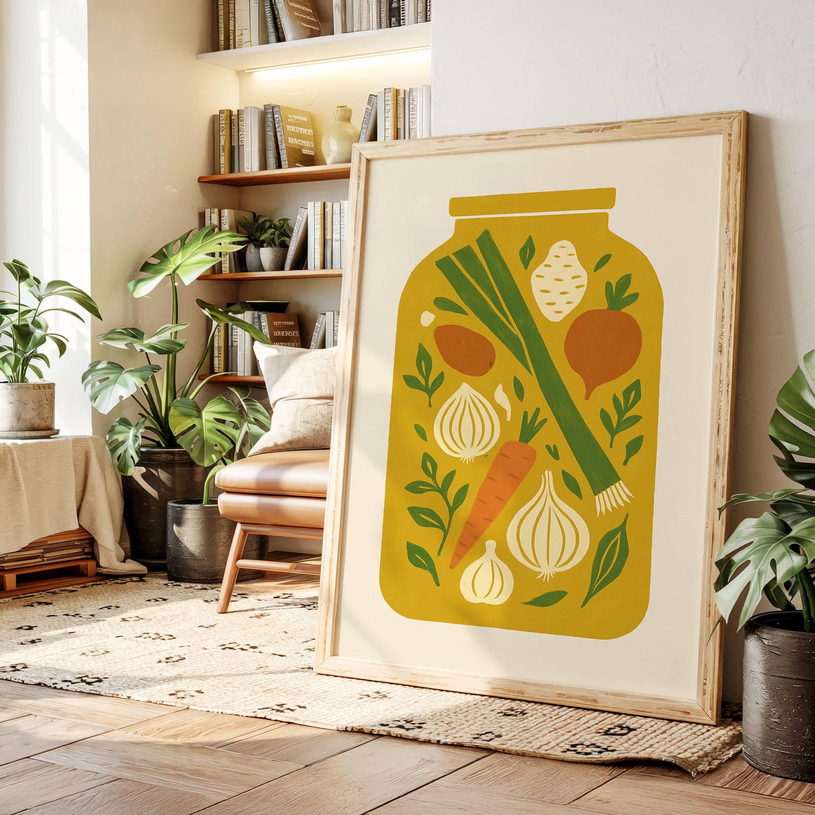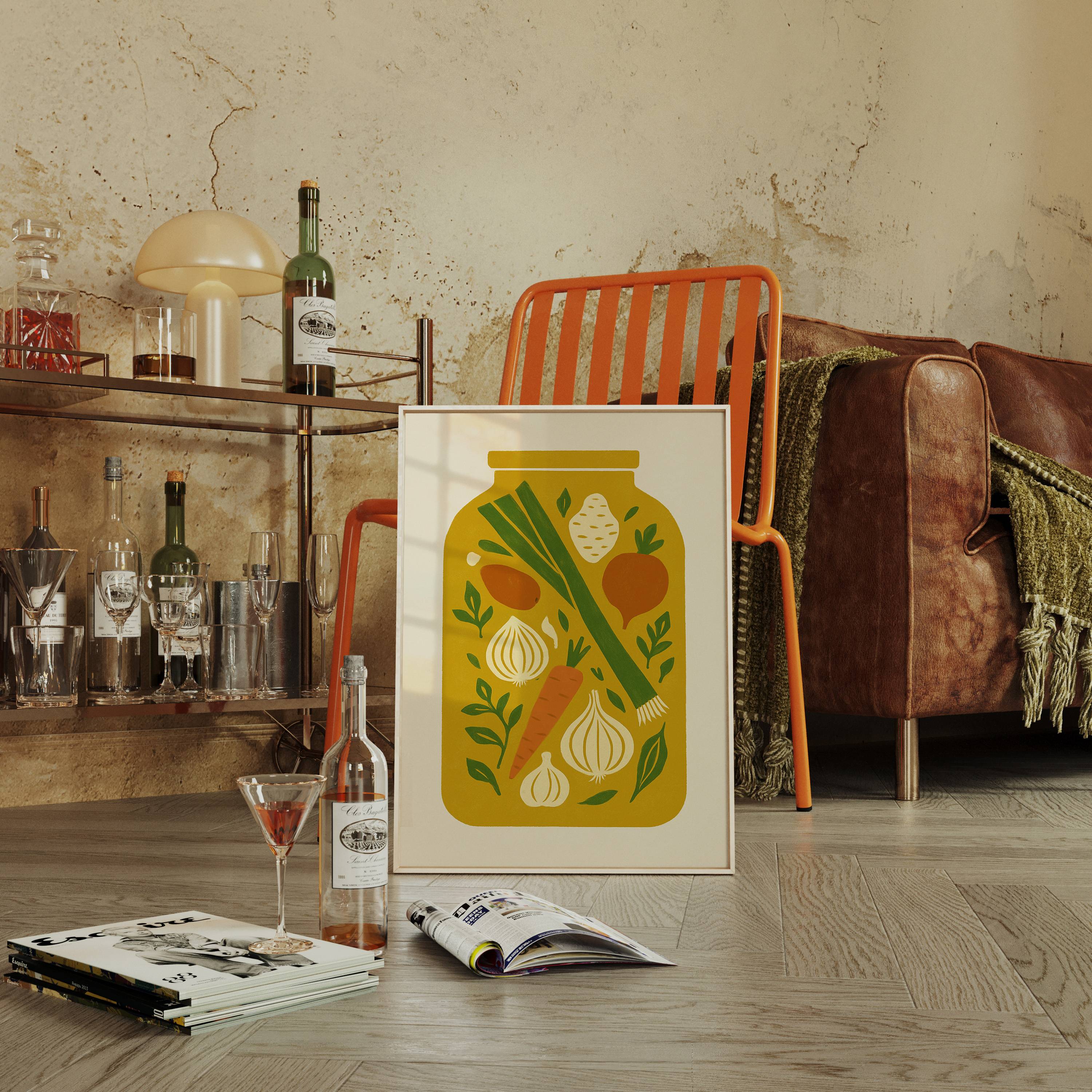 Preserved moments of garden bounty float like memories in golden light. Crisp carrots, aromatic onions, and fresh leeks dance among scattered herbs, creating a nostalgic snapshot of harvest season's peak. The simple composition captures the essence of home cooking and seasonal preparation, each ingredient telling its own story of earth and sunshine. This contemporary folk art piece brings warmth and culinary charm to kitchen spaces, perfectly suited for a modern farmhouse dining area or chef's sanctuary.