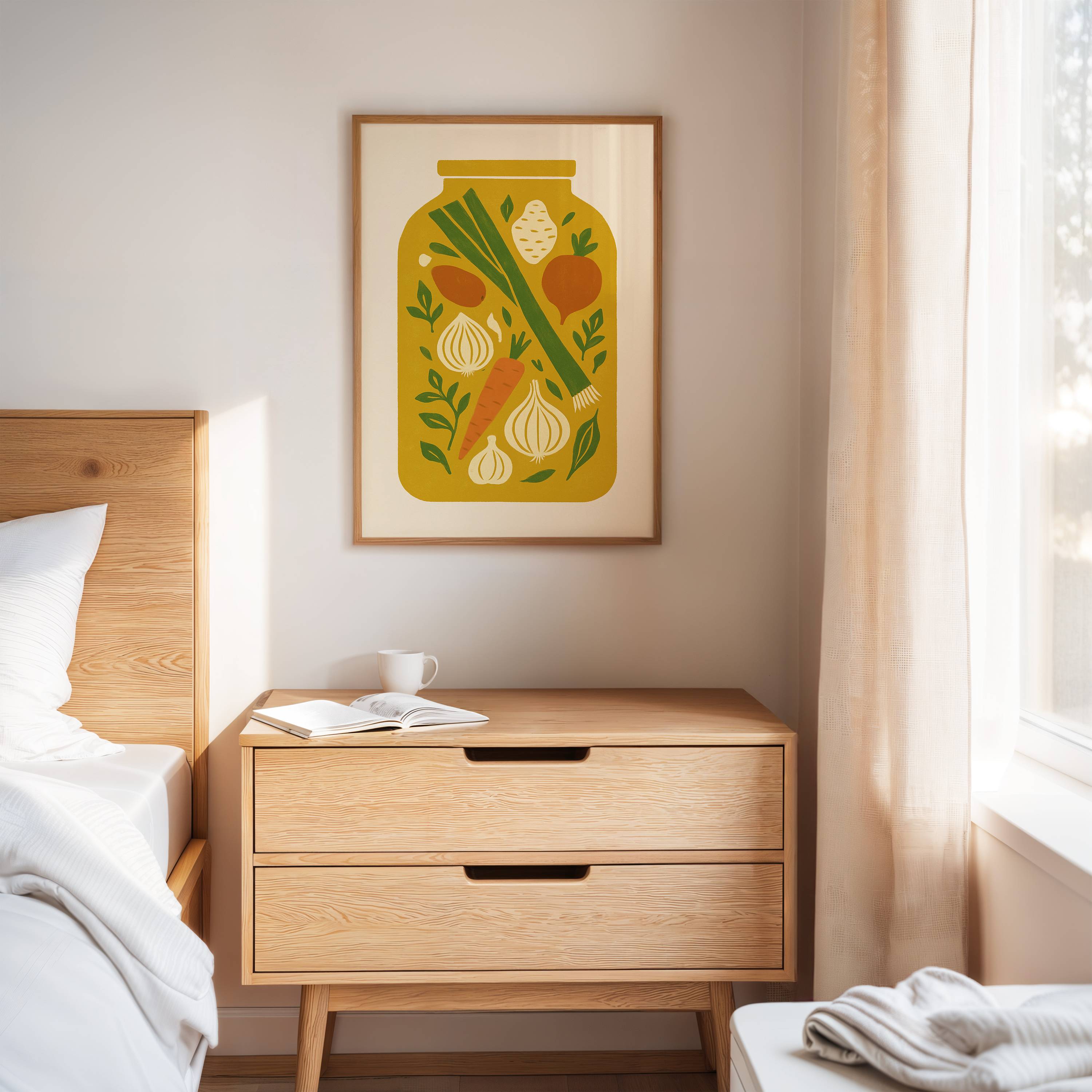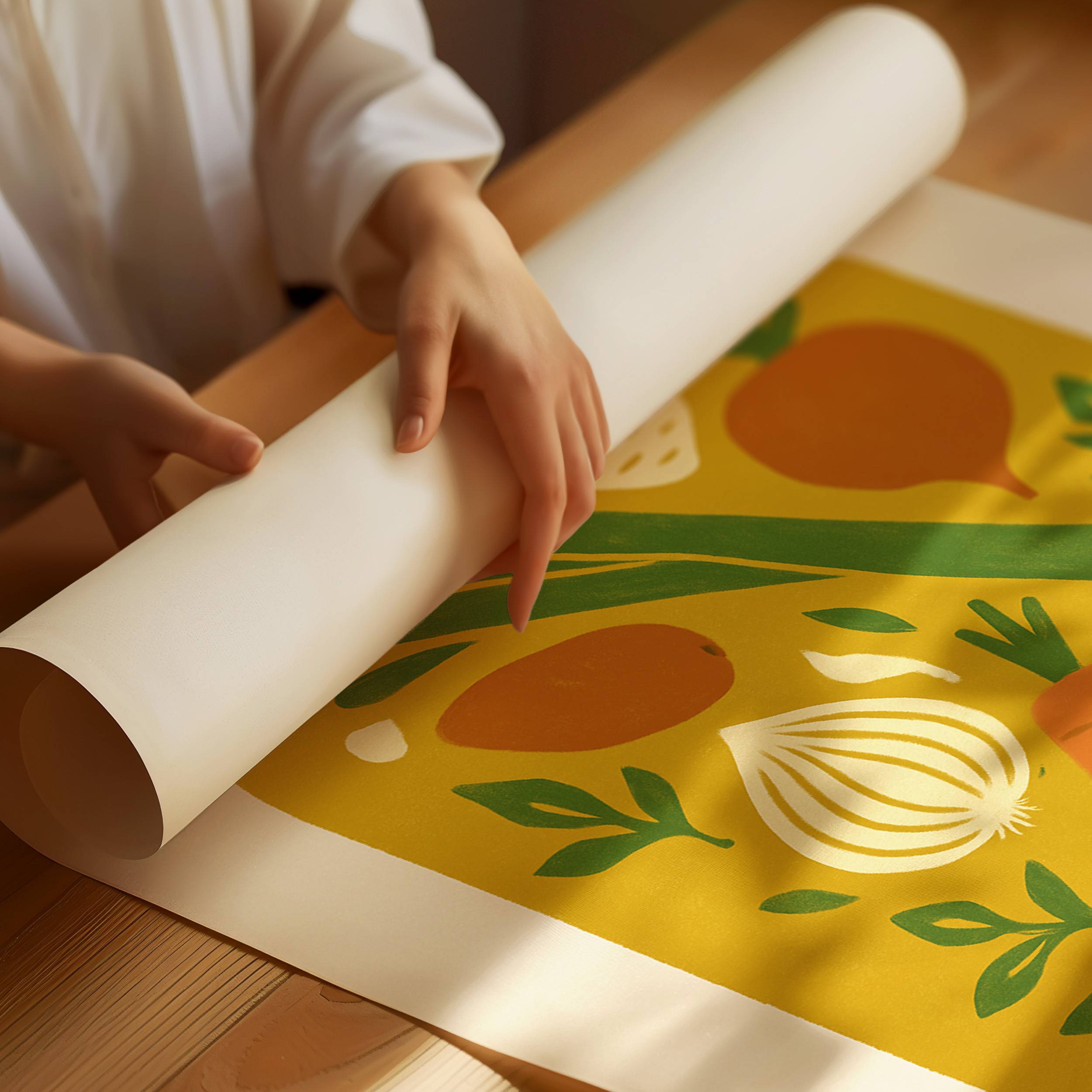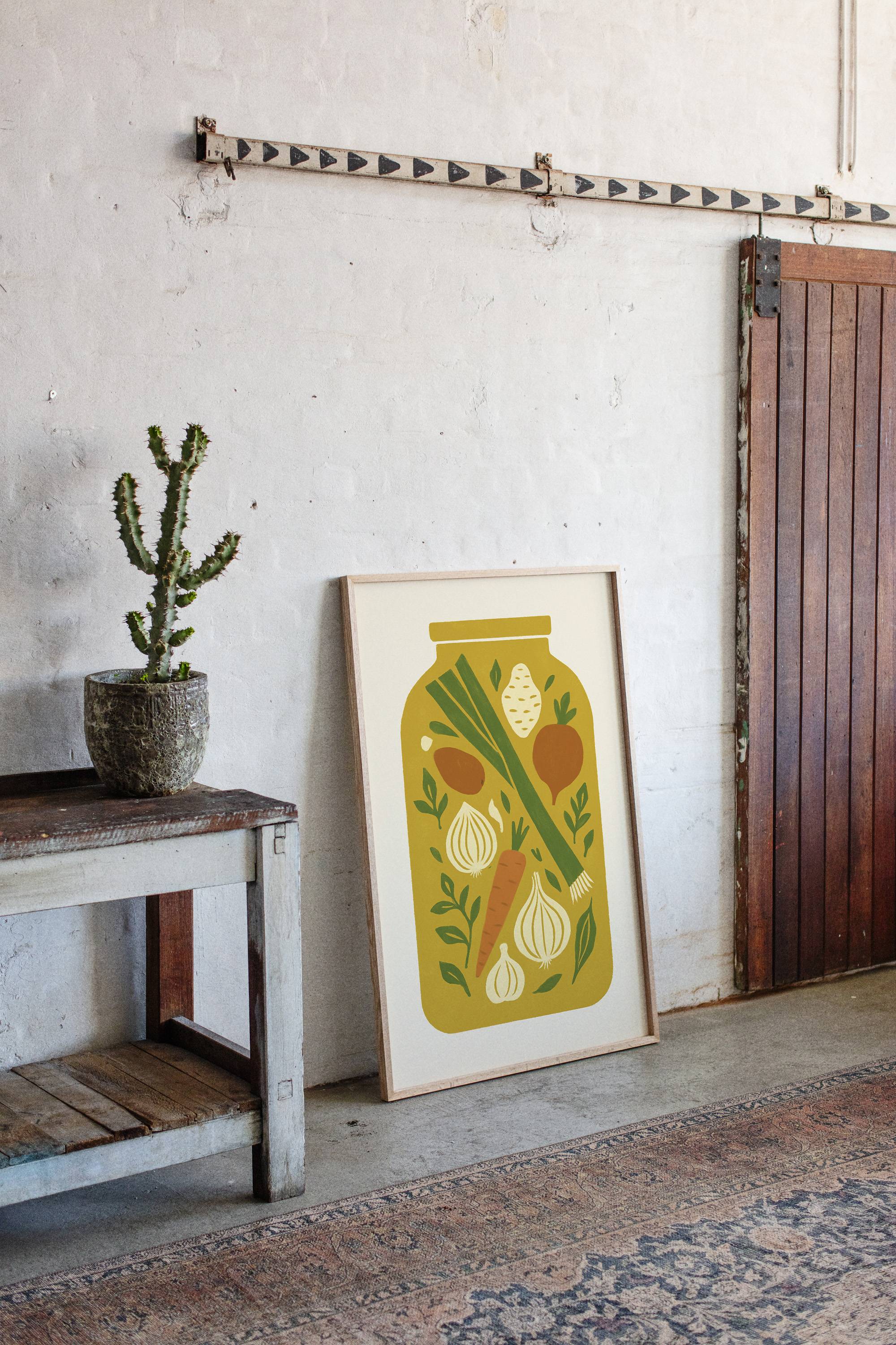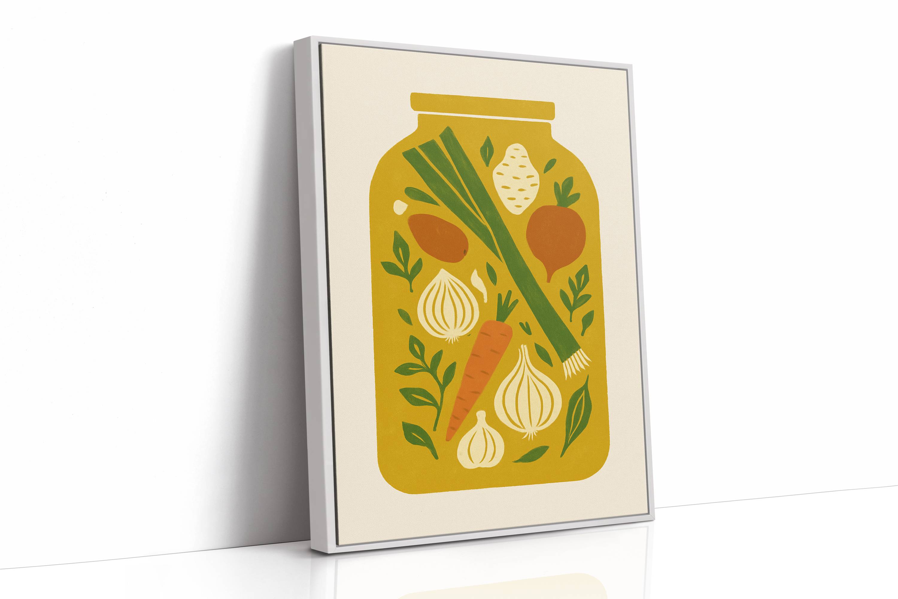 Preserved moments of garden bounty float like memories in golden light. Crisp carrots, aromatic onions, and fresh leeks dance among scattered herbs, creating a nostalgic snapshot of harvest season's peak. The simple composition captures the essence of home cooking and seasonal preparation, each ingredient telling its own story of earth and sunshine. This contemporary folk art piece brings warmth and culinary charm to kitchen spaces, perfectly suited for a modern farmhouse dining area or chef's sanctuary.