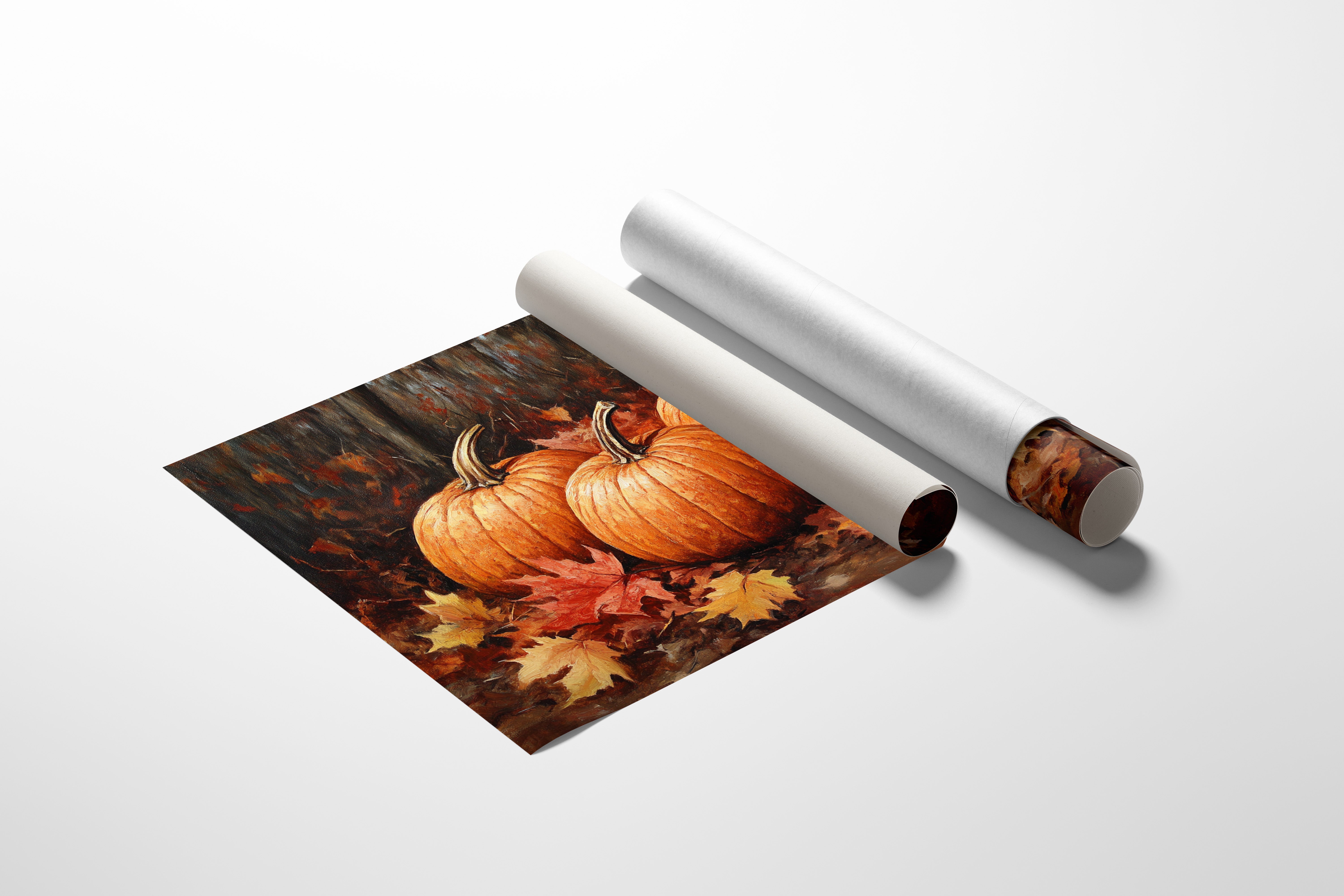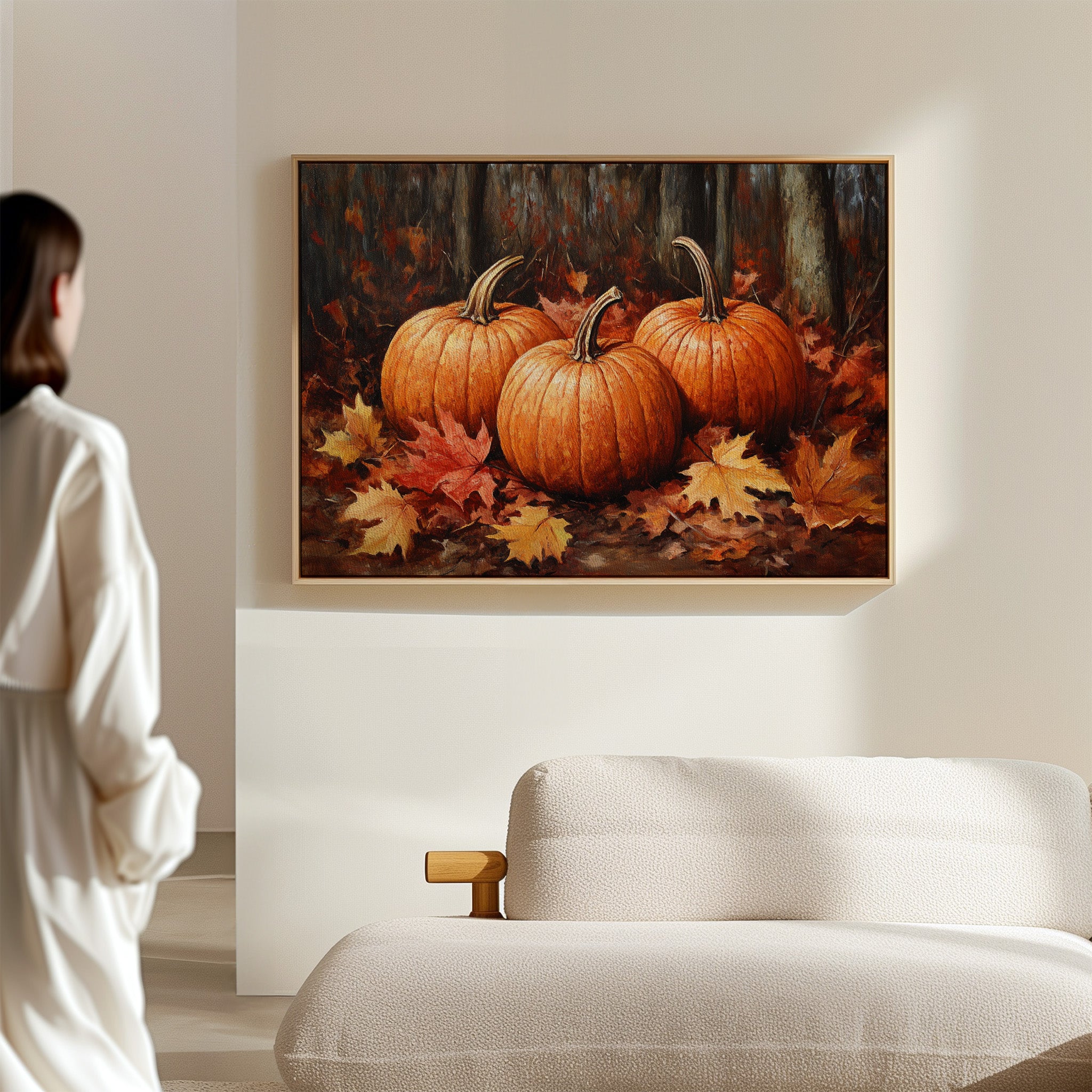 Golden light caresses three plump pumpkins nestled in a bed of fallen maple leaves, capturing the essence of harvest season. Rich orange hues dominate the scene, with each pumpkin's textured surface revealing subtle variations in tone and shadow. The surrounding autumn leaves create a natural frame, their warm yellows and deep crimsons dancing against a moody, rustic wooden backdrop. Perfect for bringing seasonal warmth to dining rooms, kitchens, or entryways, this piece celebrates the abundant beauty of fall's fleeting moments.
