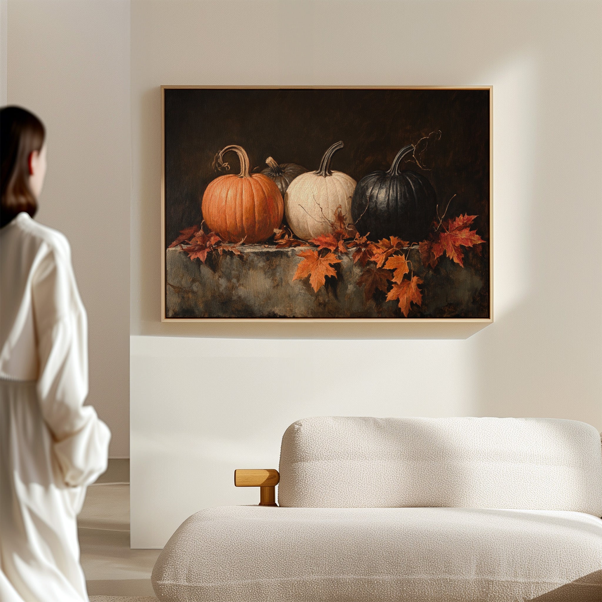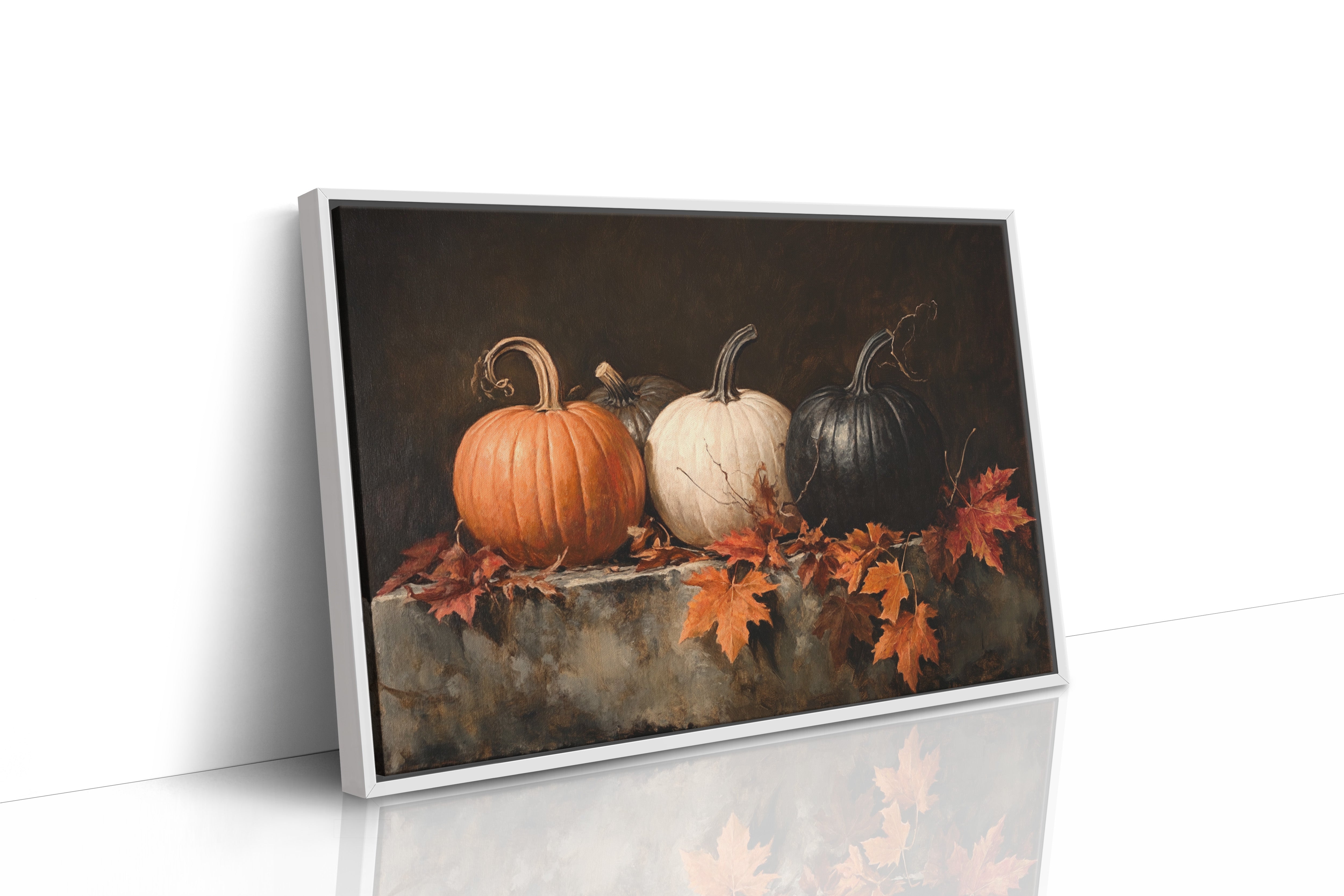 Three pumpkins rest in quiet conversation, their distinctive personalities revealed through orange, white, and midnight hues. Crisp maple leaves dance along the weathered stone ledge, creating a natural garland in warm amber and russet tones. The dramatic chiaroscuro lighting casts the scene in Renaissance-inspired depth, while textured brushstrokes capture the organic imperfections of each gourd and leaf. This classical still life brings seasonal warmth to dining rooms, entryways, or any space seeking to capture autumn's fleeting beauty.