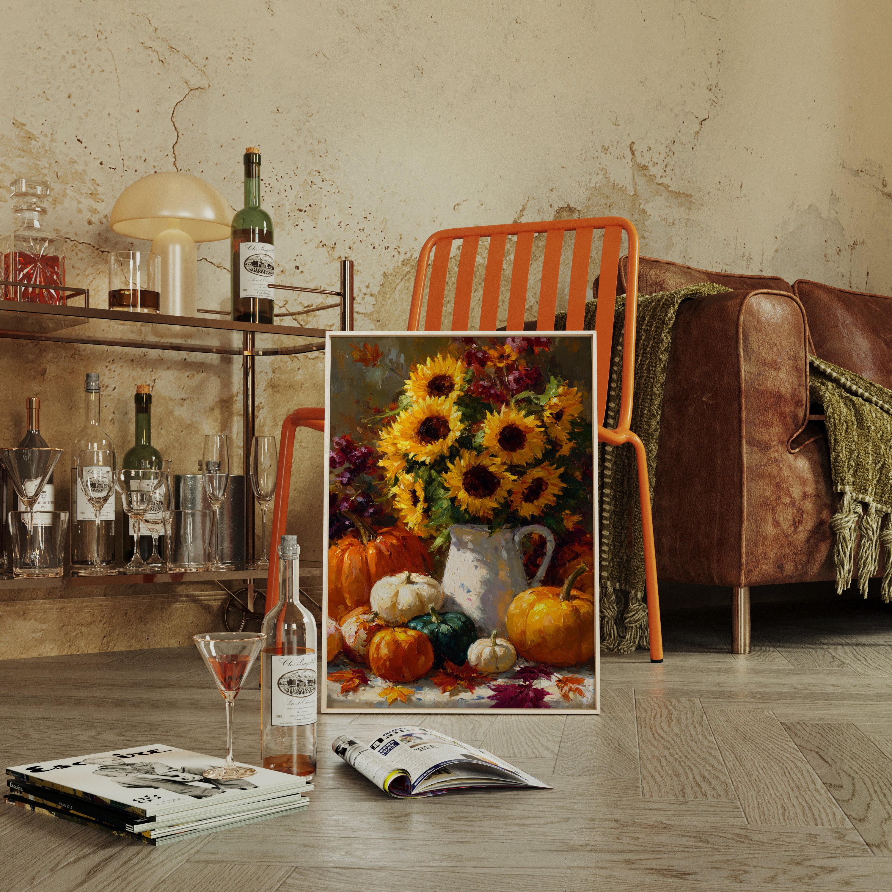 Golden petals catch the late afternoon light, creating a dance of warmth against deep burgundy blooms. A classic white pitcher cradles vibrant sunflowers while a gathering of harvest pumpkins in cream, orange, and deep green rest below, their rounded forms echoing the circular motif of the flower heads above. Rich impasto brushstrokes capture the textural abundance of fall, from scattered maple leaves to the dimensional surfaces of each carefully rendered gourd. This piece brings the essence of autumn harvest into any space, perfect for creating a focal point in a dining room or adding seasonal warmth to a living area.