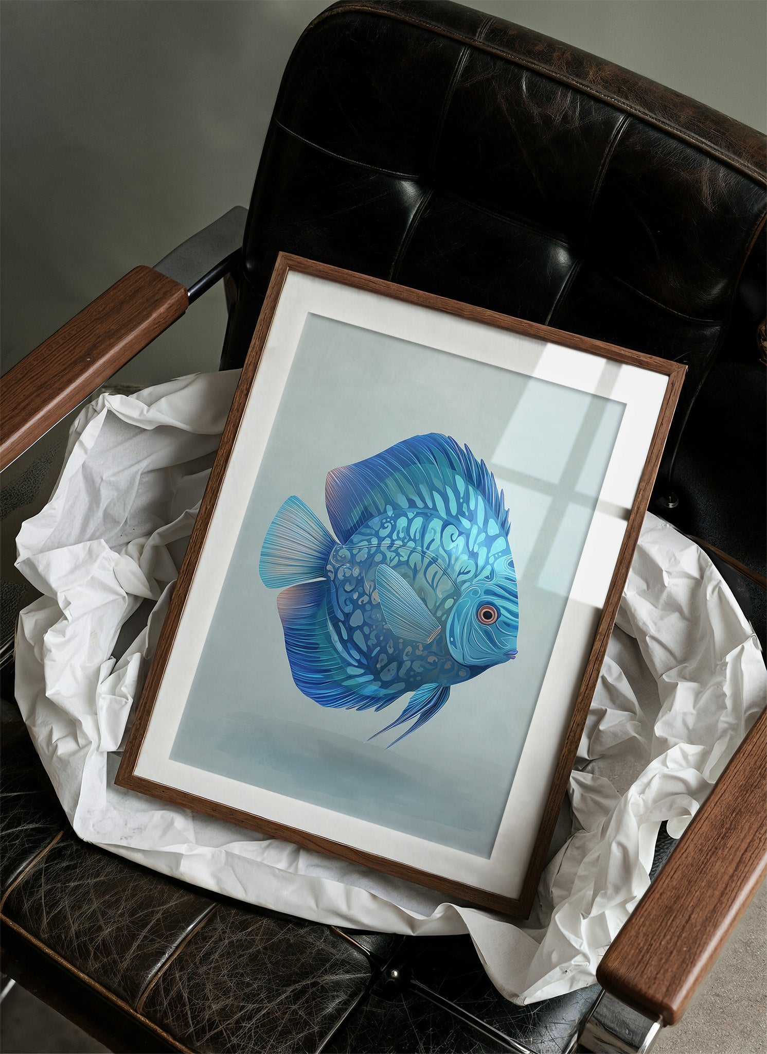 Morning light dances across the detailed scales of a vibrant blue discus fish, its aquatic elegance captured in striking detail against a minimalist backdrop. The artwork's cool tones create a serene focal point, with delicate patterns and flowing fins rendered in shades of turquoise, cobalt, and cerulean that seem to ripple with life. This sophisticated marine portrait brings a touch of tranquil luxury to a contemporary living space, perfectly complementing the warm wood tones and sleek leather furniture surrounding it.
