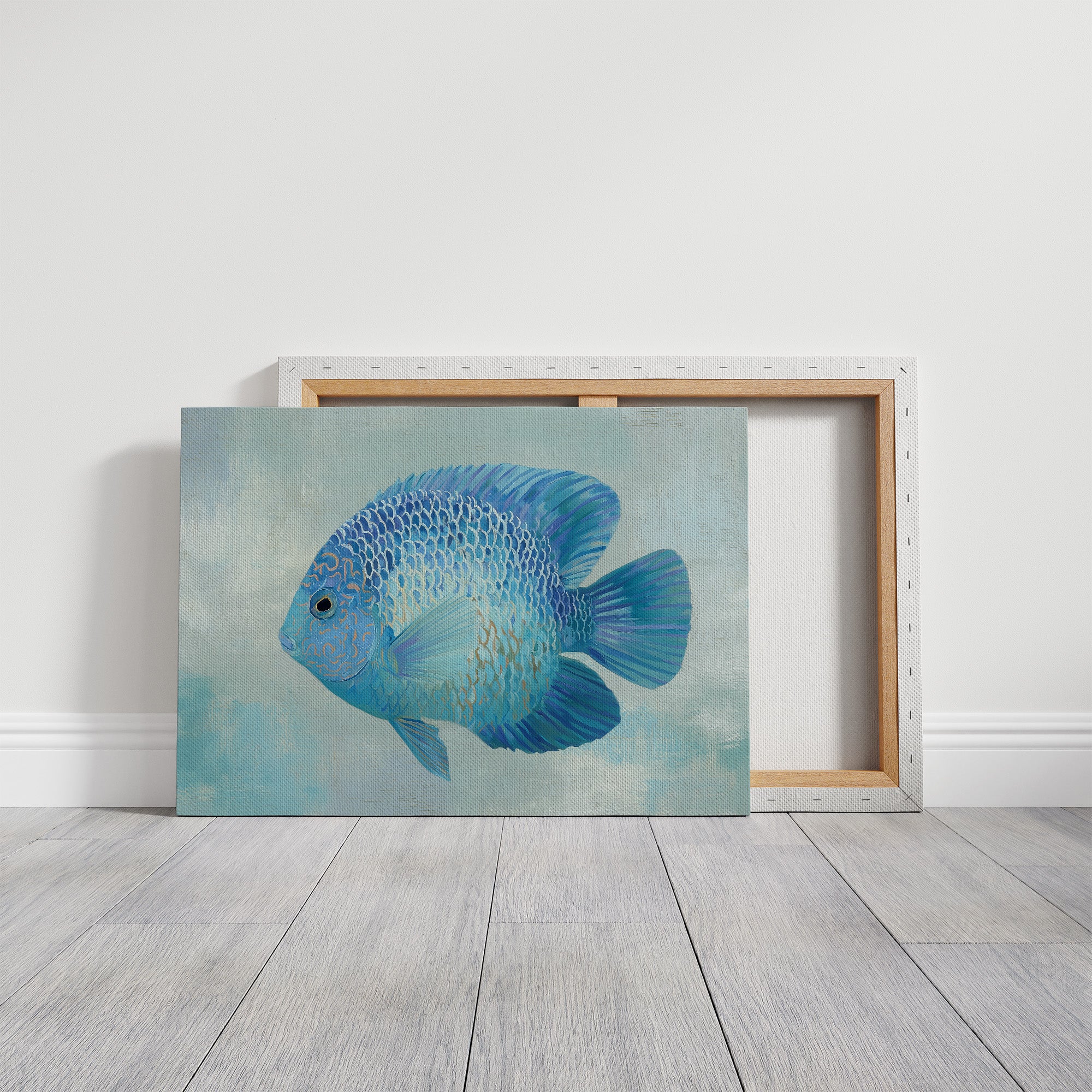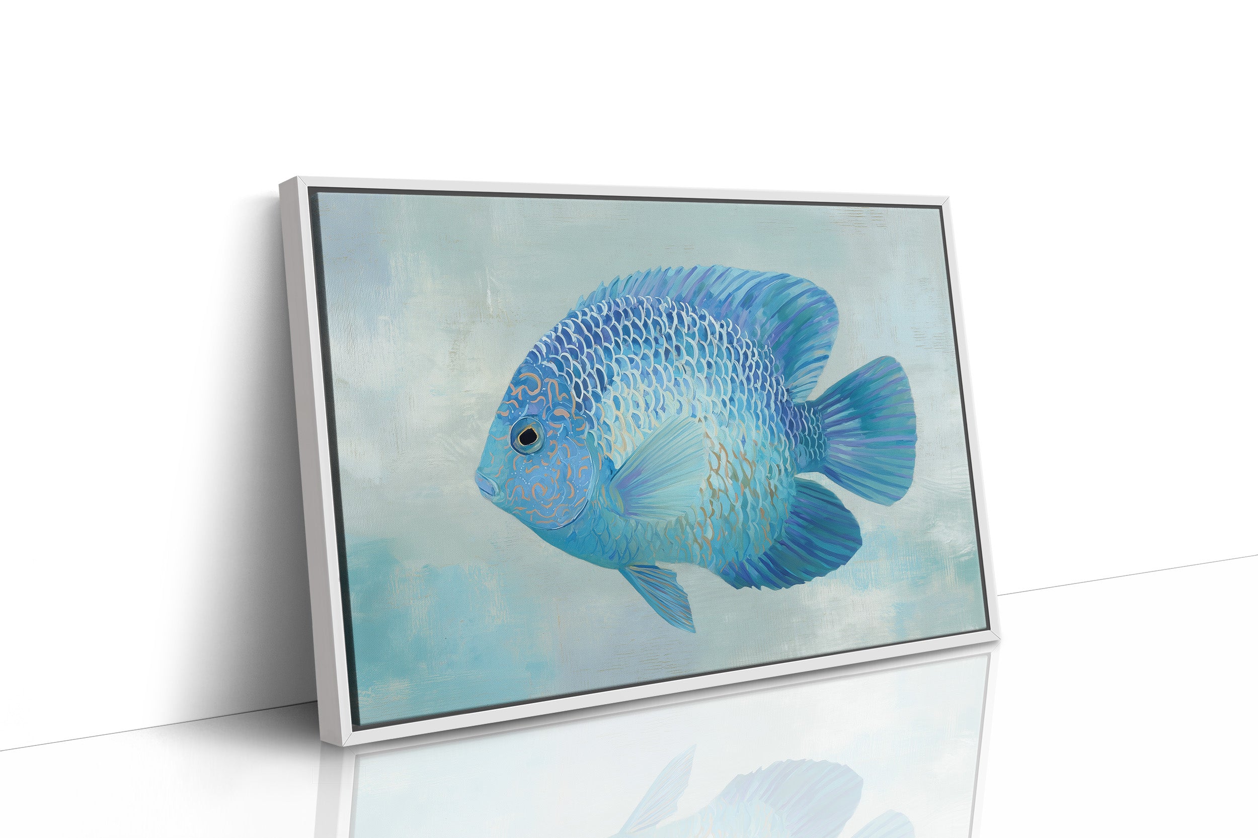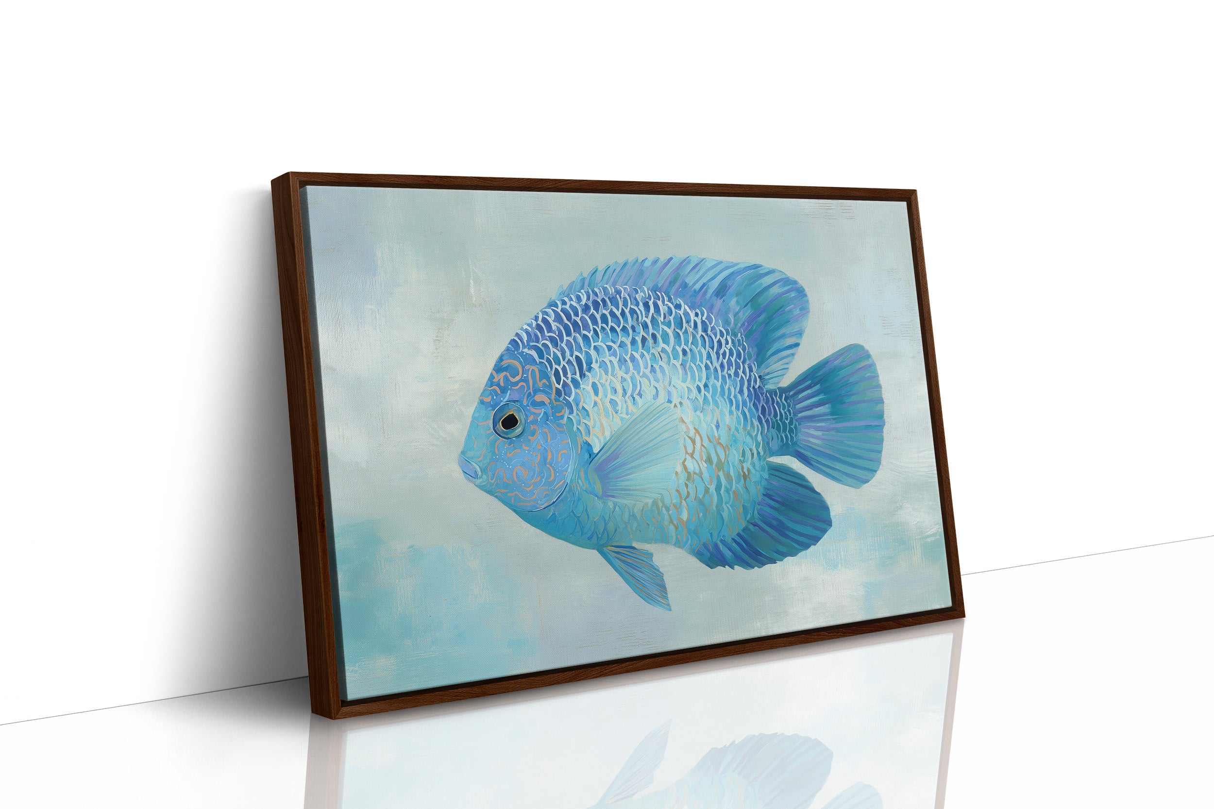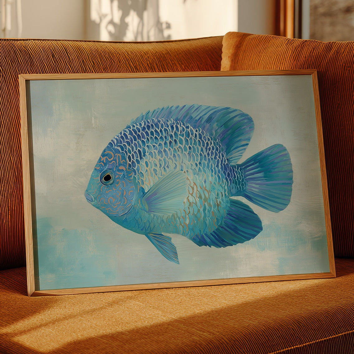 A sapphire jewel suspended in liquid light, this vibrant blue discus fish seems to float beyond the confines of its frame. The intricate patterns of scales catch subtle highlights against the soft aqua background, creating a mesmerizing interplay of cerulean, cobalt, and delicate gold accents. The composition balances striking detail with serene simplicity, inviting viewers into a moment of underwater tranquility. This piece would bring a refreshing coastal elegance to modern interiors, particularly in spaces designed for contemplation or relaxation.
