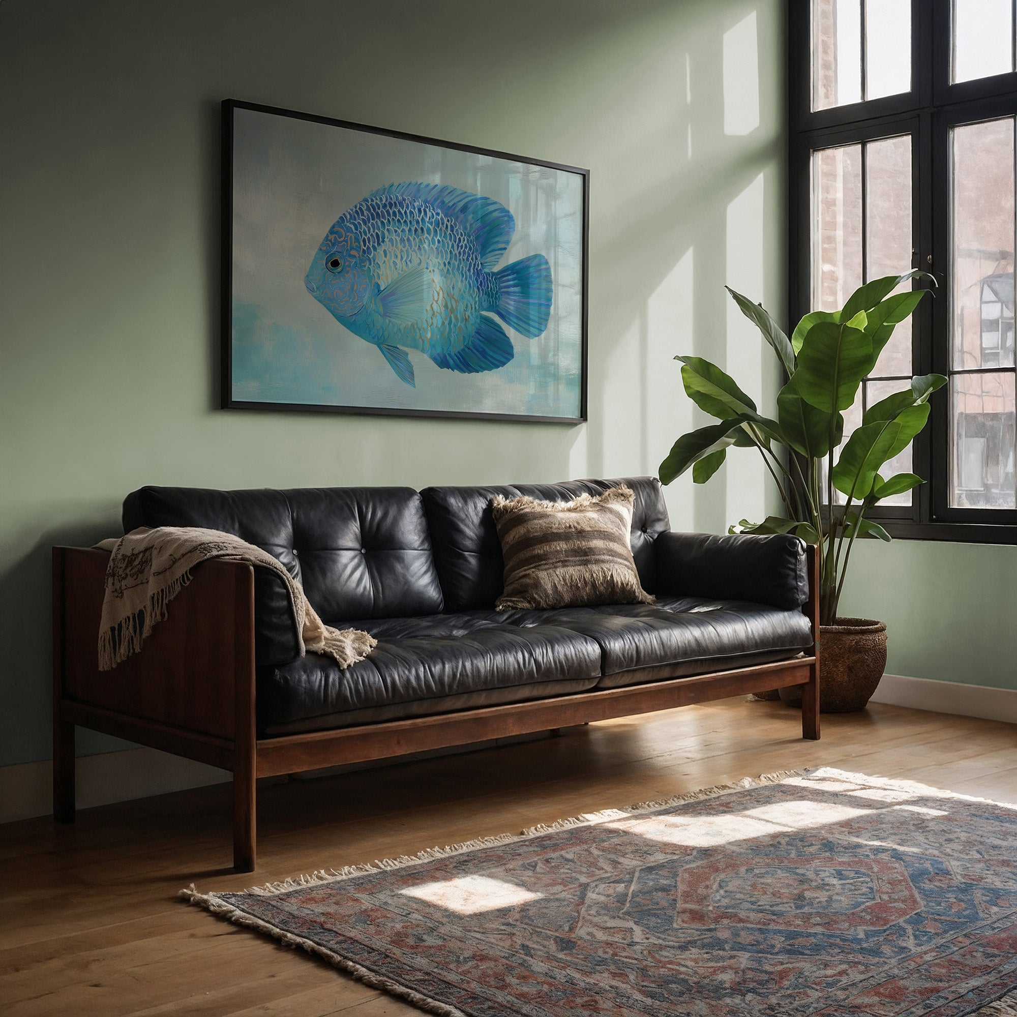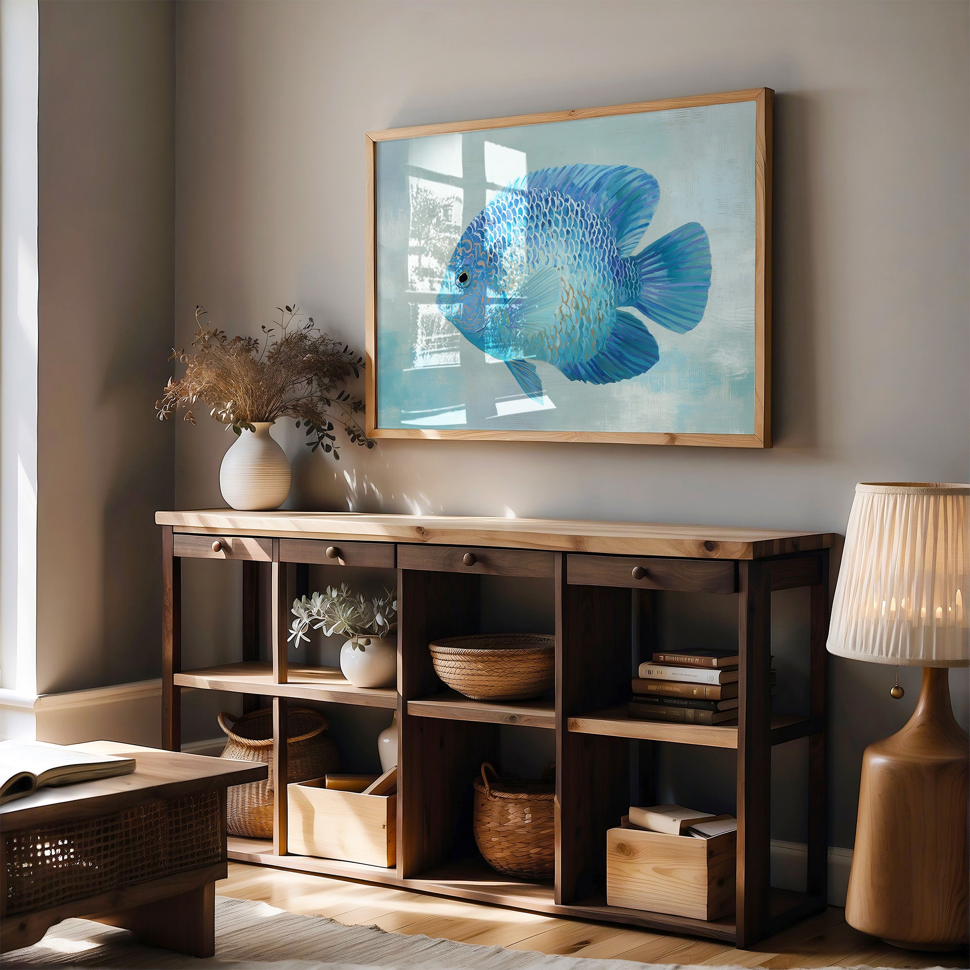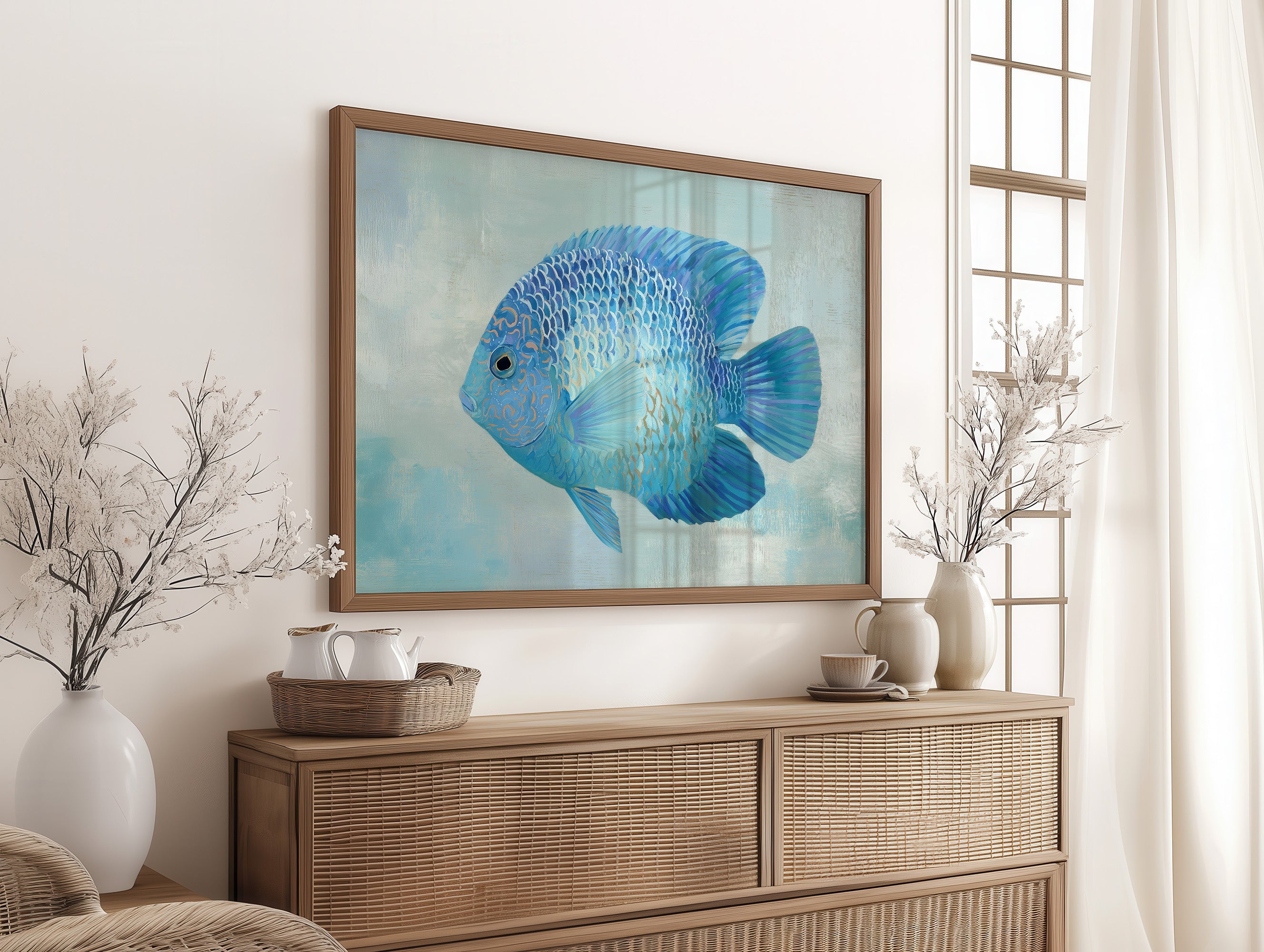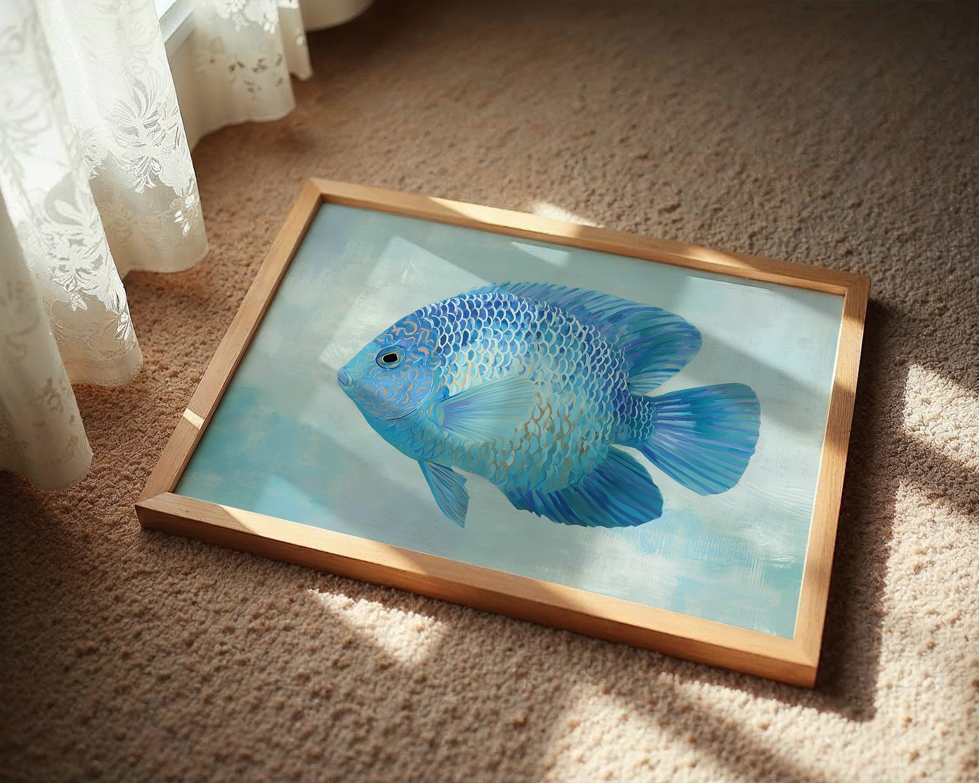 A sapphire jewel suspended in liquid light, this vibrant blue discus fish seems to float beyond the confines of its frame. The intricate patterns of scales catch subtle highlights against the soft aqua background, creating a mesmerizing interplay of cerulean, cobalt, and delicate gold accents. The composition balances striking detail with serene simplicity, inviting viewers into a moment of underwater tranquility. This piece would bring a refreshing coastal elegance to modern interiors, particularly in spaces designed for contemplation or relaxation.