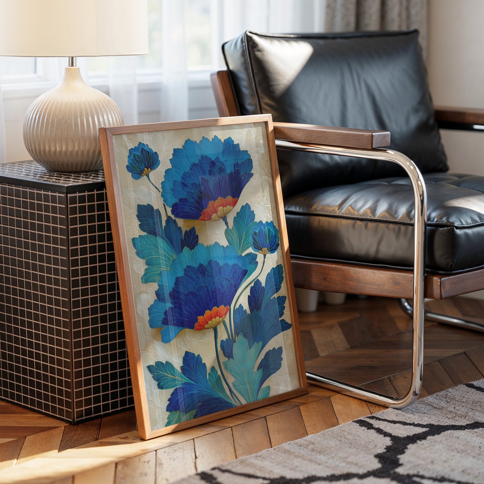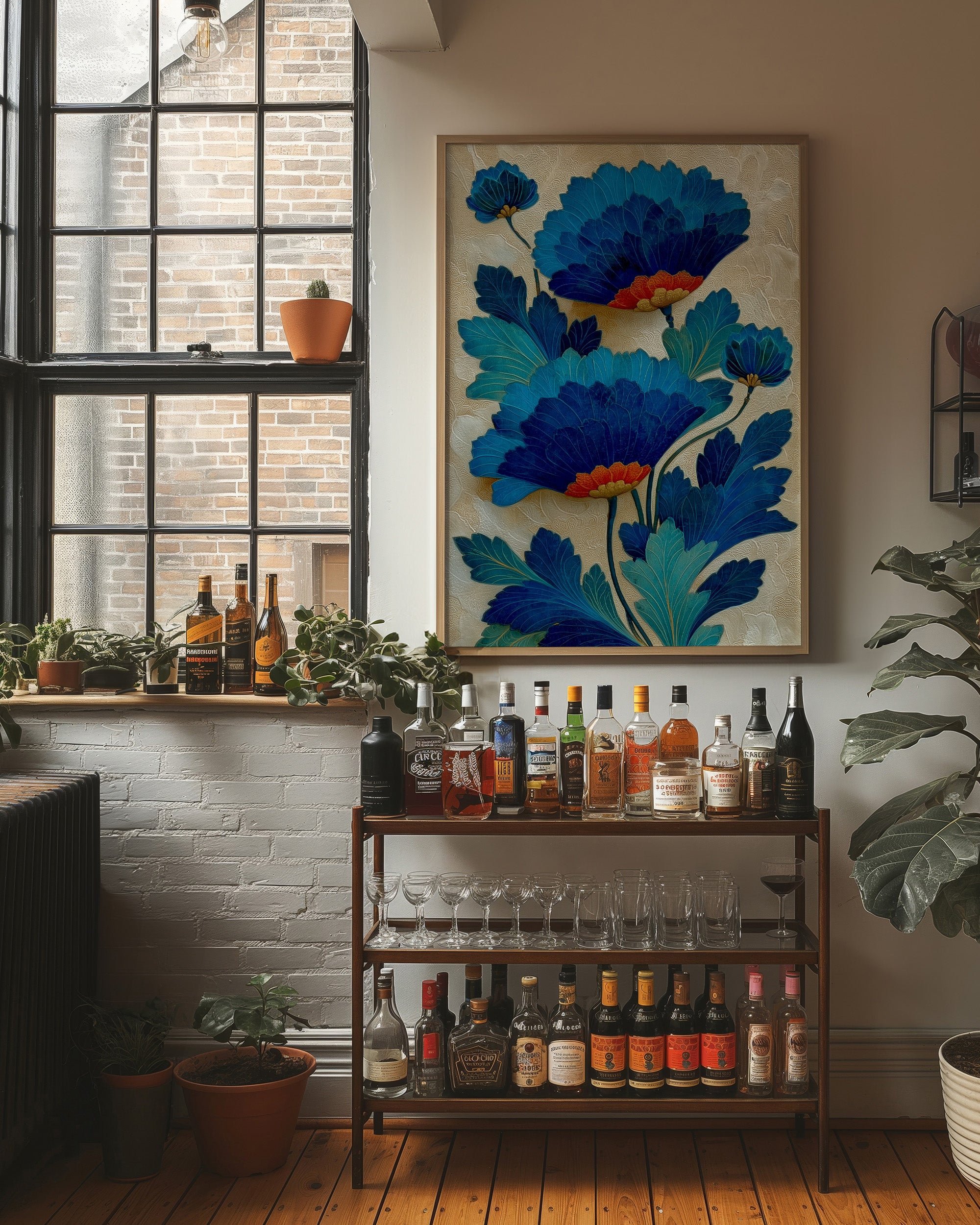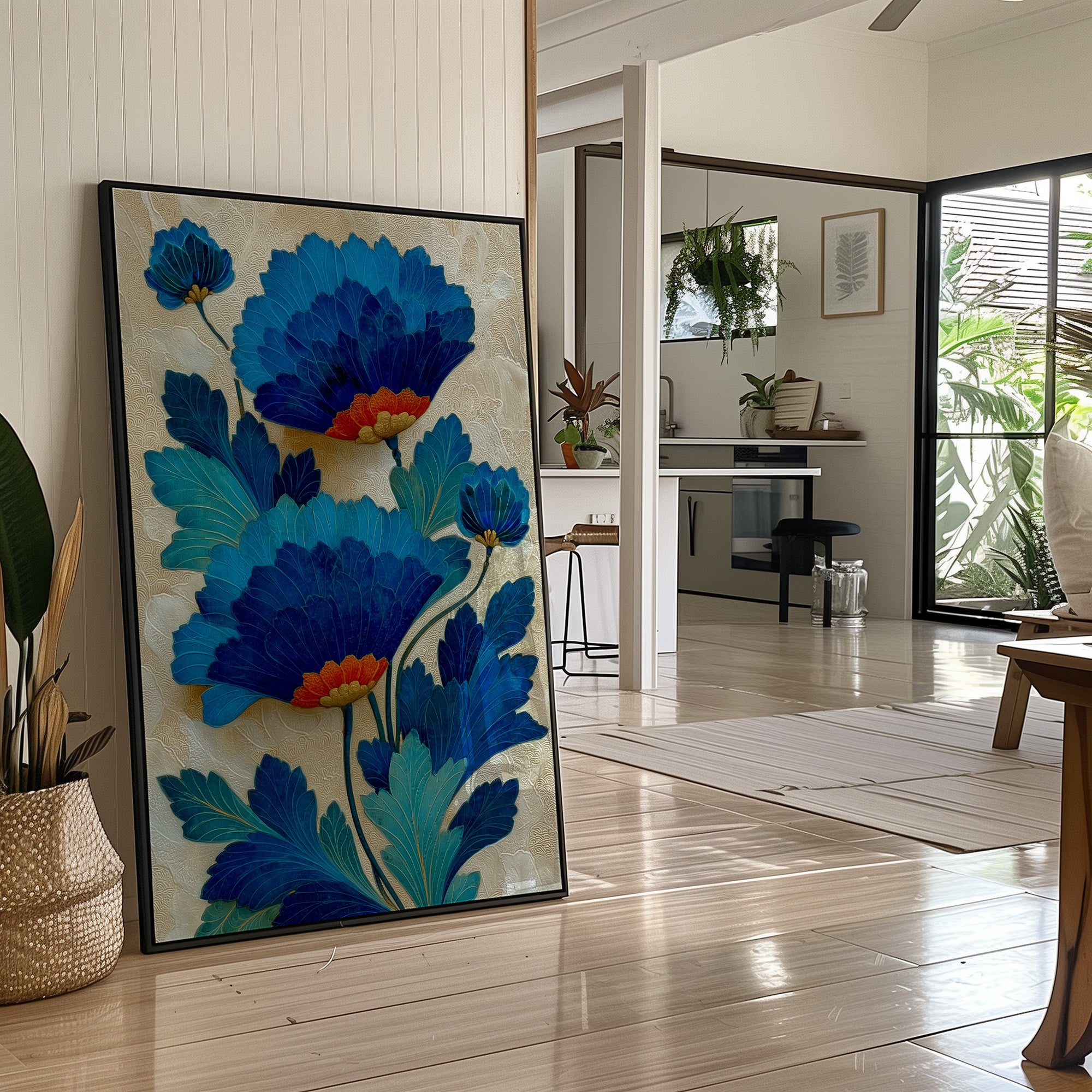 Delicate yet bold, electric blue blooms reach skyward against a shimmering champagne background. The flowers unfold in layers of cerulean and cobalt, their orange centers providing warm contrast to the cool tones, while textured details in the background create subtle movement and depth. This contemporary botanical illustration captures both the grace of natural forms and the boldness of modern design. Perfect for adding a sophisticated pop of color to a neutral space, this piece would enhance a modern dining room or bring artistic flair to a home office.