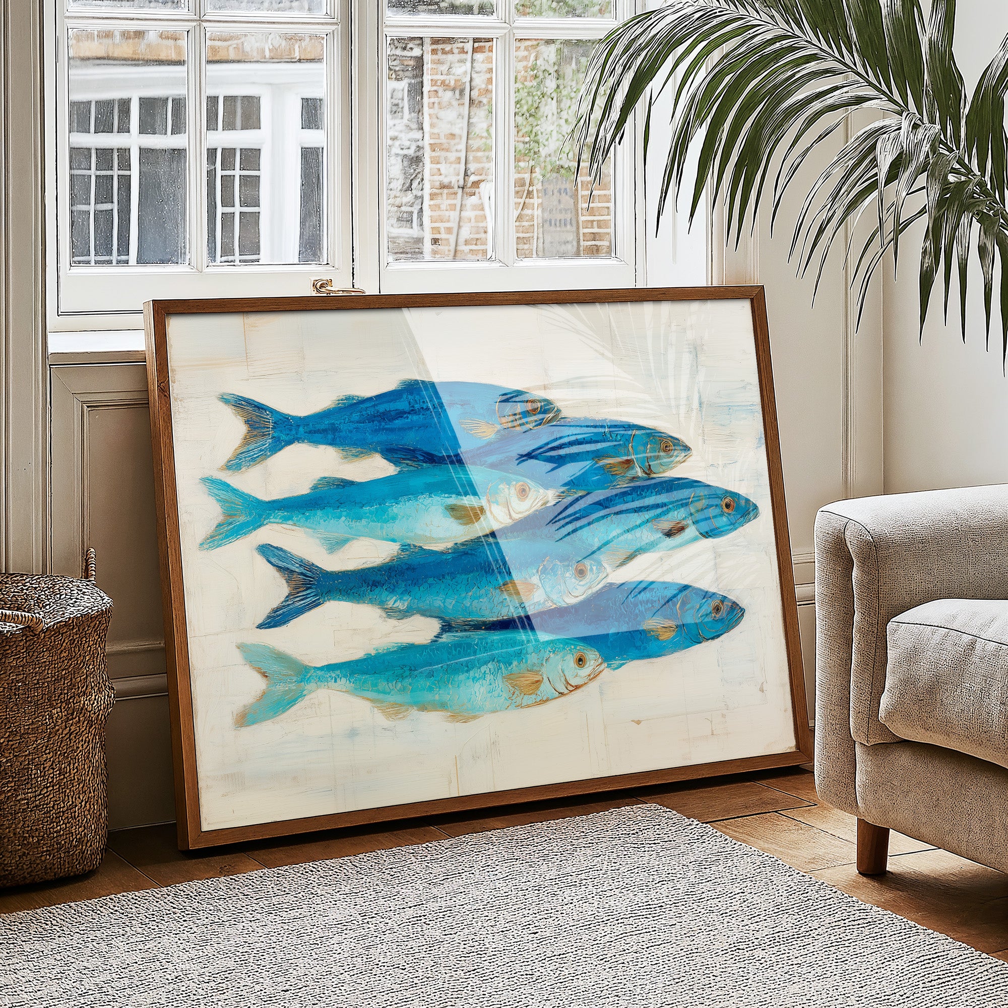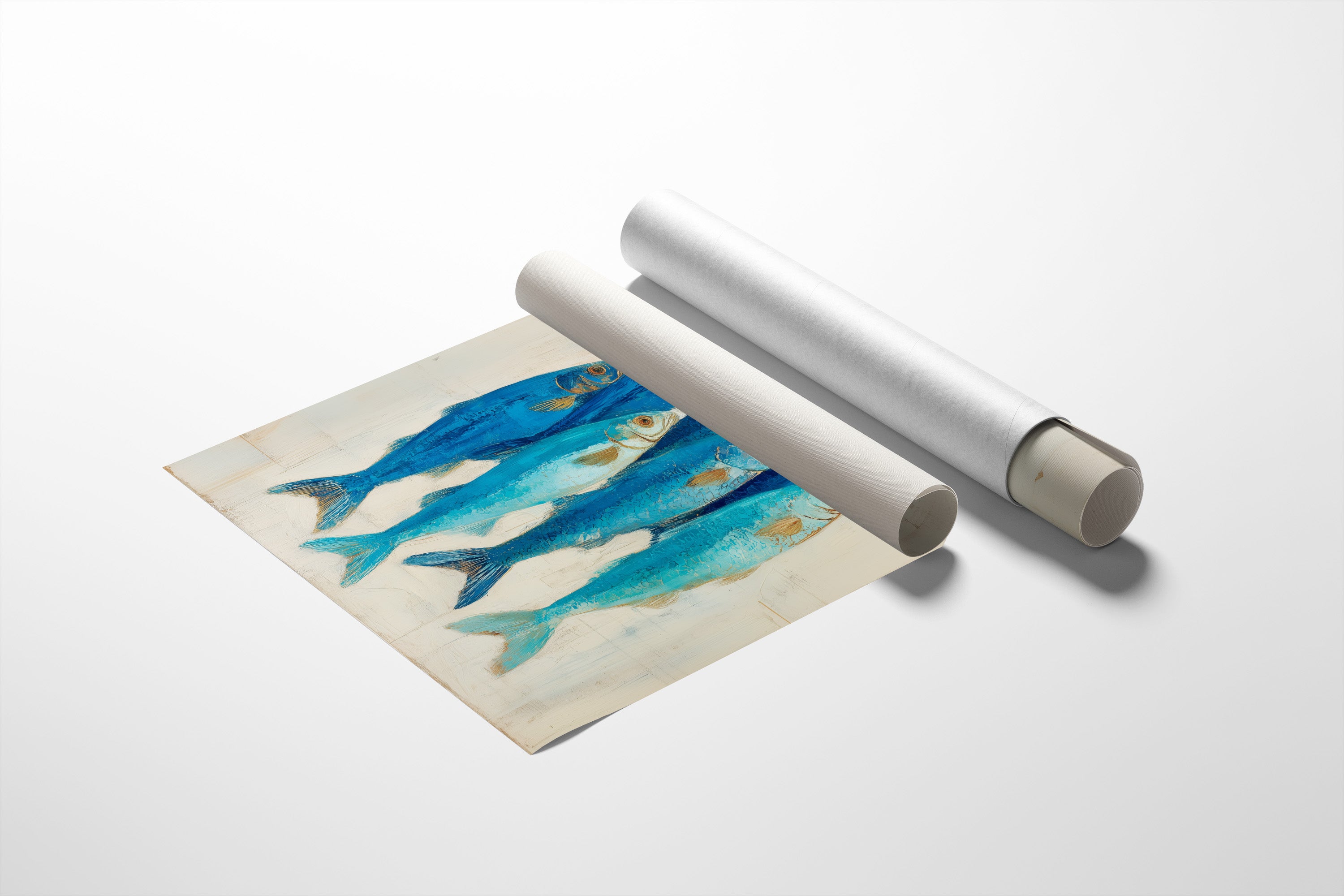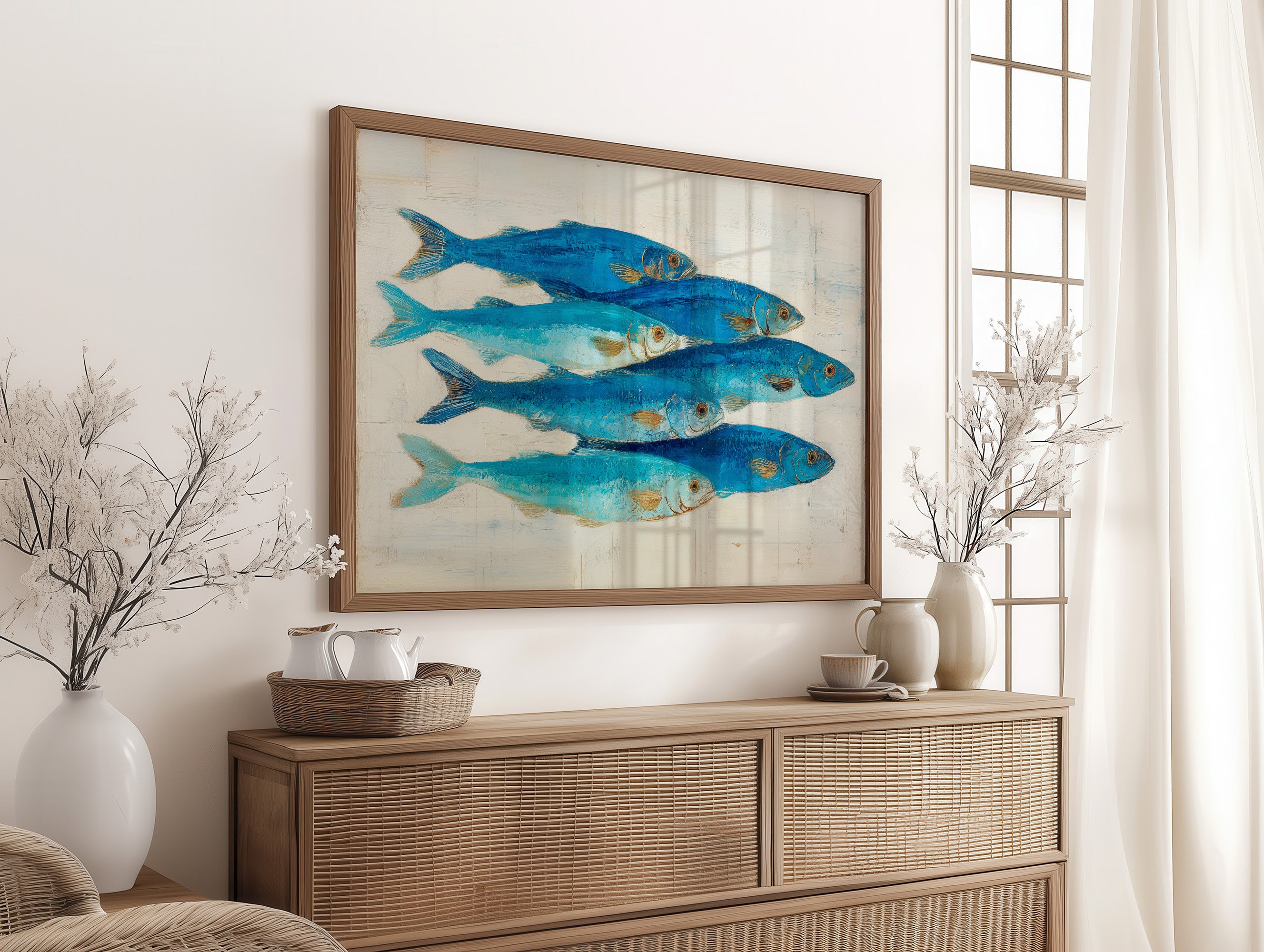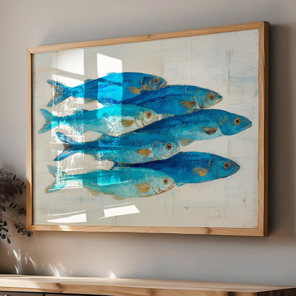 A school of sapphire fish glides across a pale canvas, their bodies shimmering with the fluid movement of ocean currents. Vibrant azure and turquoise scales catch imaginary light, creating a striking contrast against the neutral background while golden accents highlight fins and eyes. The composition evokes the tranquil rhythm of coastal living, where the boundary between art and nature dissolves into serene harmony. This piece brings the refreshing essence of maritime beauty to any living space.