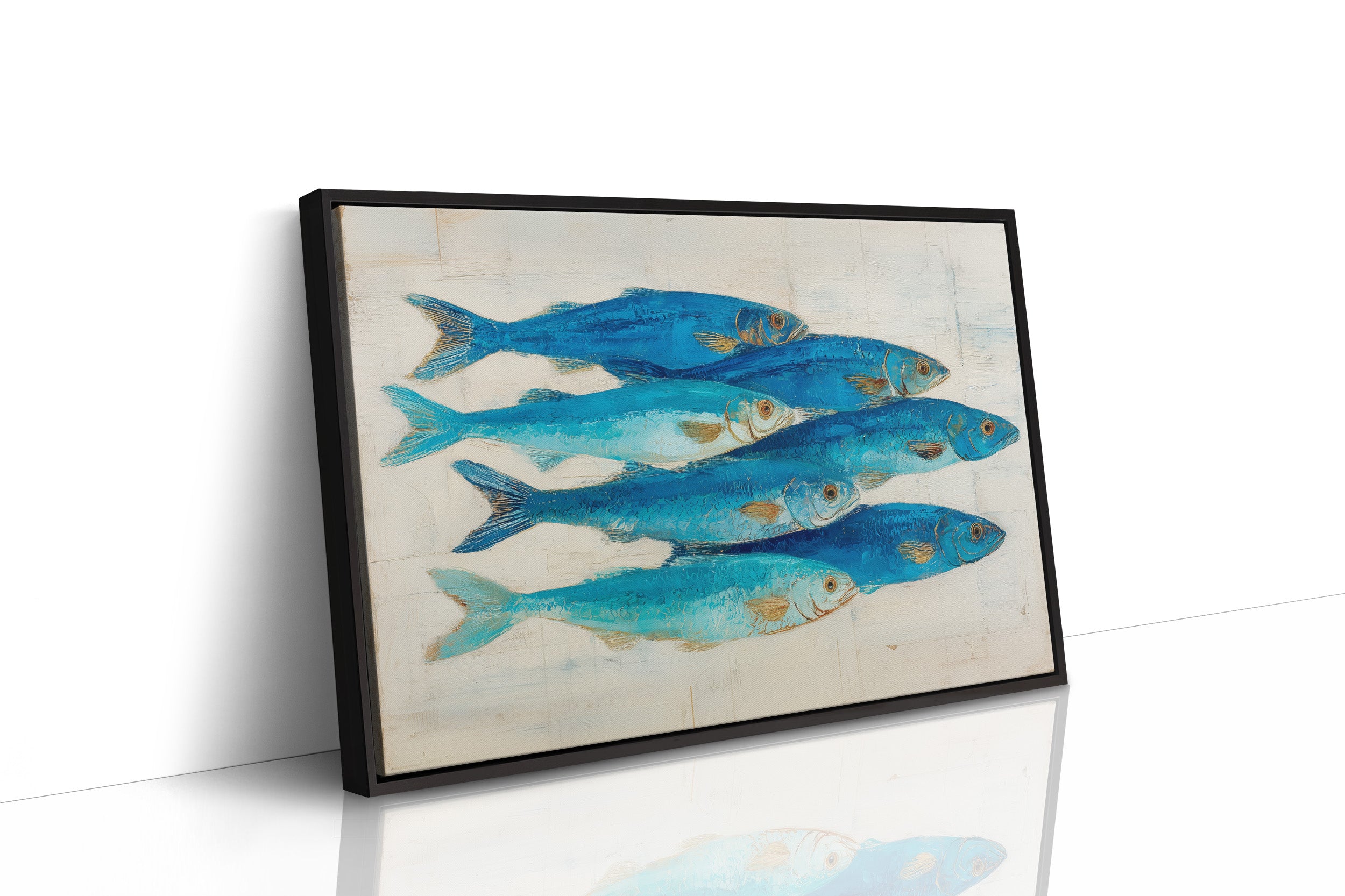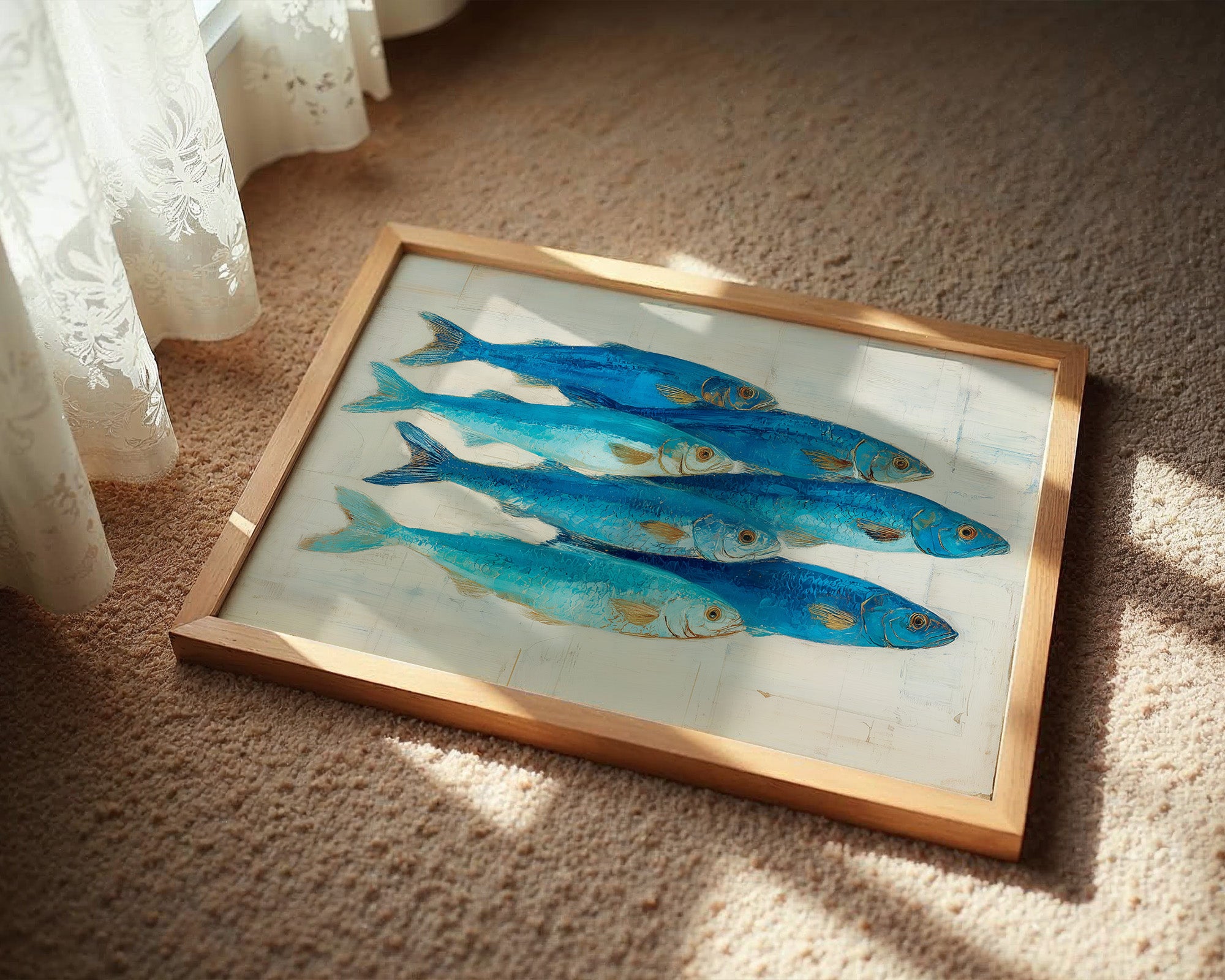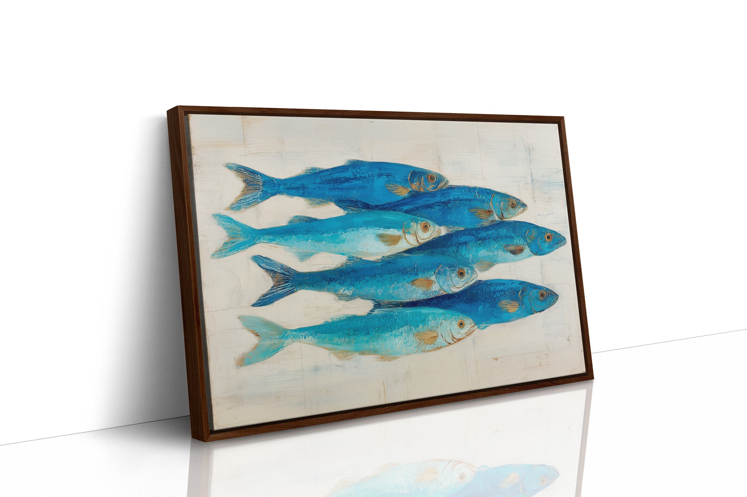 A school of sapphire fish glides across a pale canvas, their bodies shimmering with the fluid movement of ocean currents. Vibrant azure and turquoise scales catch imaginary light, creating a striking contrast against the neutral background while golden accents highlight fins and eyes. The composition evokes the tranquil rhythm of coastal living, where the boundary between art and nature dissolves into serene harmony. This piece brings the refreshing essence of maritime beauty to any living space.