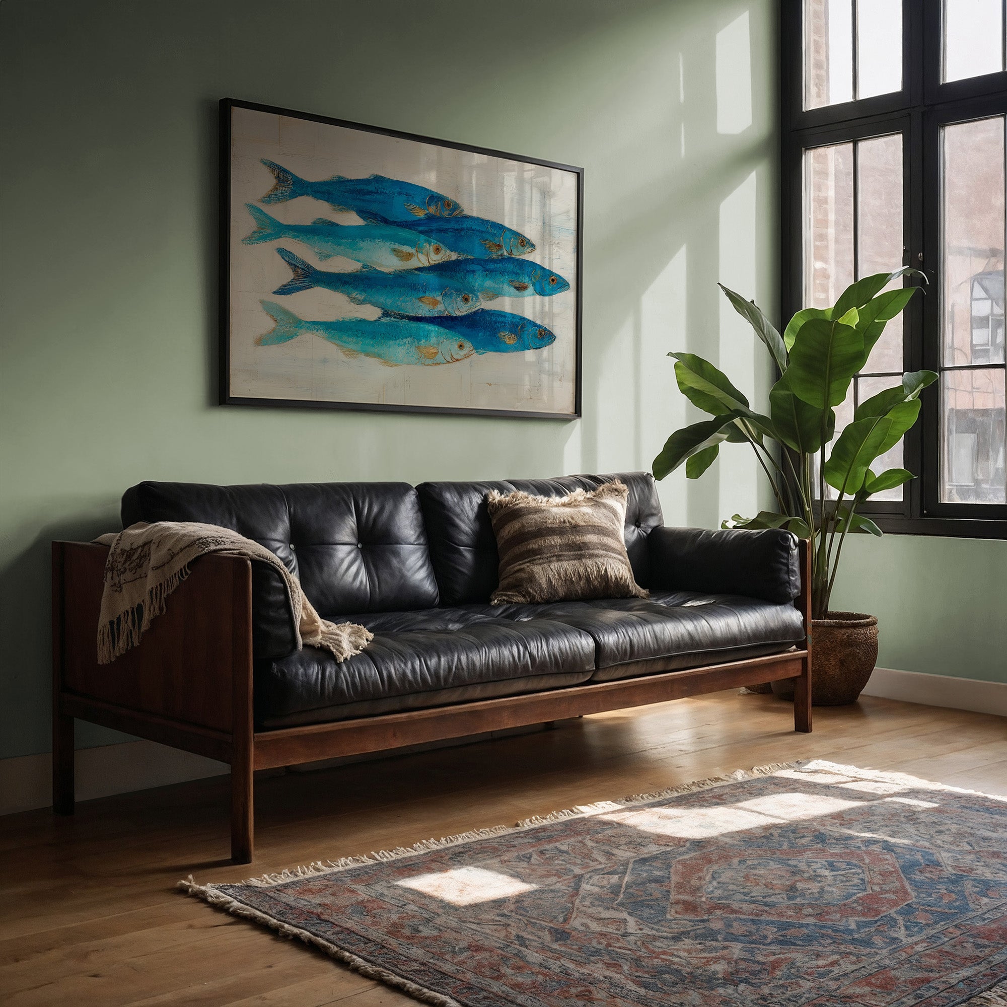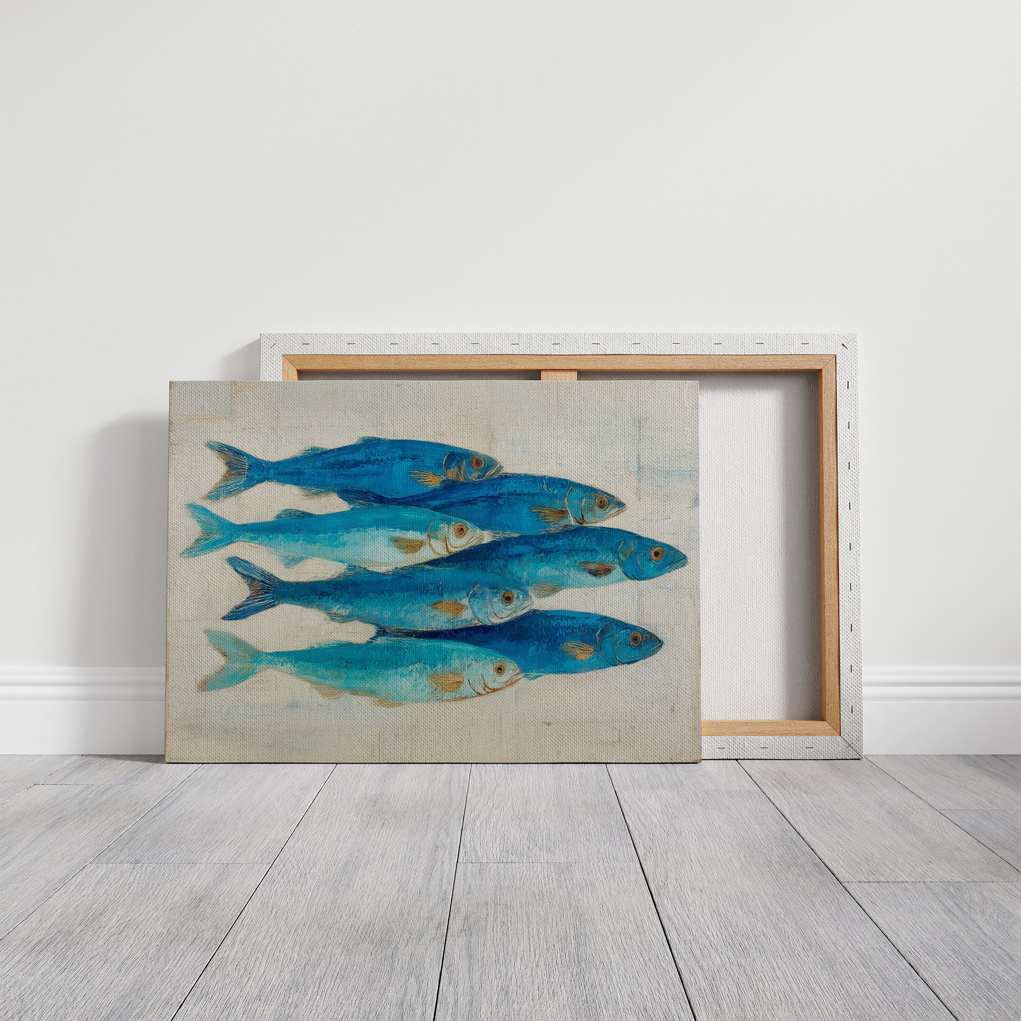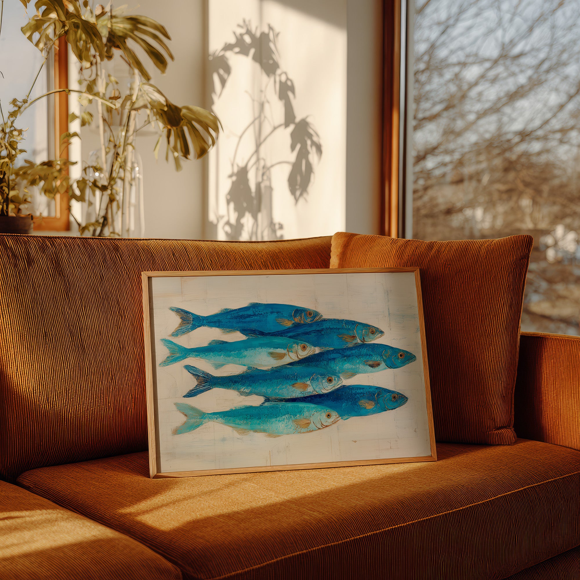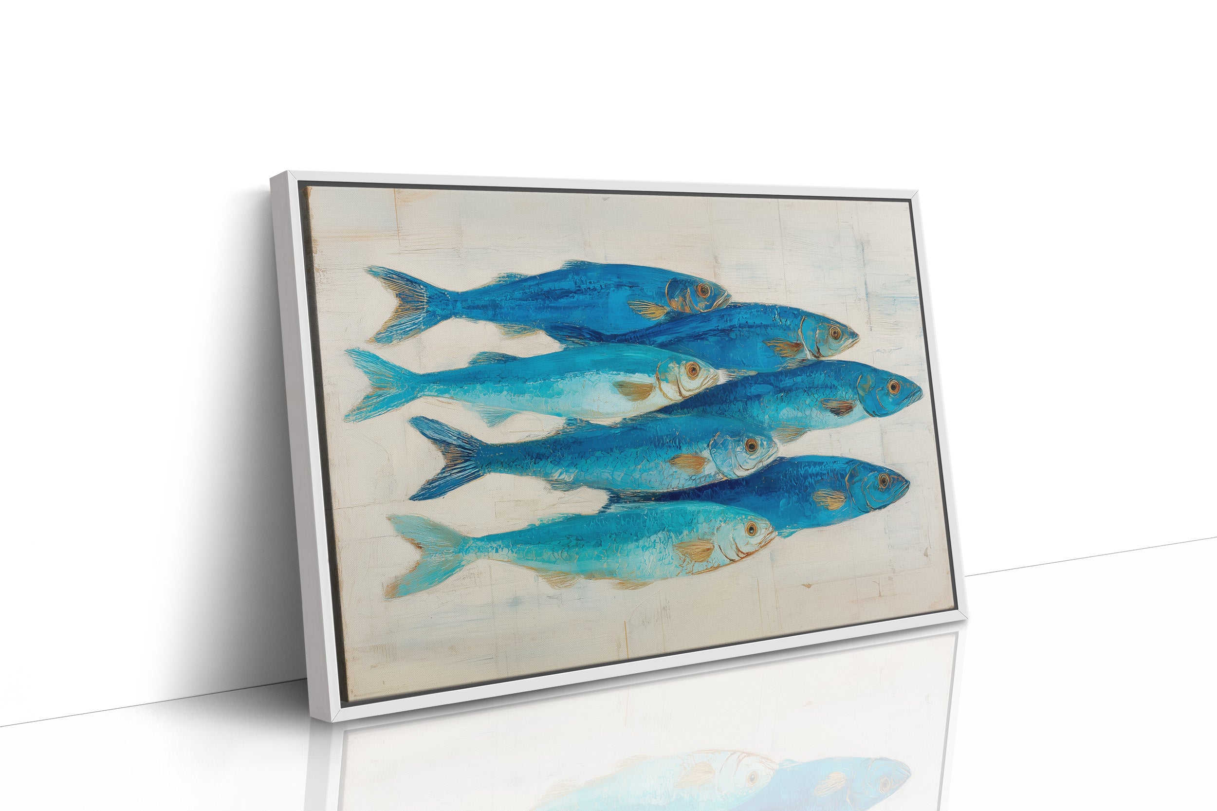 A school of sapphire fish glides across a pale canvas, their bodies shimmering with the fluid movement of ocean currents. Vibrant azure and turquoise scales catch imaginary light, creating a striking contrast against the neutral background while golden accents highlight fins and eyes. The composition evokes the tranquil rhythm of coastal living, where the boundary between art and nature dissolves into serene harmony. This piece brings the refreshing essence of maritime beauty to any living space.