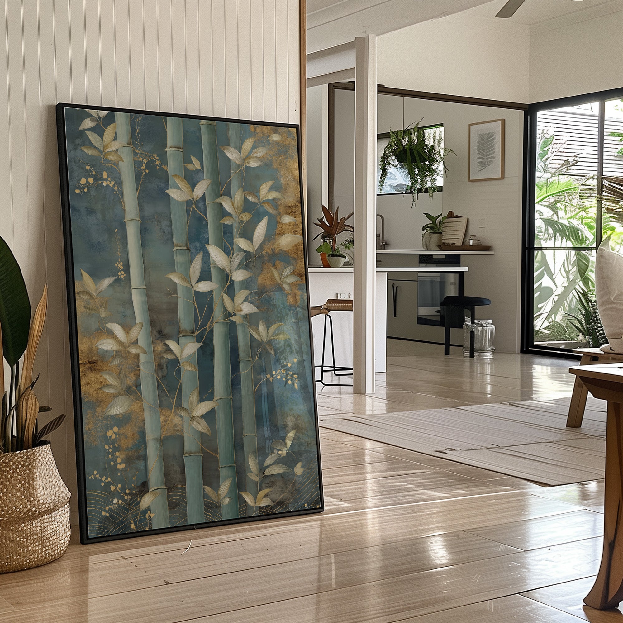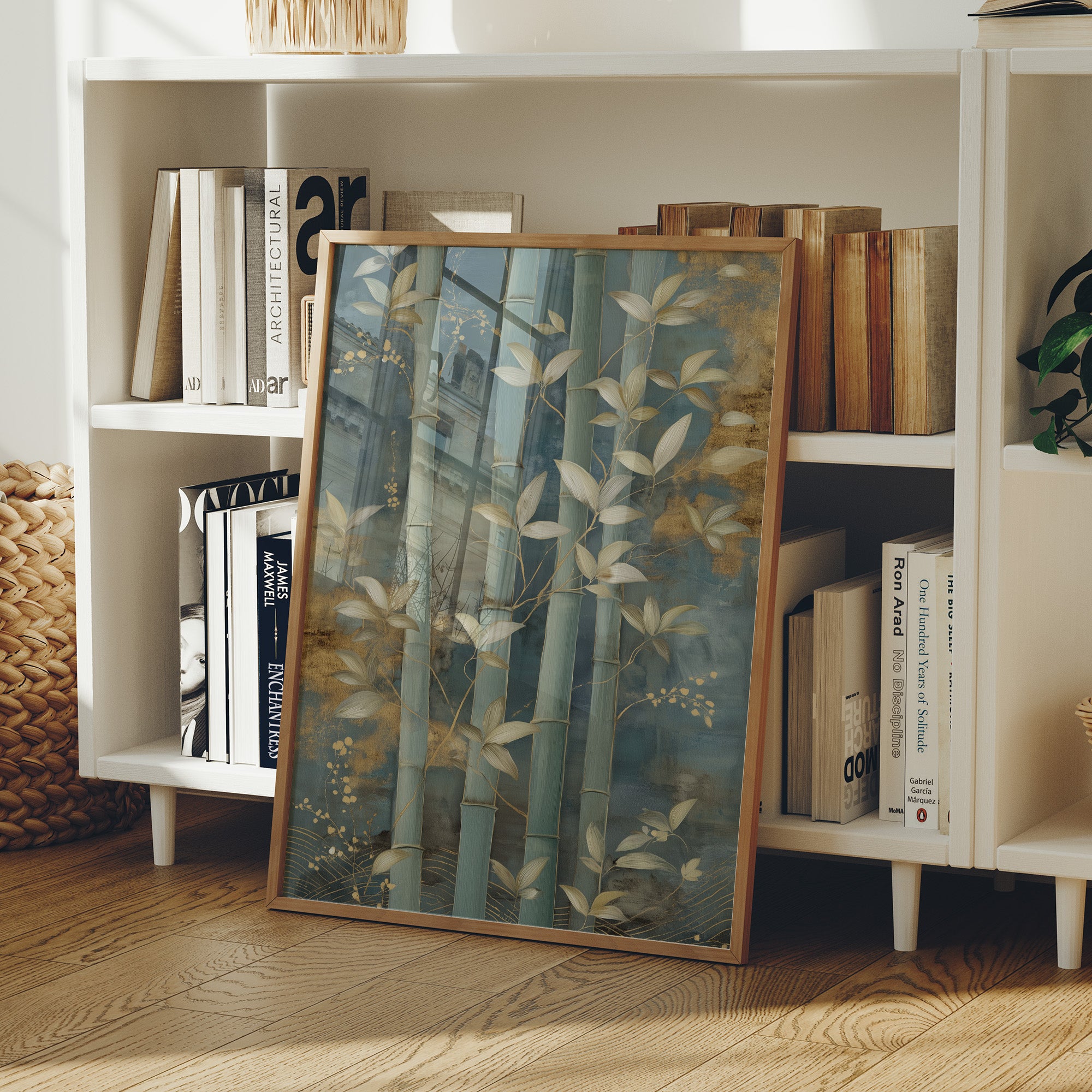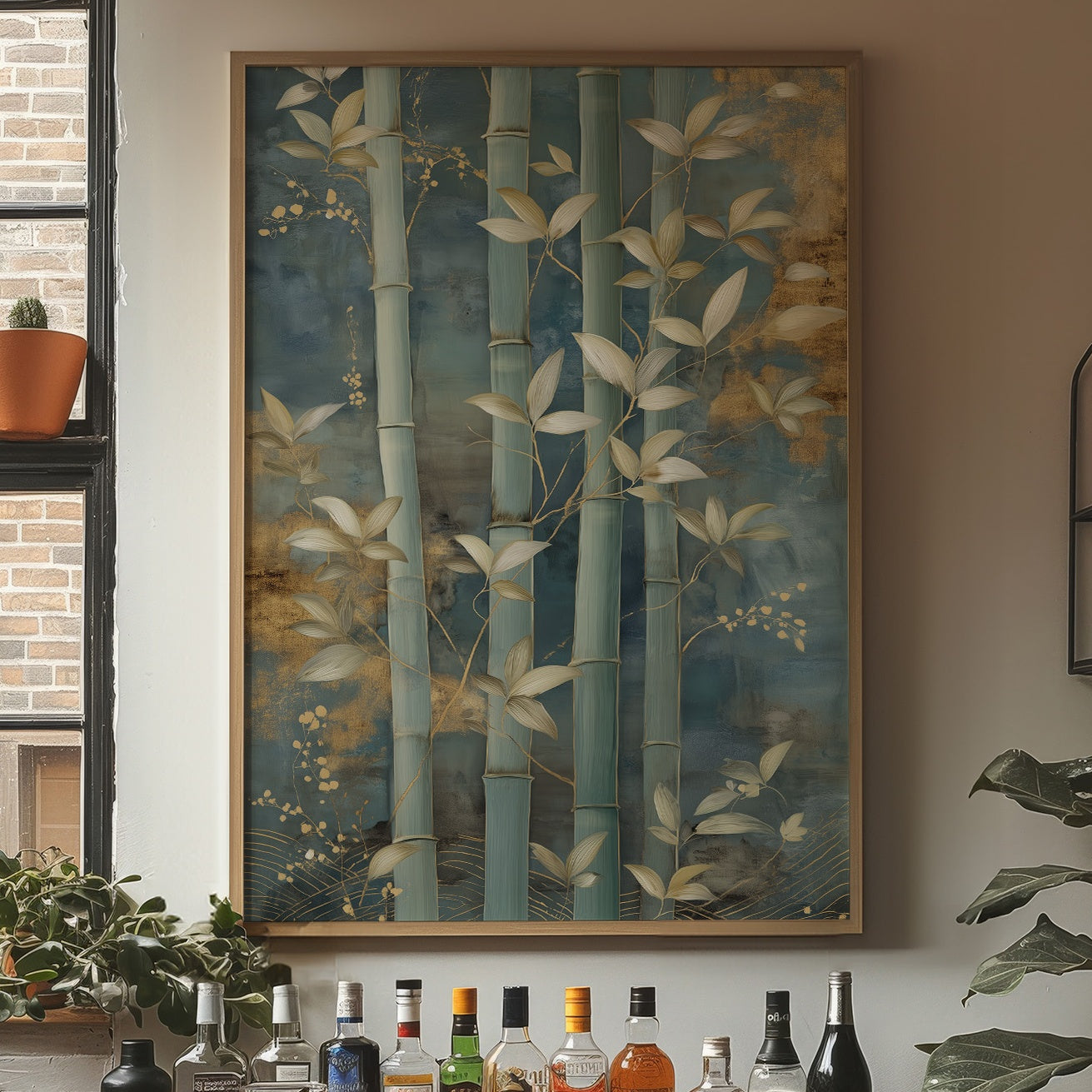 Gentle teal stalks rise through misty depths, creating a serene meditation on nature's quiet strength. Golden leaves dance across the composition, their delicate forms catching imagined moonlight against the deep blue-green background. The traditional Asian-inspired artwork balances strength and delicacy, with bamboo stems standing proud while graceful foliage weaves between them. This piece would bring tranquility to a reading nook or meditation space, its calming palette and organic forms creating a perfect focal point for mindful moments.