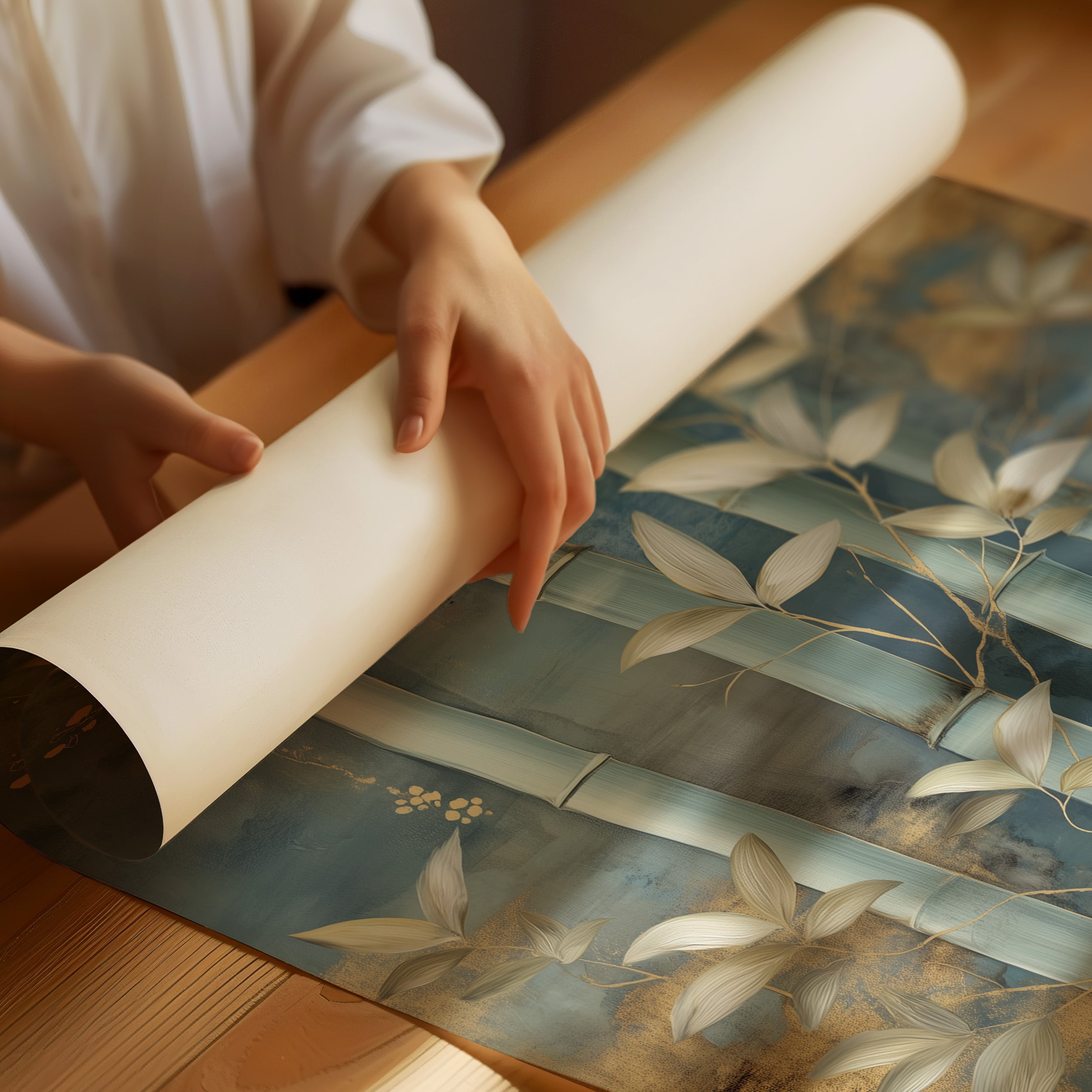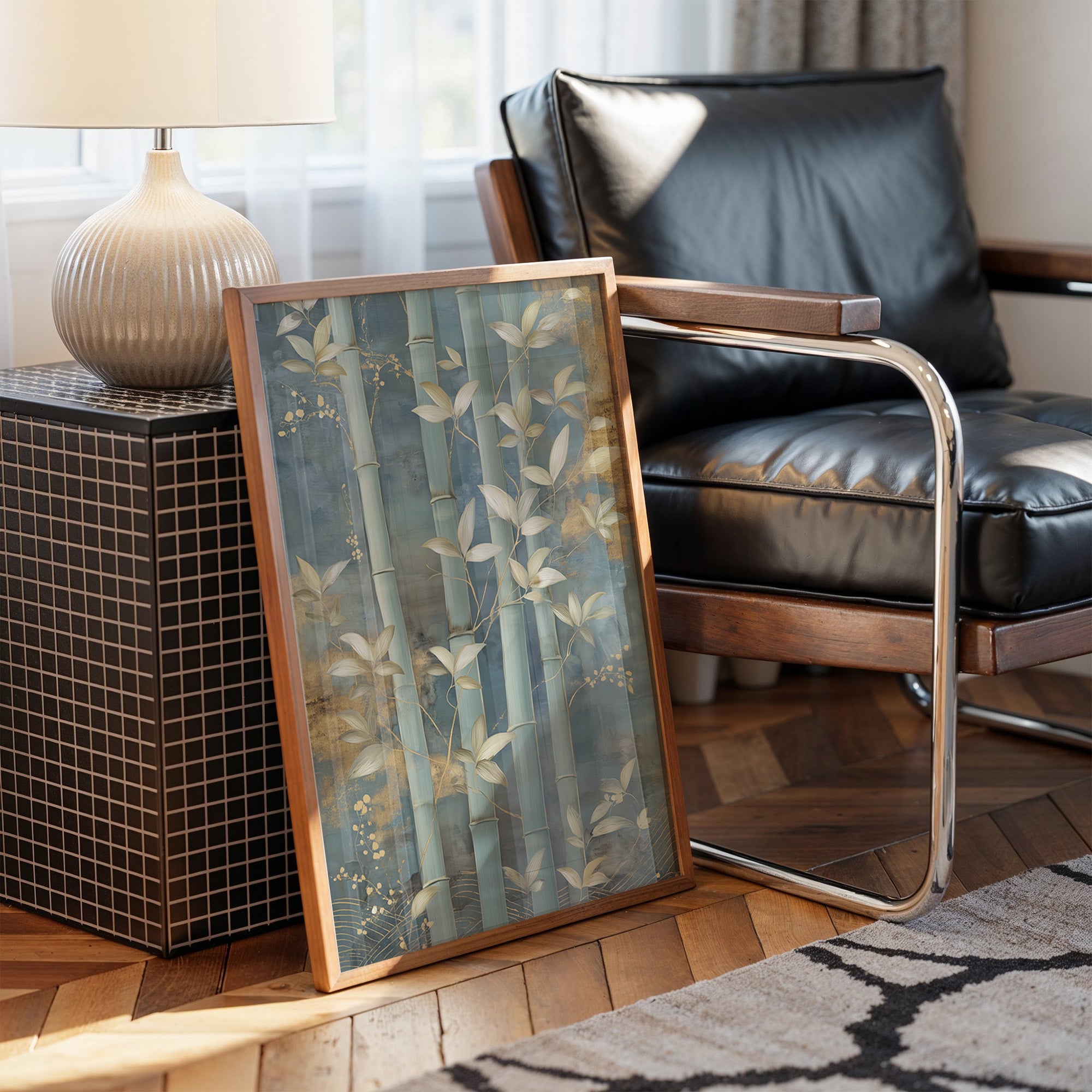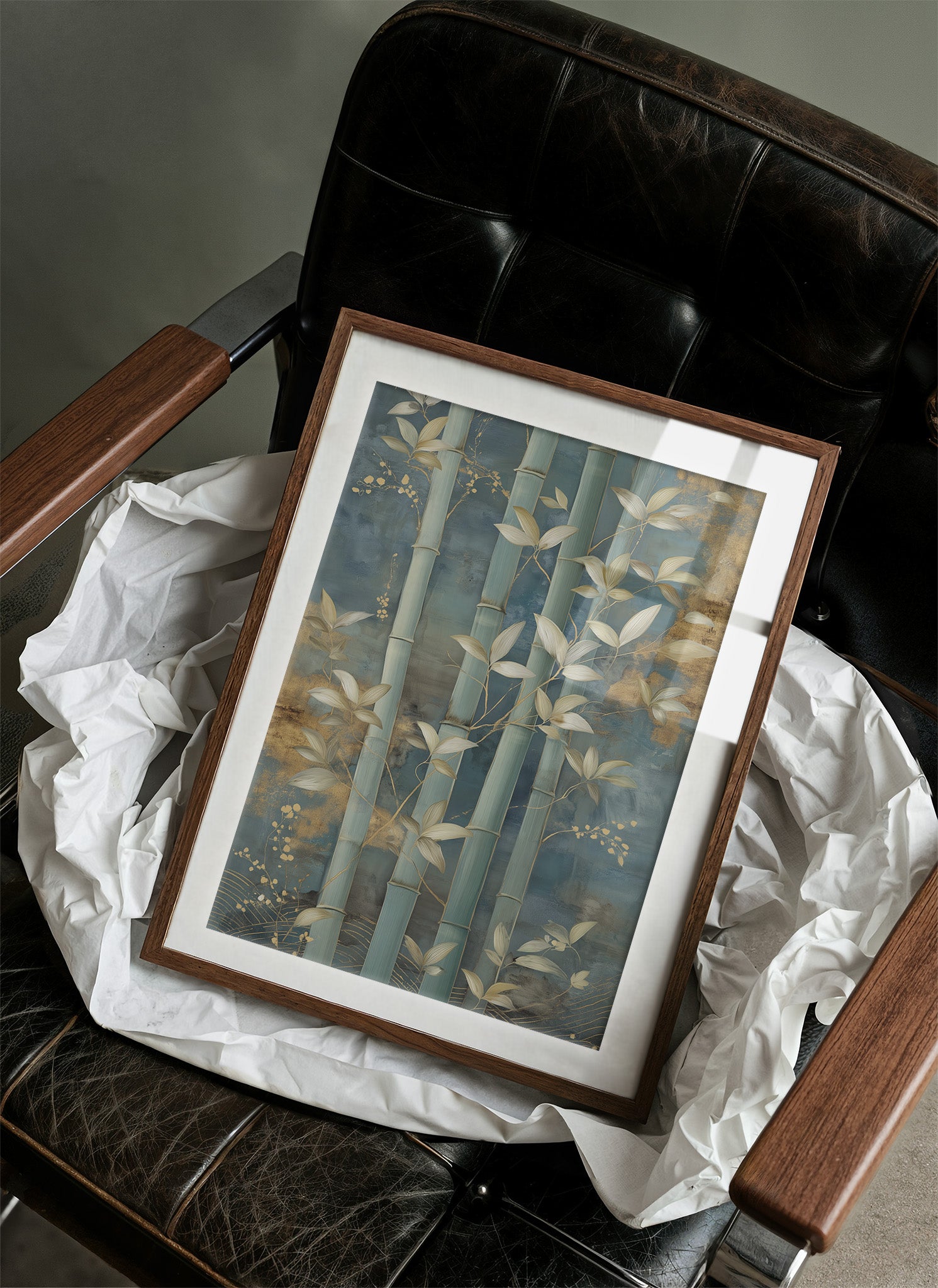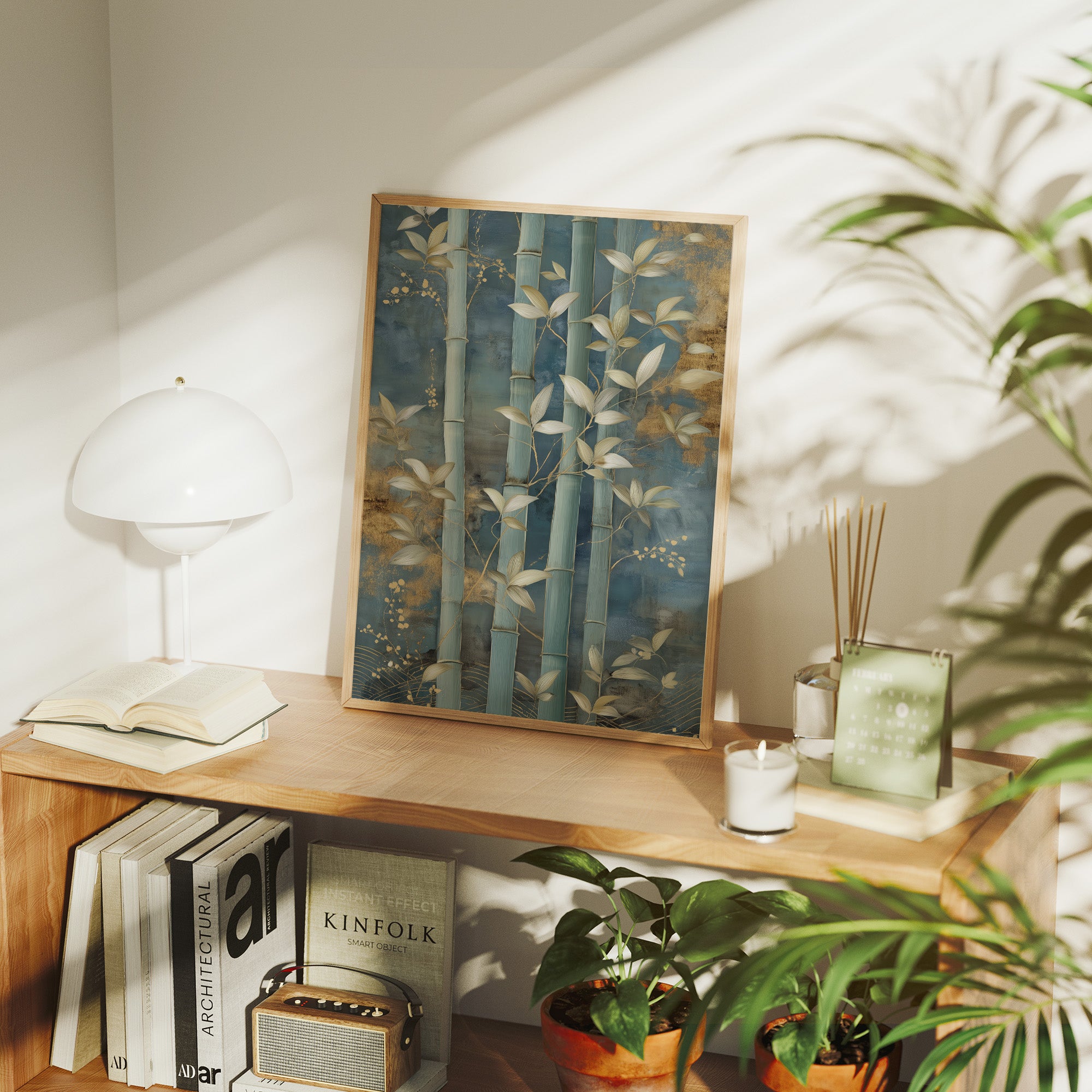 Gentle teal stalks rise through misty depths, creating a serene meditation on nature's quiet strength. Golden leaves dance across the composition, their delicate forms catching imagined moonlight against the deep blue-green background. The traditional Asian-inspired artwork balances strength and delicacy, with bamboo stems standing proud while graceful foliage weaves between them. This piece would bring tranquility to a reading nook or meditation space, its calming palette and organic forms creating a perfect focal point for mindful moments.