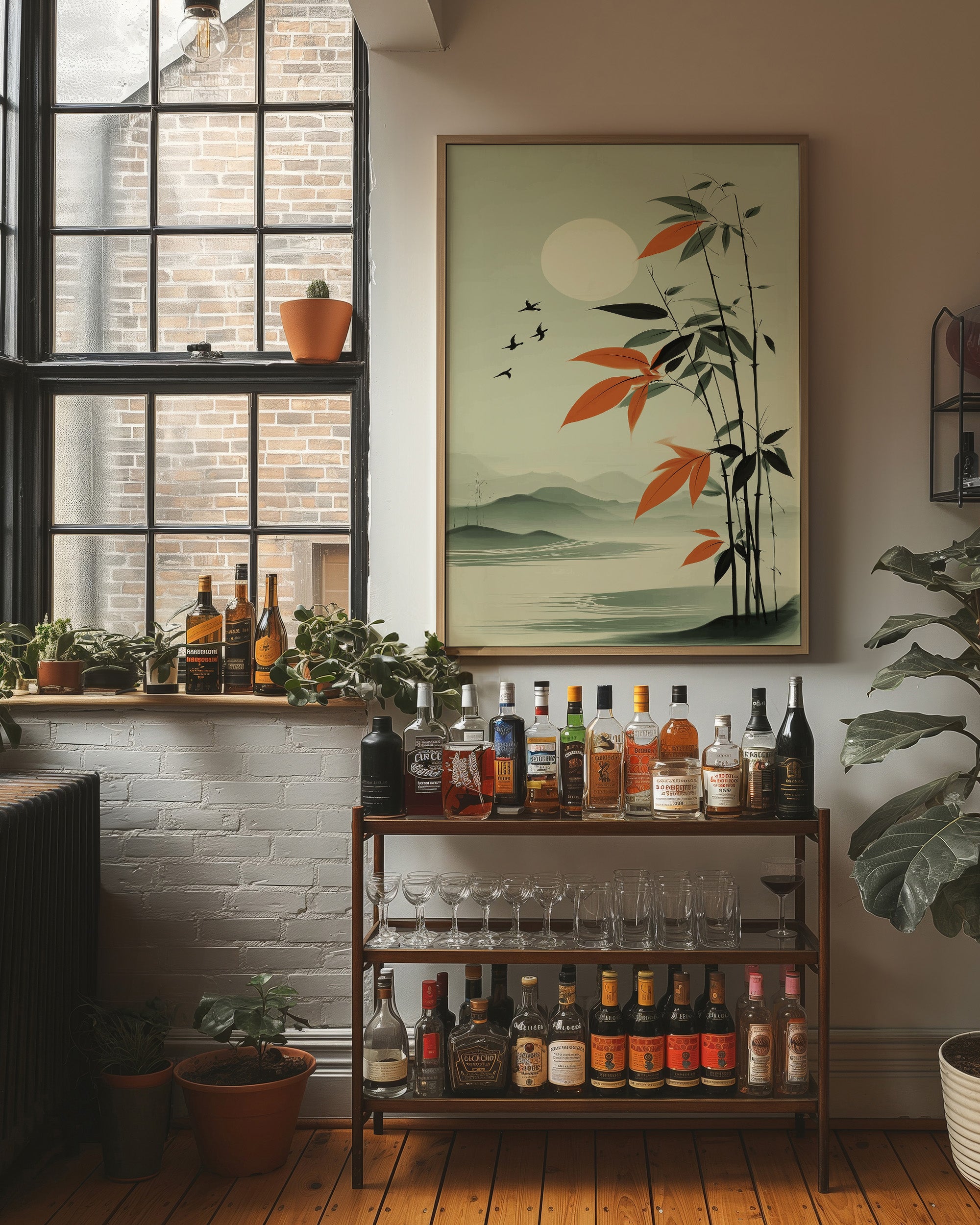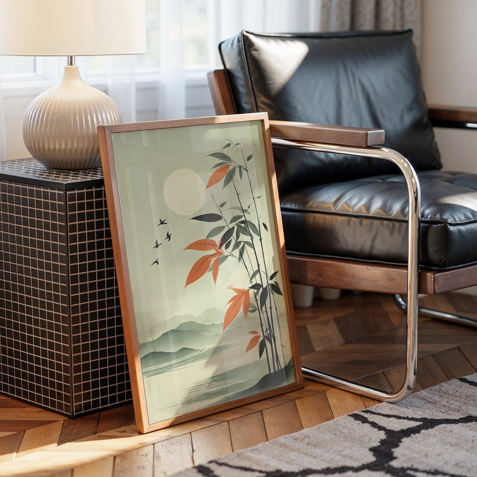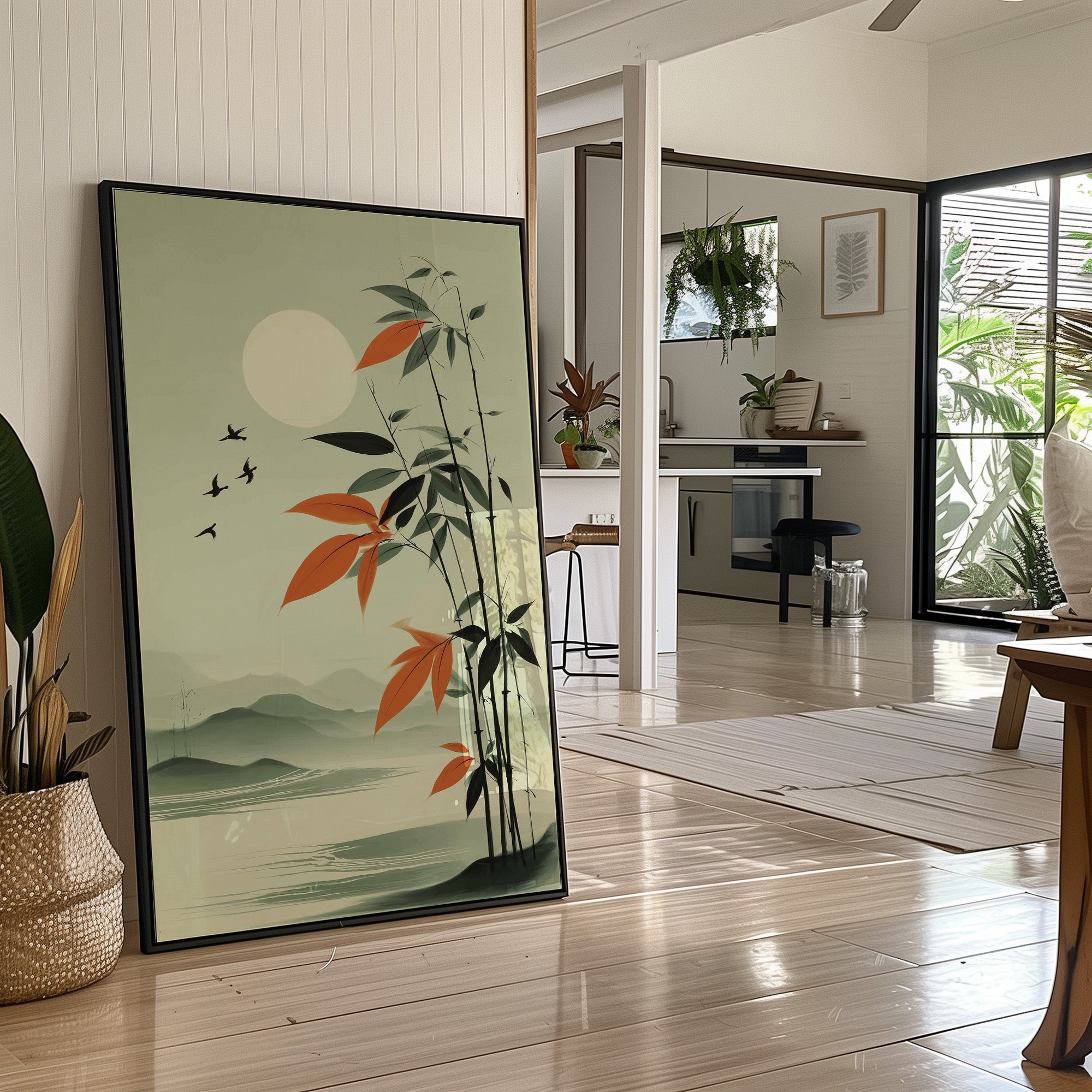 Gentle morning light bathes a serene Asian-inspired scene where coral-colored leaves dance against misty mountains. Delicate bamboo stalks reach skyward as birds take flight beneath a luminous moon, creating a perfect balance of movement and stillness. The soft sage palette merges with coral accents, while distant mountains fade into ethereal layers of tranquility. This piece would bring zen-like serenity to a reading nook, meditation space, or any room seeking a touch of Eastern tranquility.
