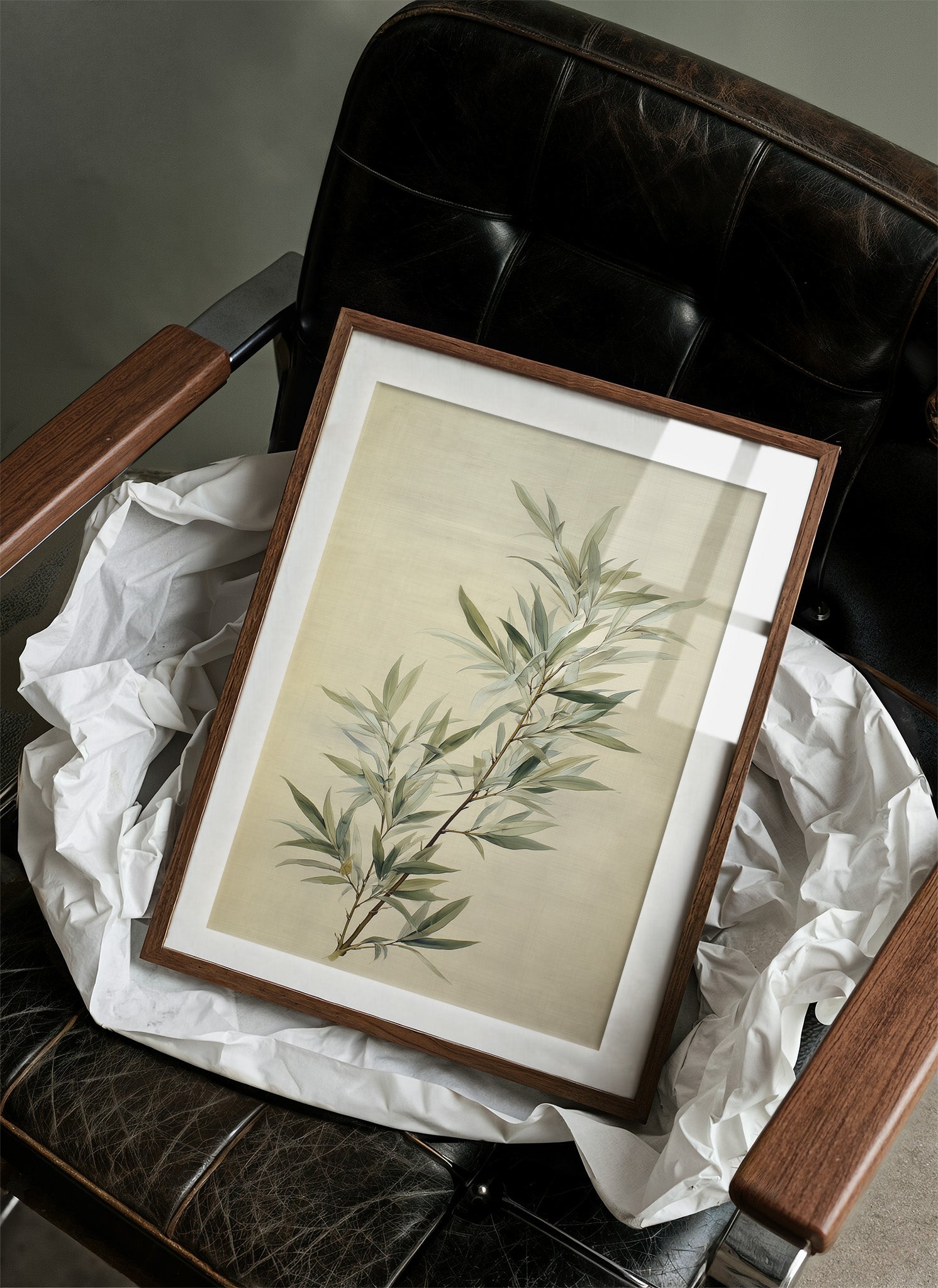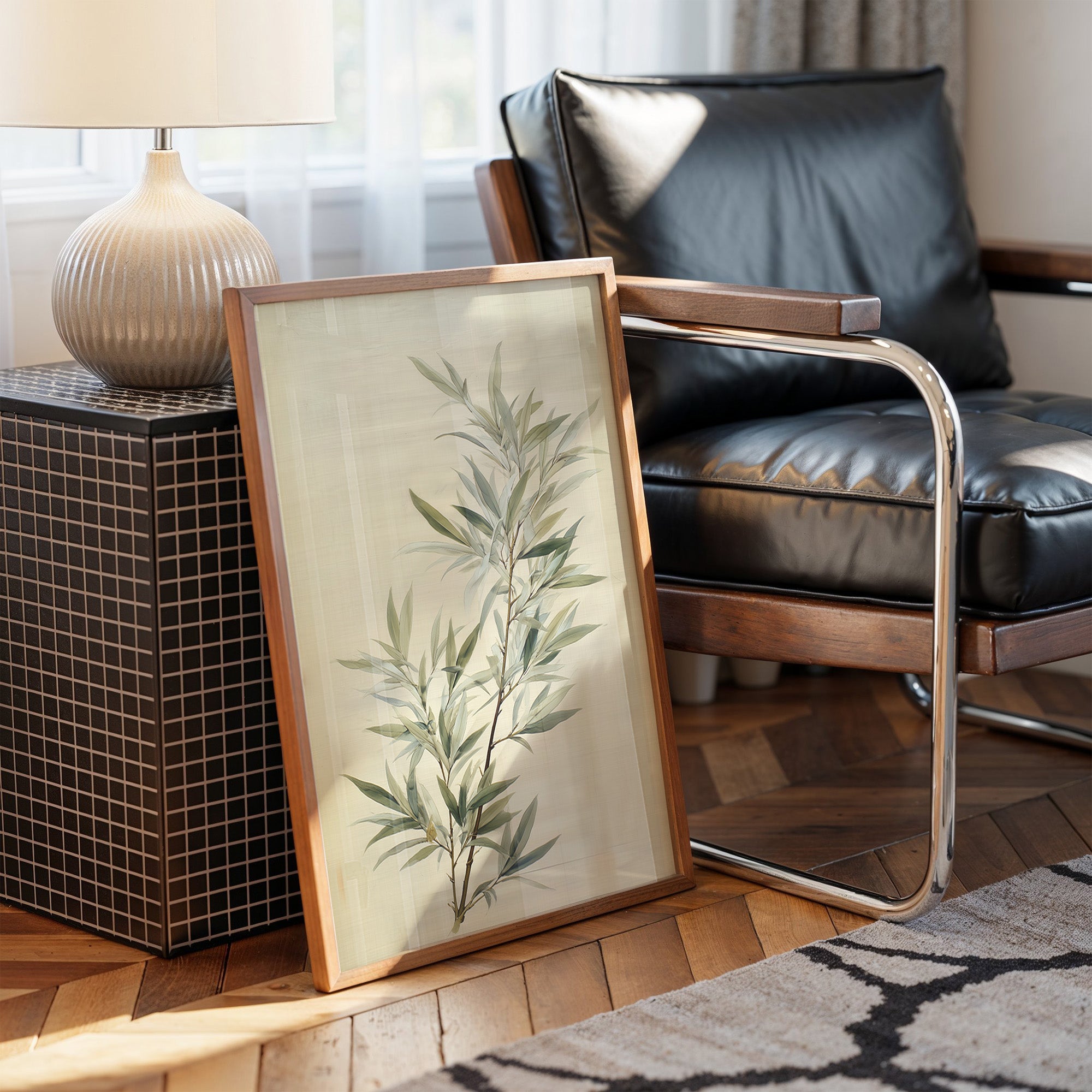 Soft sunlight filters through sheer curtains, casting gentle shadows across a serene botanical illustration. Delicate bamboo leaves rendered in muted sage greens rise gracefully against a cream background, their slender forms capturing the essence of natural elegance. The wooden frame and modern furniture create a harmonious blend of organic and contemporary elements, while the ribbed ceramic lamp adds textural interest to the sophisticated scene. This piece would bring a sense of tranquility to a reading nook, home office, or any space where calm contemplation is desired.