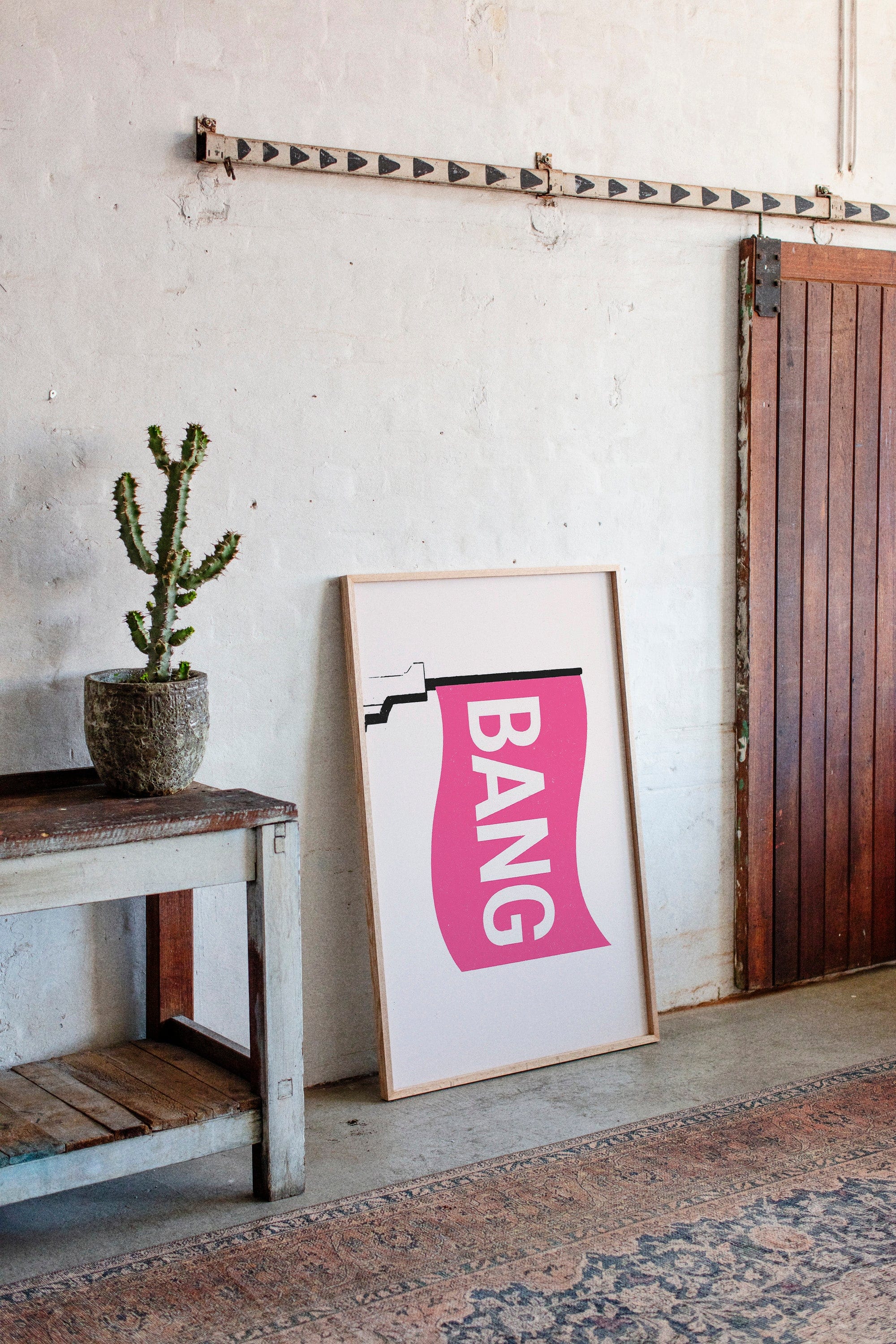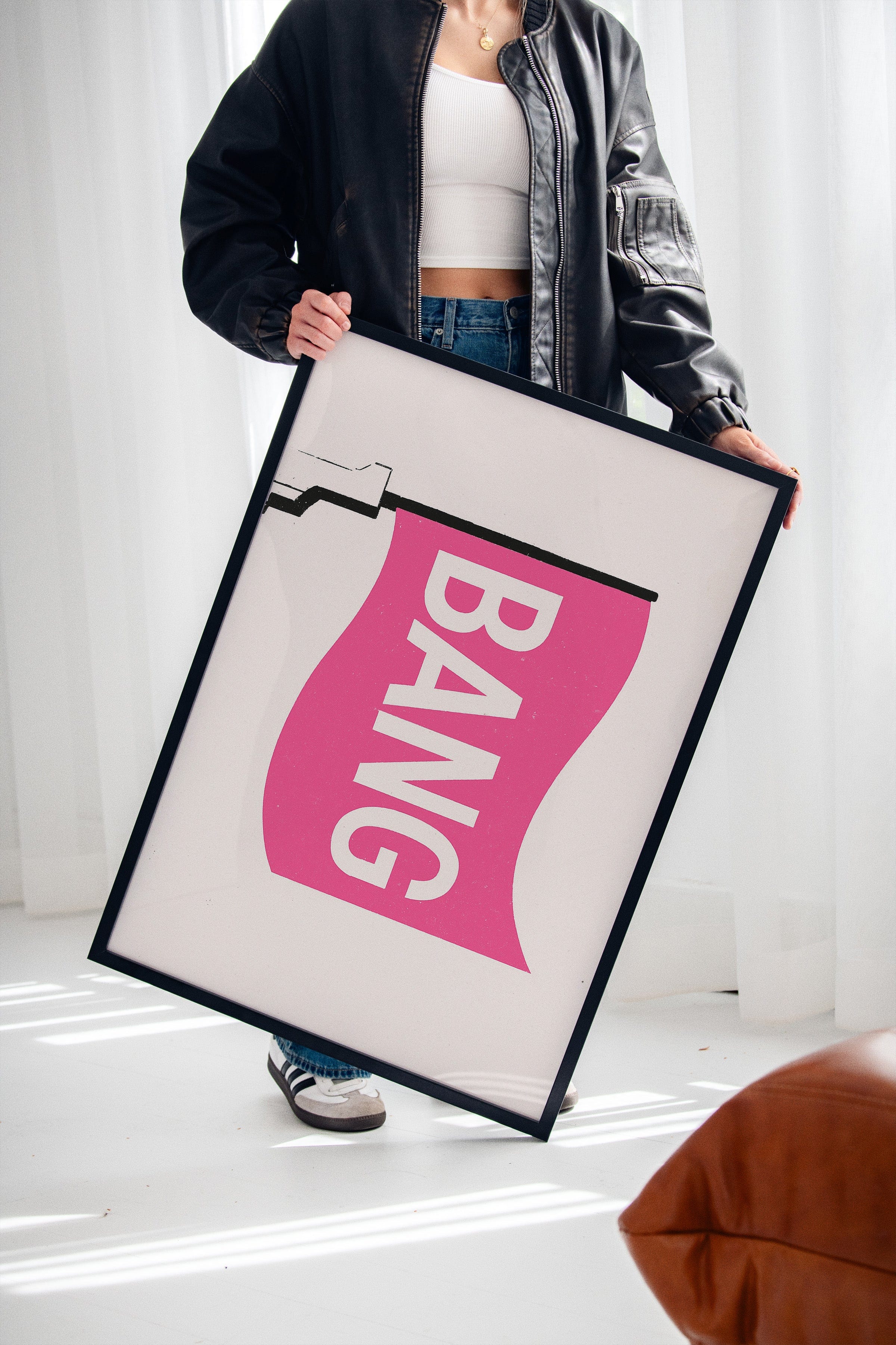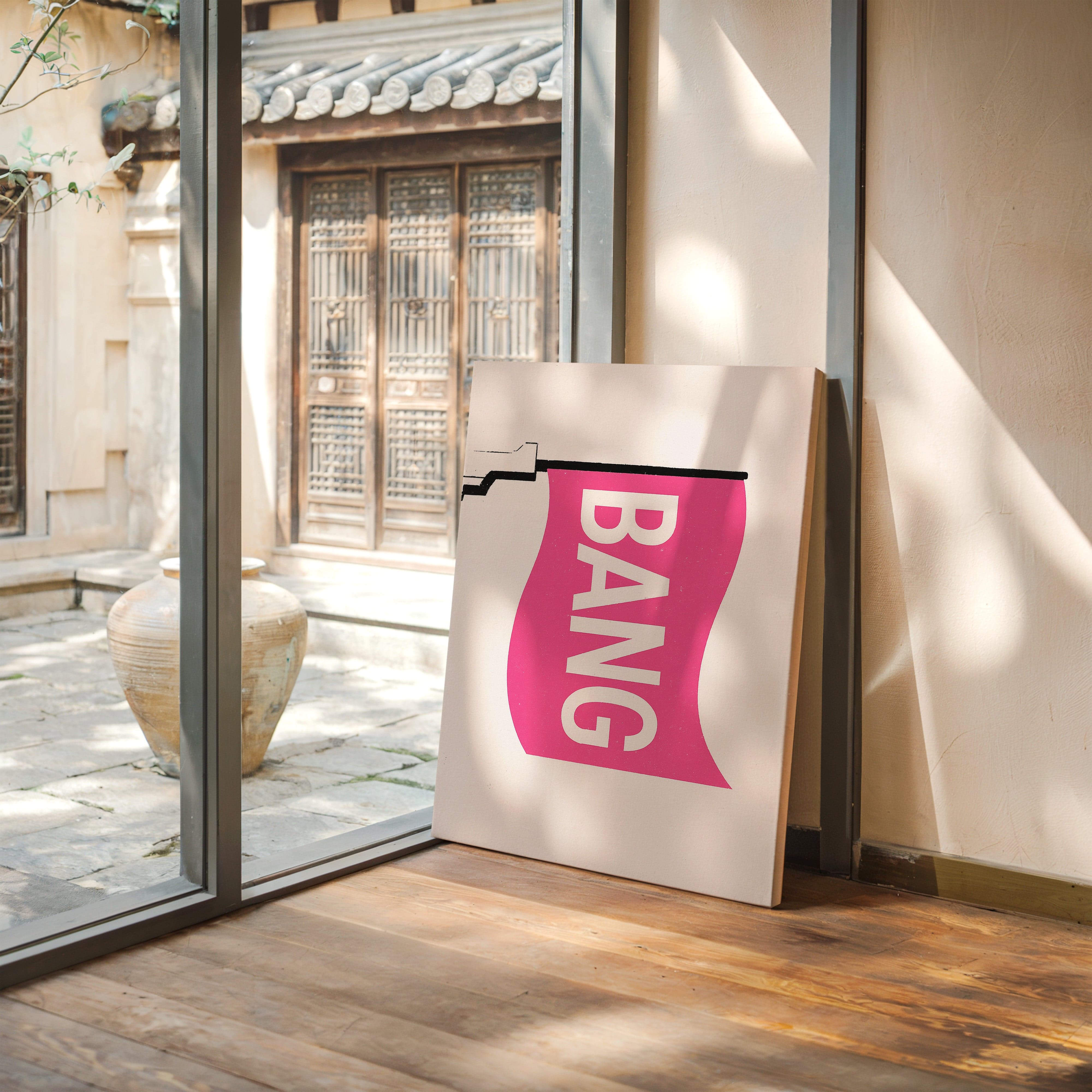 Playful, punchy, and packed with attitude. BANG! delivers a wink to vintage cartoons and bold graphic design with its comic-style revolver and bright pink flag. This minimalist yet high-impact print is perfect for lovers of retro art, edgy humor, or statement wall decor. Whether in a modern space or kitschy corner, it hits the mark every time.