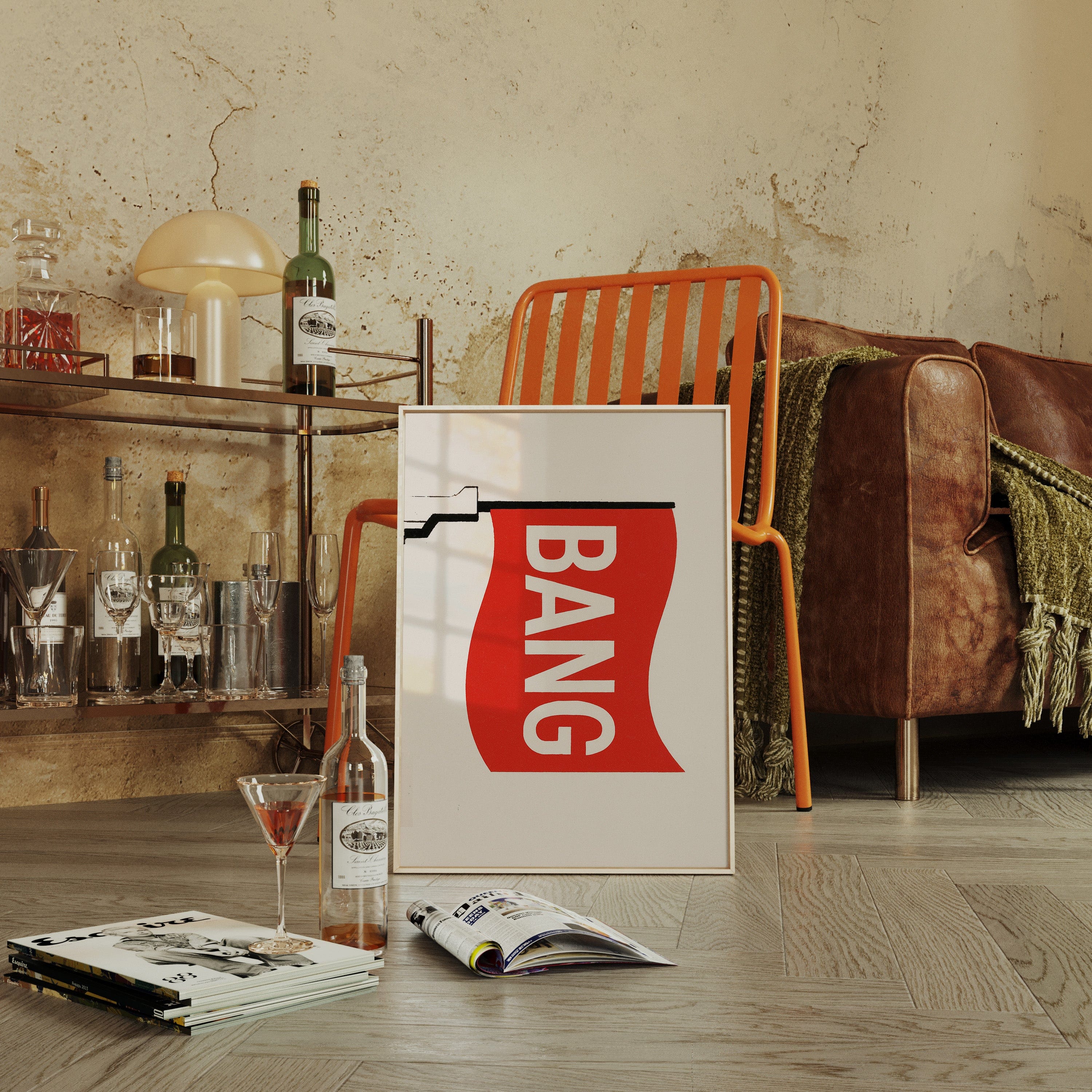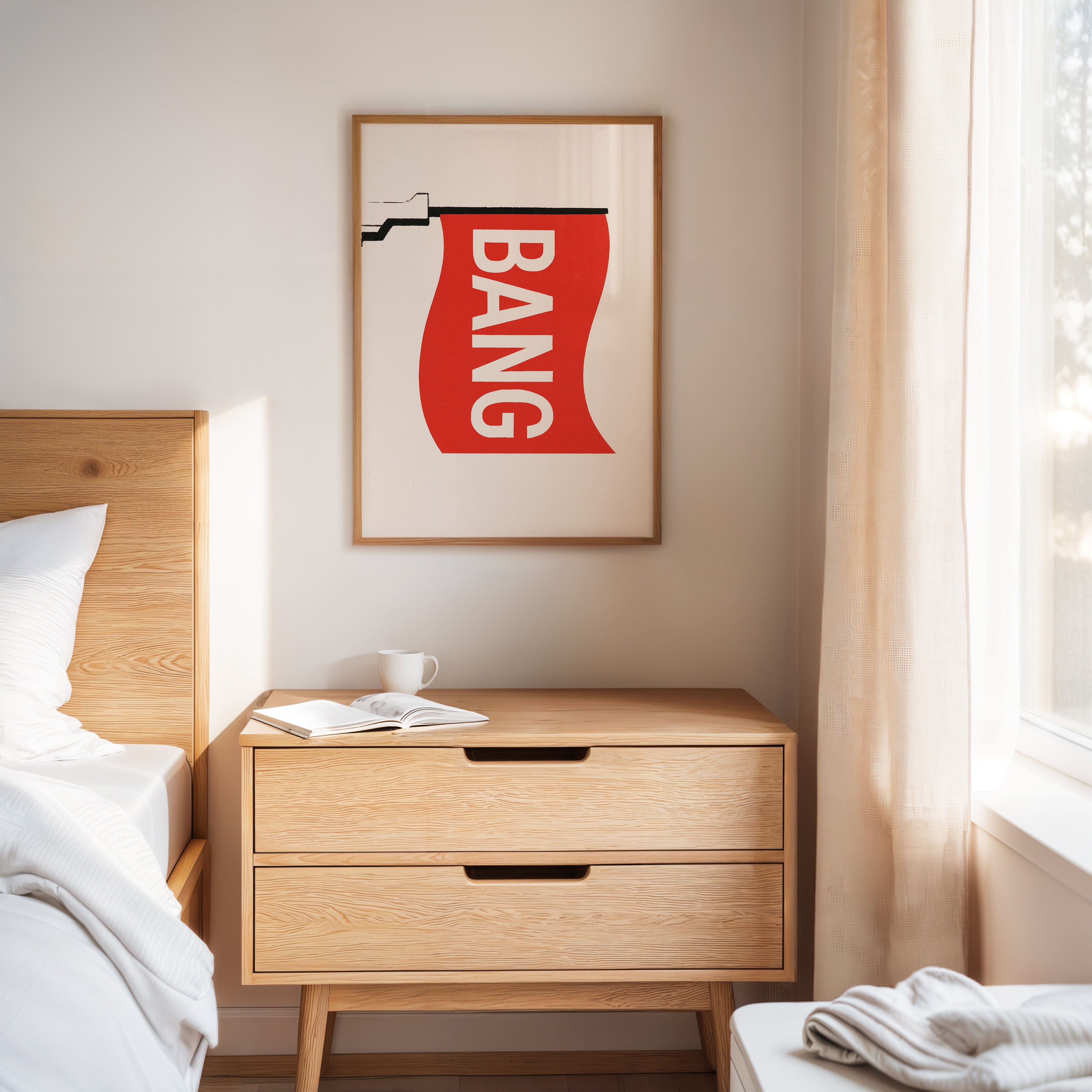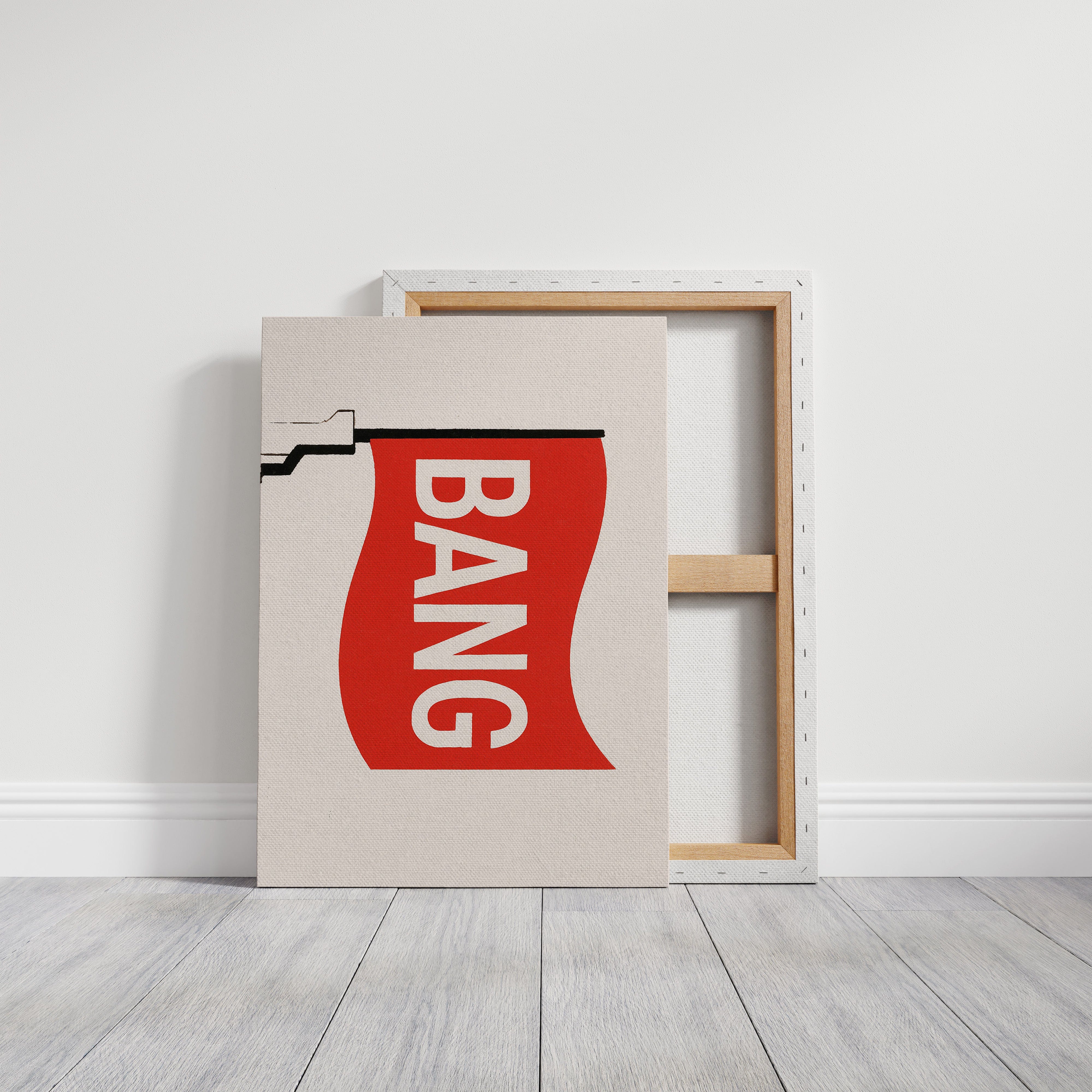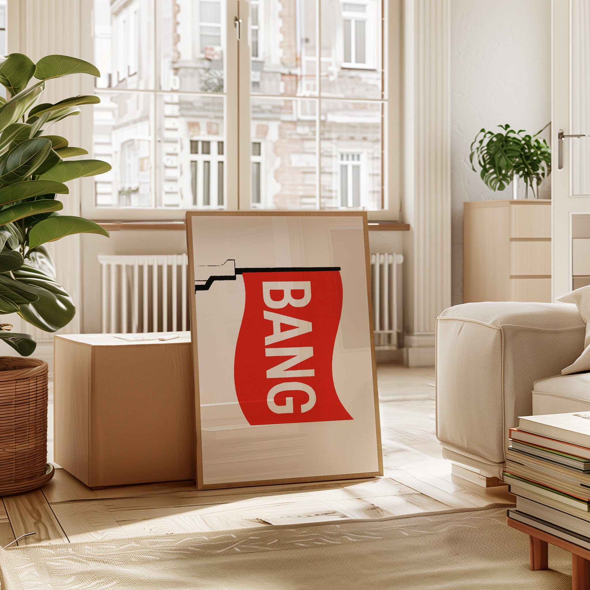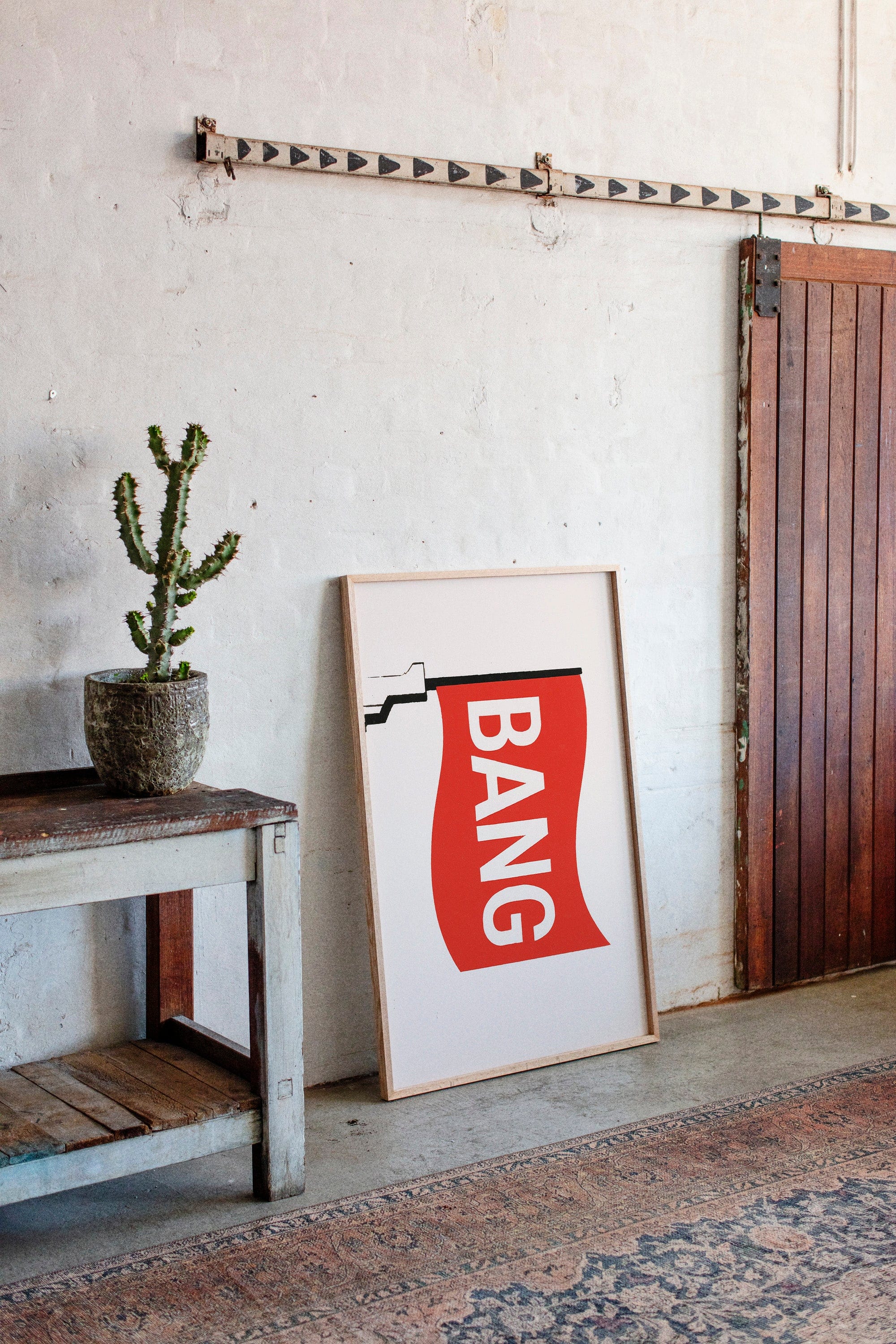 A nod to vintage cartoons and graphic punchlines, this BANG! poster pops with playful defiance. The vivid red flag unfurls from a comic gun barrel, channeling both humor and attitude in a clean, minimalist design. Perfect for eclectic interiors, game rooms, or anyone who loves a little bang with their boldness.