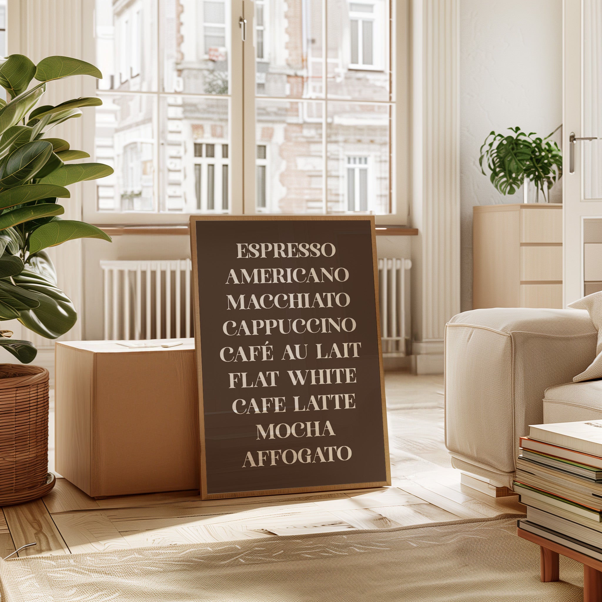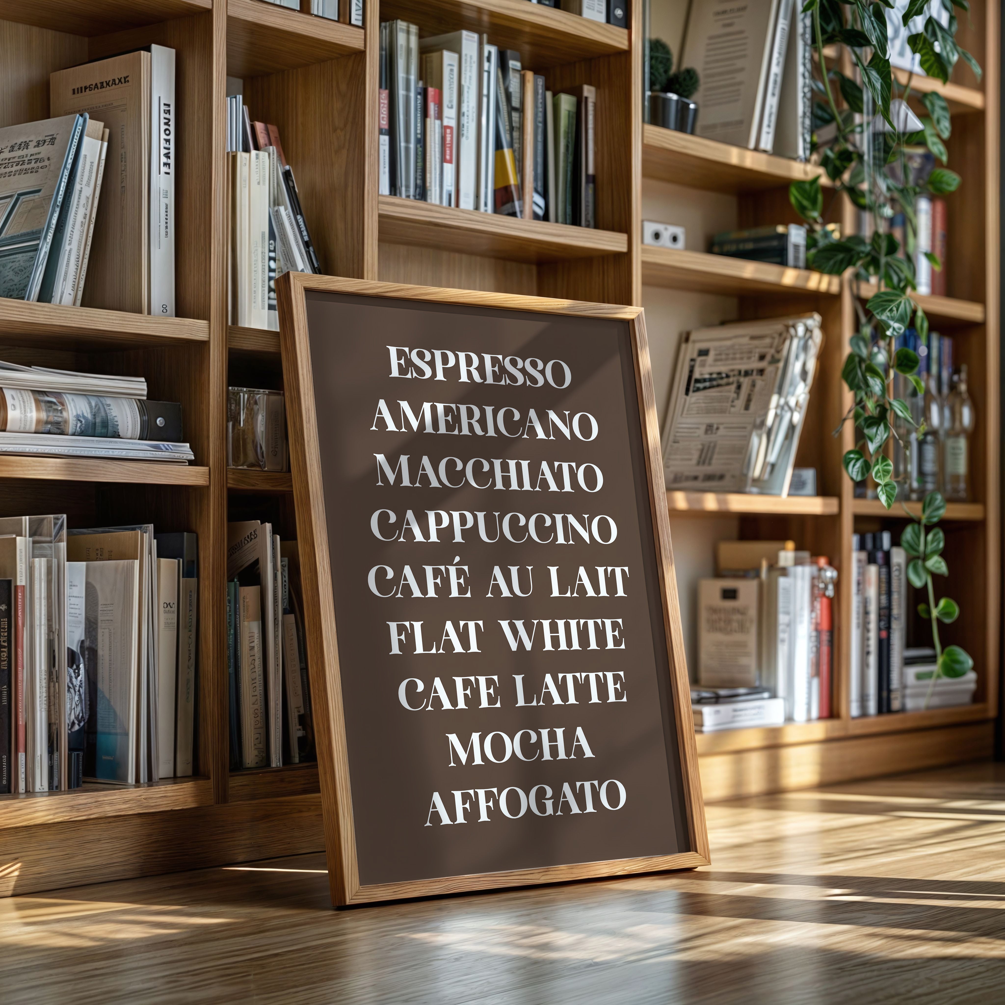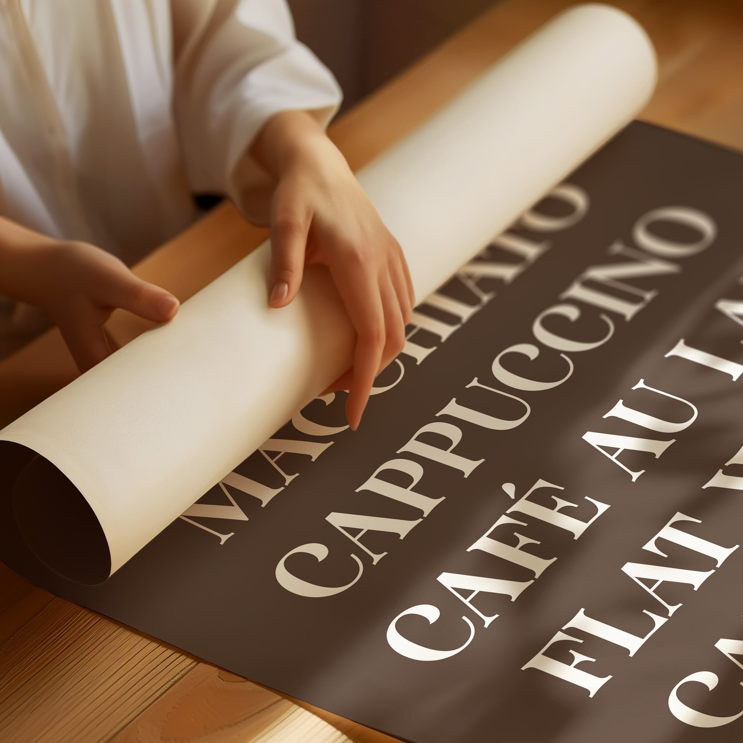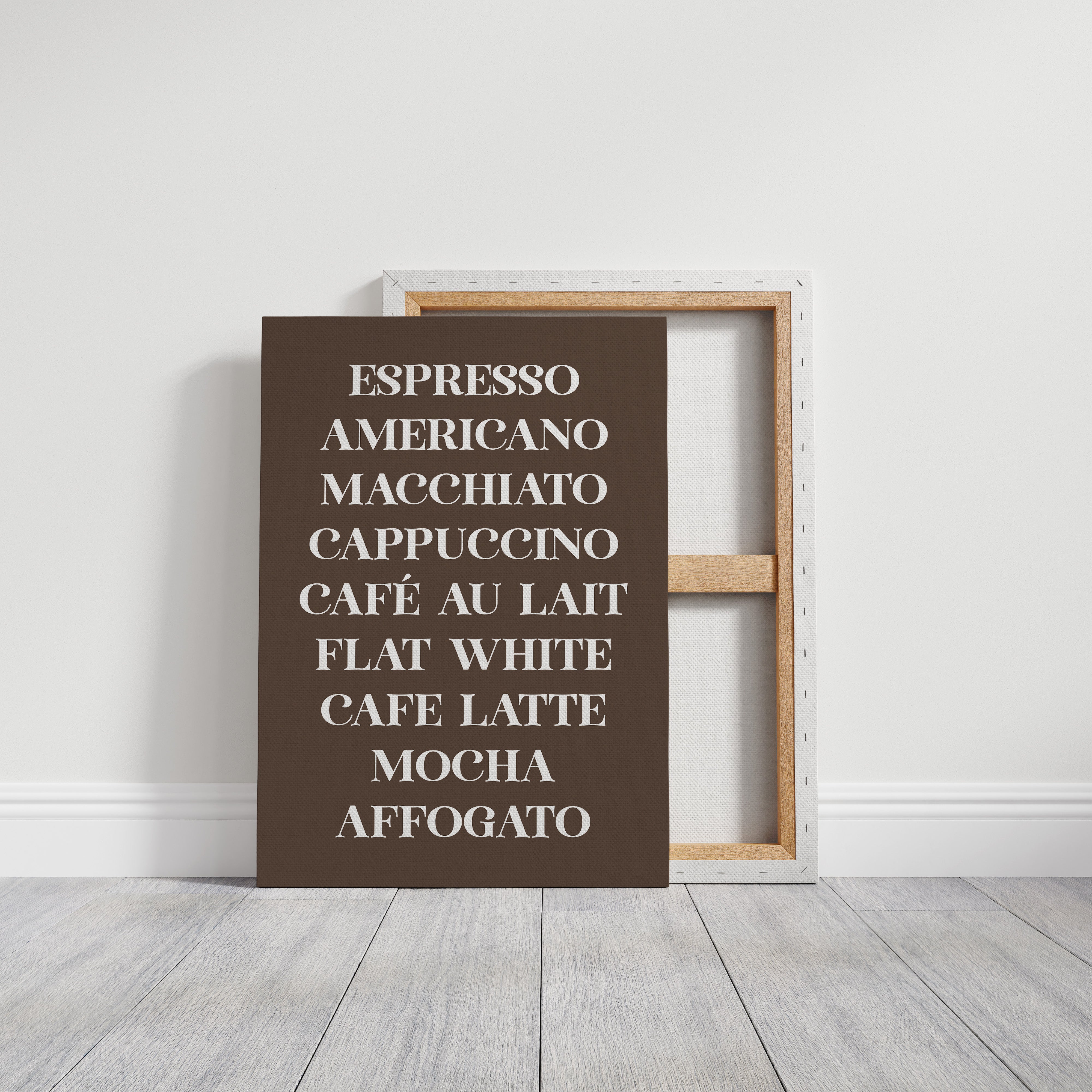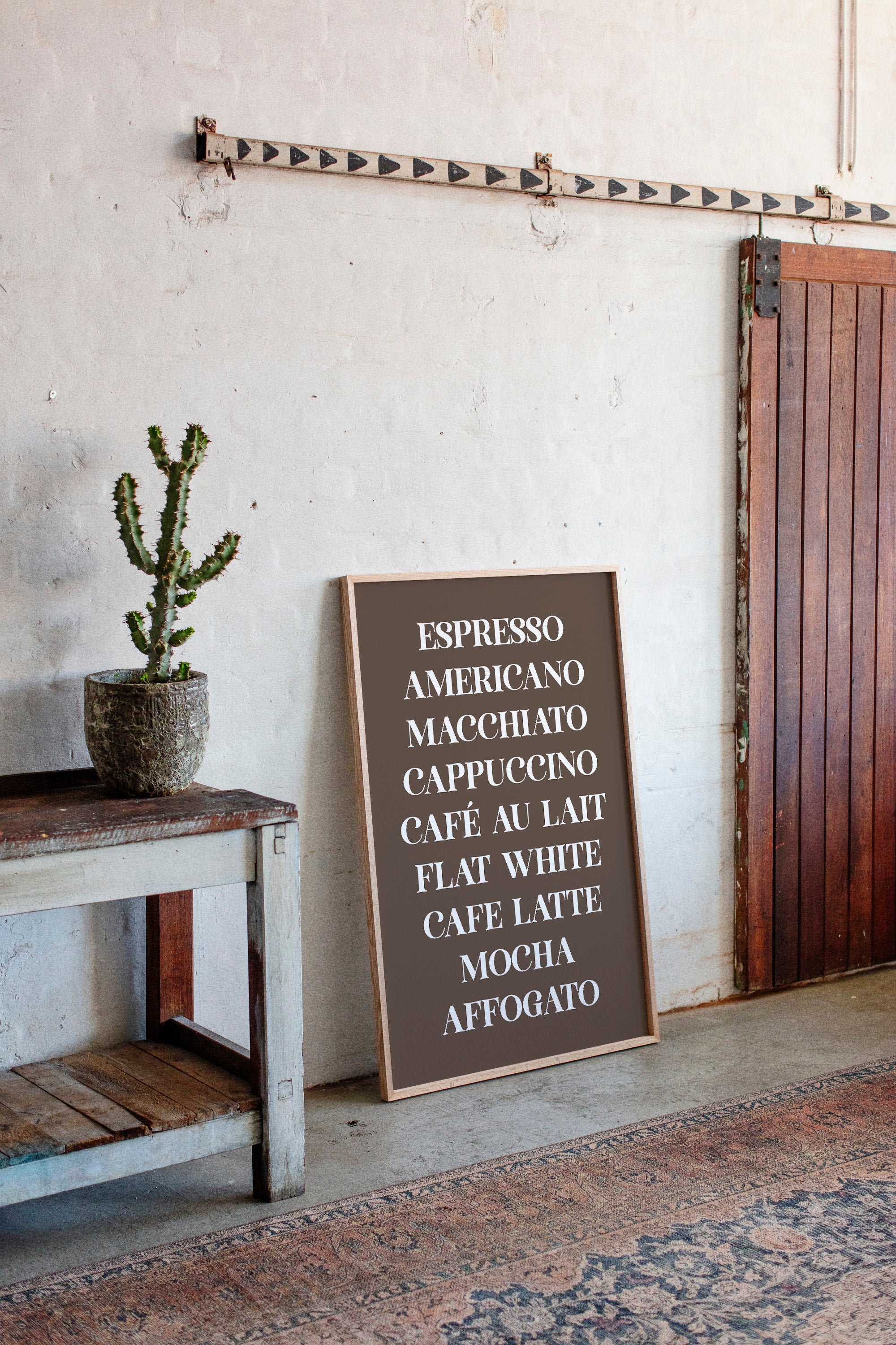 Crisp white typography emerges from a rich cocoa canvas, each word a celebration of coffee culture's finest expressions. This piece from our Contemporary collection marries minimalist design with cafe sophistication. The elegant serif font commands attention while maintaining a sense of timeless refinement, creating a visual rhythm that flows like perfectly pulled espresso shots. Perfect for modern kitchen spaces, coffee bars, or dining areas where it adds both decorative appeal and conversational charm. The deep brown backdrop provides a sensual warmth that invites viewers to pause and savor each carefully crafted word.