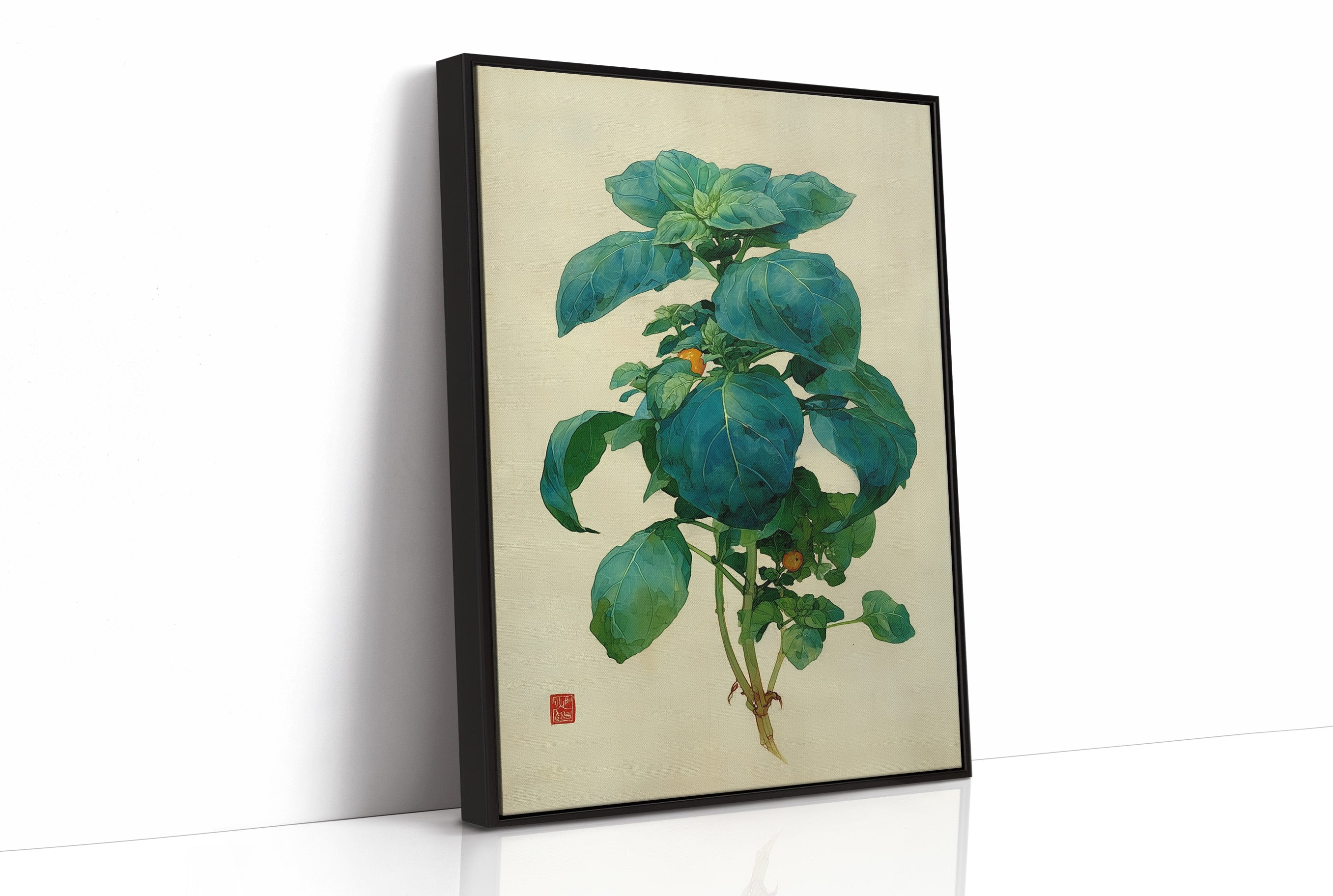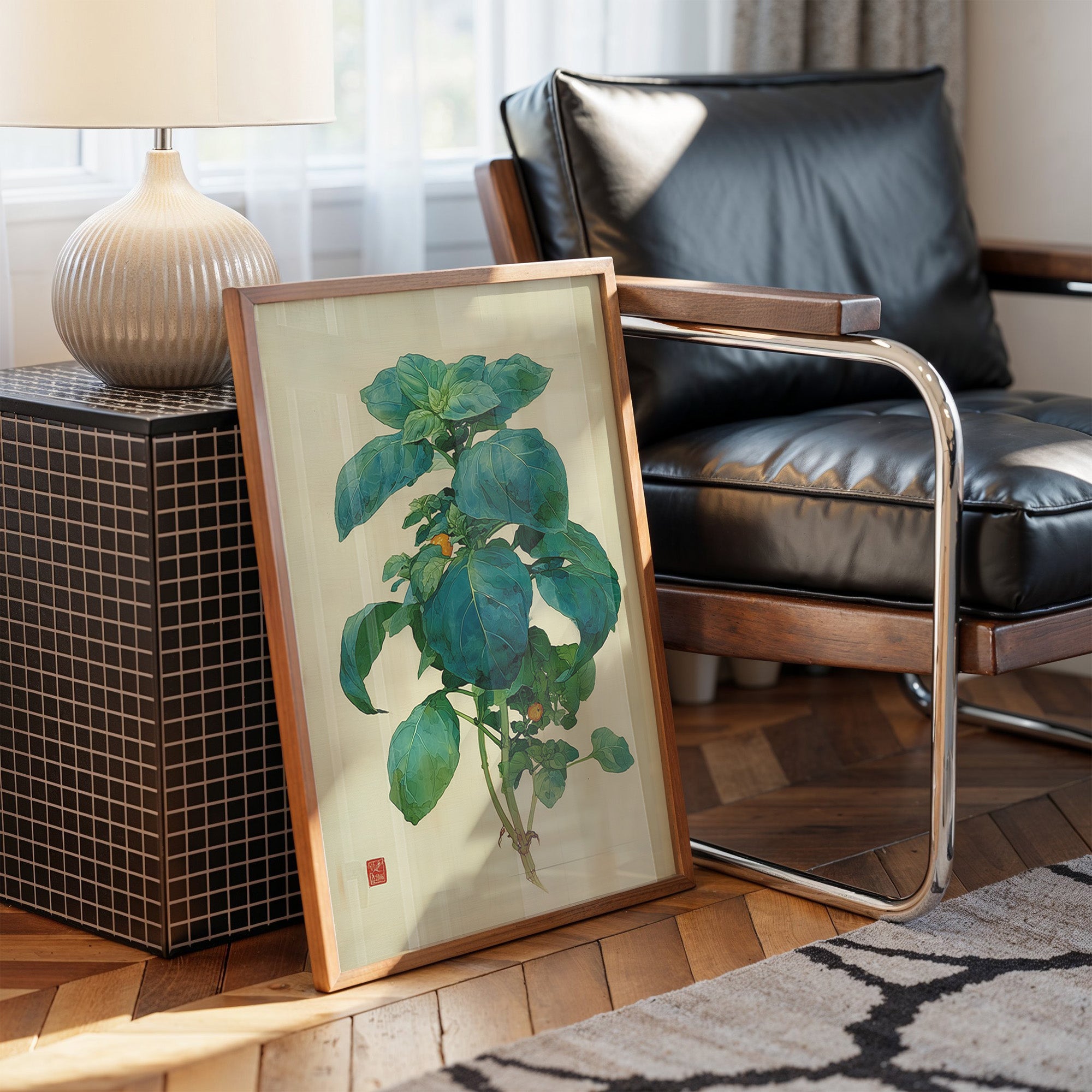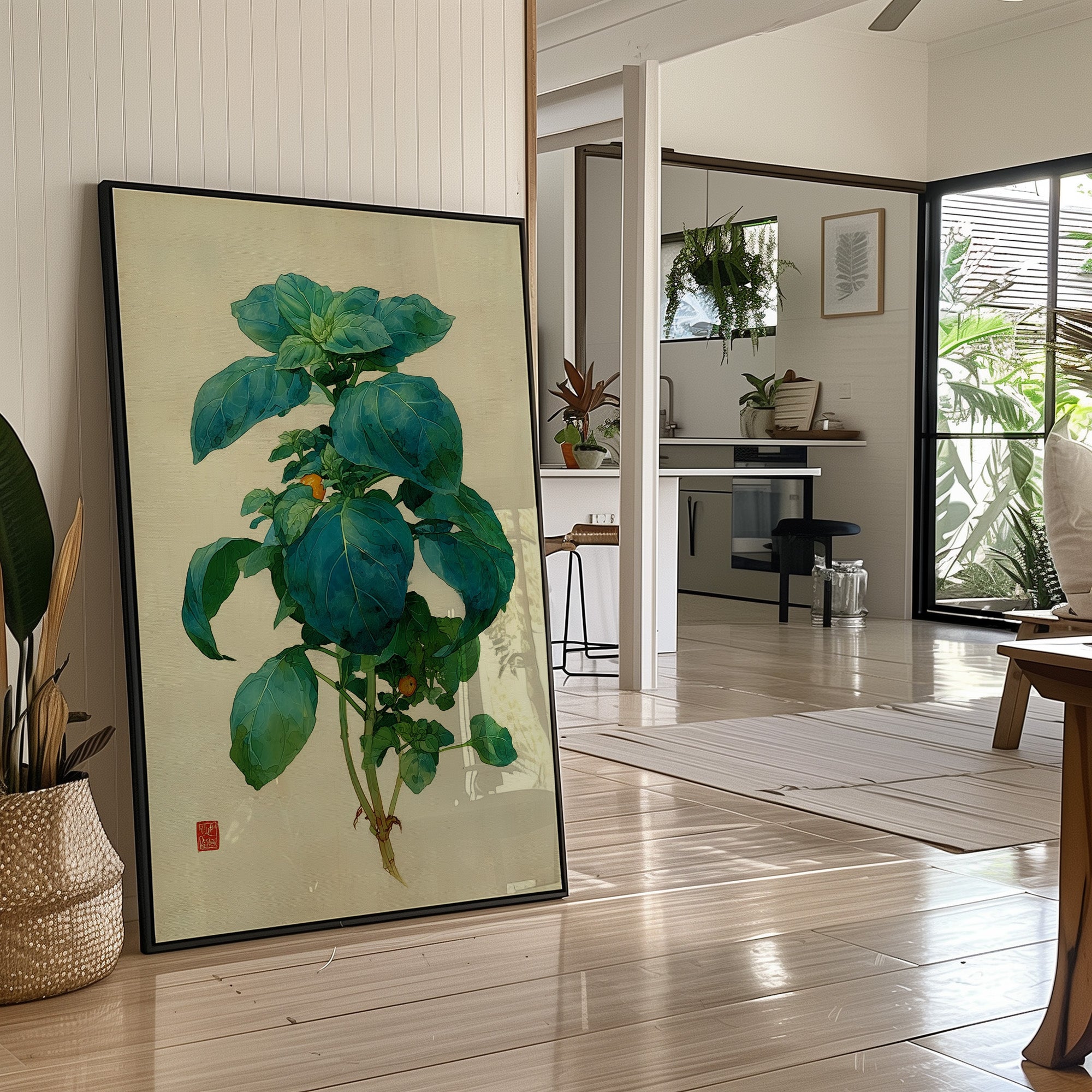 Sunlight streams across hardwood floors, illuminating delicate brushstrokes that capture the essence of fresh basil leaves in their verdant glory. The botanical illustration showcases the plant's natural elegance through translucent emerald hues and graceful stems, each leaf rendered with scientific precision yet artistic soul. The modern living space provides a perfect stage for this contemporary take on traditional botanical art, where clean lines meet organic forms. Perfect for a sunlit kitchen nook or a sophisticated home office where its serene presence can inspire both culinary creativity and mindful productivity.