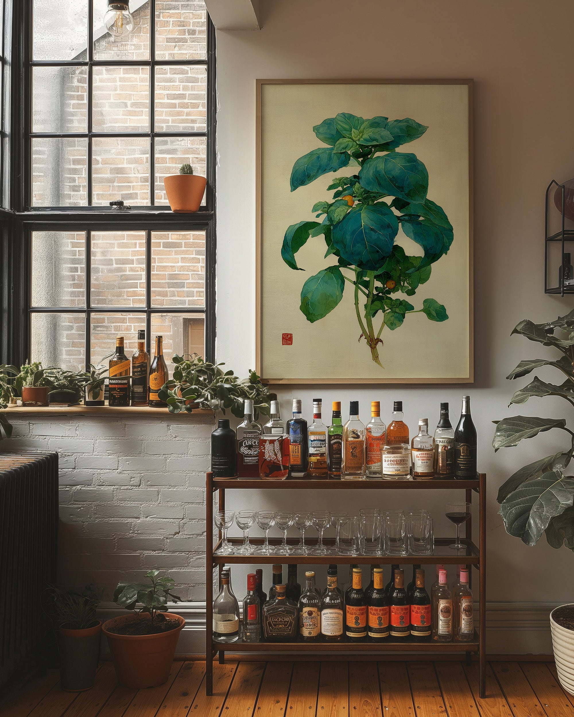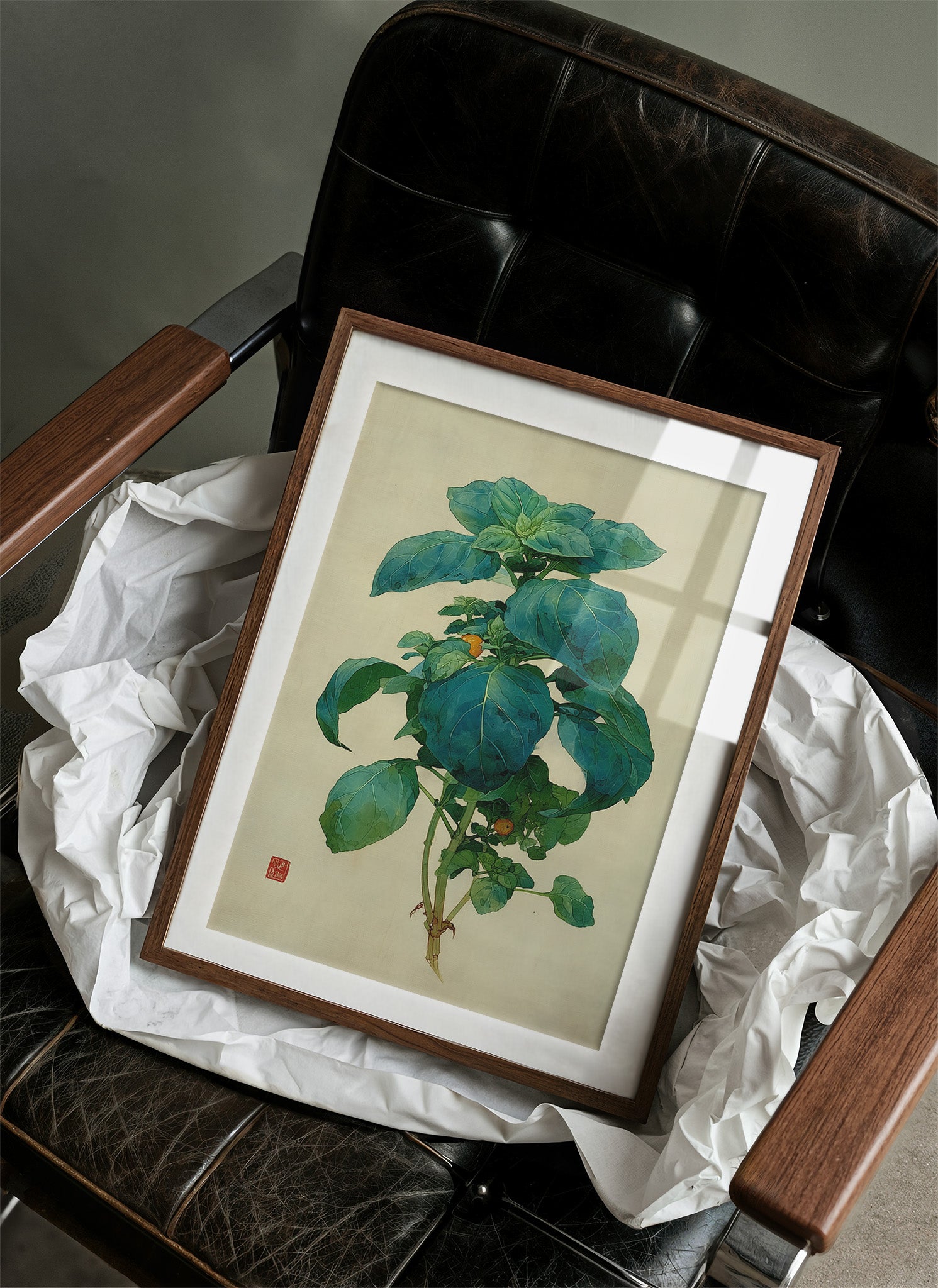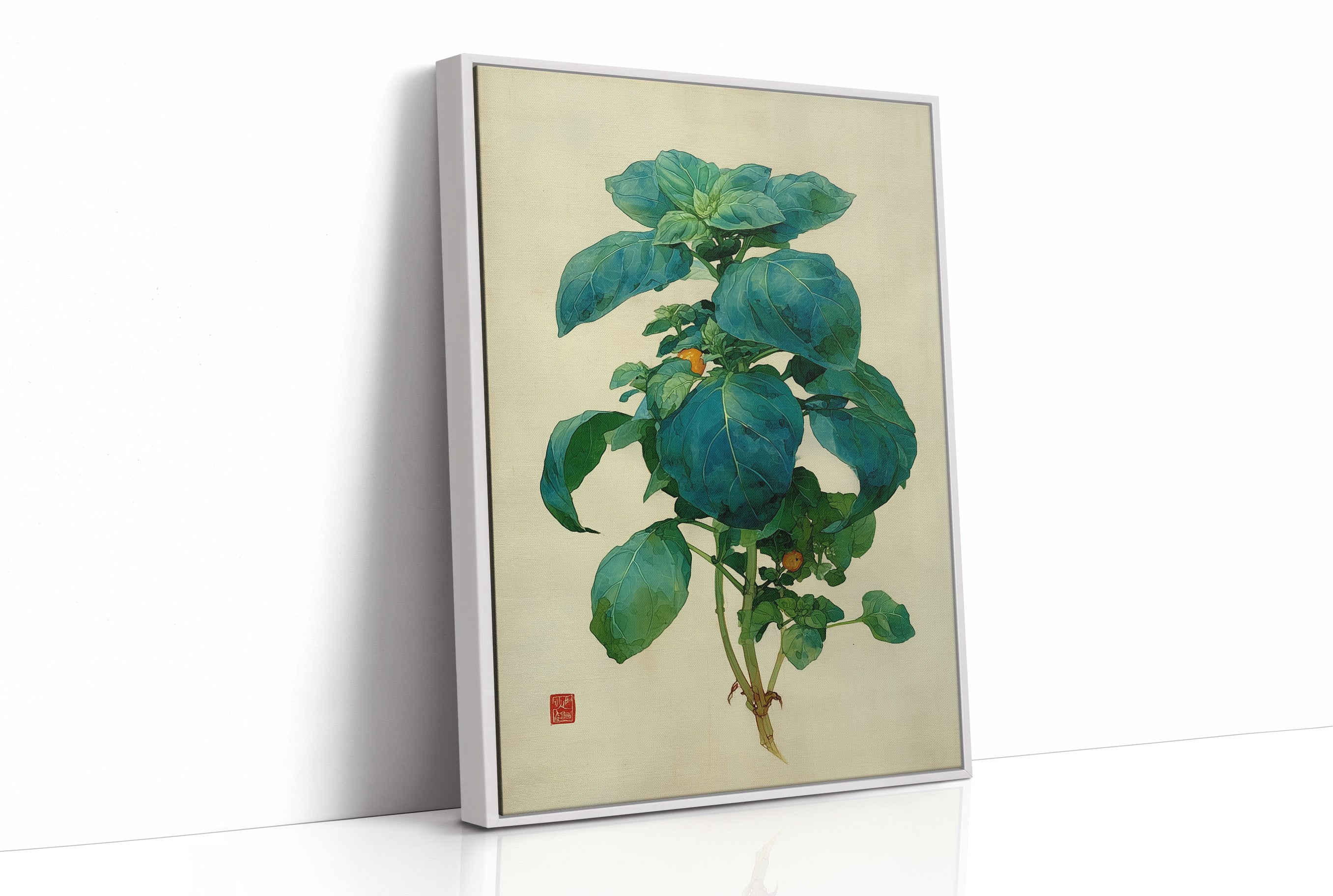 Sunlight streams across hardwood floors, illuminating delicate brushstrokes that capture the essence of fresh basil leaves in their verdant glory. The botanical illustration showcases the plant's natural elegance through translucent emerald hues and graceful stems, each leaf rendered with scientific precision yet artistic soul. The modern living space provides a perfect stage for this contemporary take on traditional botanical art, where clean lines meet organic forms. Perfect for a sunlit kitchen nook or a sophisticated home office where its serene presence can inspire both culinary creativity and mindful productivity.