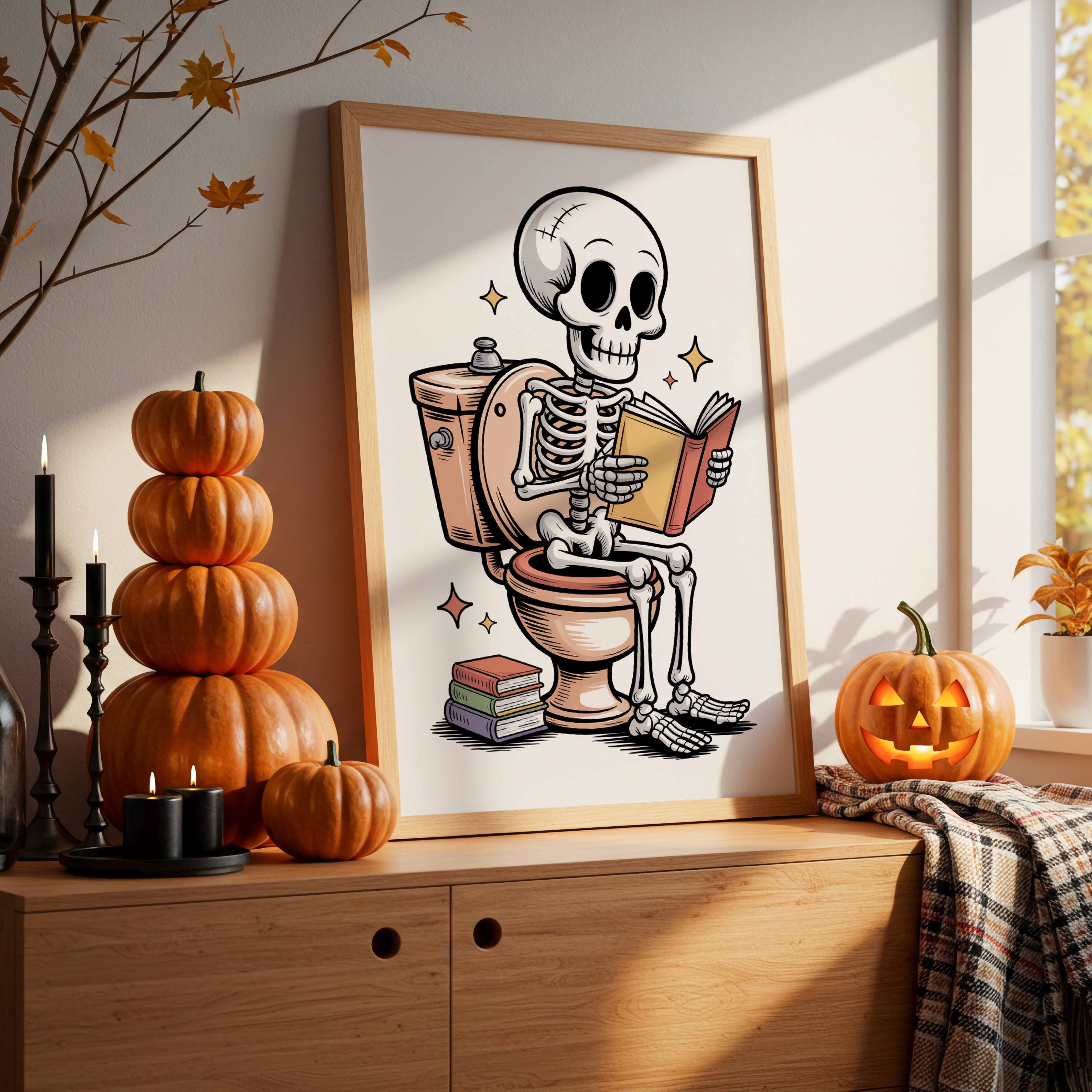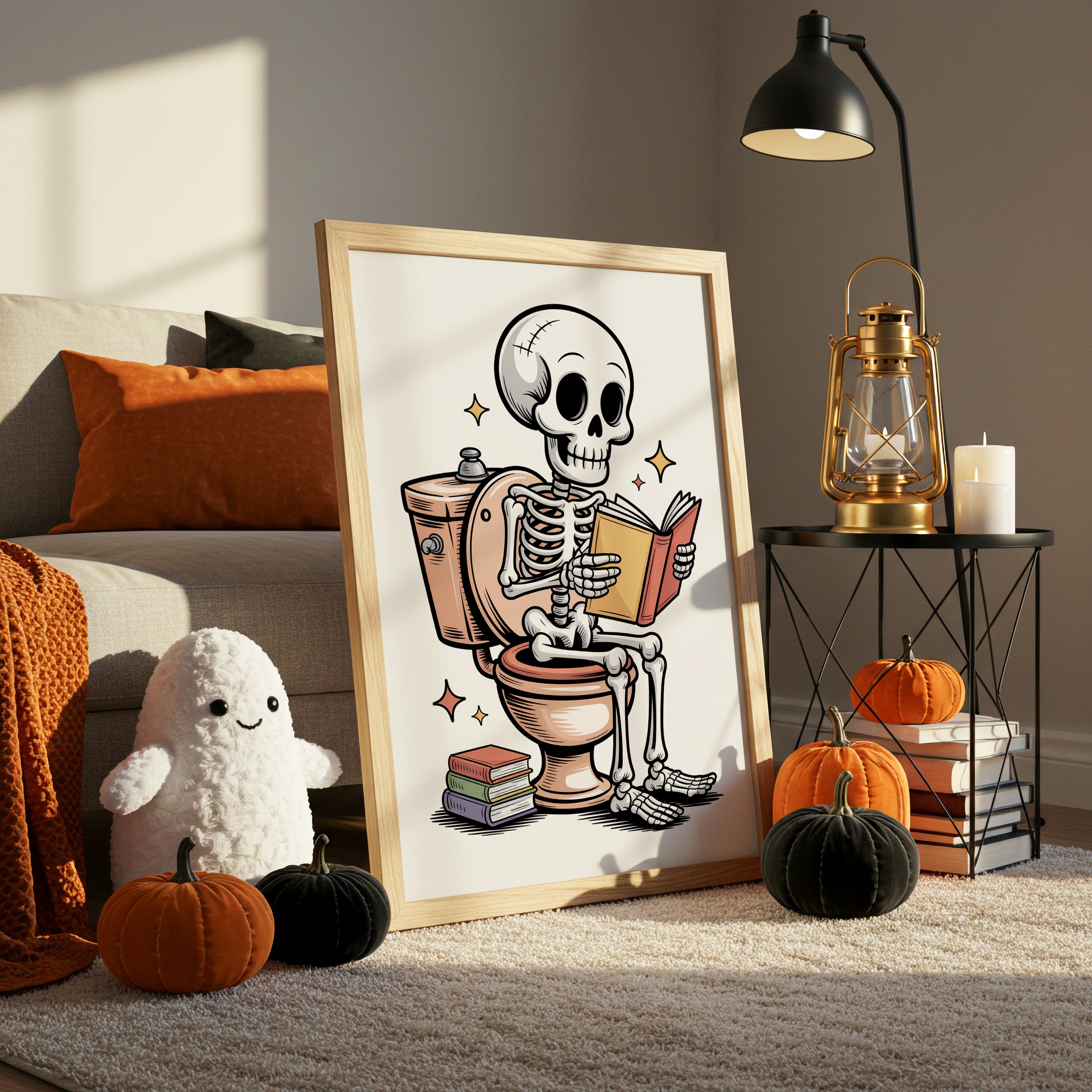 Time stands still in this quirky moment of macabre humor. A cartoon skeleton sits contentedly on a vintage toilet, absorbed in a book with bony fingers carefully turning the pages. The playful illustration combines muted peach tones with stark white bones, creating a whimsical contrast between the mundane and the eternal. Small sparkles dance around the scene, adding a touch of magic to this comical take on mortality's quiet moments.