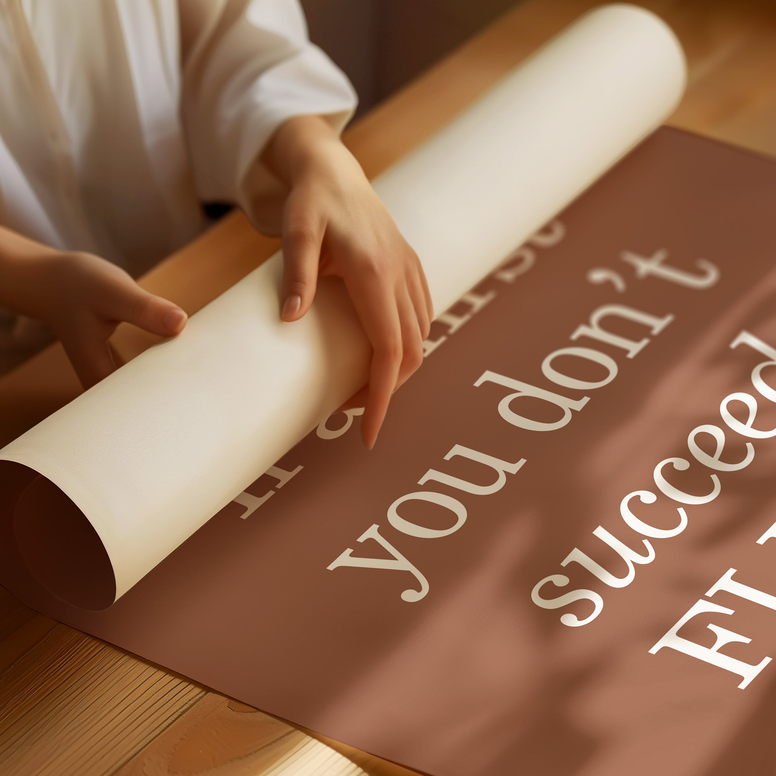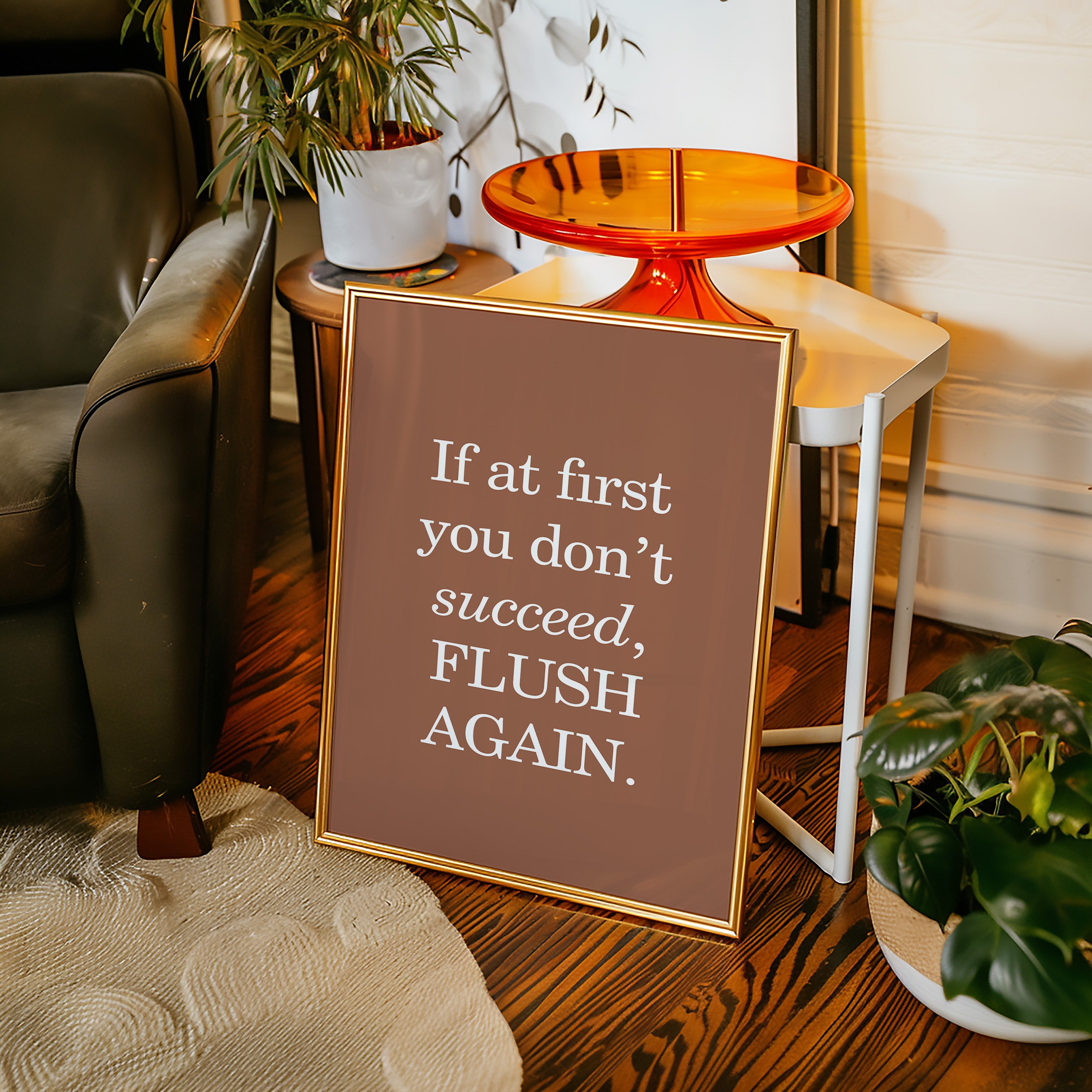 A playful twist on perseverance sparkles against a warm bronze backdrop, offering both humor and motivation in equal measure. This contemporary typography piece brings modern wit to functional spaces. The bold serif lettering creates a striking contrast against the earthy background, while the message itself delivers a perfectly timed punch of humor that catches visitors by surprise. The sophisticated neutral tone transforms a cheeky sentiment into an artful statement. Perfect for adding personality to a powder room or bringing a smile to a modern bathroom space, this piece proves that even practical spaces deserve a touch of wit.