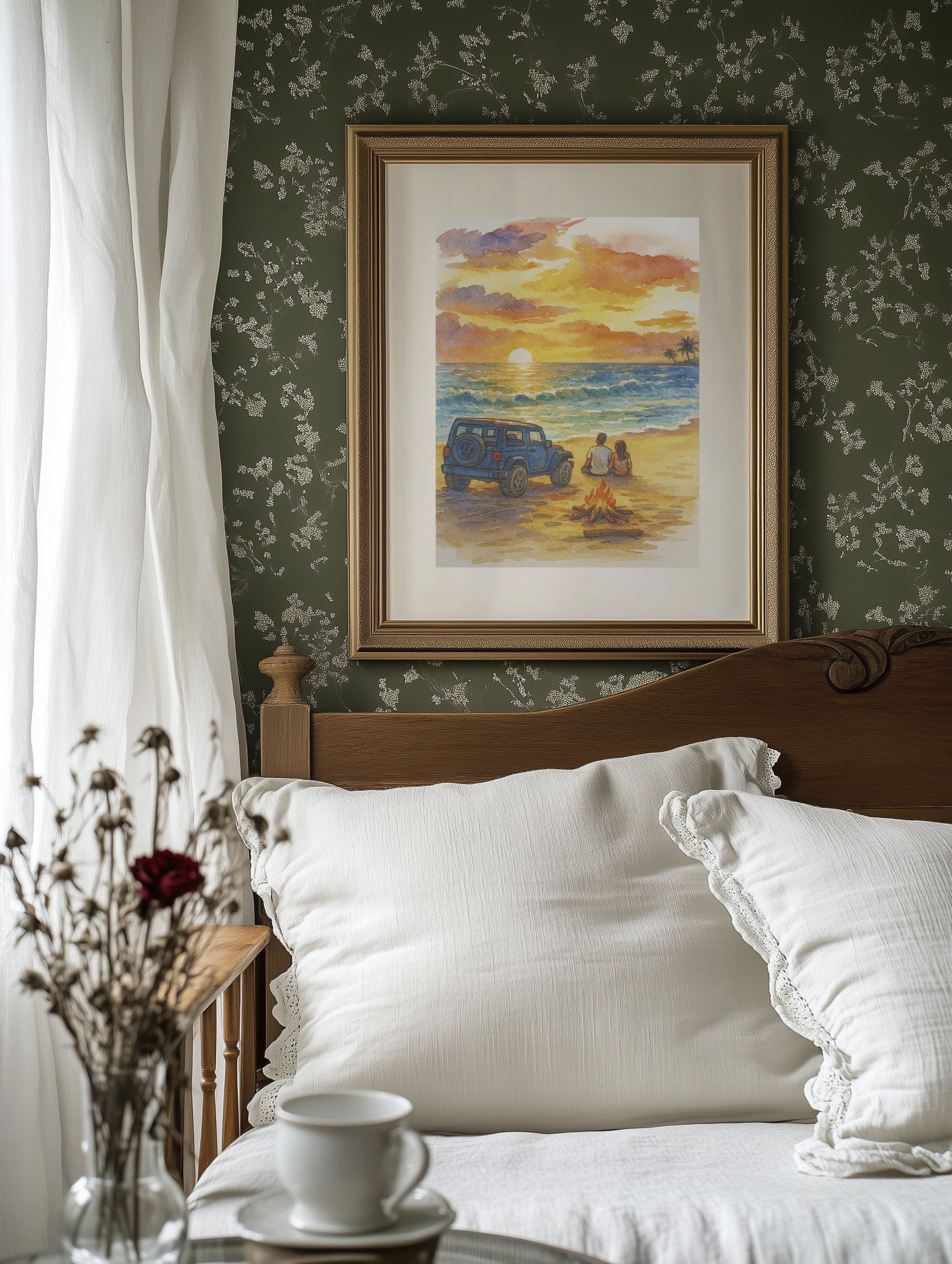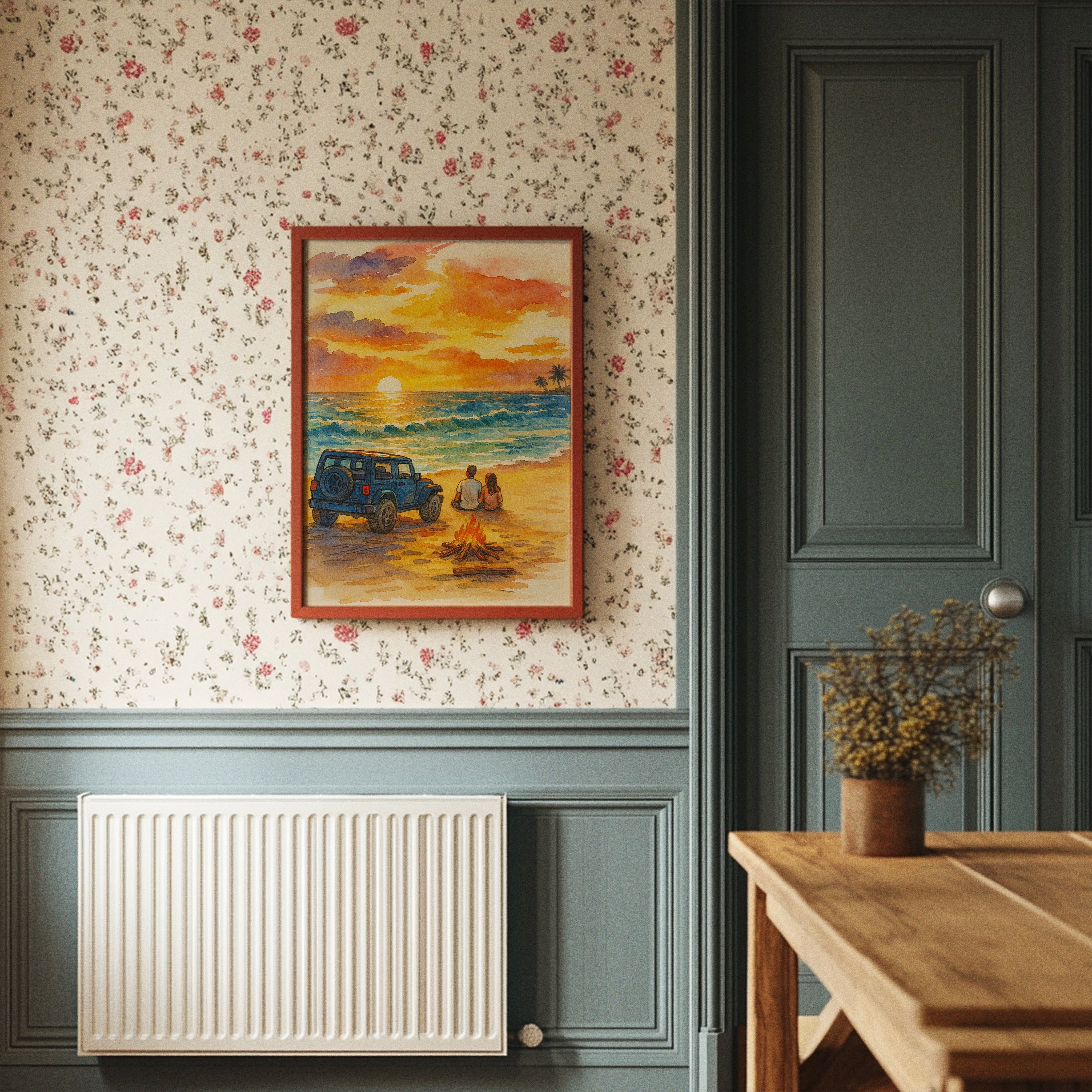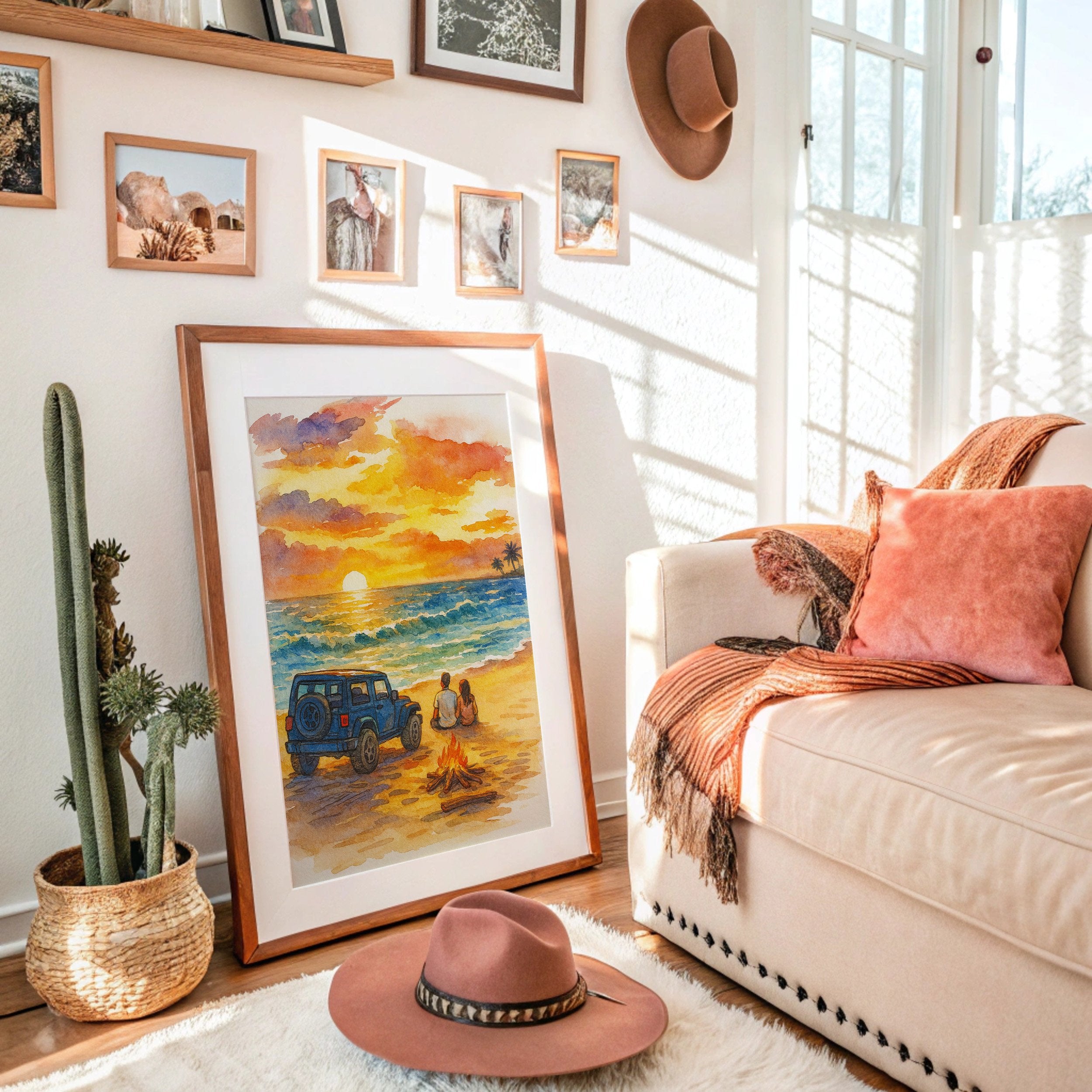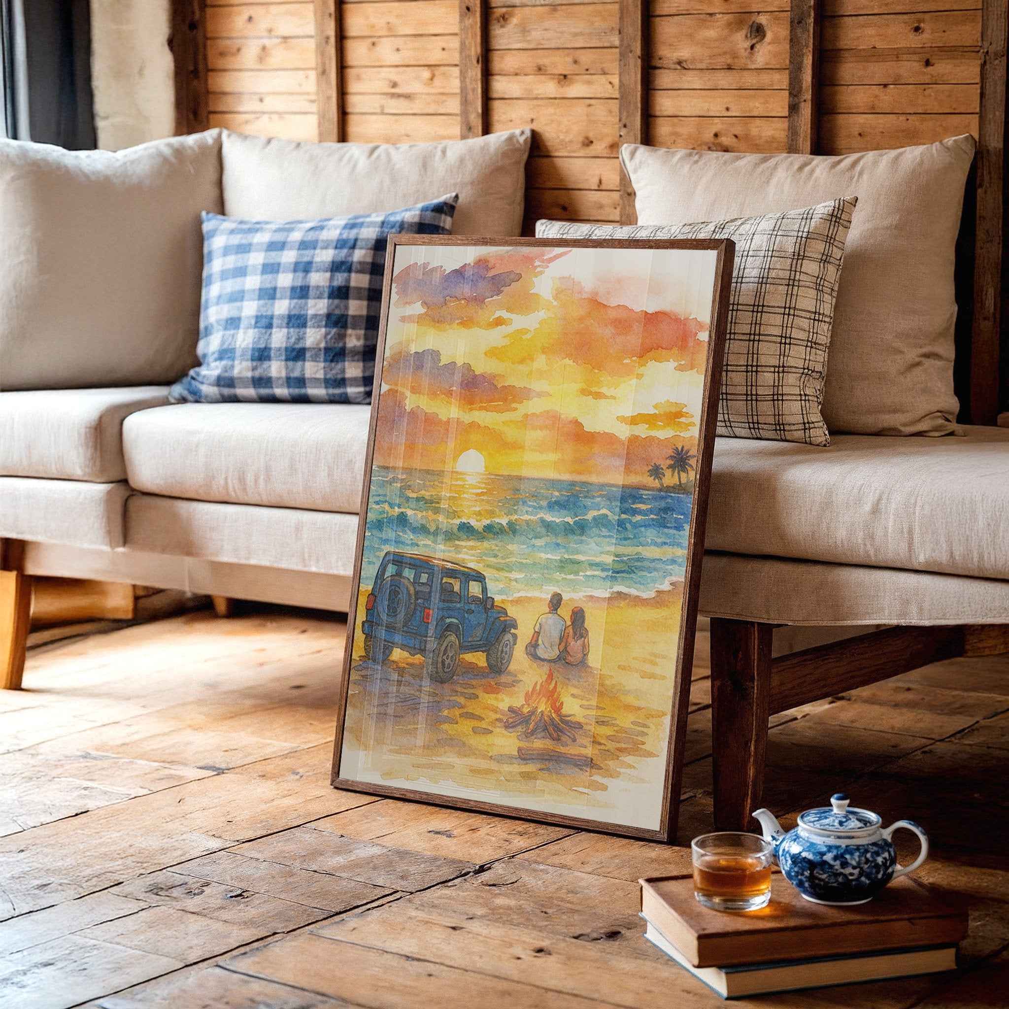 The day melts into liquid gold as two souls share the warmth of a beach bonfire against the canvas of a spectacular sunset. Vibrant oranges and yellows blaze across the watercolor sky, reflecting off turquoise waves that roll gently toward shore. A blue jeep rests nearby, promising adventure beyond the peaceful moment captured between sand and sea. This evocative scene brings coastal charm to rustic living spaces, perfect for creating a nostalgic focal point in beach houses or rooms that yearn for summer's endless promise.