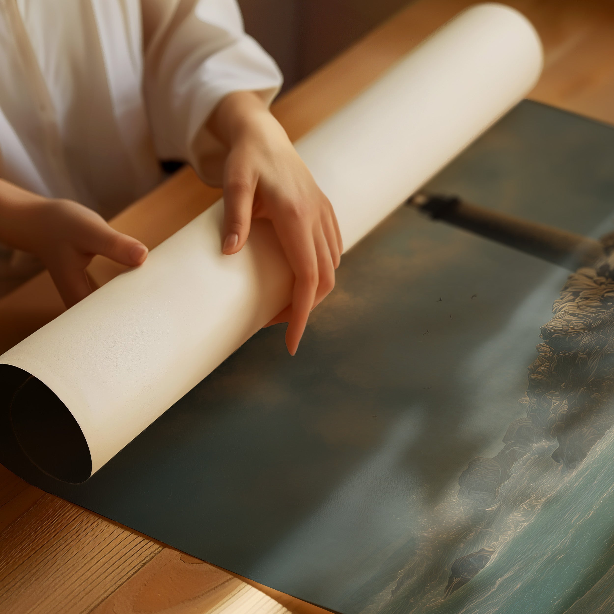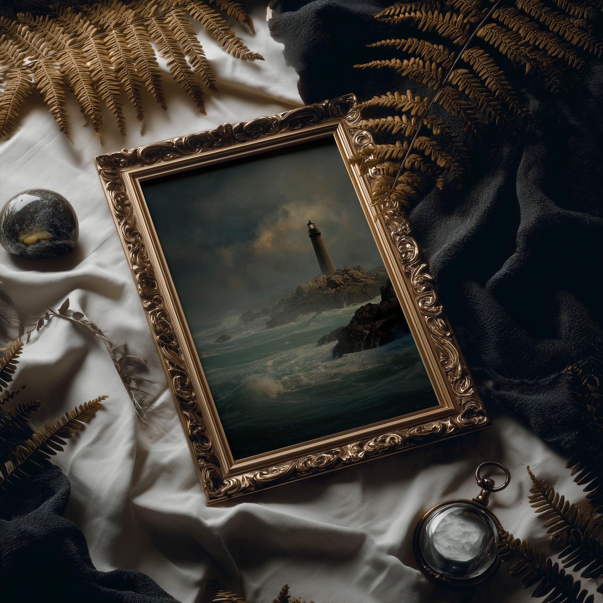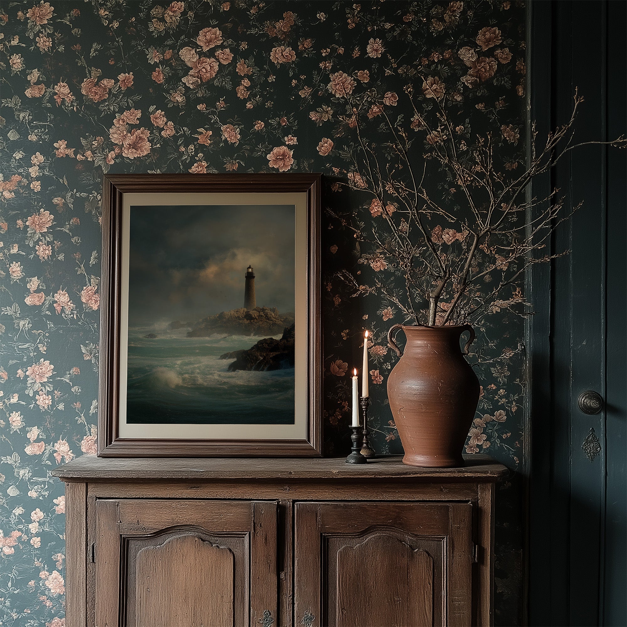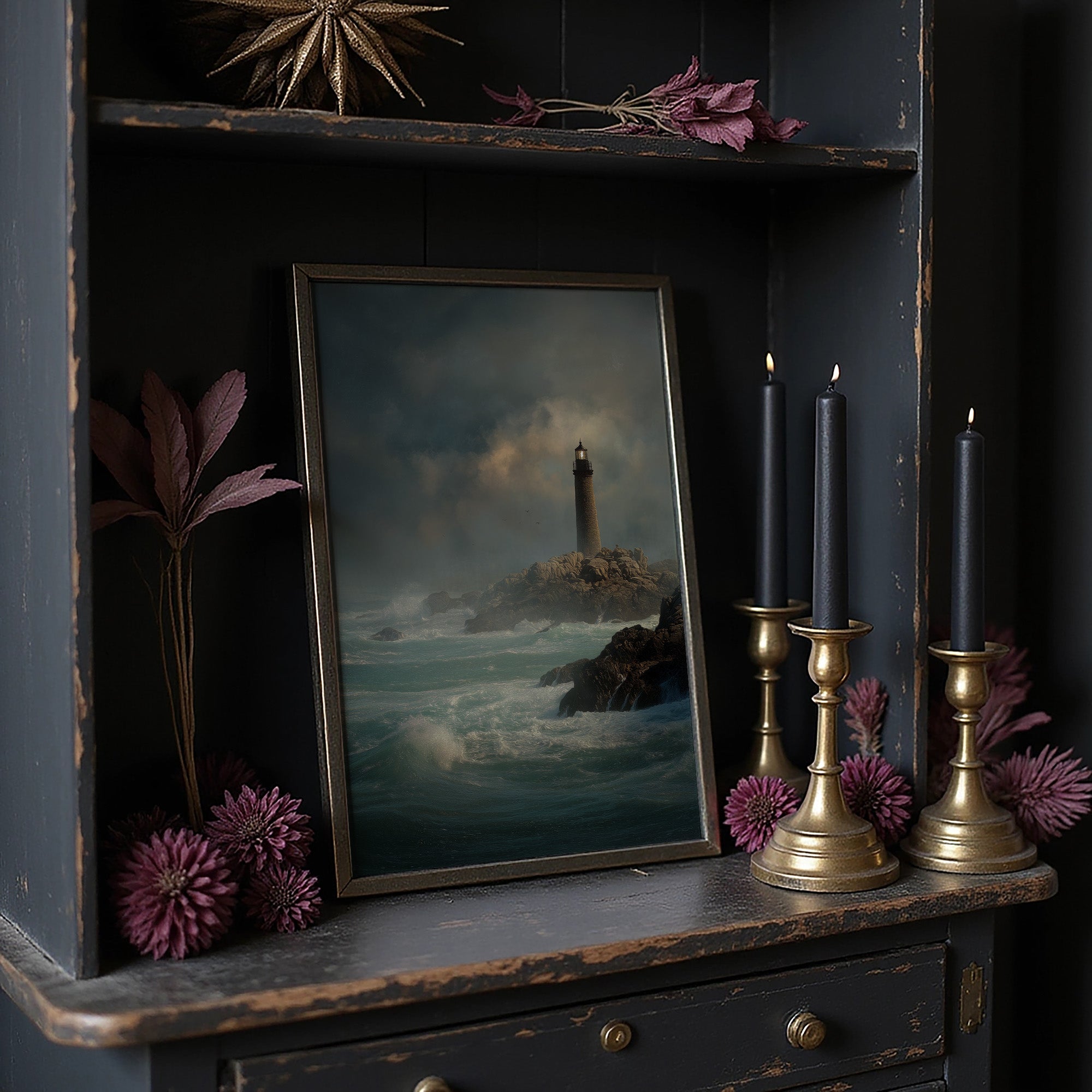 A solitary lighthouse cuts through the gathering storm, its light a defiant spark against the darkening sky. Turbulent waves crash against jagged rocks below, creating a dramatic tension between the steadfast structure and nature's raw power. The moody color palette blends stormy grays and teals with hints of warm light that suggest resilience amid chaos. This piece brings coastal drama into sophisticated interiors, creating a focal point that invites contemplation of strength and solitude.