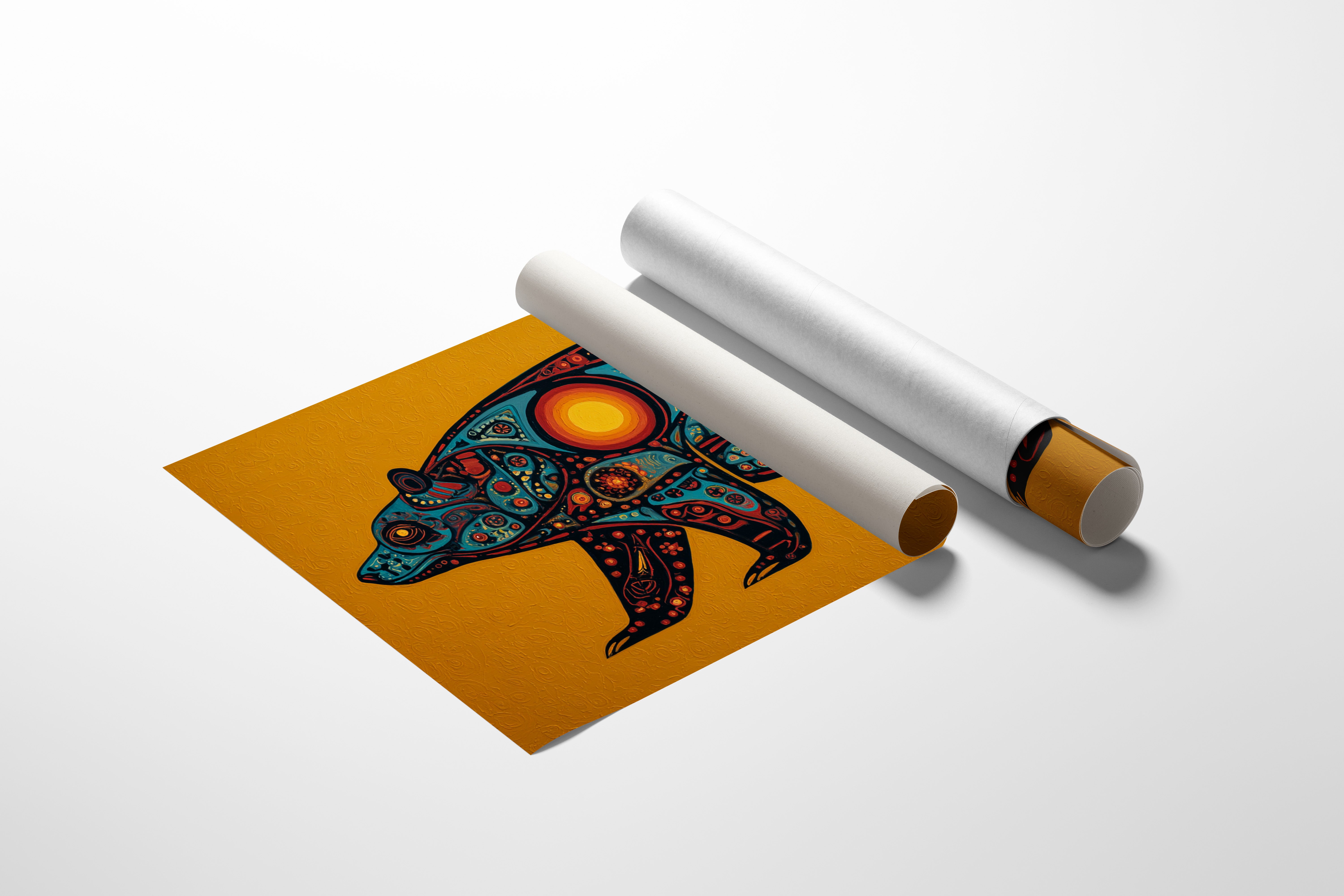 A mystical bear emerges from folkloric depths, its form adorned with intricate patterns that pulse with the energy of ancestral tales. The creature's silhouette holds a brilliant sun within its body, surrounded by a mesmerizing tapestry of turquoise and coral designs that flow like rivers of time. Each geometric pattern and spiral tells its own story, creating a harmonious blend of Native American and contemporary artistic elements. This powerful spirit animal stands against a rich amber background that radiates warmth and wisdom.