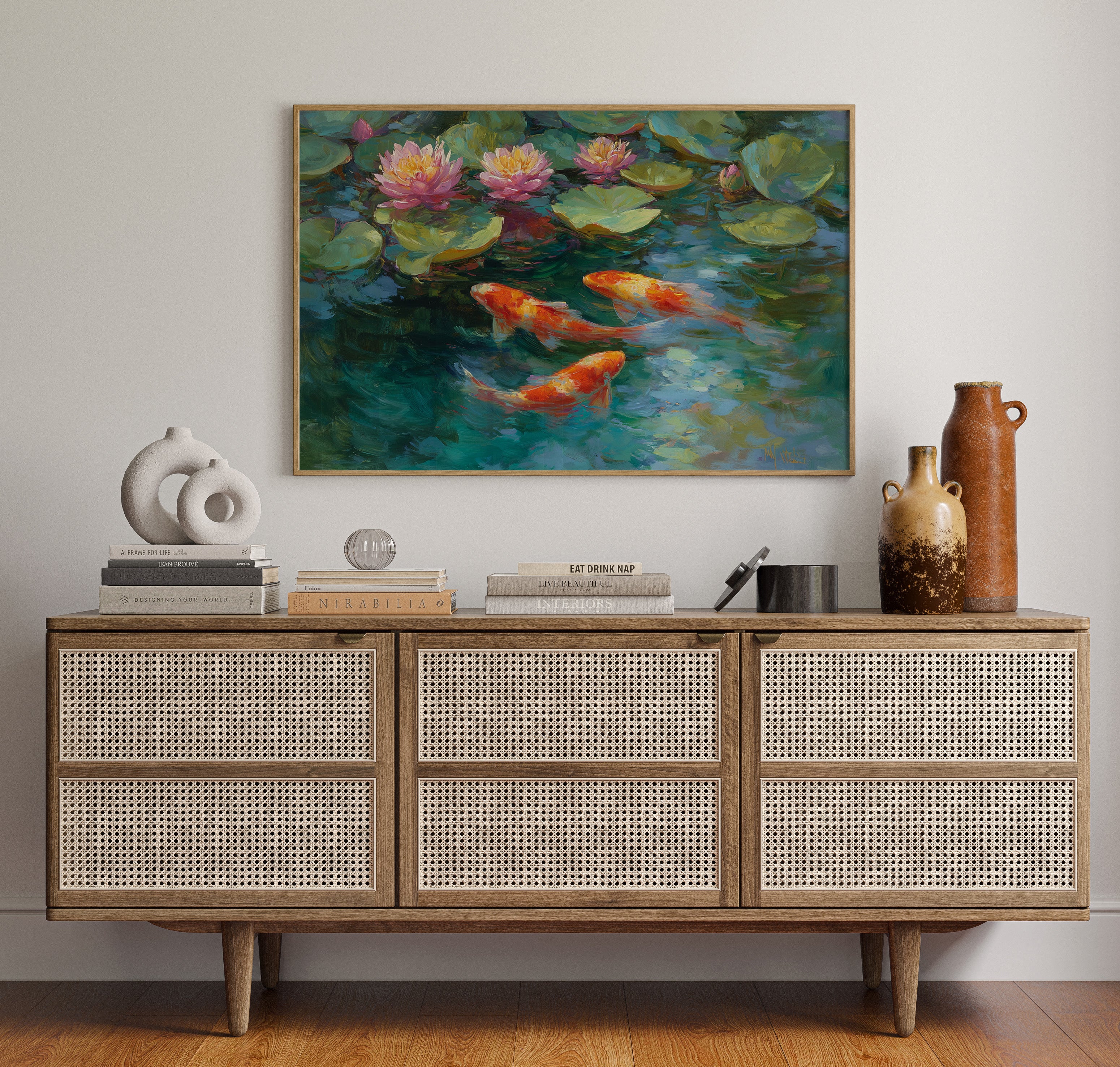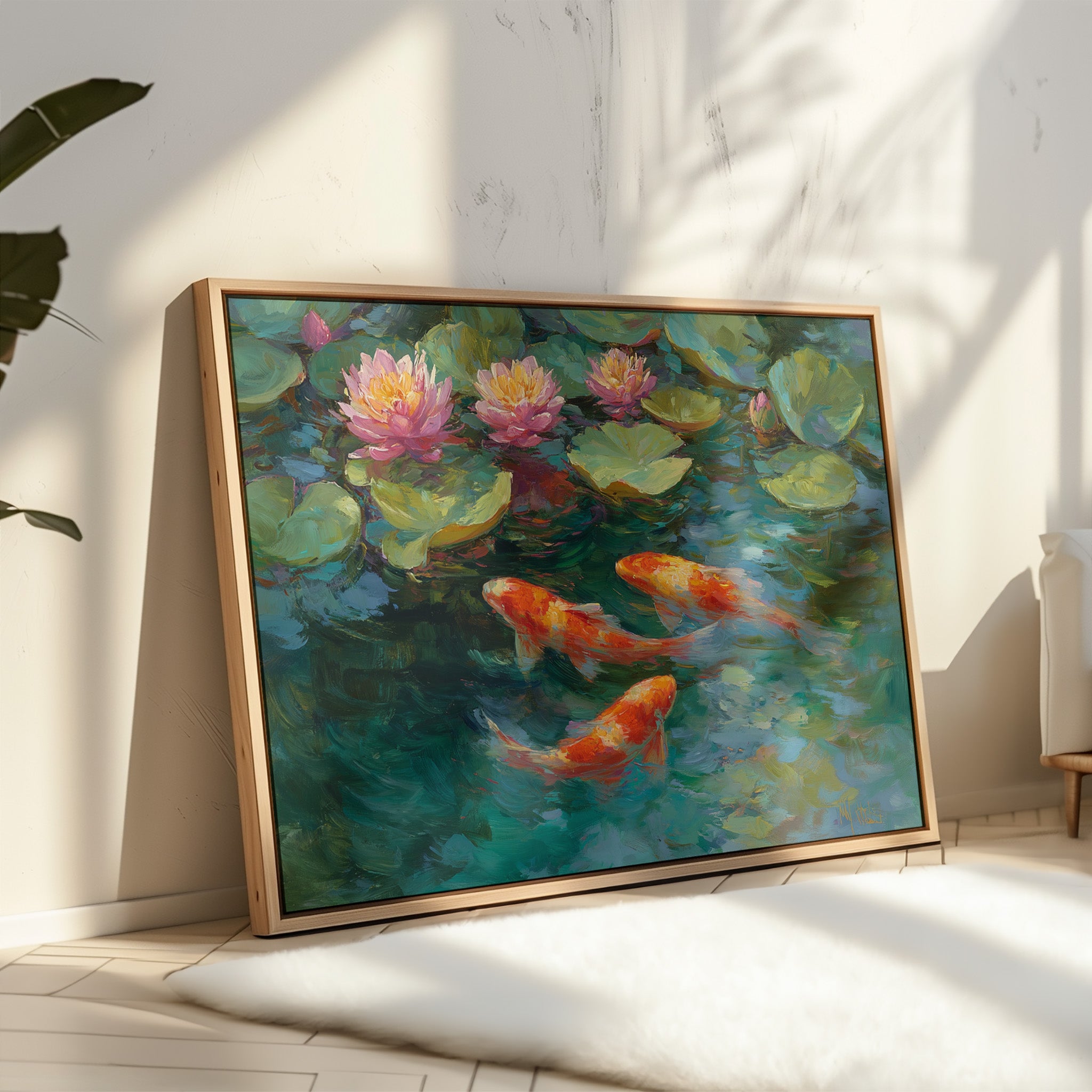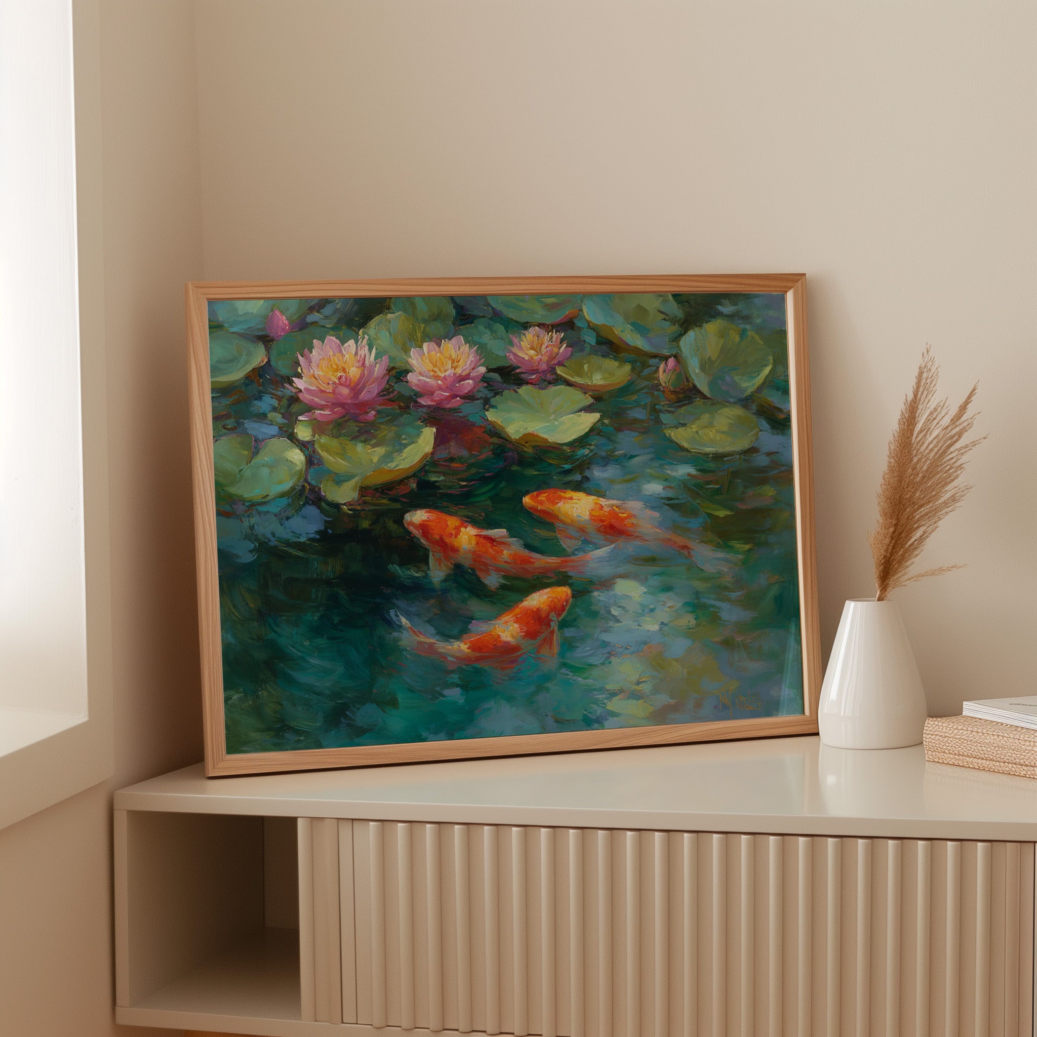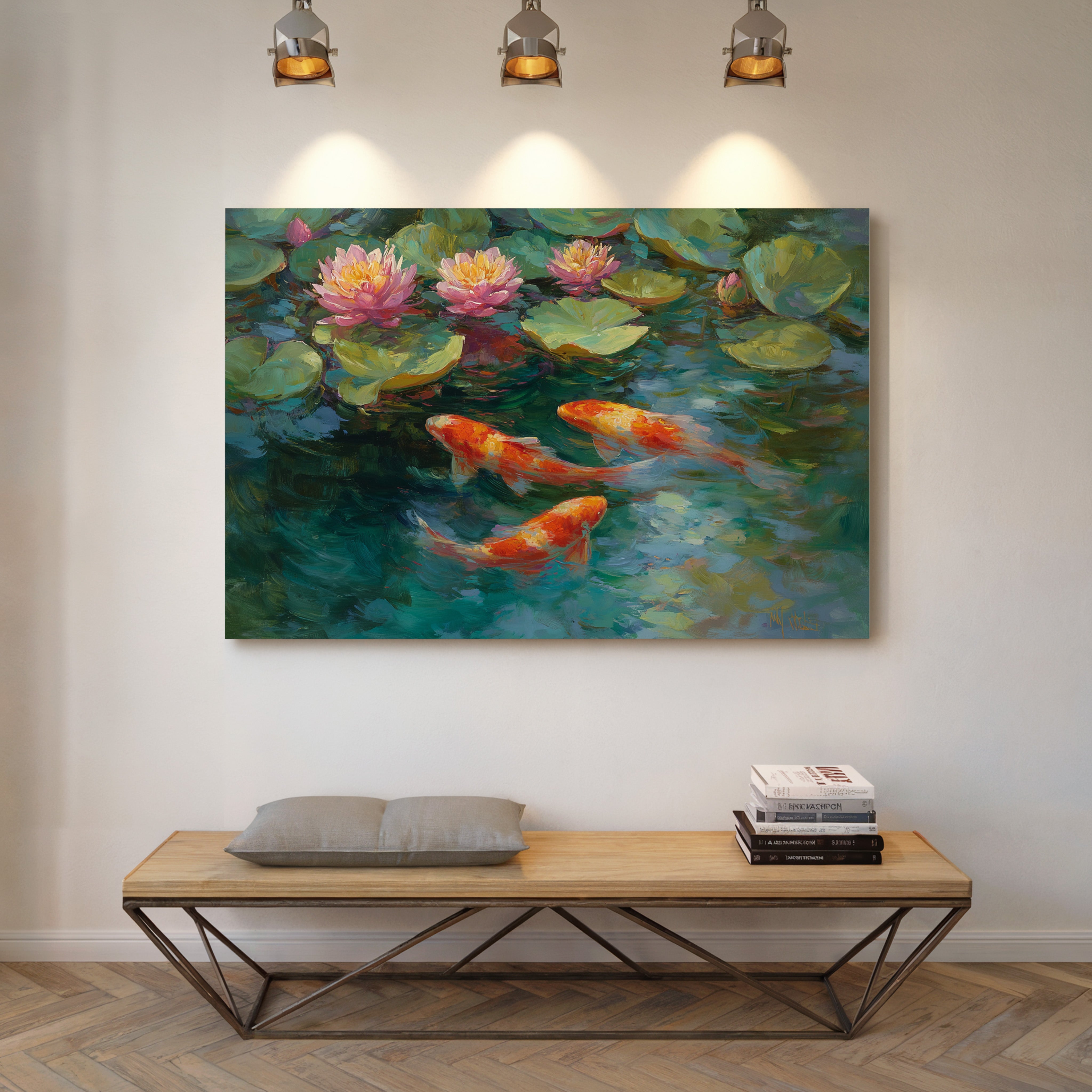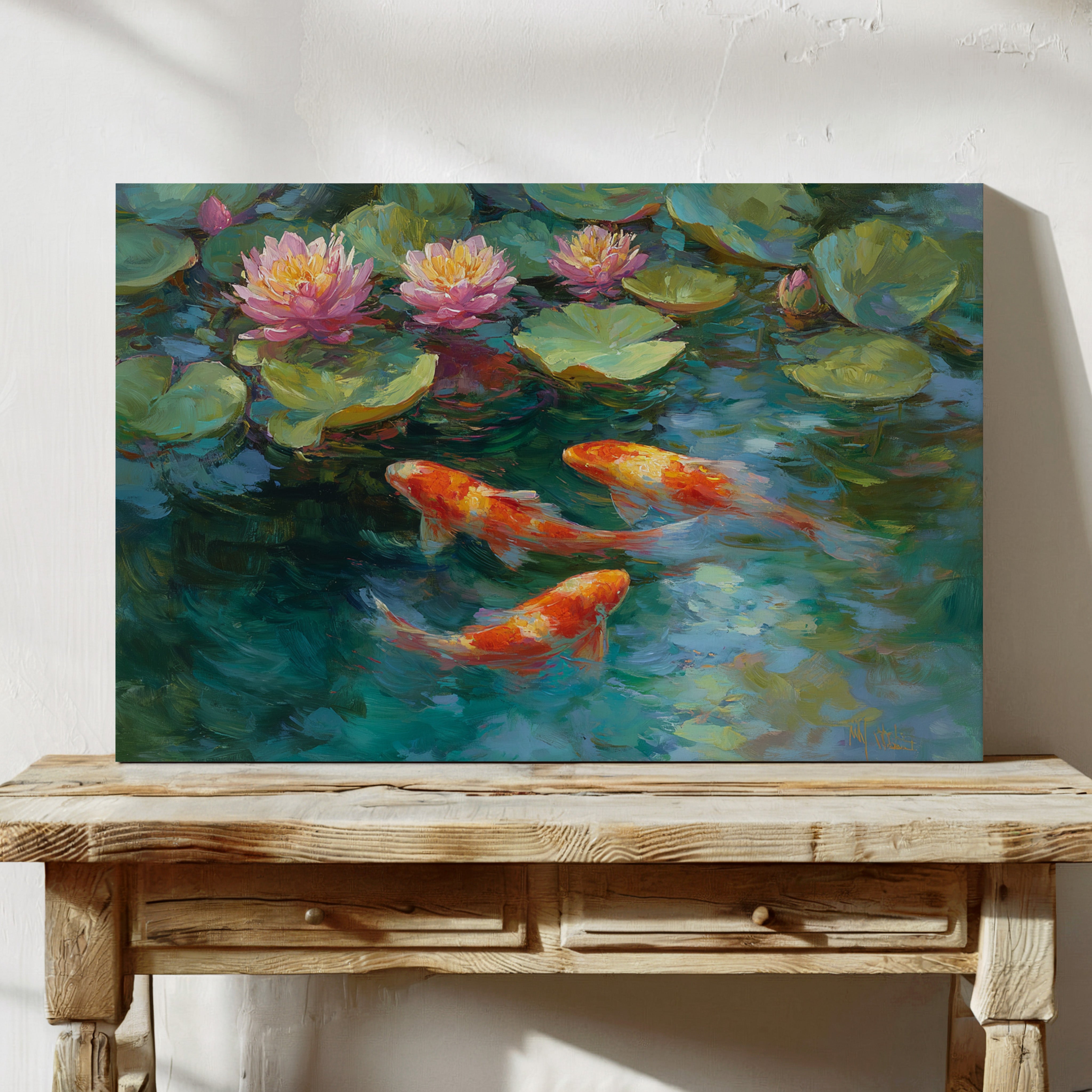 In a tranquil pond, koi glide gracefully beneath the vibrant lily pads, their colors swirling like living brushstrokes on water. This piece embodies the essence of artisanal beauty, where nature and artistry intertwine. The rich oranges and serene greens create a harmonious palette, inviting viewers into a world of serenity and vitality. Perfect for a serene space, this artwork adds a peaceful ambiance to any room, inviting reflection and calm.