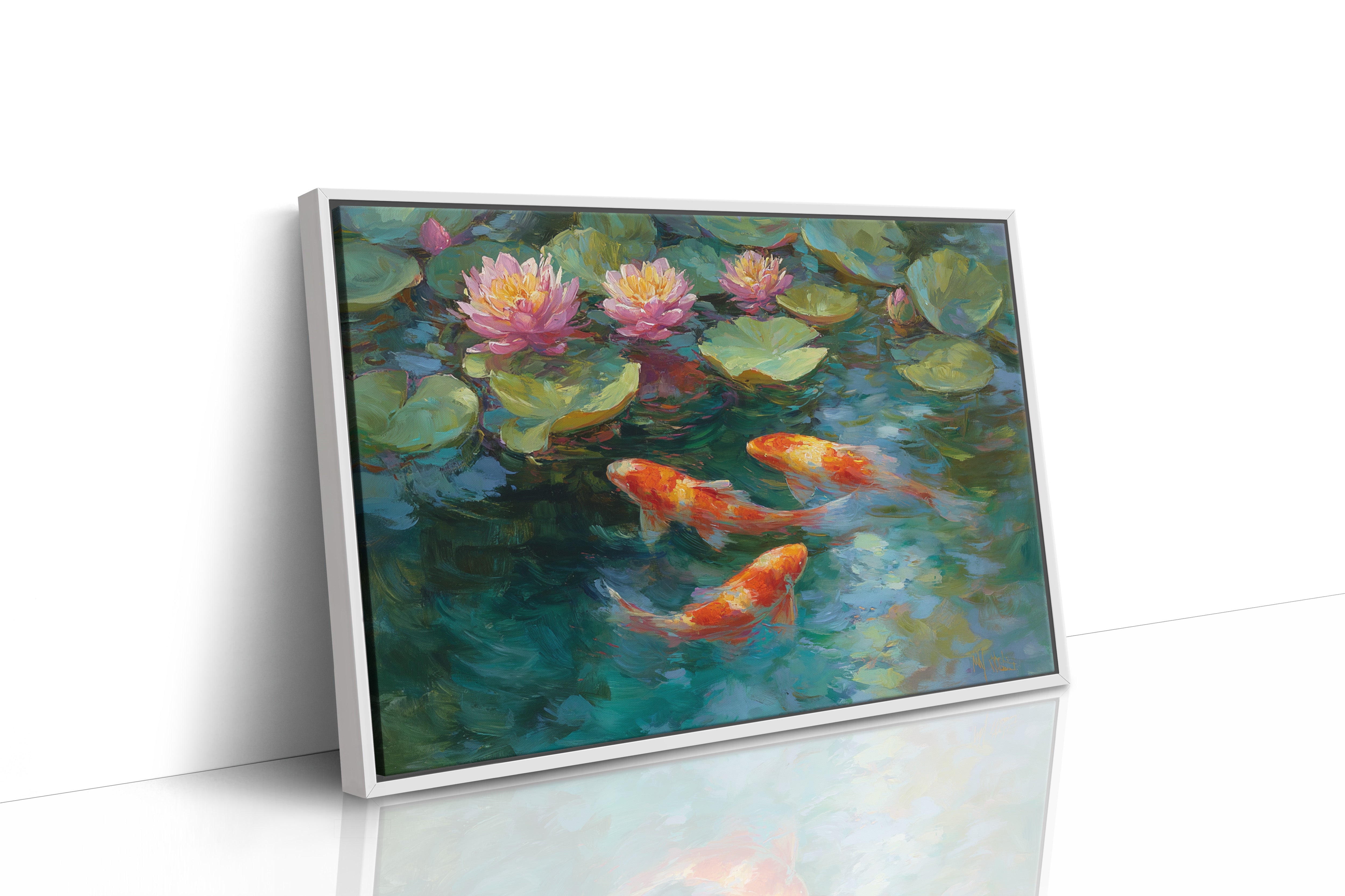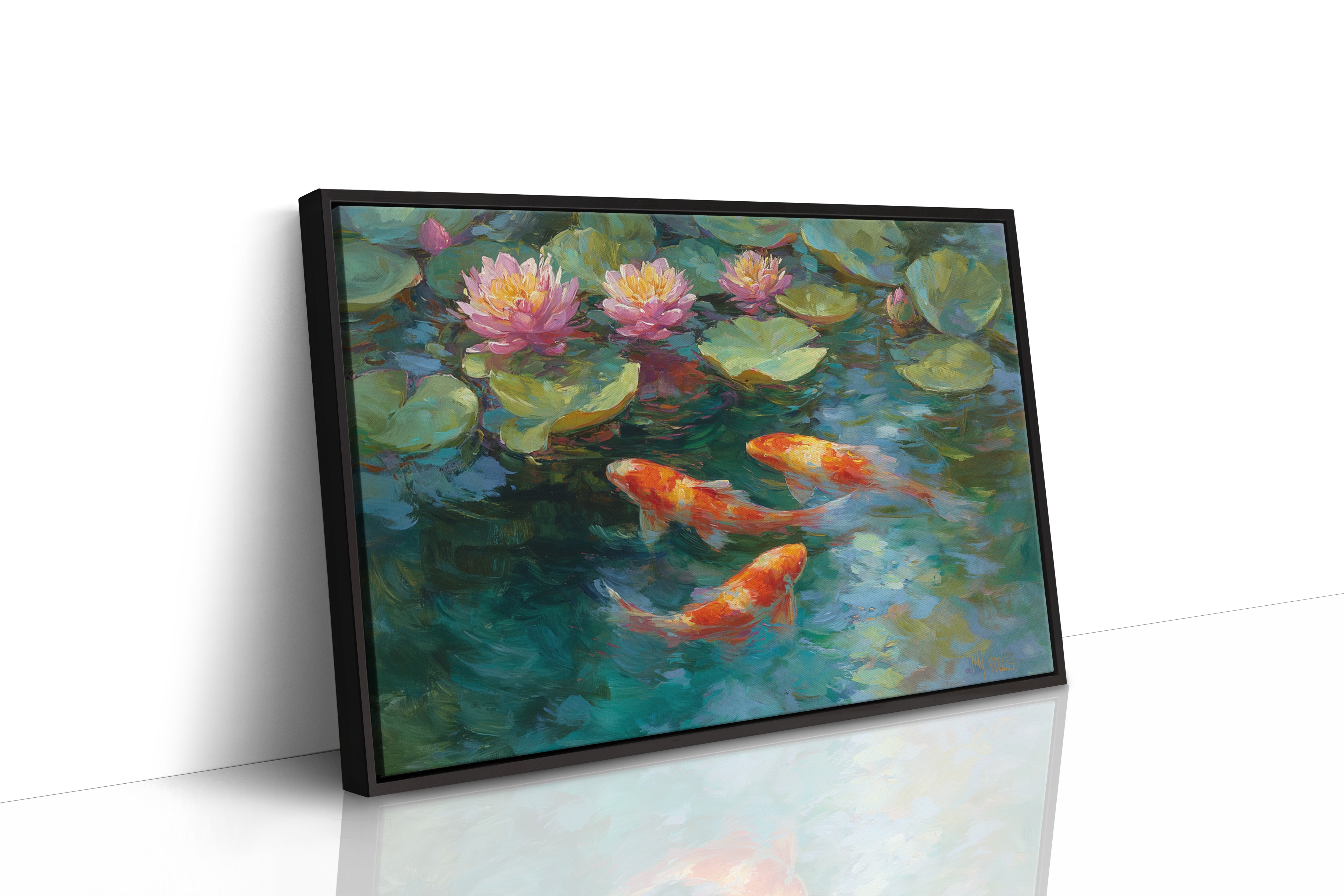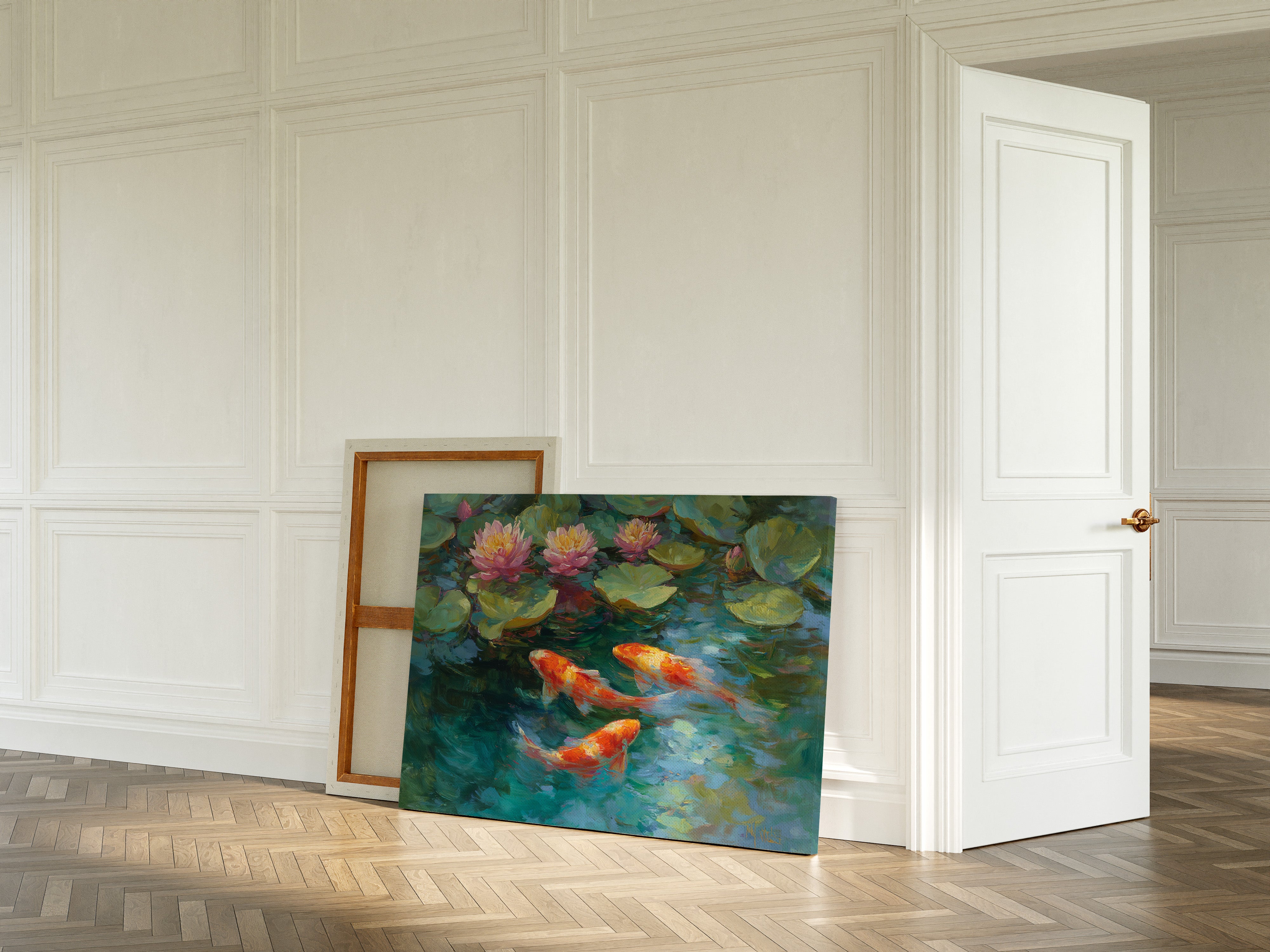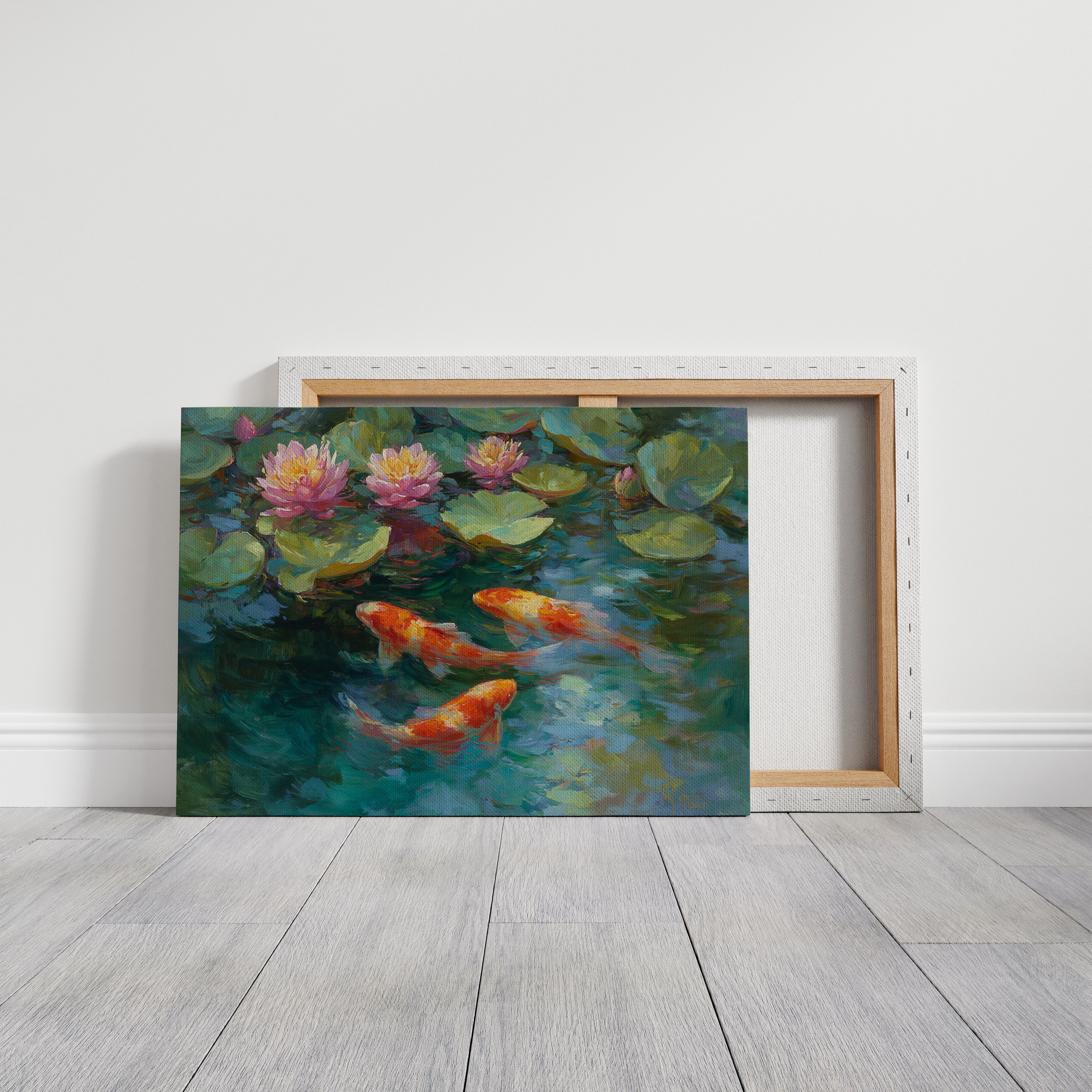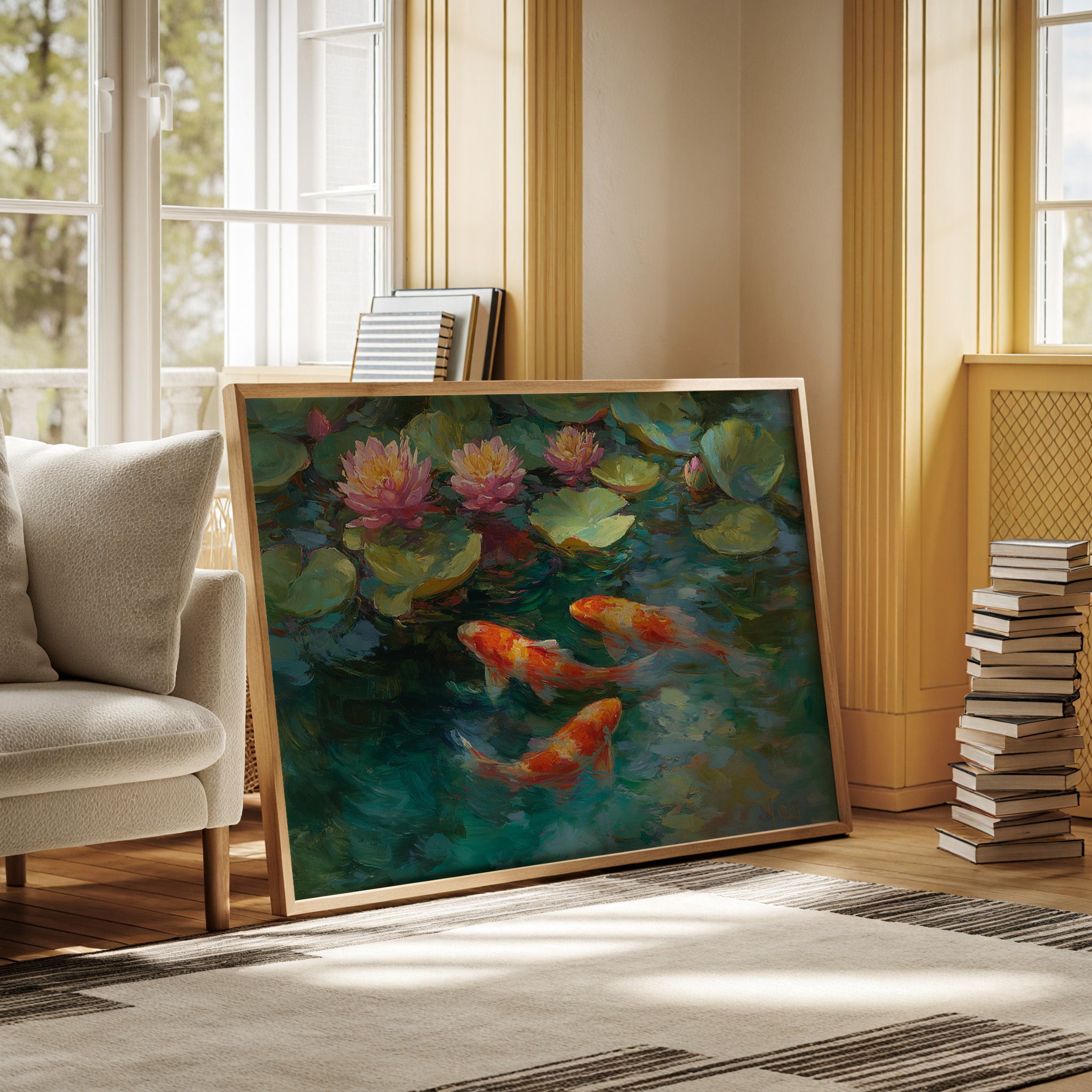 In a tranquil pond, koi glide gracefully beneath the vibrant lily pads, their colors swirling like living brushstrokes on water. This piece embodies the essence of artisanal beauty, where nature and artistry intertwine. The rich oranges and serene greens create a harmonious palette, inviting viewers into a world of serenity and vitality. Perfect for a serene space, this artwork adds a peaceful ambiance to any room, inviting reflection and calm.