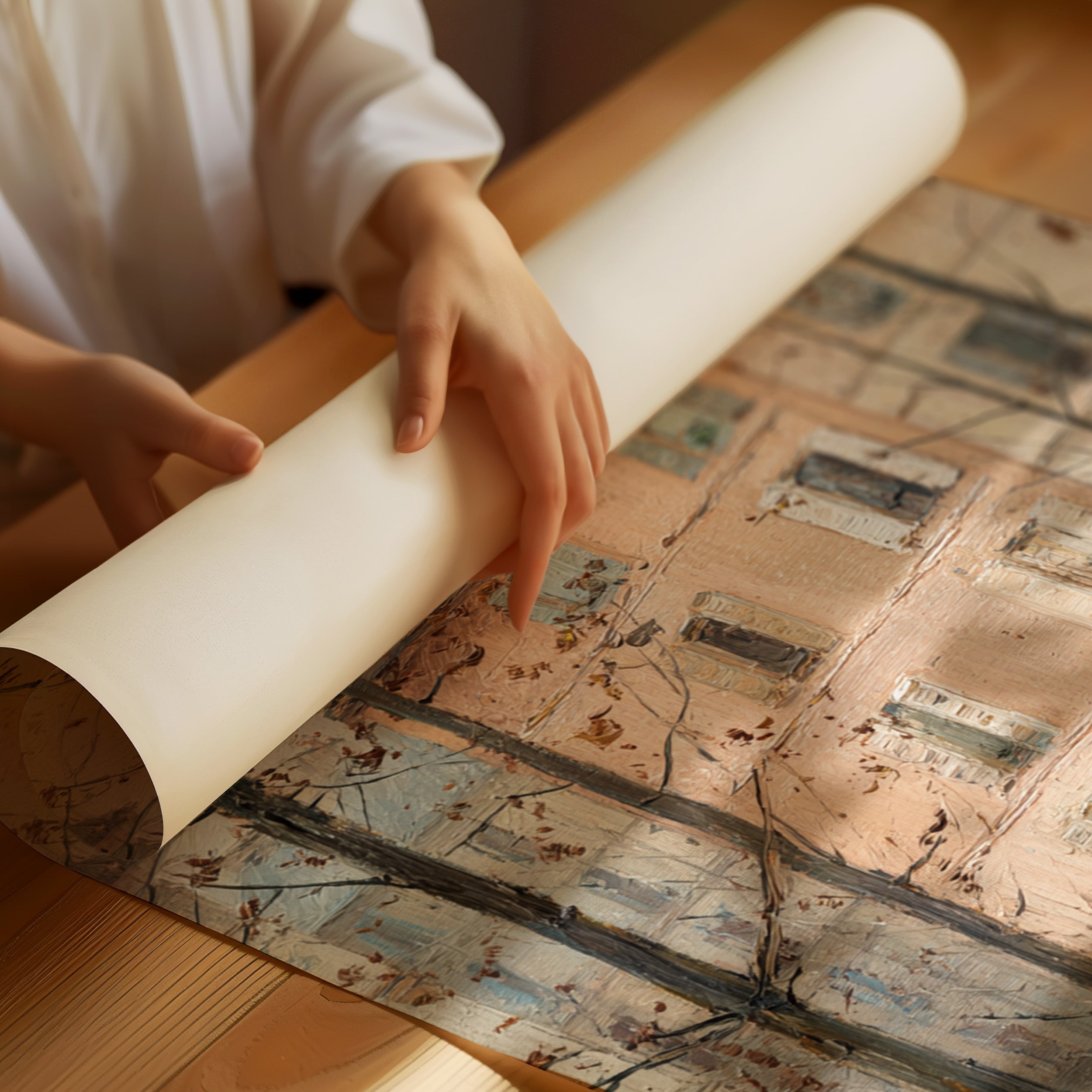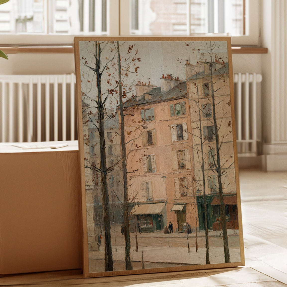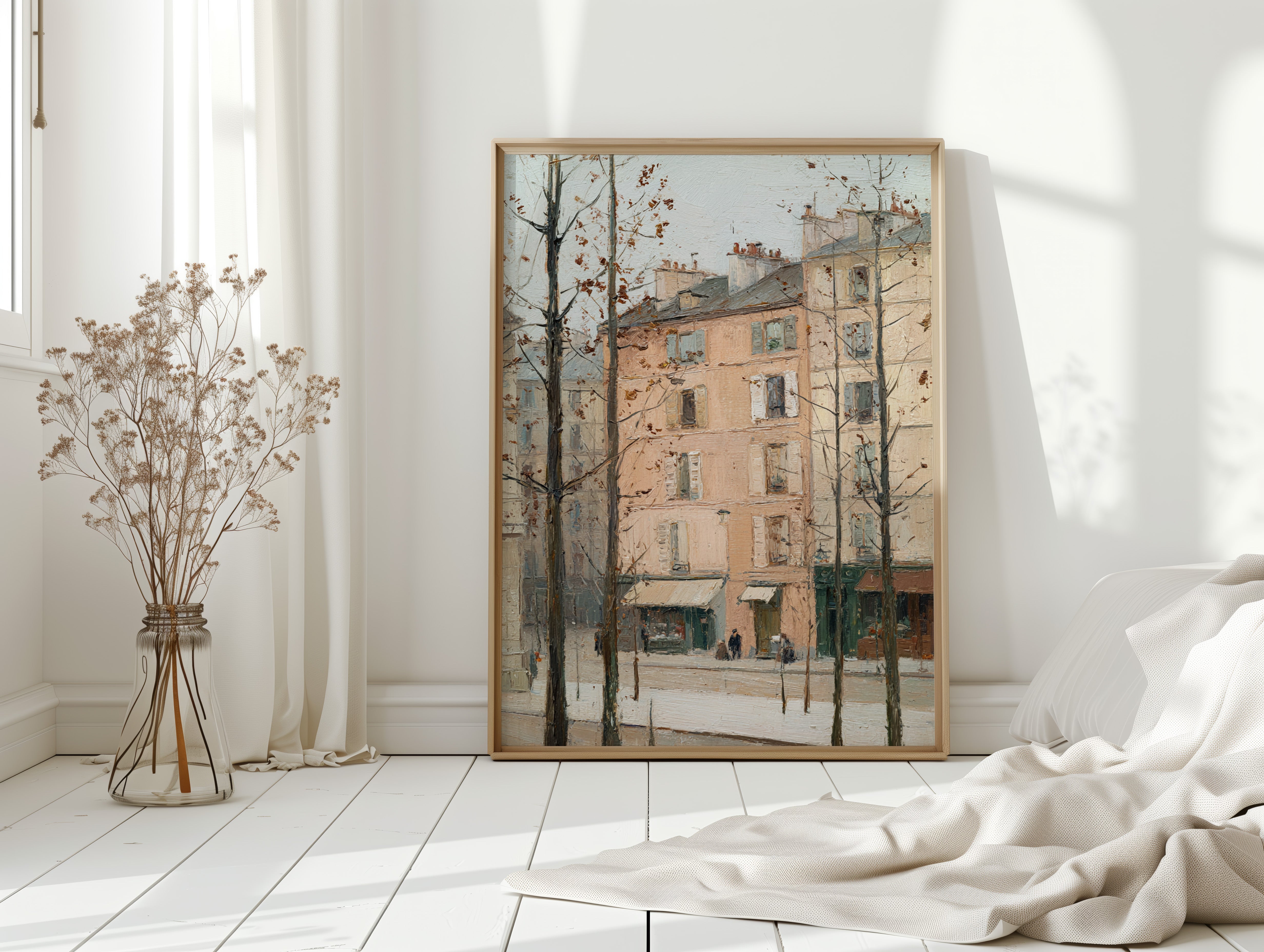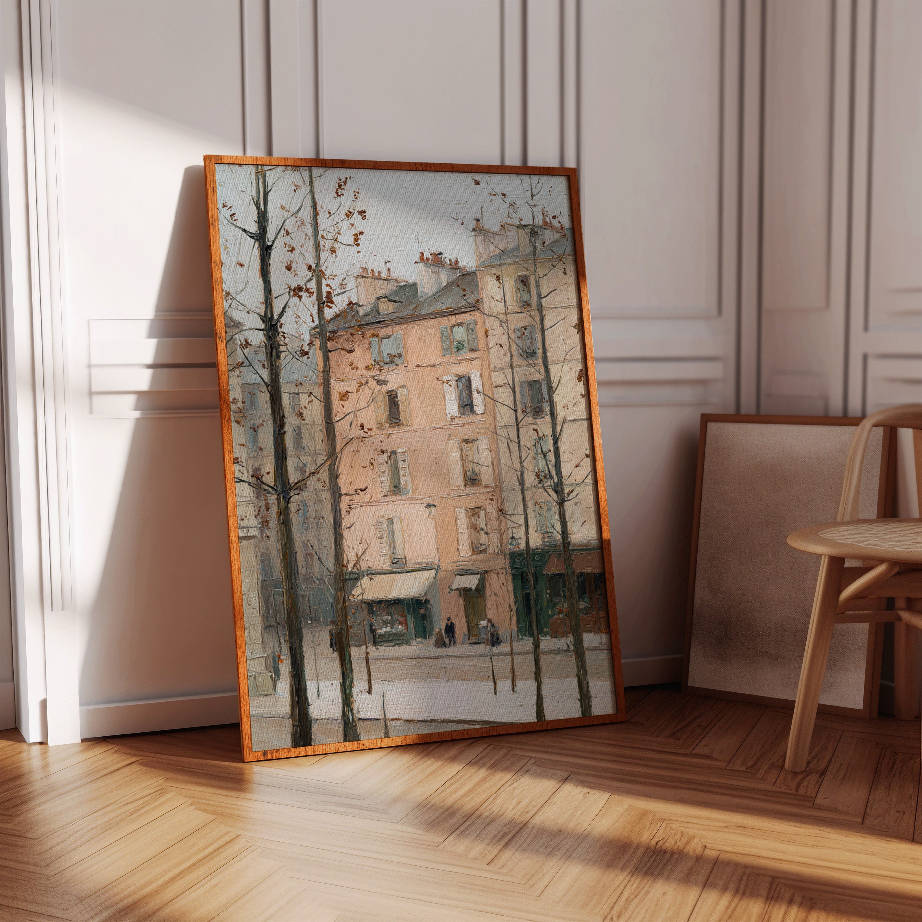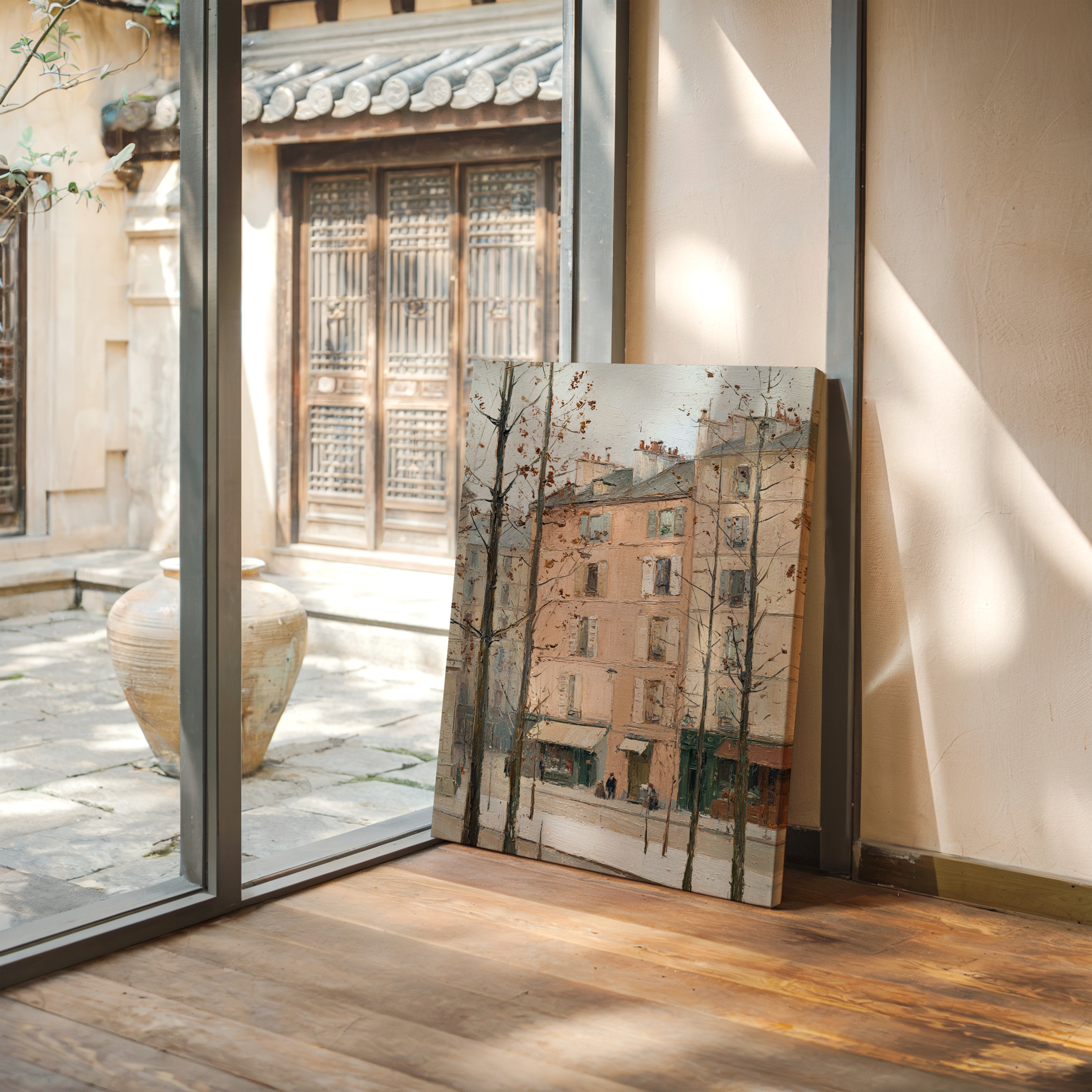 In the gentle embrace of an autumn morning, muted hues play across the façades of quaint buildings, whispering stories of lives lived within. This piece embodies the artisanal spirit, celebrating the beauty of everyday encounters. Textured brushstrokes evoke a sense of warmth, while the soft light bathes the scene in a nostalgic glow, as passersby wander beneath the skeletal trees, their laughter mingling with the rustle of leaves. Perfect for a cozy reading nook or a welcoming foyer, this art invites you to pause and reflect on the simple joys of life.