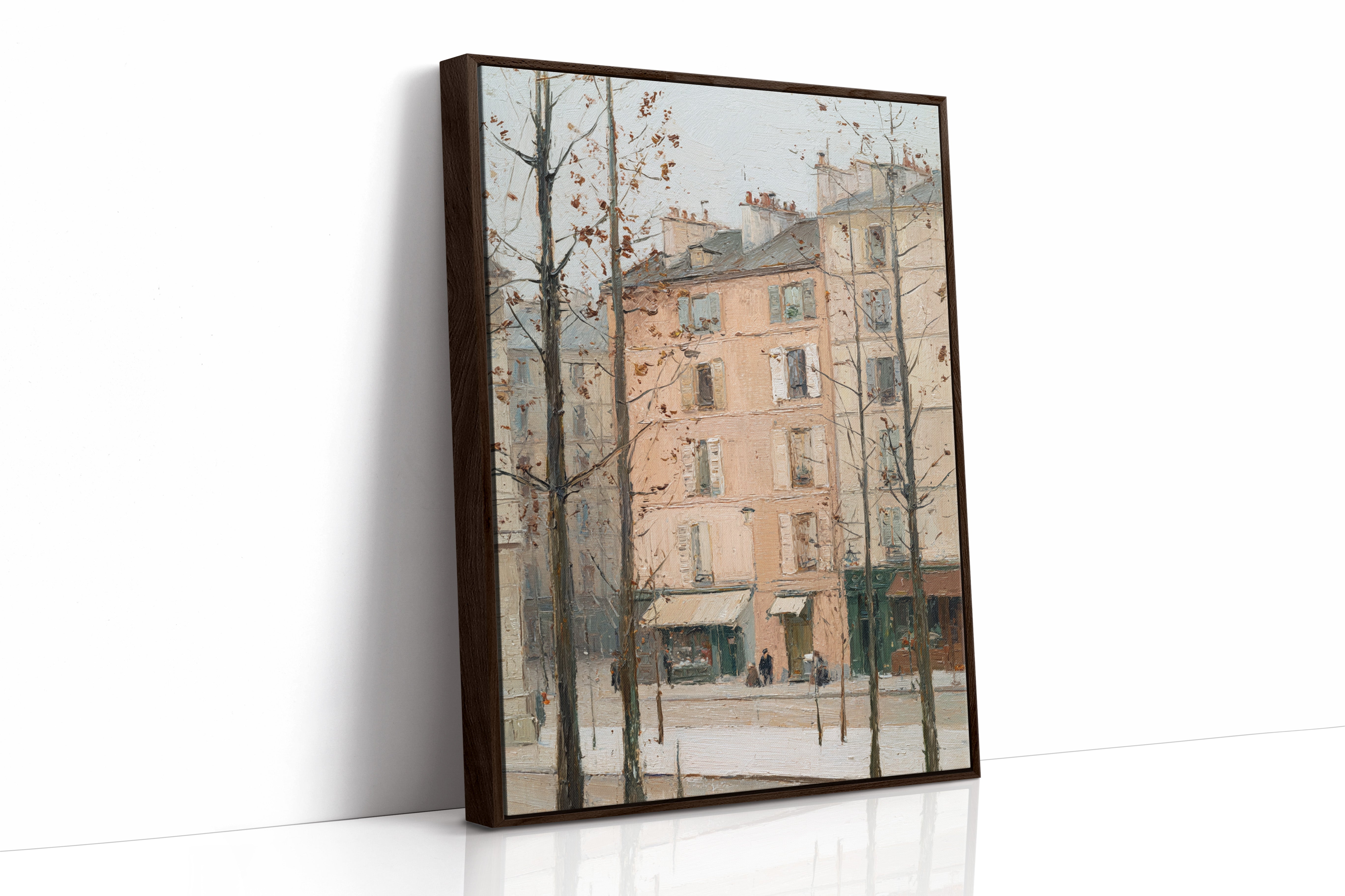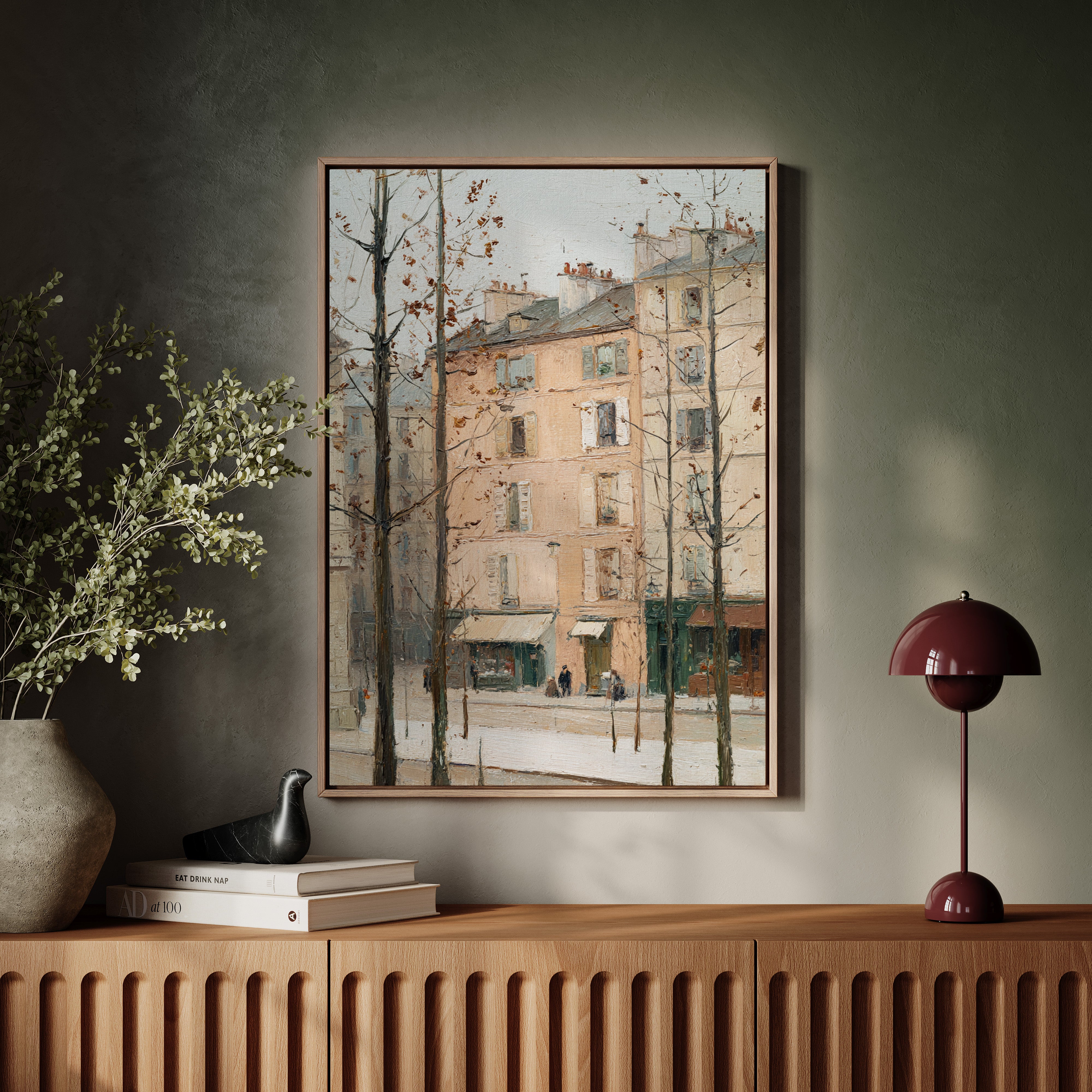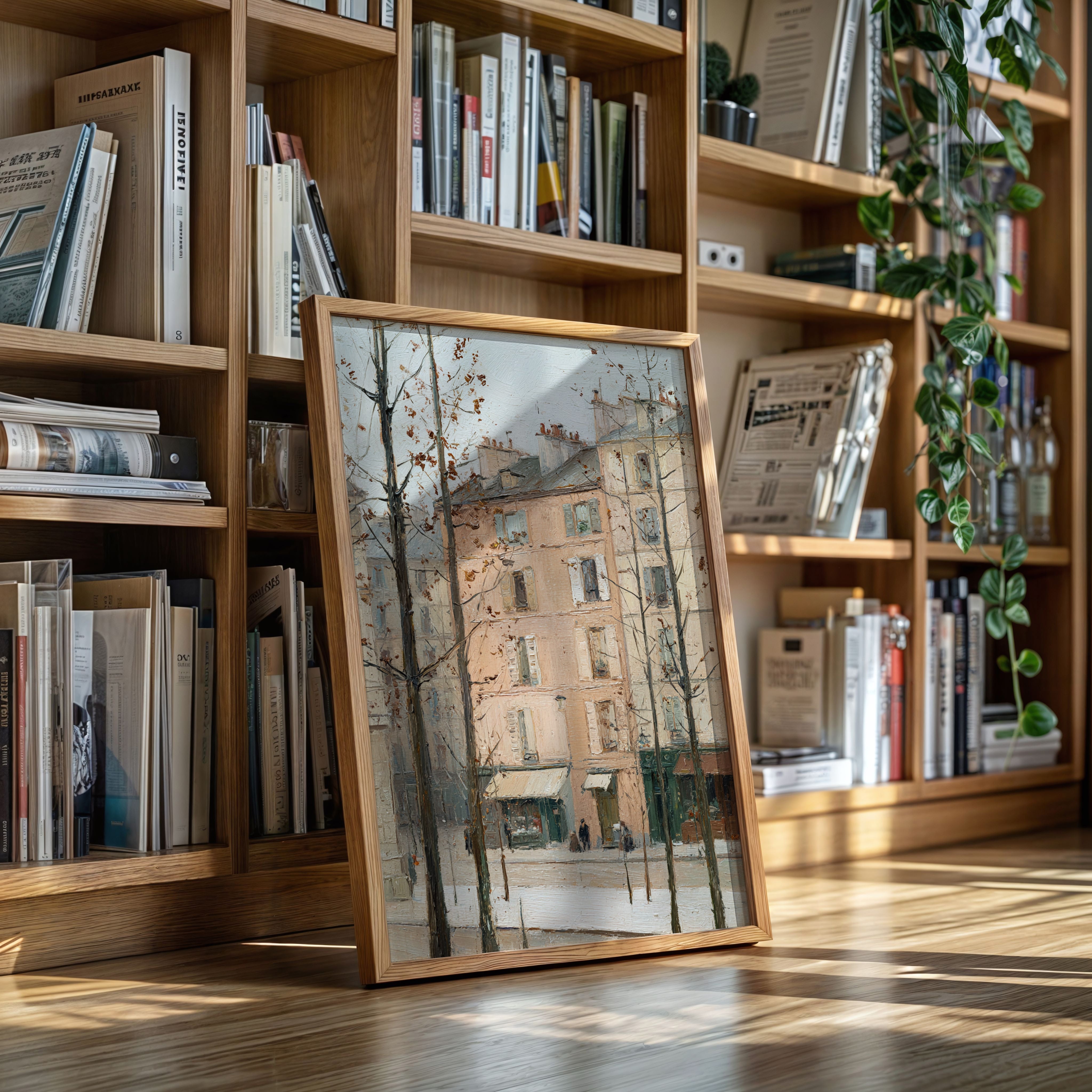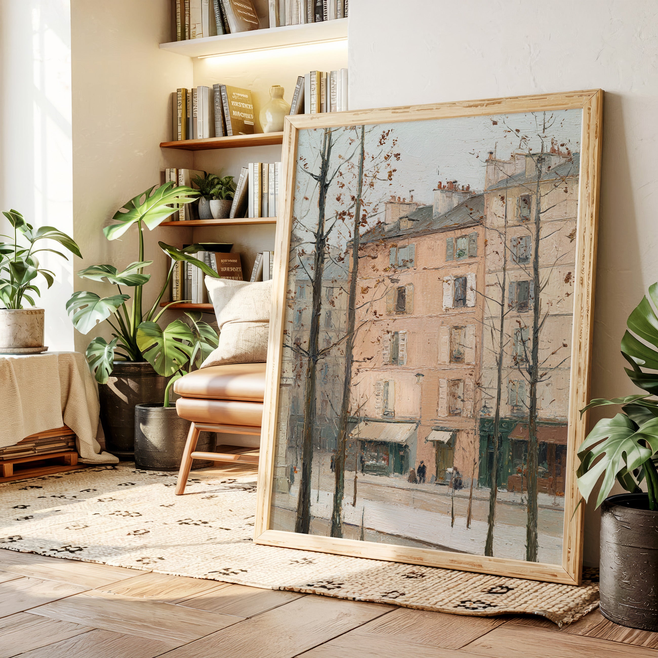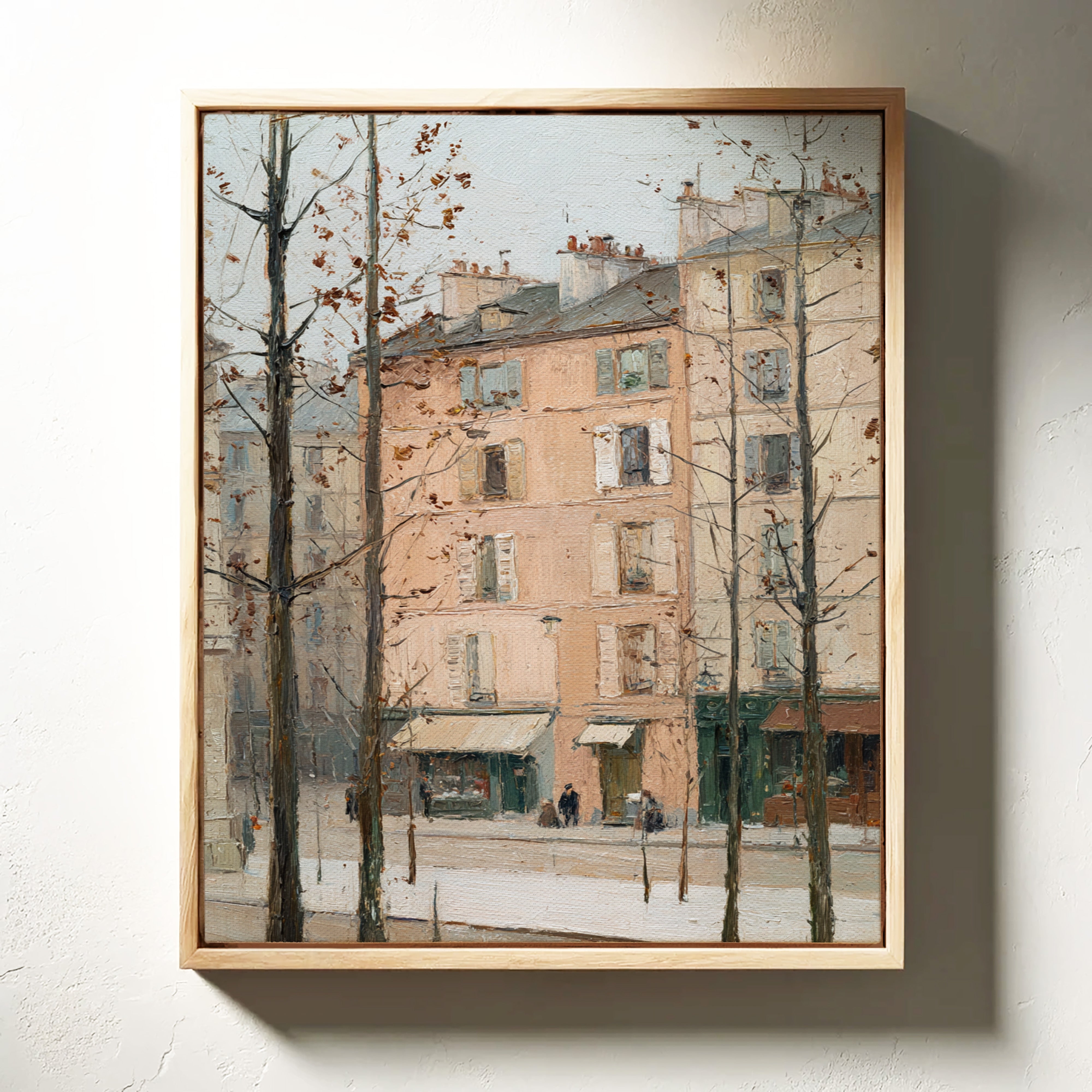 In the gentle embrace of an autumn morning, muted hues play across the façades of quaint buildings, whispering stories of lives lived within. This piece embodies the artisanal spirit, celebrating the beauty of everyday encounters. Textured brushstrokes evoke a sense of warmth, while the soft light bathes the scene in a nostalgic glow, as passersby wander beneath the skeletal trees, their laughter mingling with the rustle of leaves. Perfect for a cozy reading nook or a welcoming foyer, this art invites you to pause and reflect on the simple joys of life.