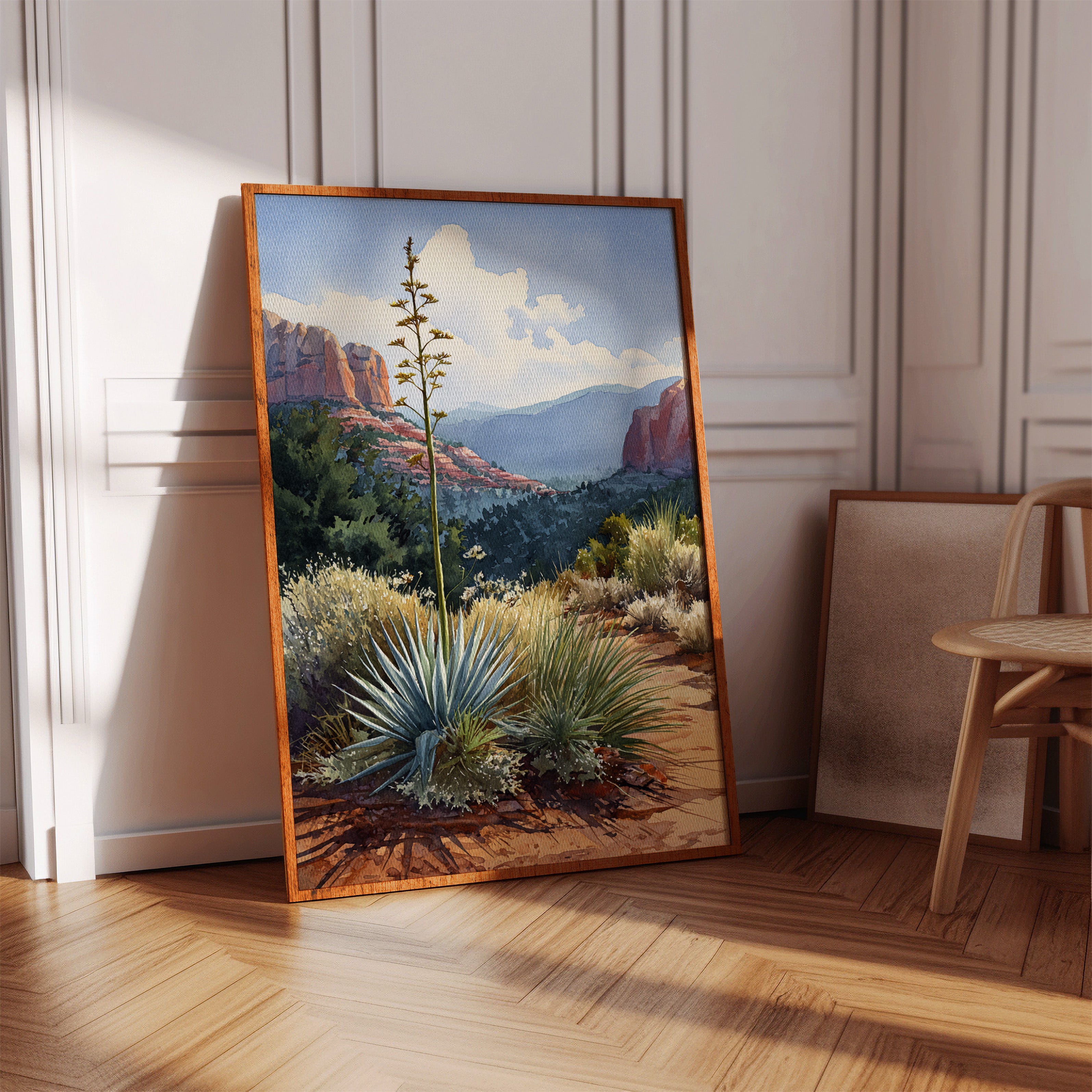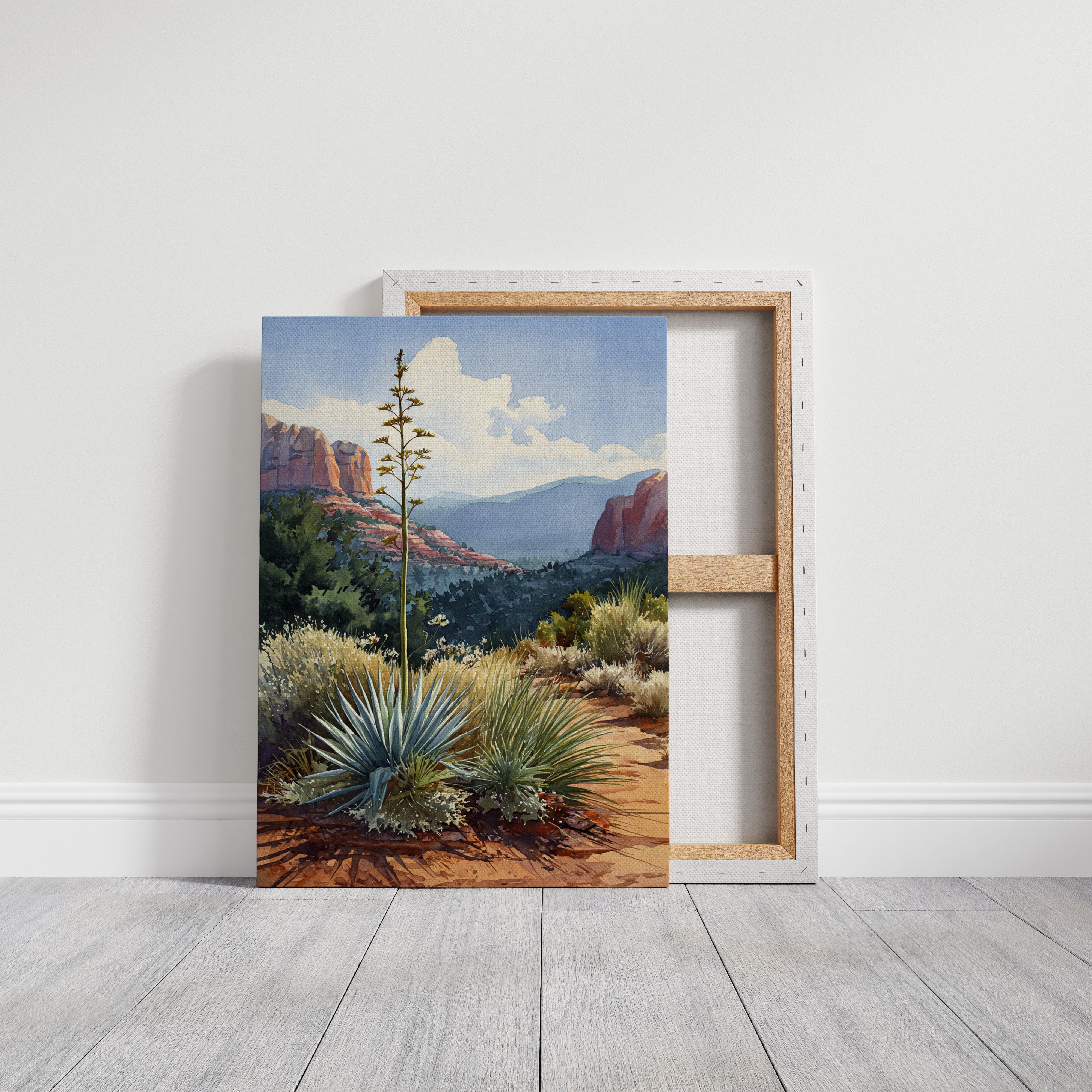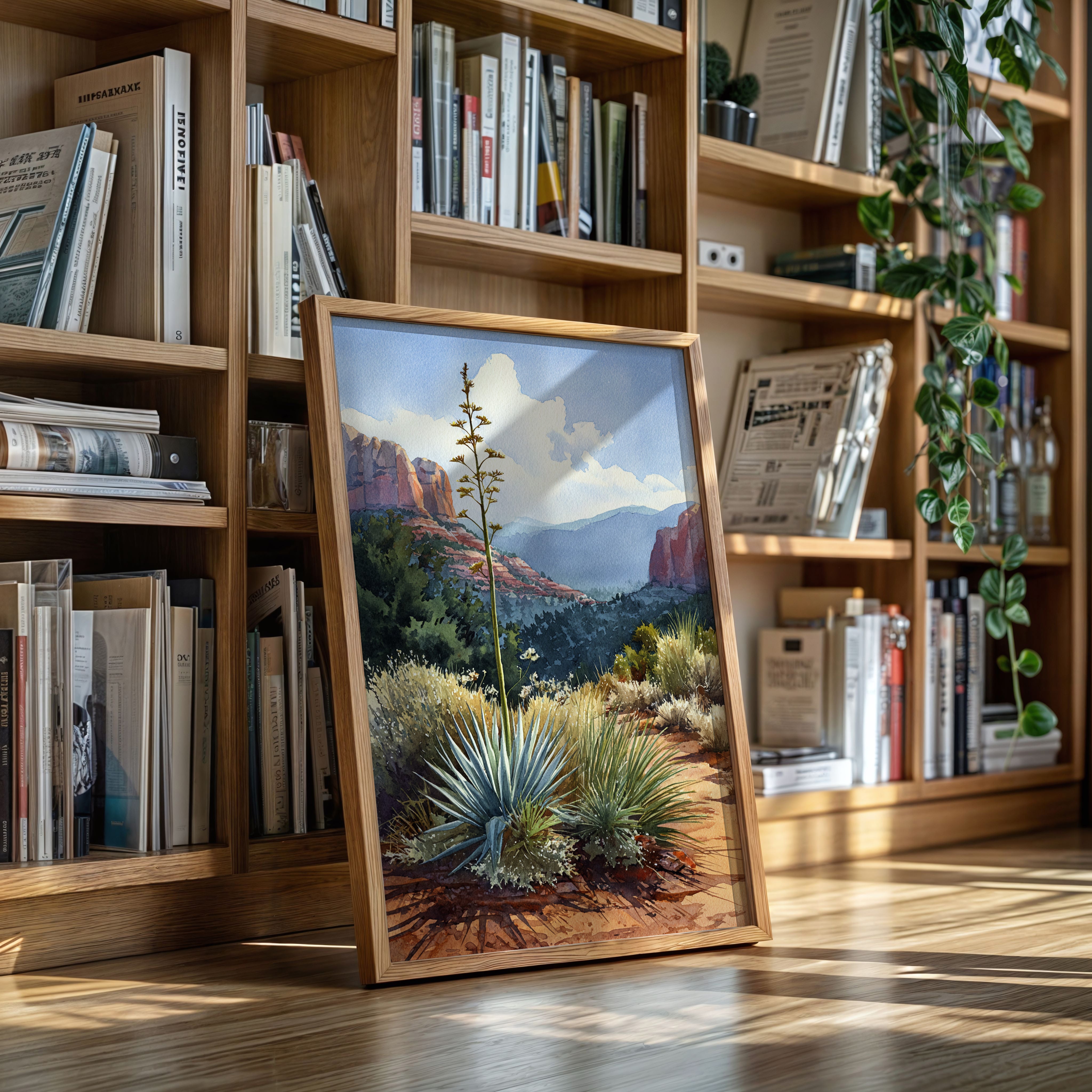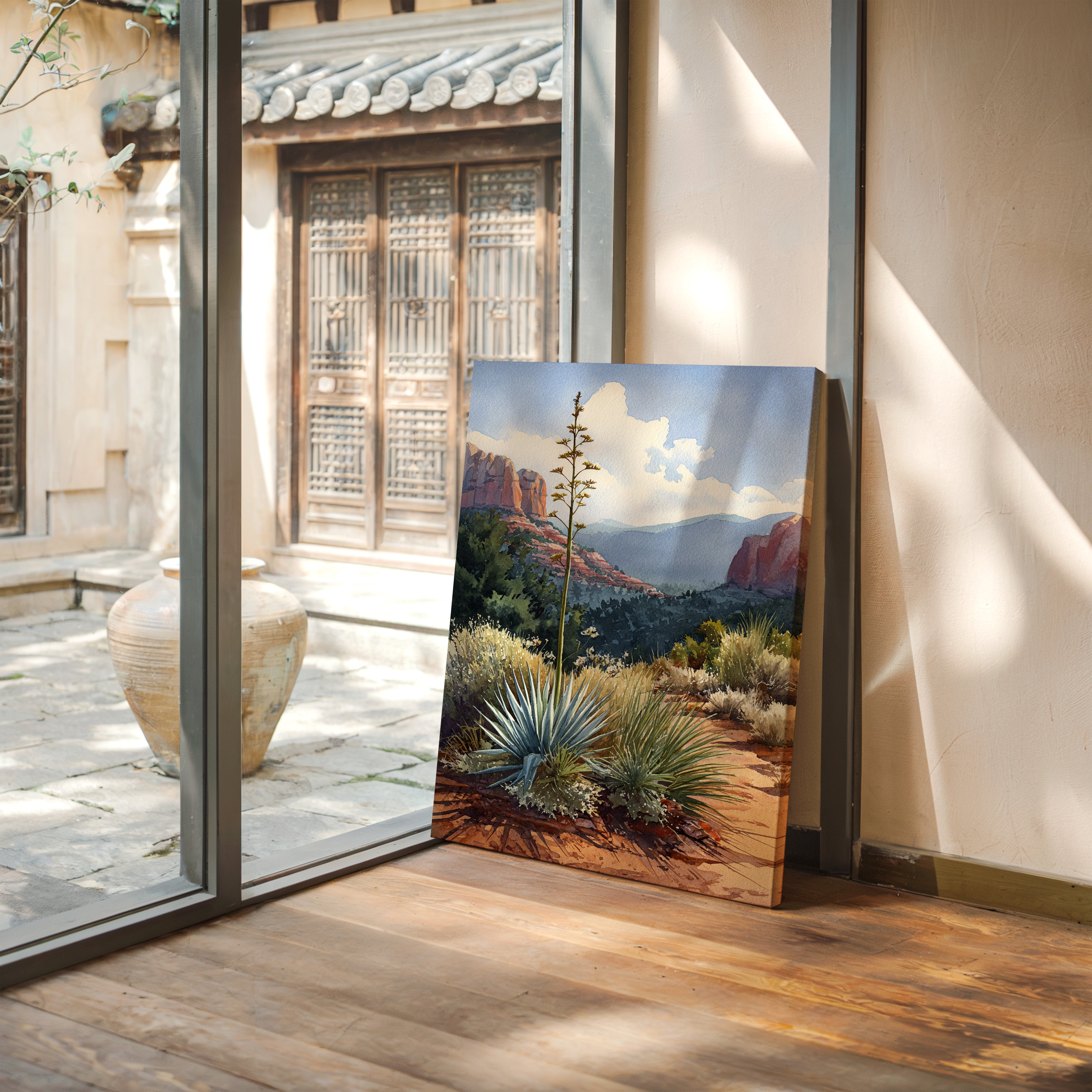 The rich textures of the desert flora and the vivid hues of the canyon backdrop create a sensory journey that evokes the warmth of sunlit days and the cool embrace of desert nights.