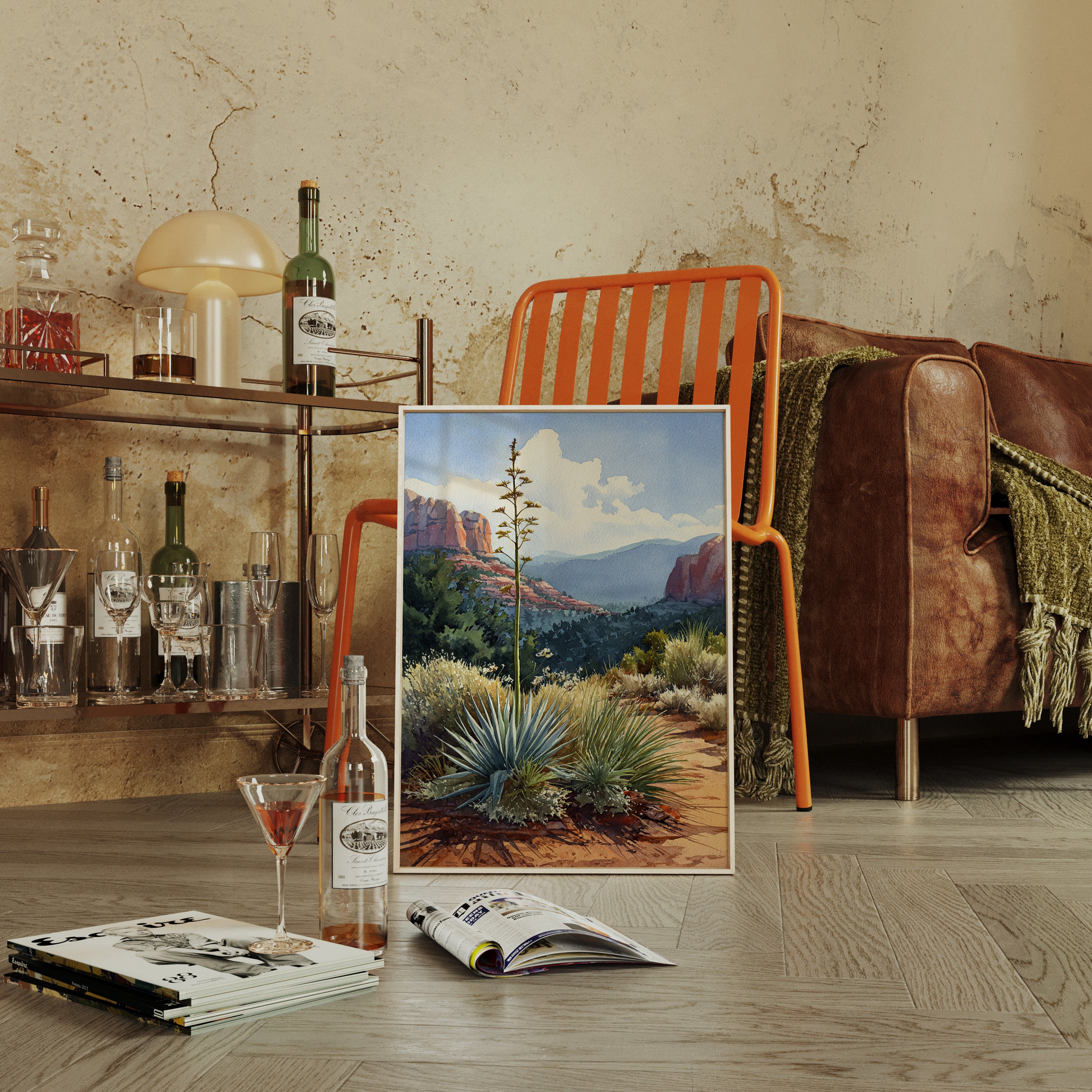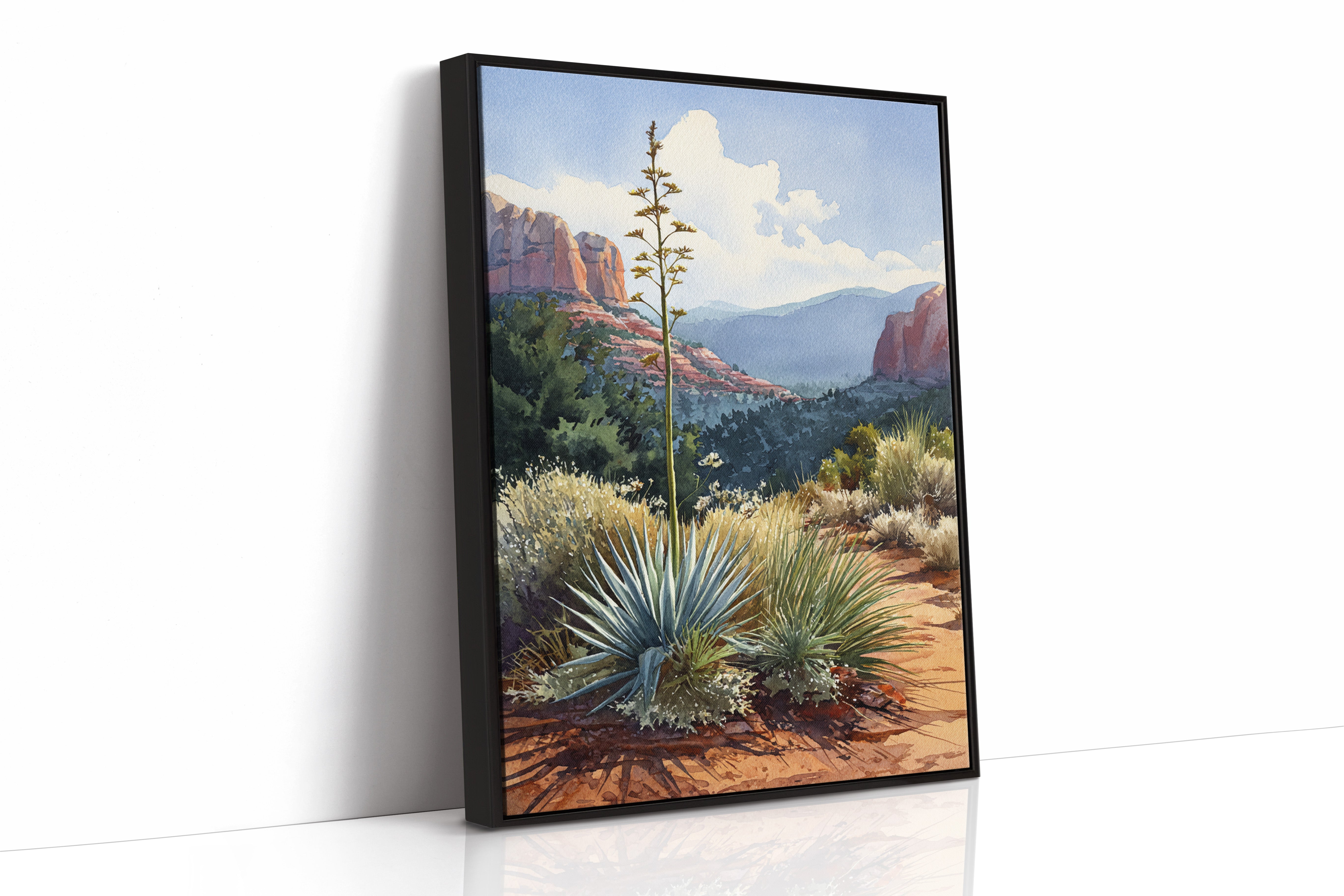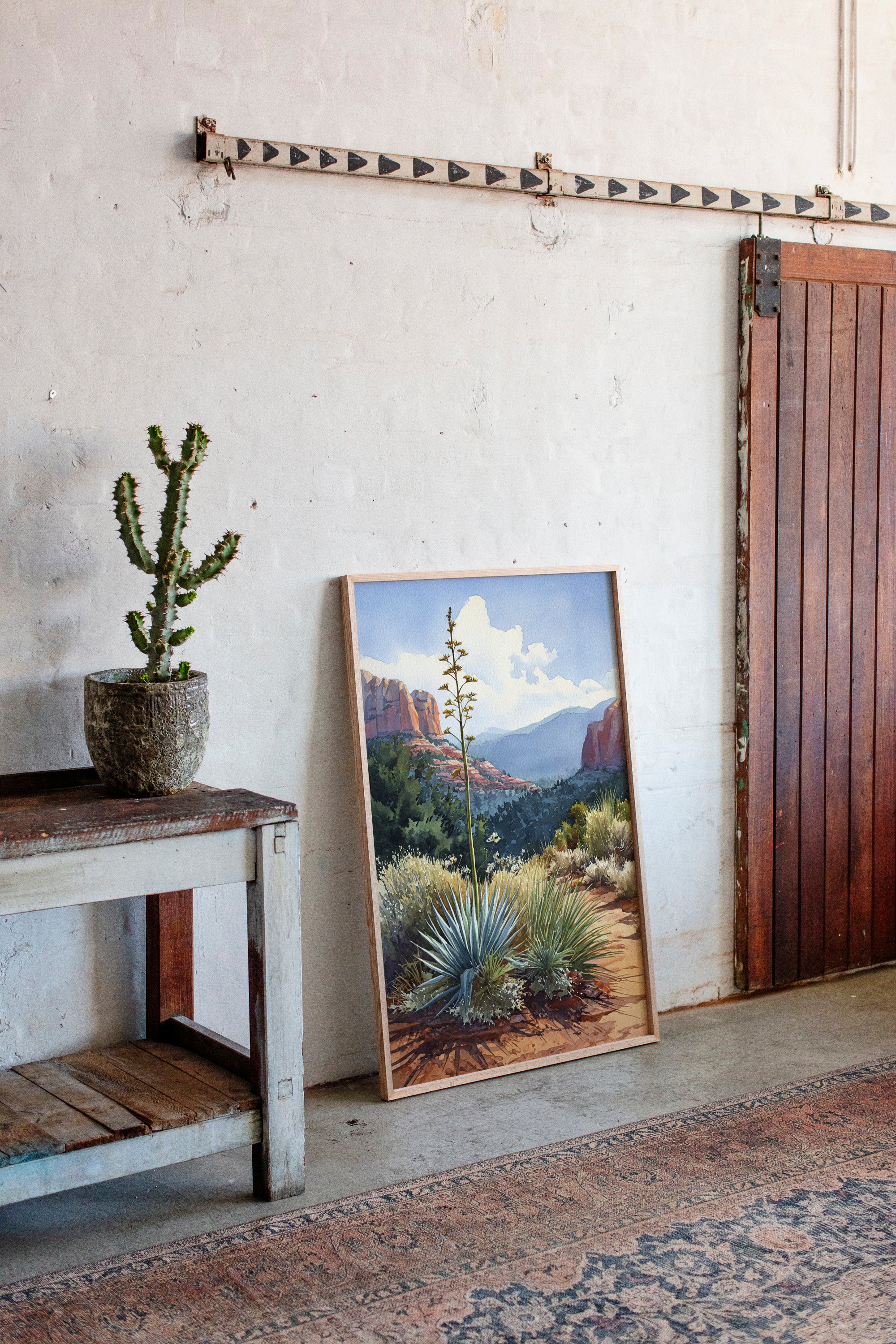 The rich textures of the desert flora and the vivid hues of the canyon backdrop create a sensory journey that evokes the warmth of sunlit days and the cool embrace of desert nights.