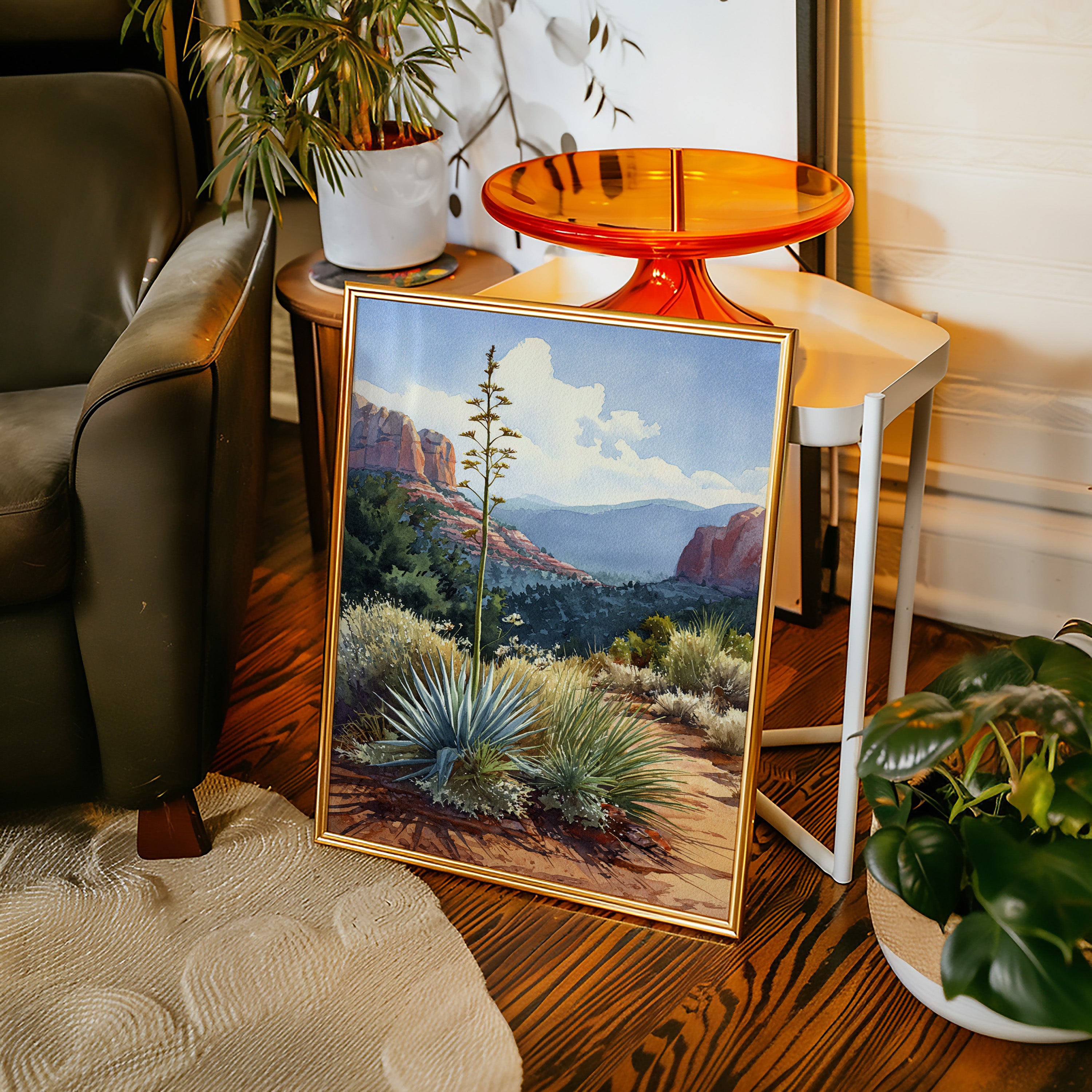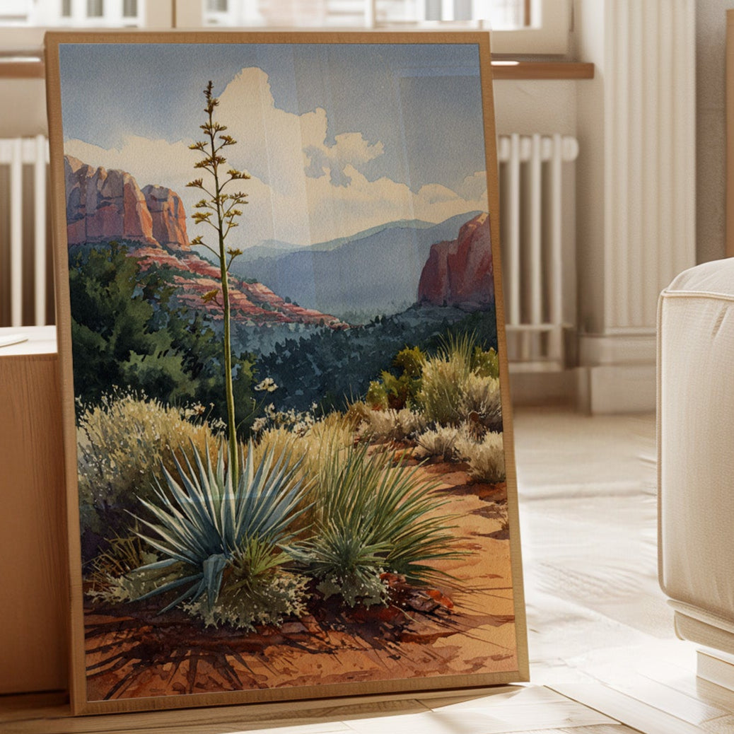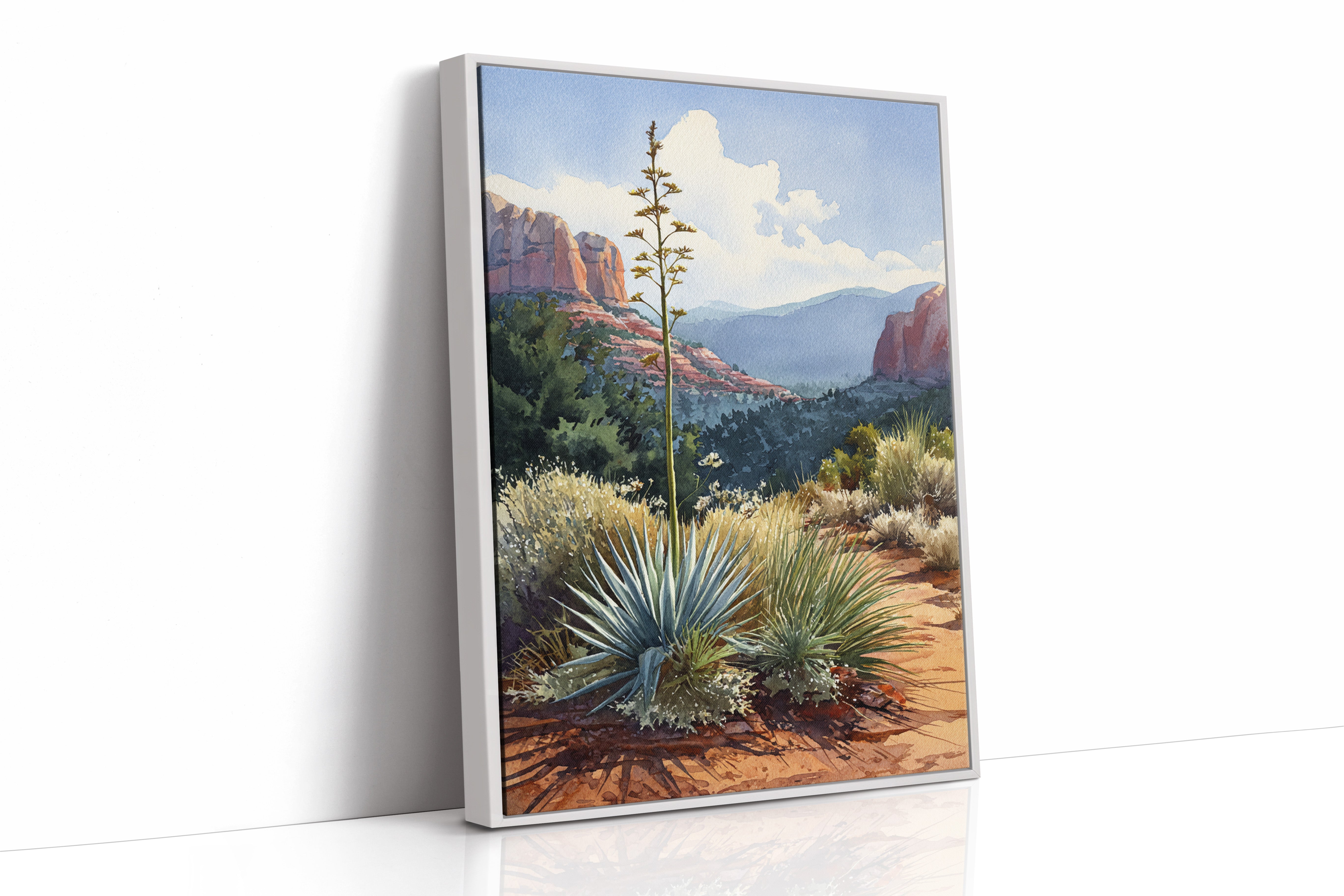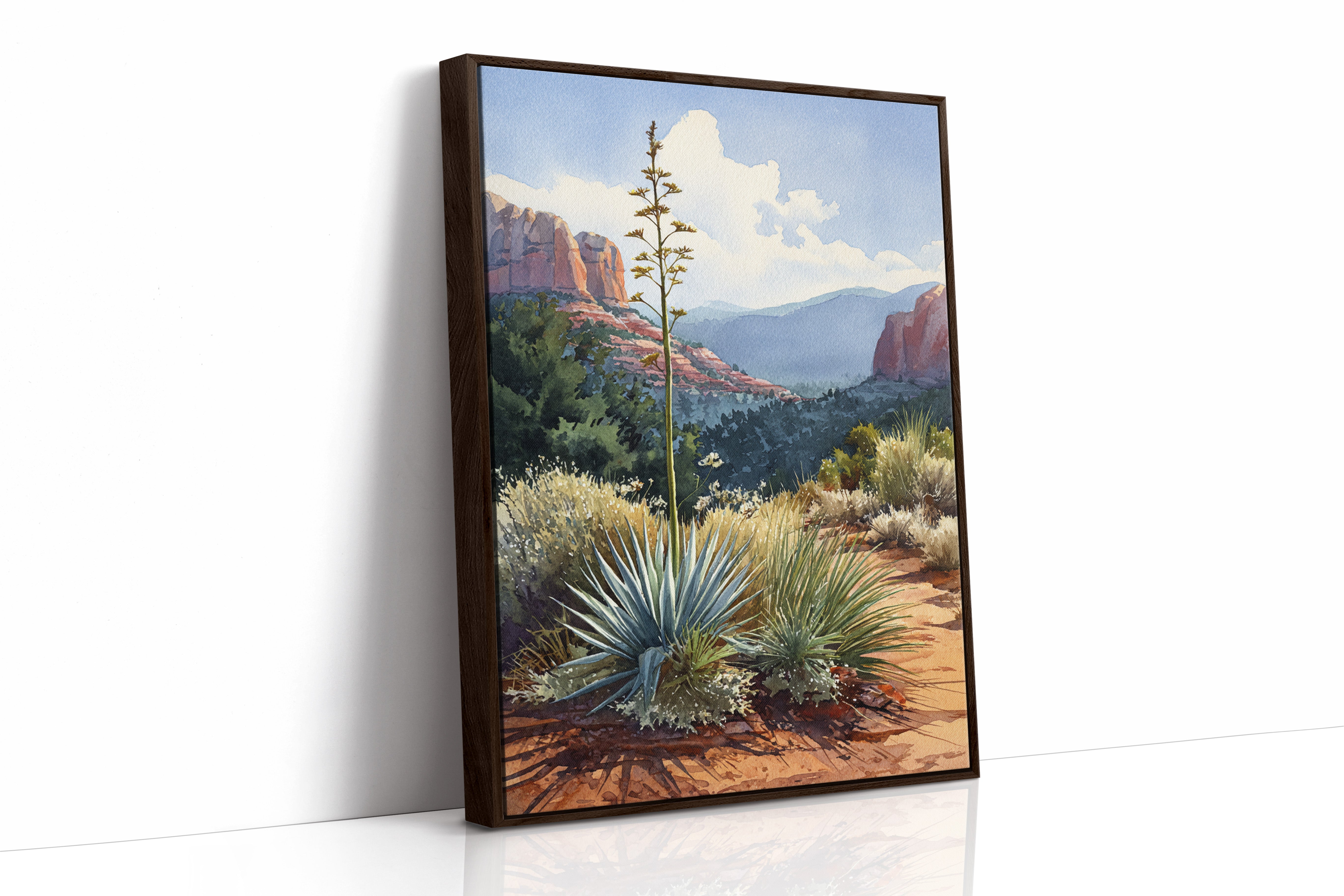 The rich textures of the desert flora and the vivid hues of the canyon backdrop create a sensory journey that evokes the warmth of sunlit days and the cool embrace of desert nights.