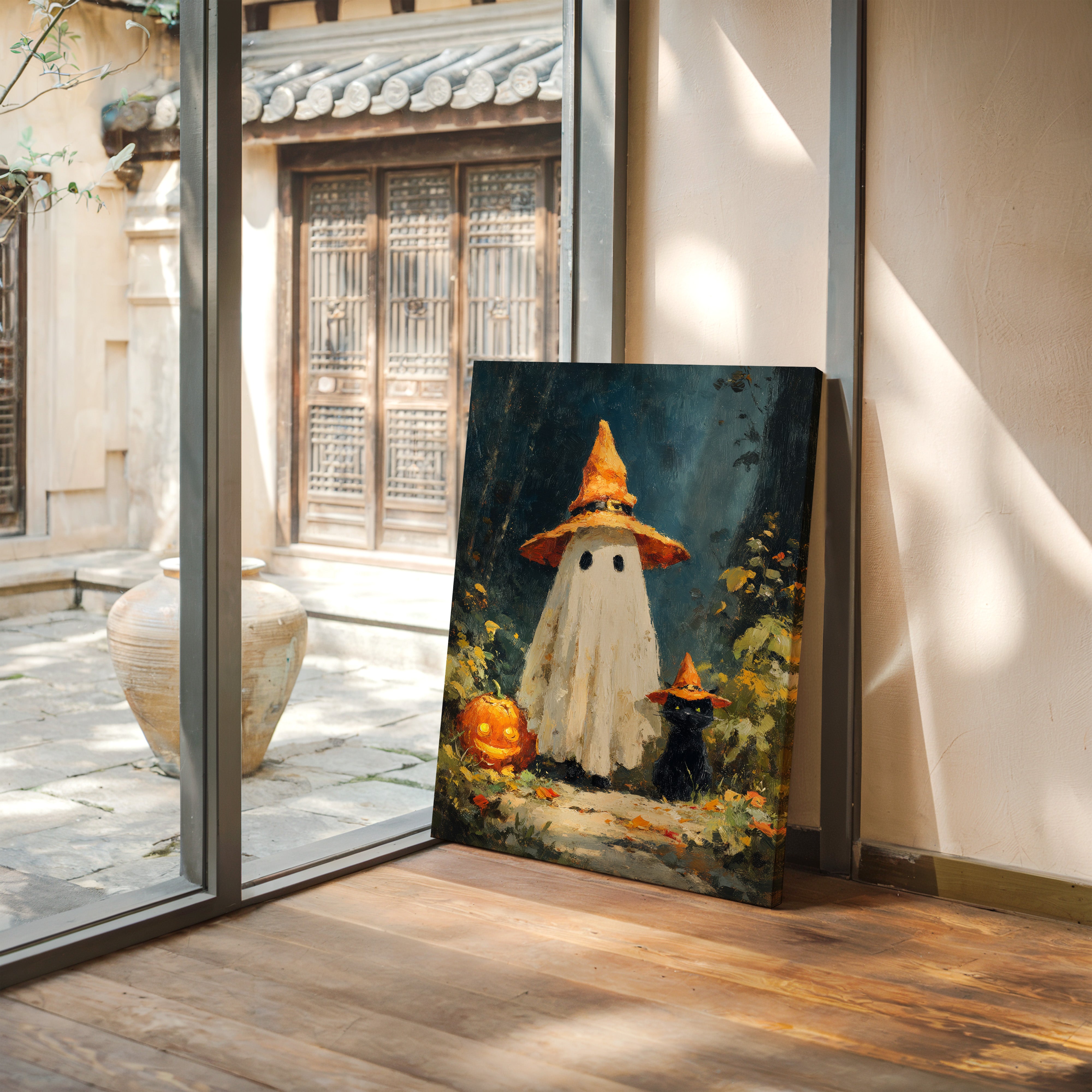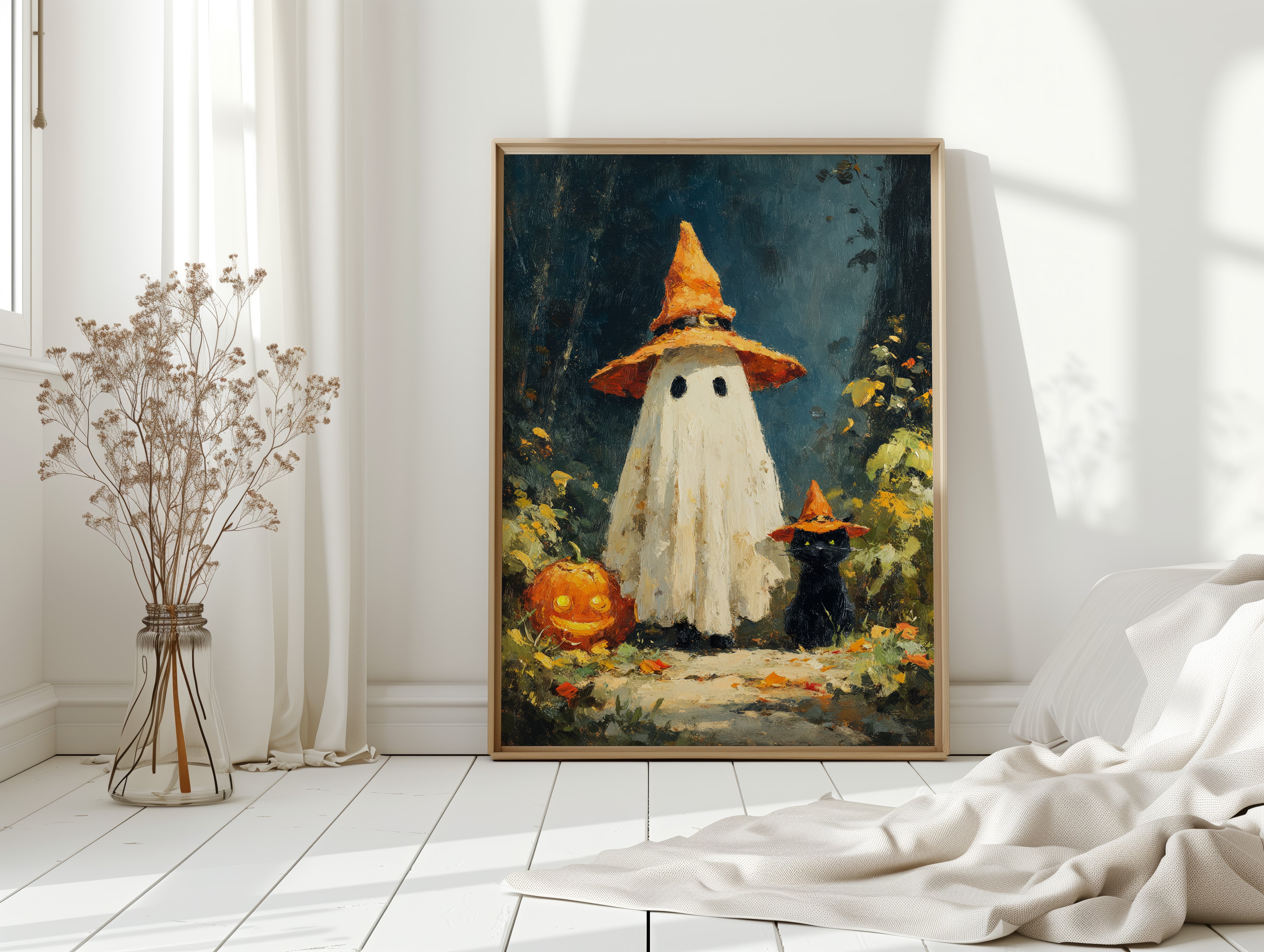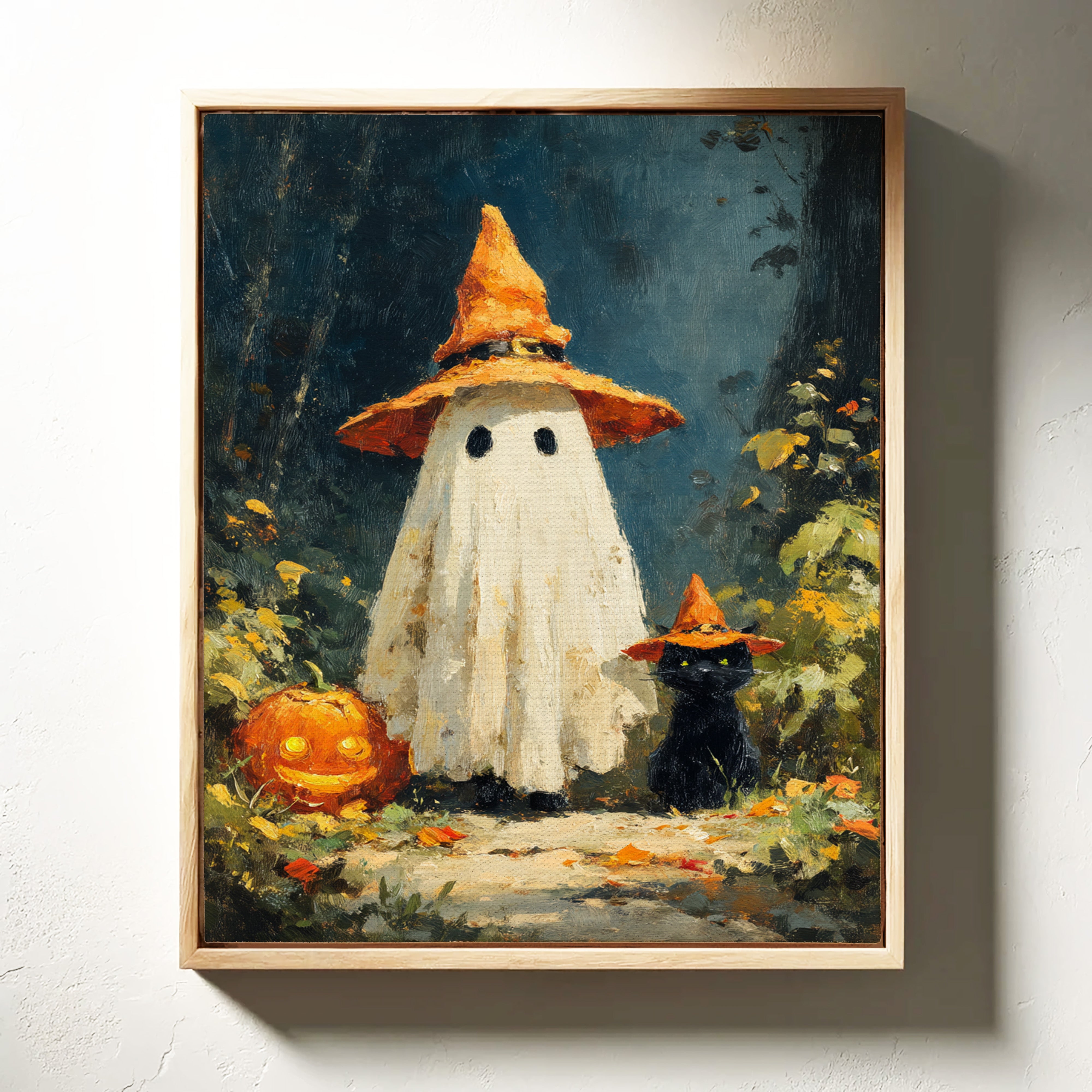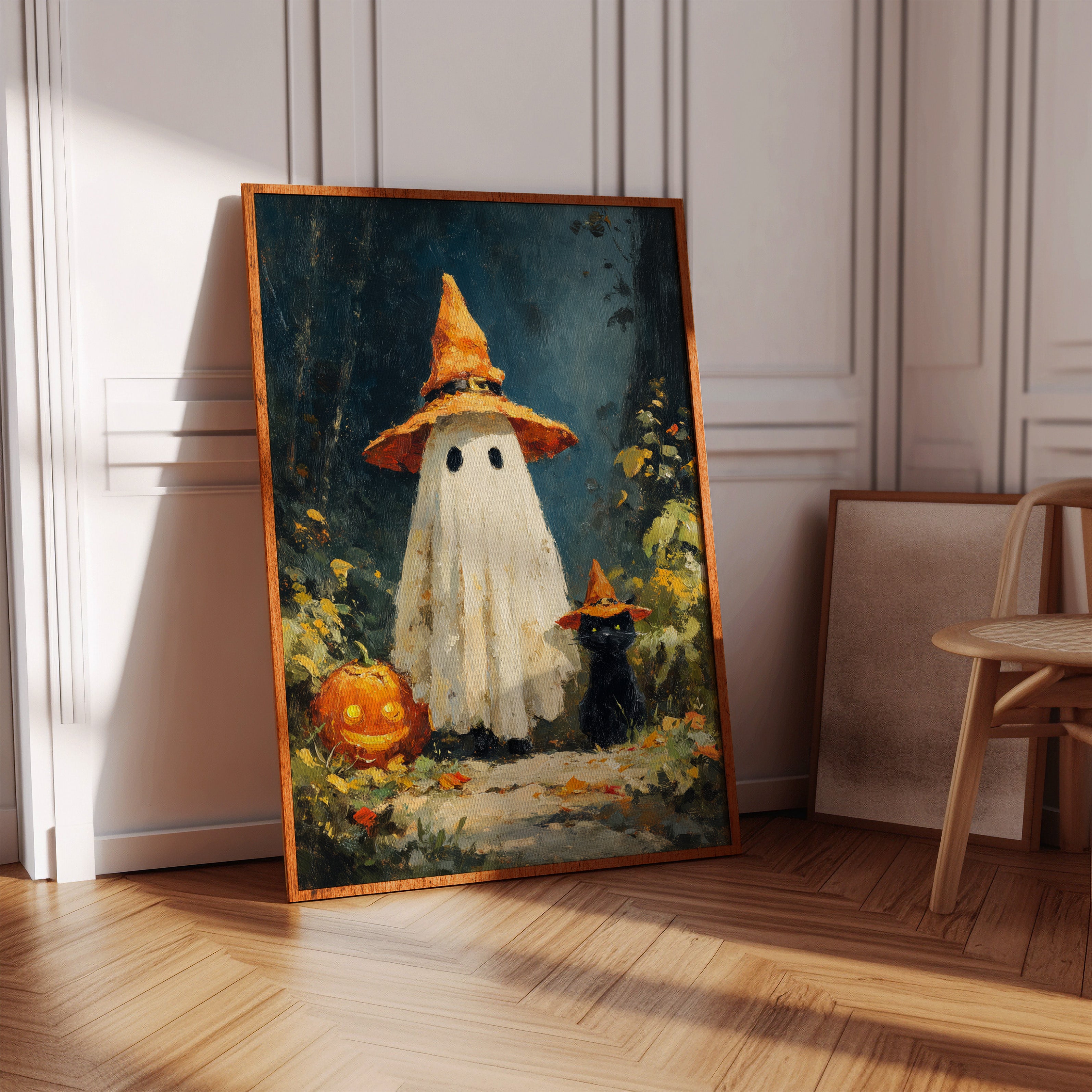 In a whimsical clearing, a ghostly figure and its feline companion stand watch, cloaked in the glow of autumn's bounty. This piece celebrates the enchanting spirit of fall, where magic dances amidst the leaves. The vibrant hues of orange and yellow create a playful yet mysterious ambiance, inviting viewers into a world where joy and eeriness intertwine. Perfect for a cozy nook or a seasonal display, this piece brings a sense of festive wonder to your home.